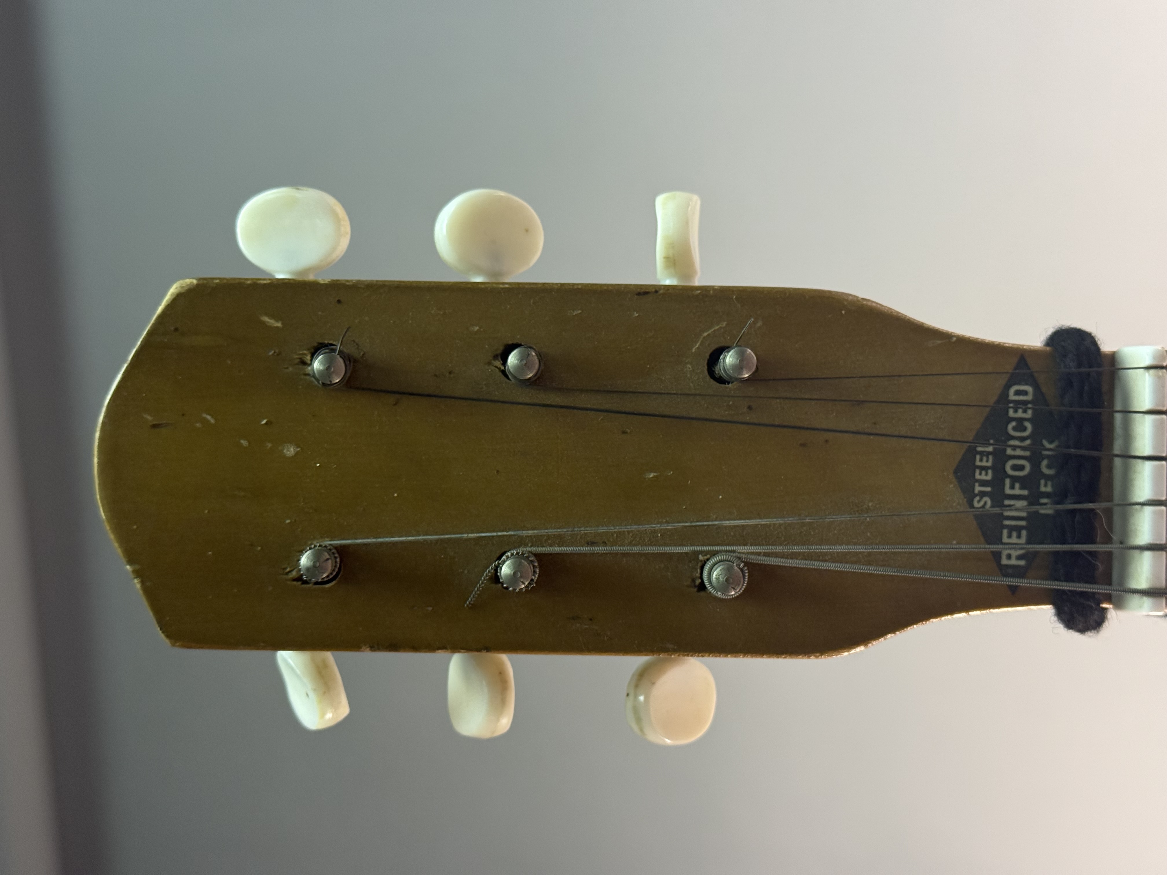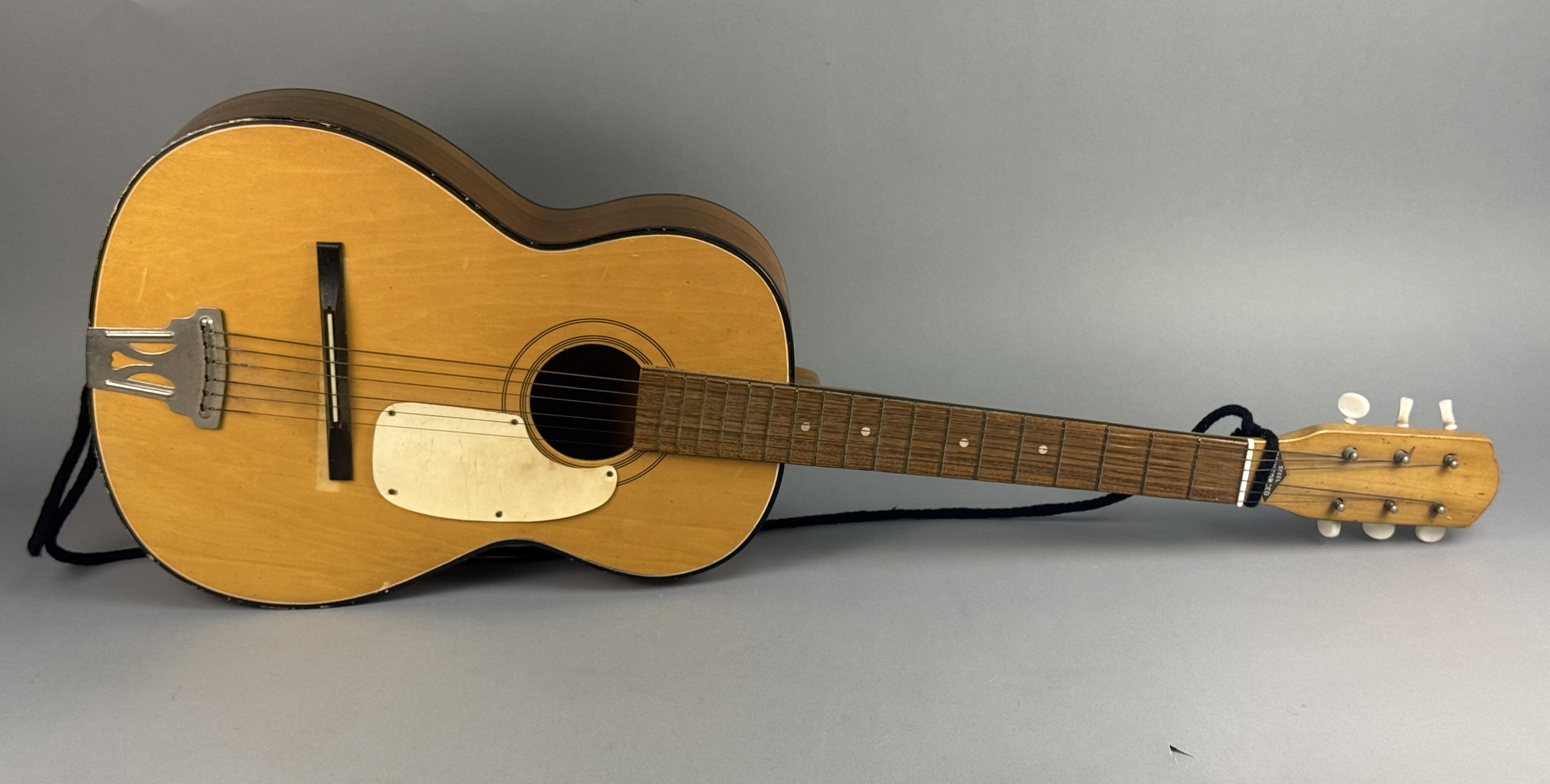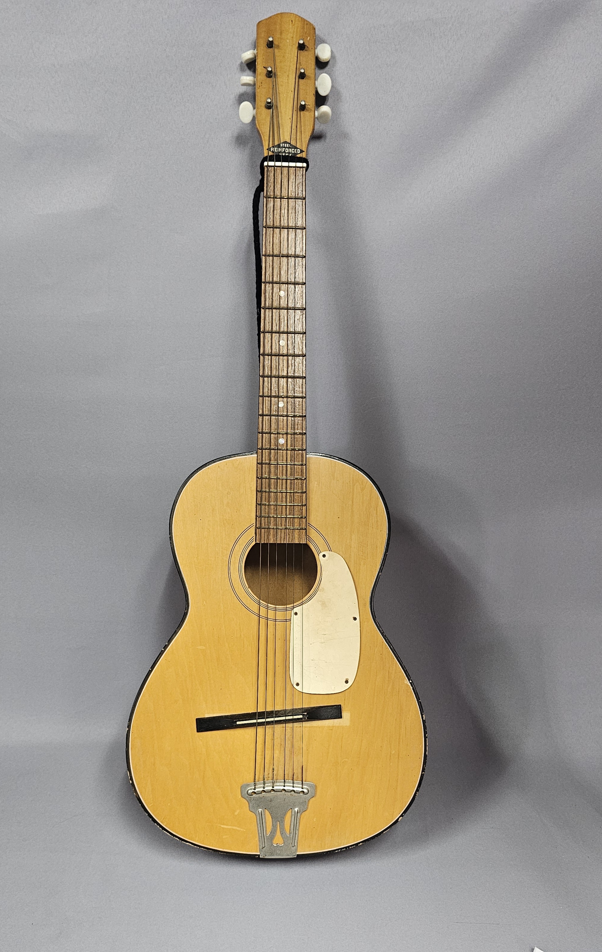 This six-string acoustic parlor guitar is of Japanese manufacture, dating to the mid-20th century. The instrument features a laminated wood construction with a light-finished top and darker-stained back and sides. The headstock is adorned with a diamond-shaped decal reading STEEL REINFORCED NECK, and the reverse is incised with the word JAPAN. The guitar is designed with a stained fretboard featuring dot inlays and a white plastic pickguard. Hardware includes a metal trapeze tailpiece with a stylized M cutout, a floating wooden bridge with a white saddle, and two sets of three-on-a-plate open-gear tuners with white plastic buttons. Overall length: 36 inches Fair to good vintage condition. There is visible finish wear and chipping along the edges of the body, with a notable chip in the center of the back. The top shows various scratches and surface wear. The headstock has minor nicks along the top edge, and the fretboard shows light wear. Metal components, including the tailpiece and tuning machines, exhibit surface oxidation and light rust. The plastic pickguard is discolored with surface scratches. The floating bridge has been repositioned, leaving a visible lighter rectangular area on the finish from its original placement. No case is included.