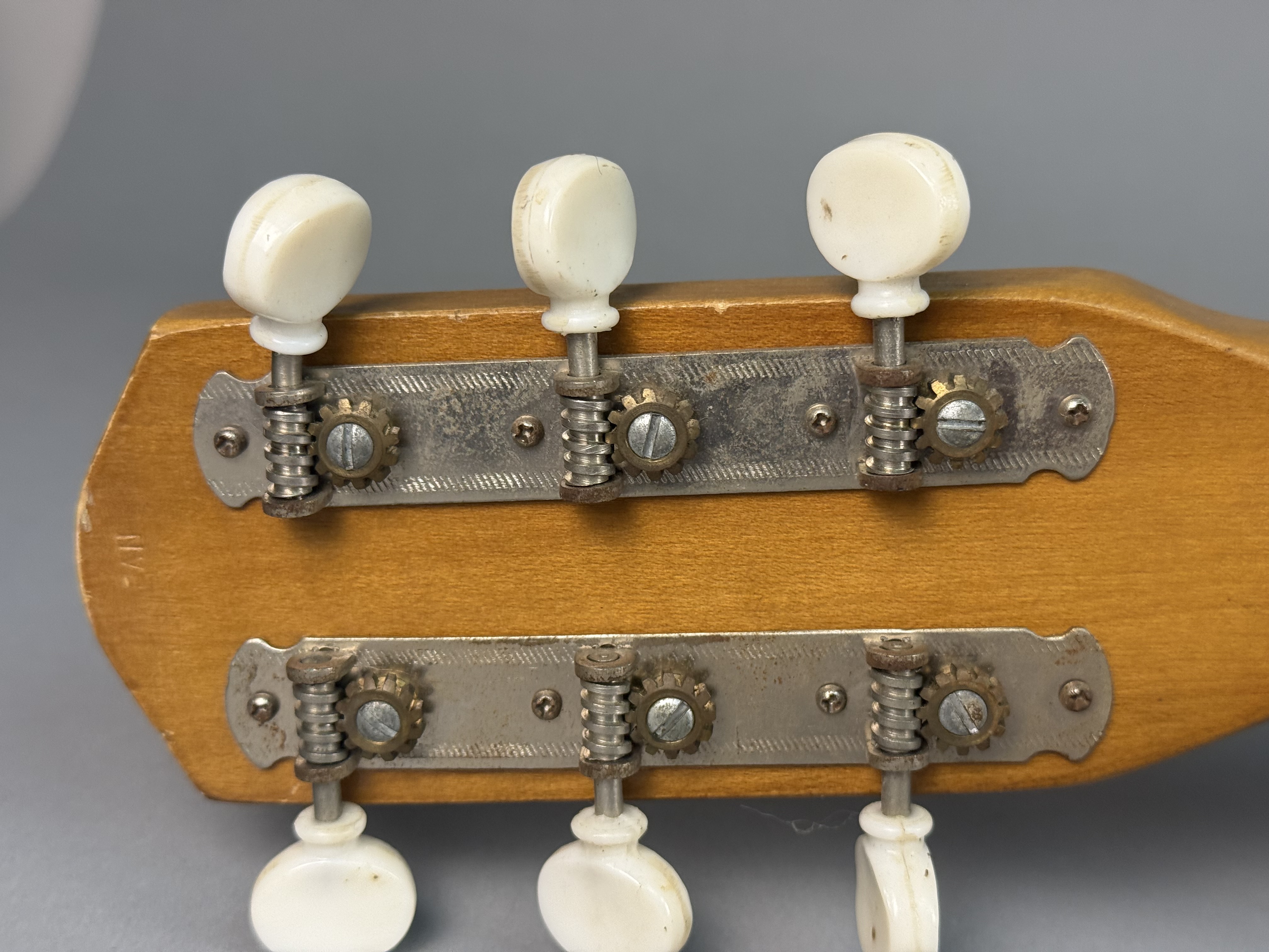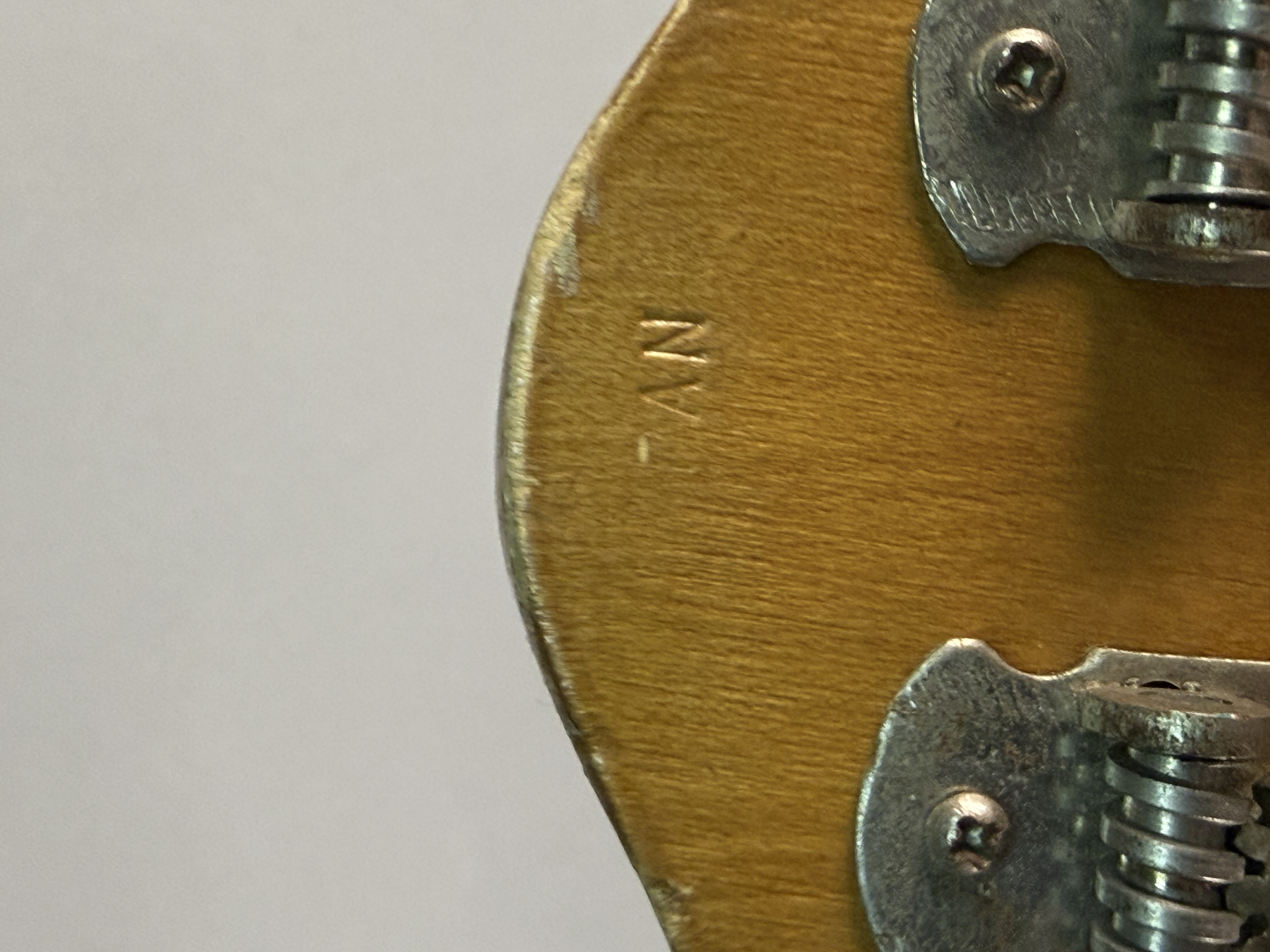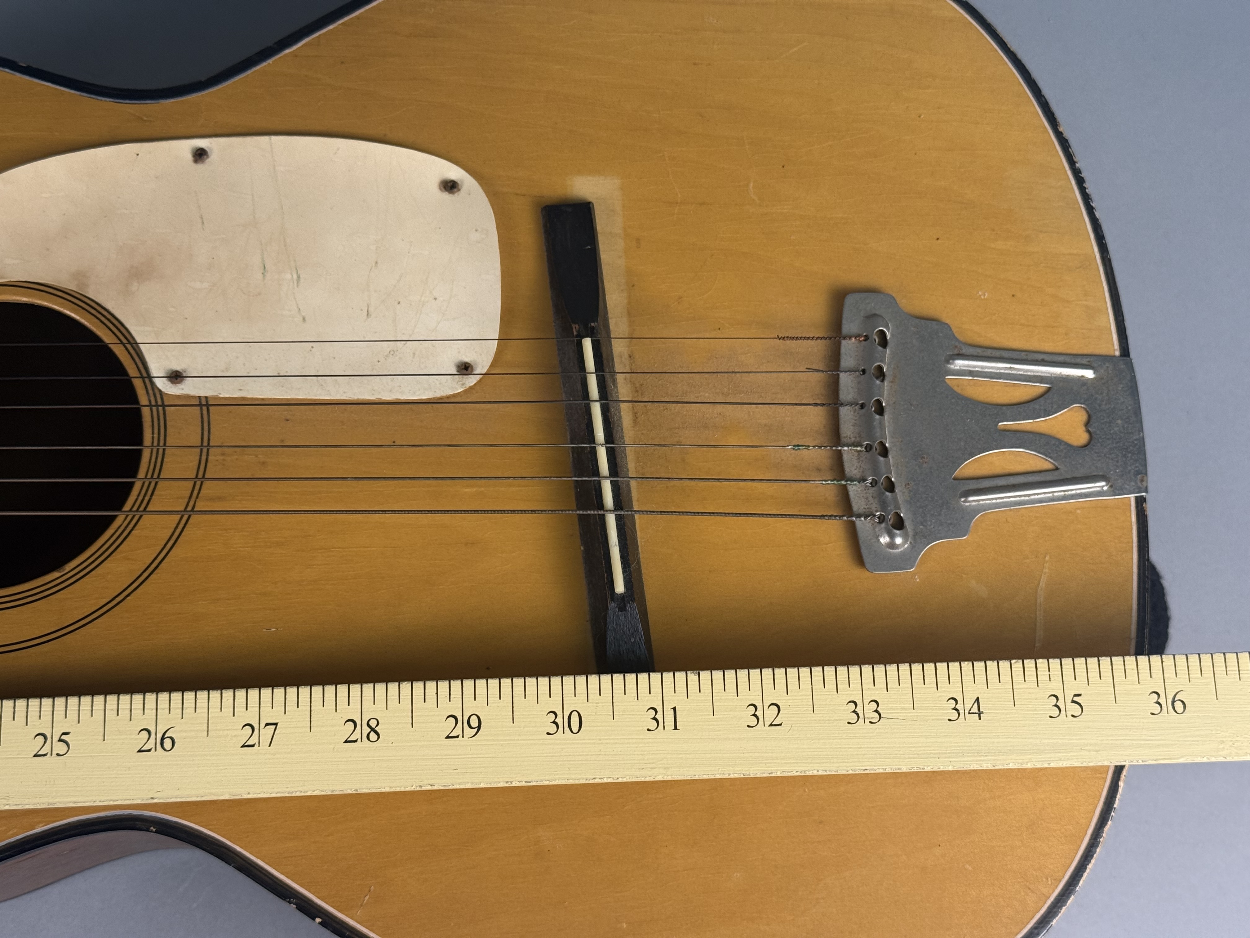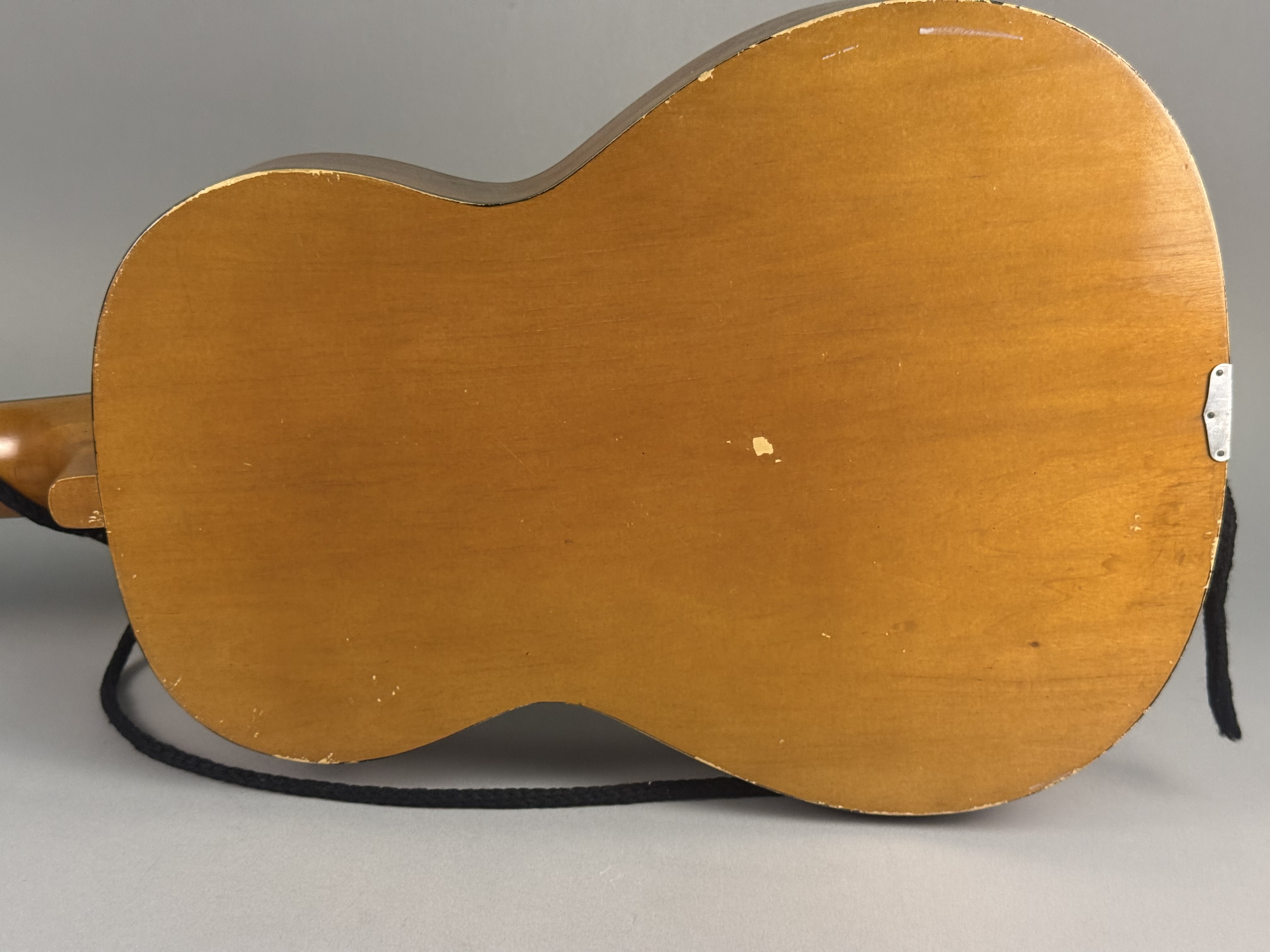 Fair to good vintage condition. There is visible finish wear and chipping along the edges of the body, with a notable chip in the center of the back. The top shows various scratches and surface wear. The headstock has minor nicks along the top edge, and the fretboard shows light wear. Metal components, including the tailpiece and tuning machines, exhibit surface oxidation and light rust. The plastic pickguard is discolored with surface scratches. The floating bridge has been repositioned, leaving a visible lighter rectangular area on the finish from its original placement. No case is included.