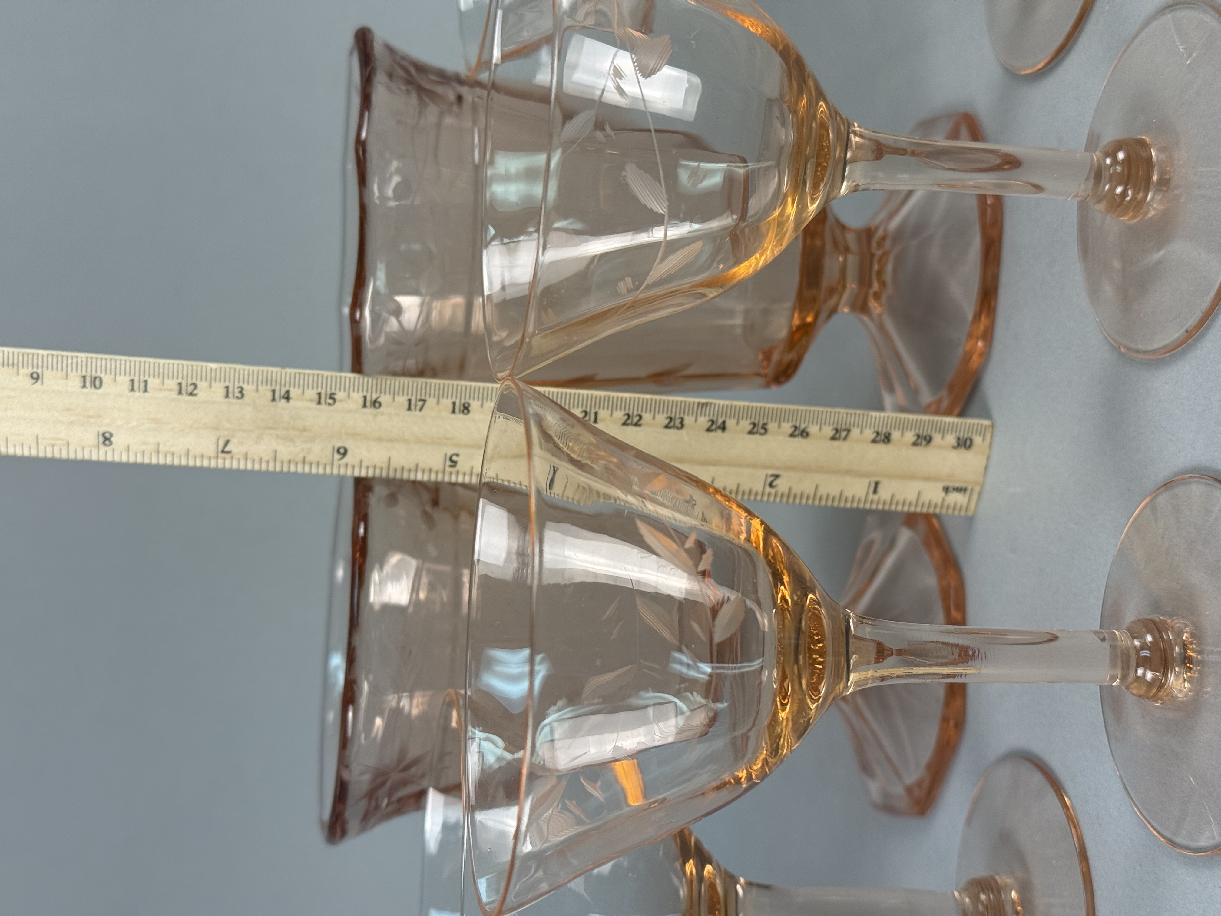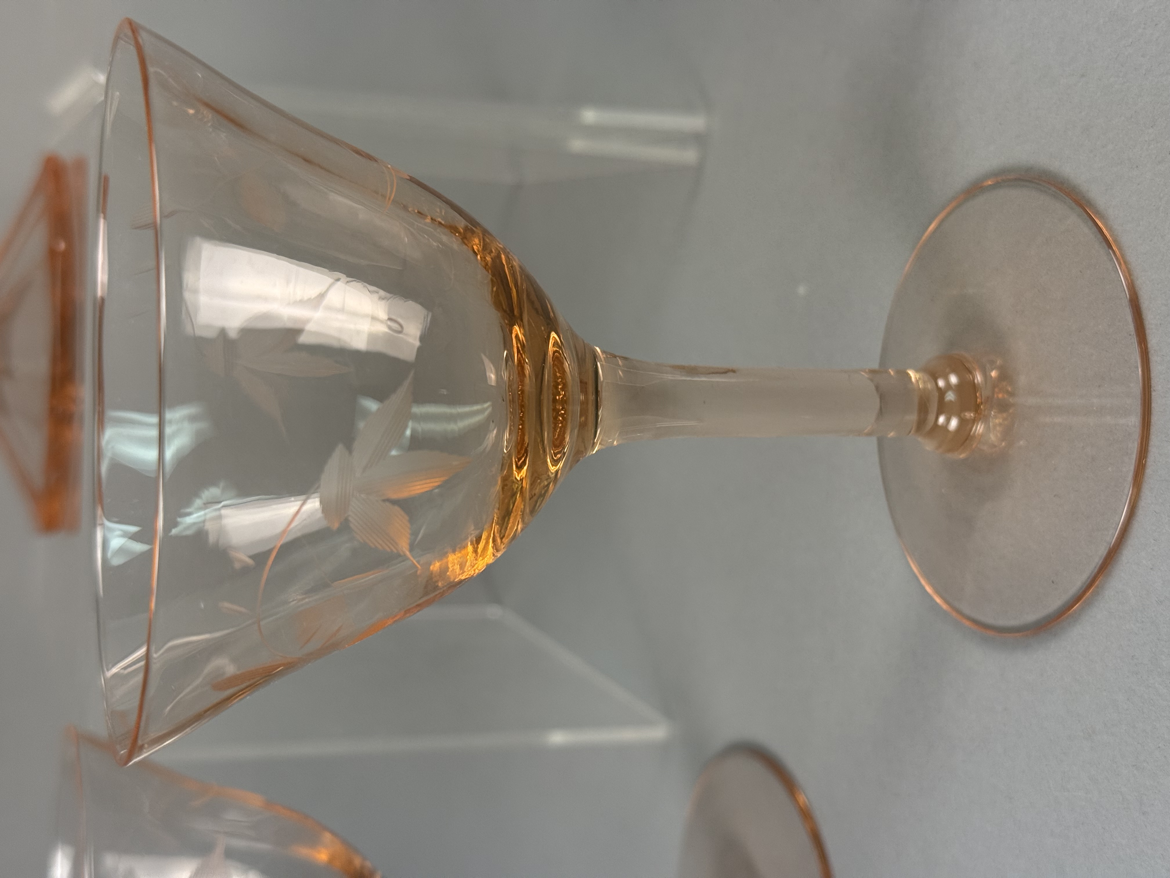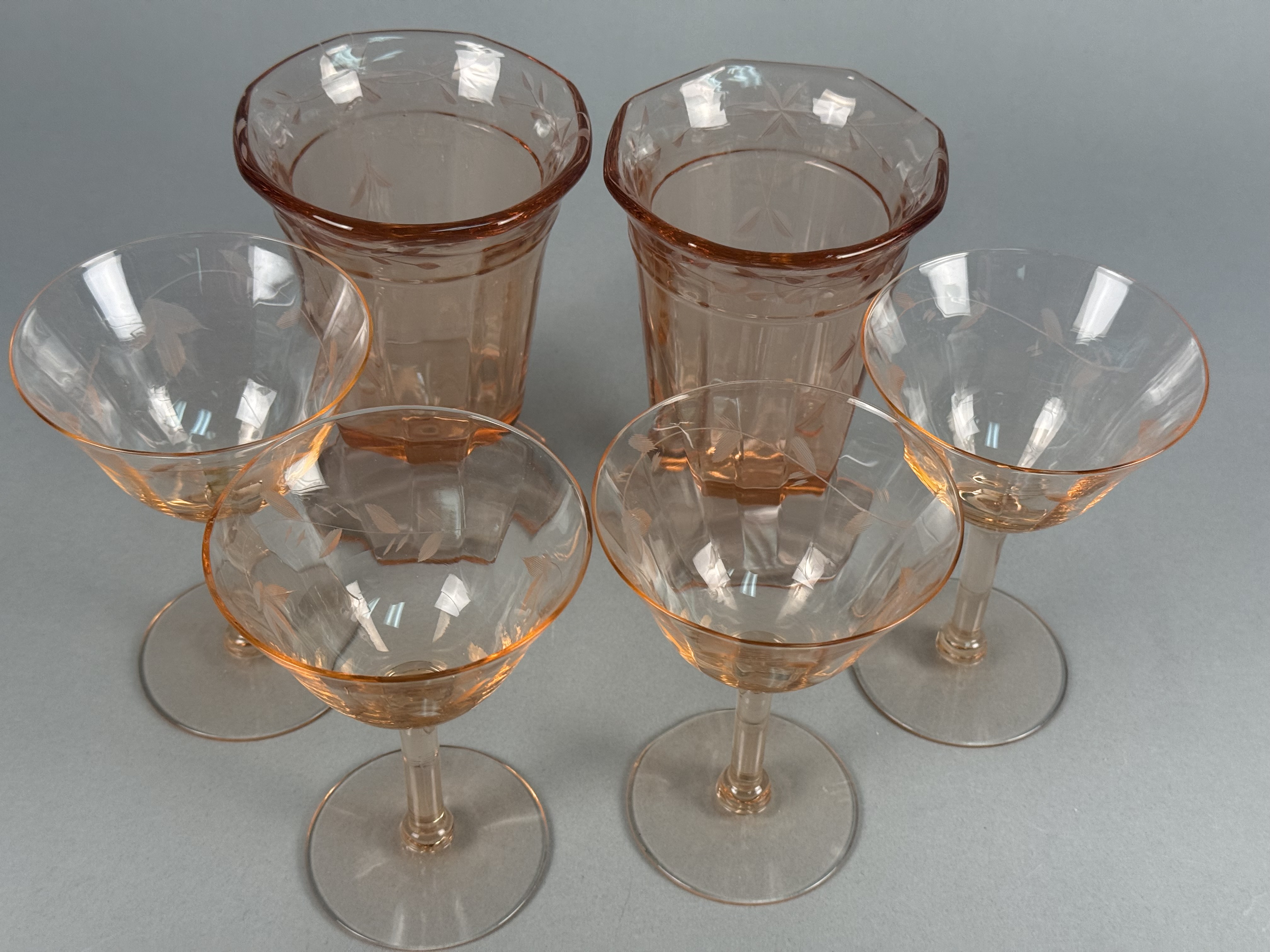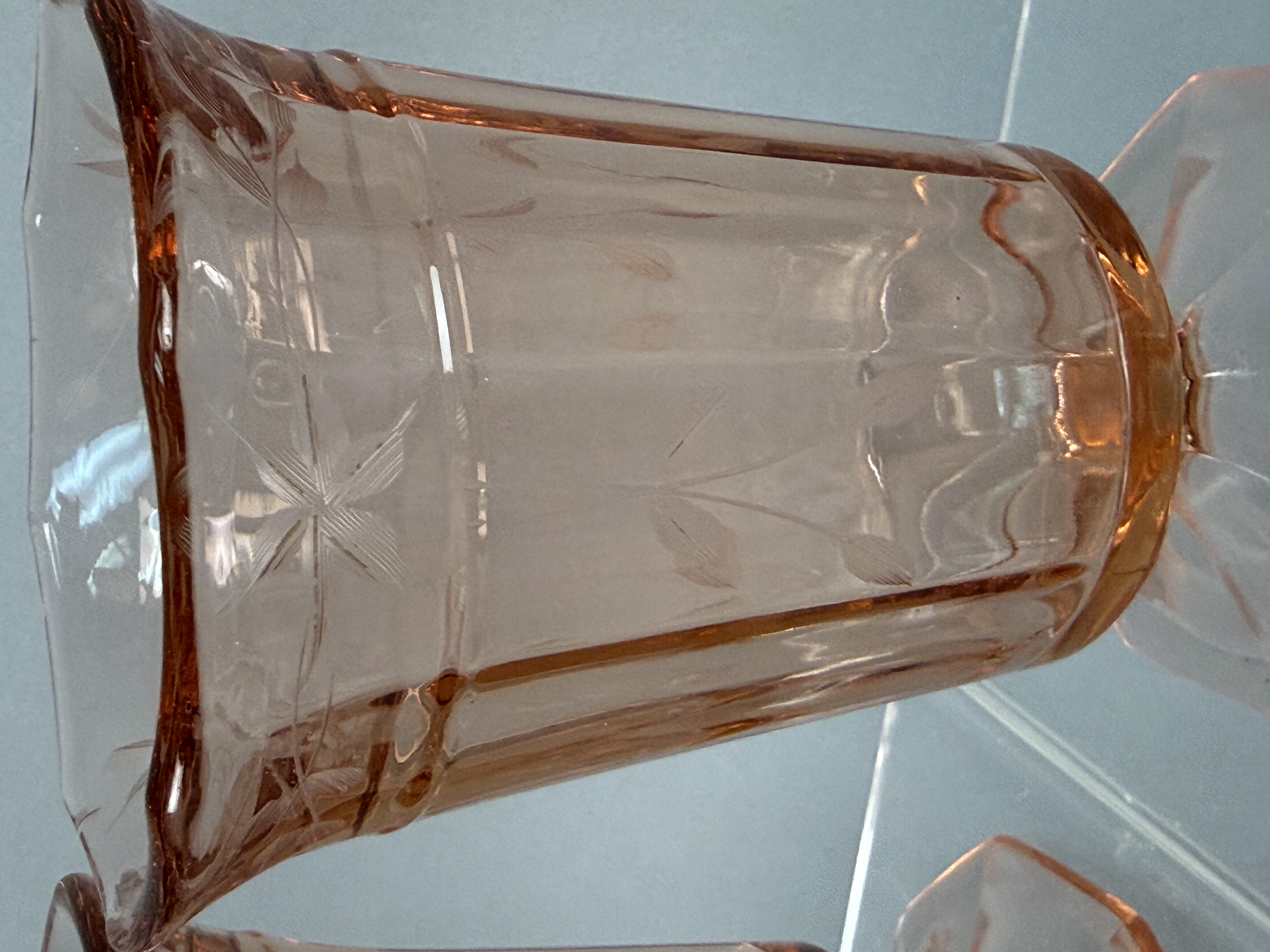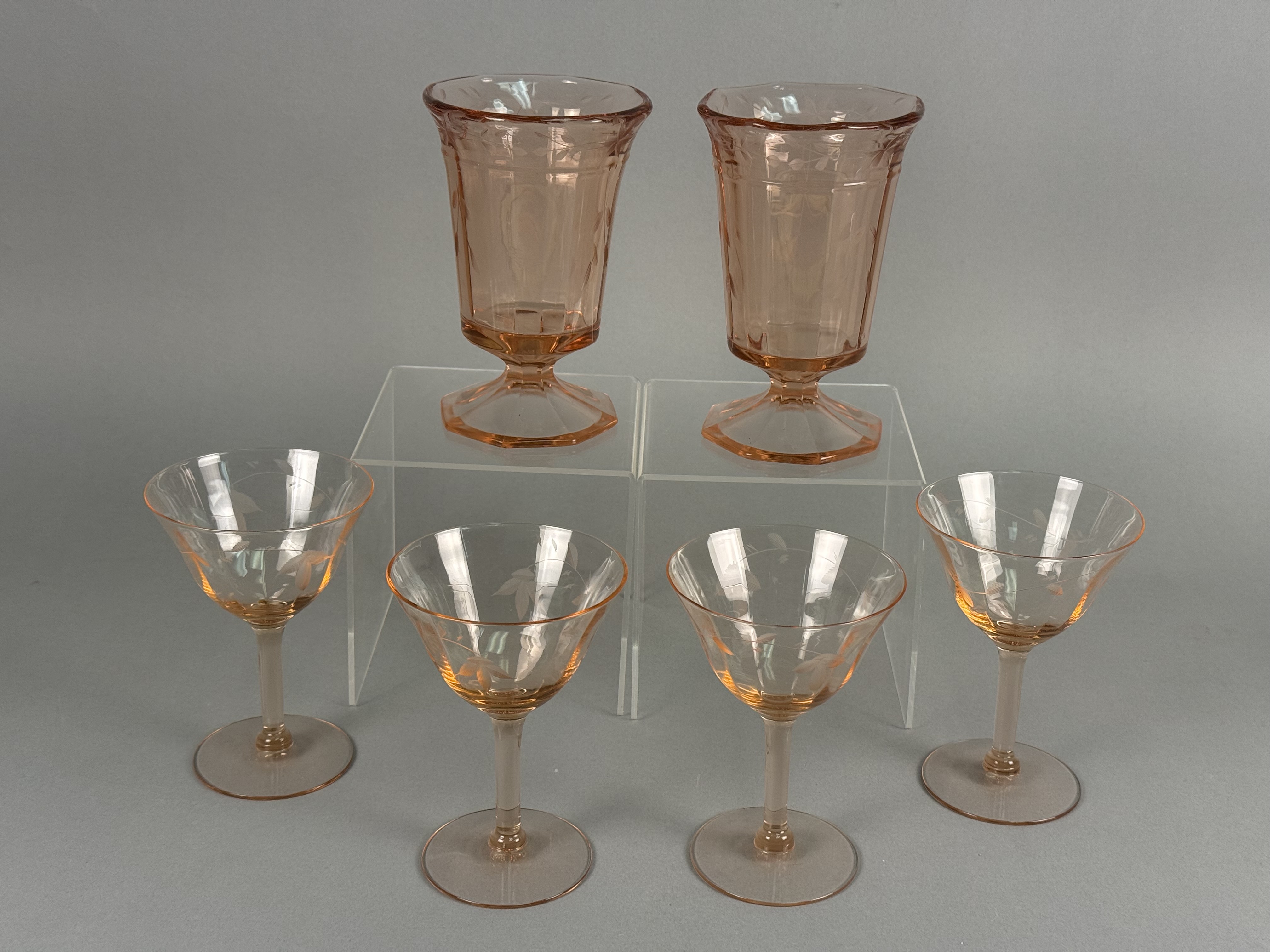 This set of six translucent pink glass items is characteristic of American Depression-era production, closely resembling patterns produced by the Tiffin Glass Company. The collection includes four stemmed cocktail glasses and two footed tumblers. Each piece features a wheel-etched decoration of flowers and leaves. The tumblers are designed with paneled bodies, scalloped rims, and hexagonal bases. The cocktail glasses feature a flared bowl on a straight stem with a circular foot. No manufacturer marks or signatures are present on the items. Stemmed glasses height: 4.5 inches The items are in good condition with no visible chips, cracks, or restorations. The etched motifs remain clear and the glass retains its original transparency and color.