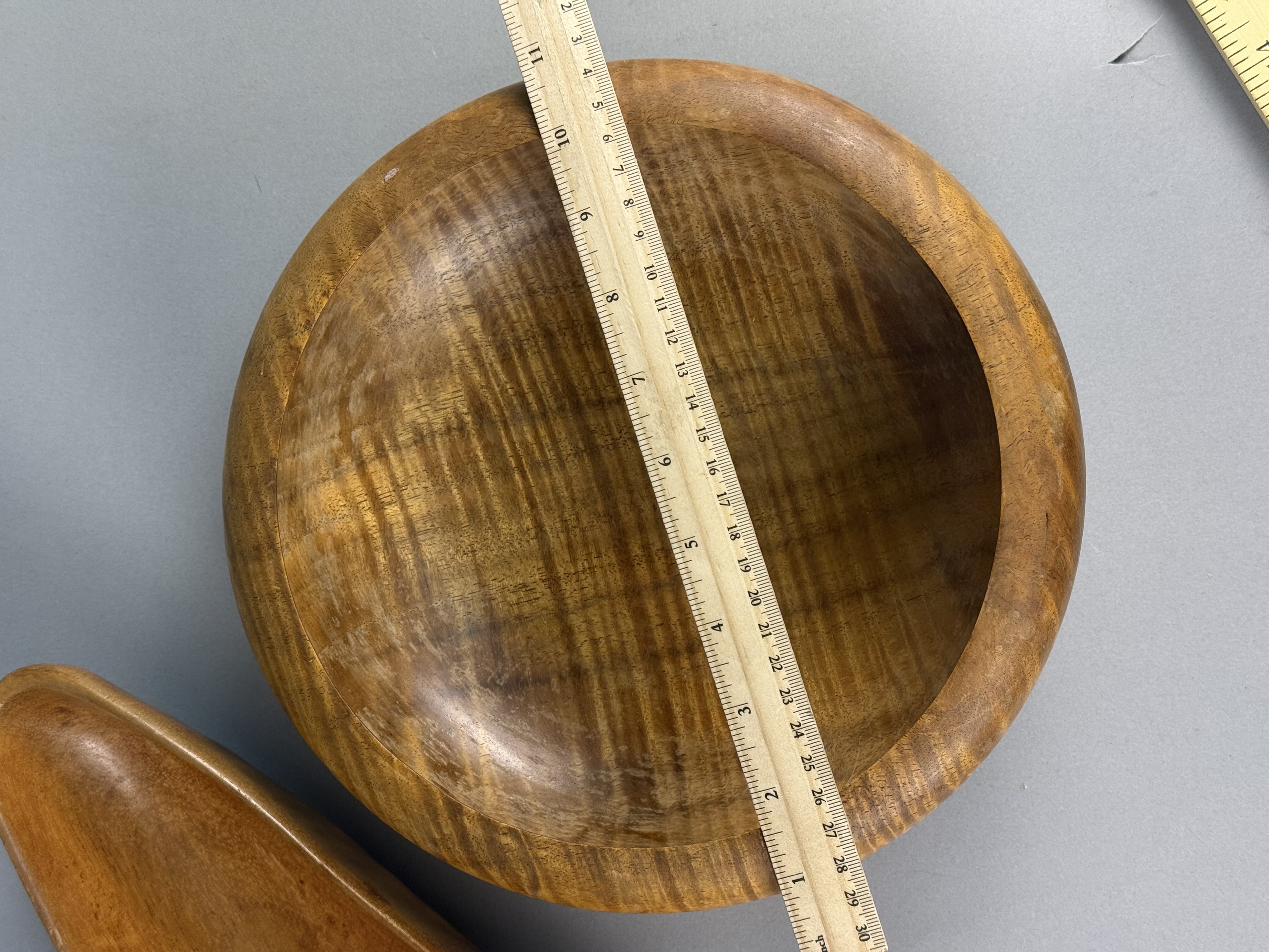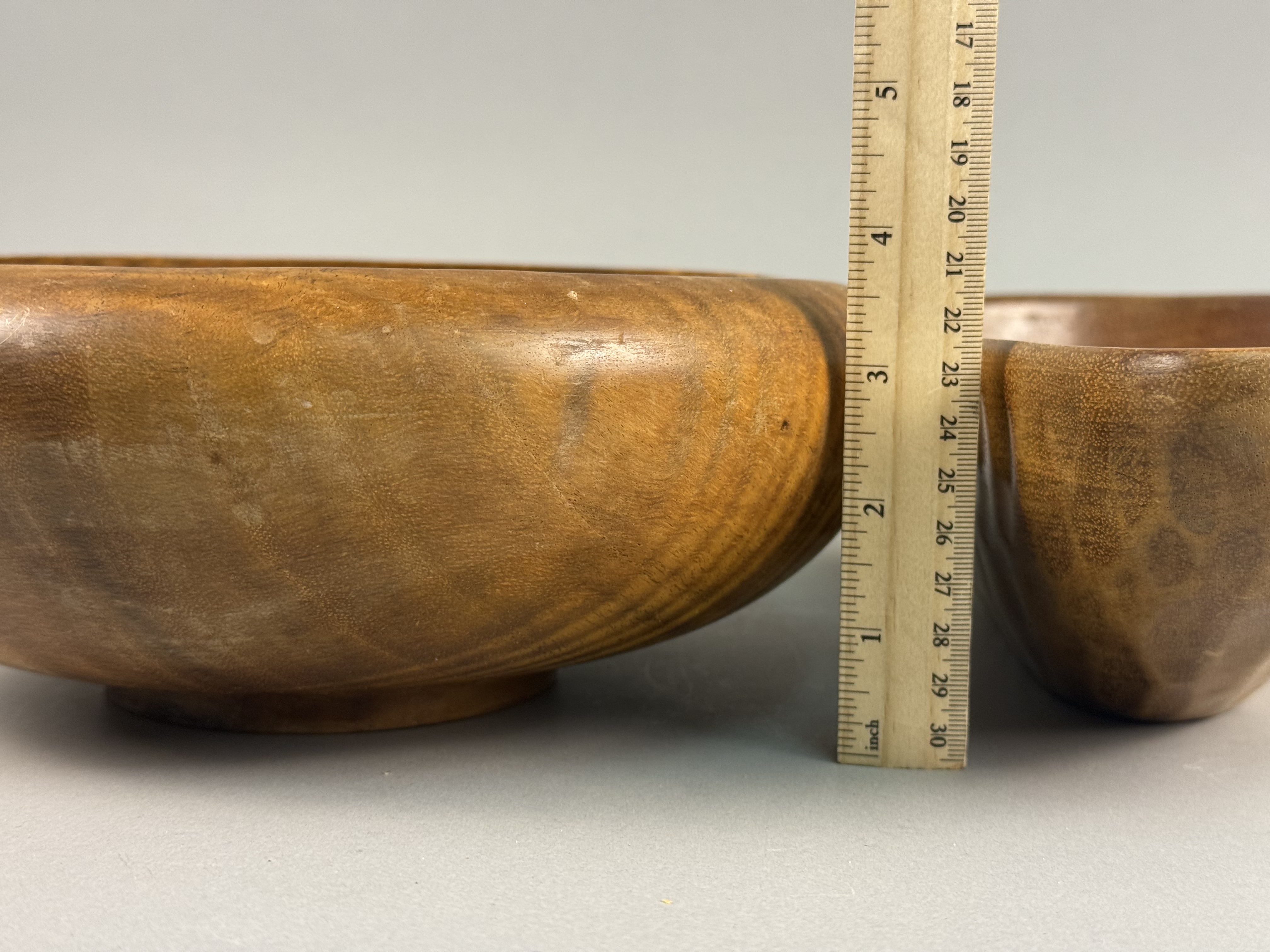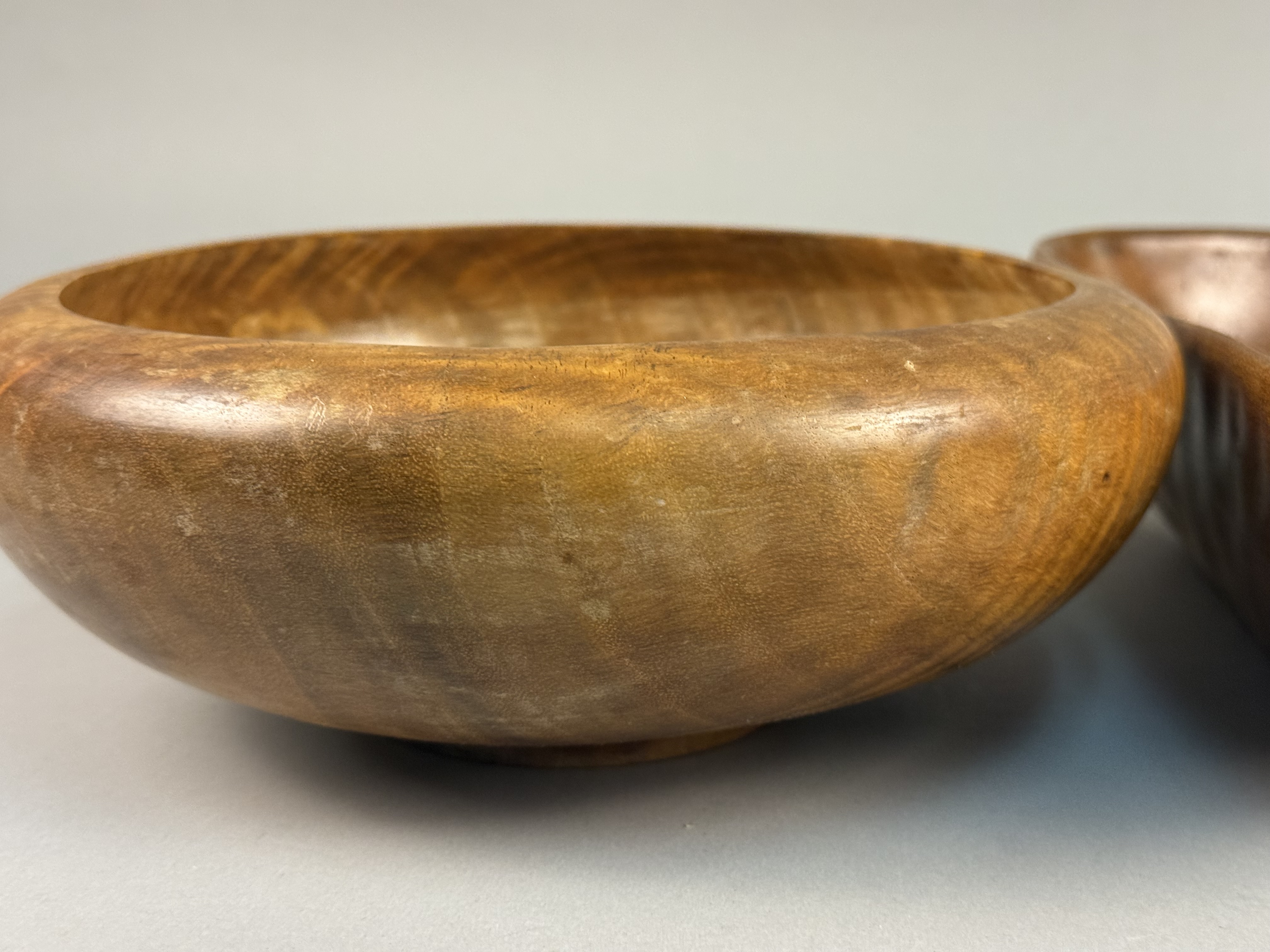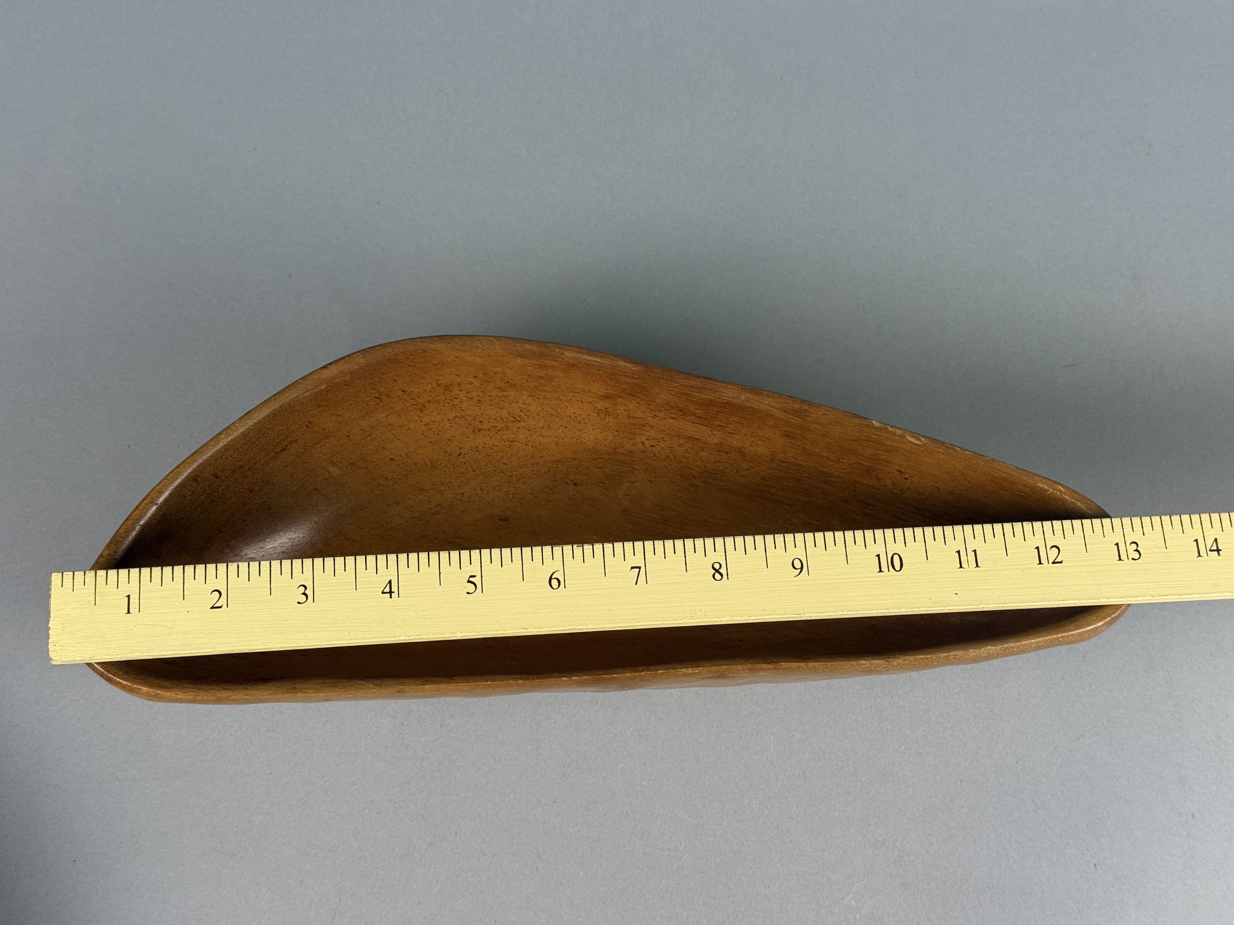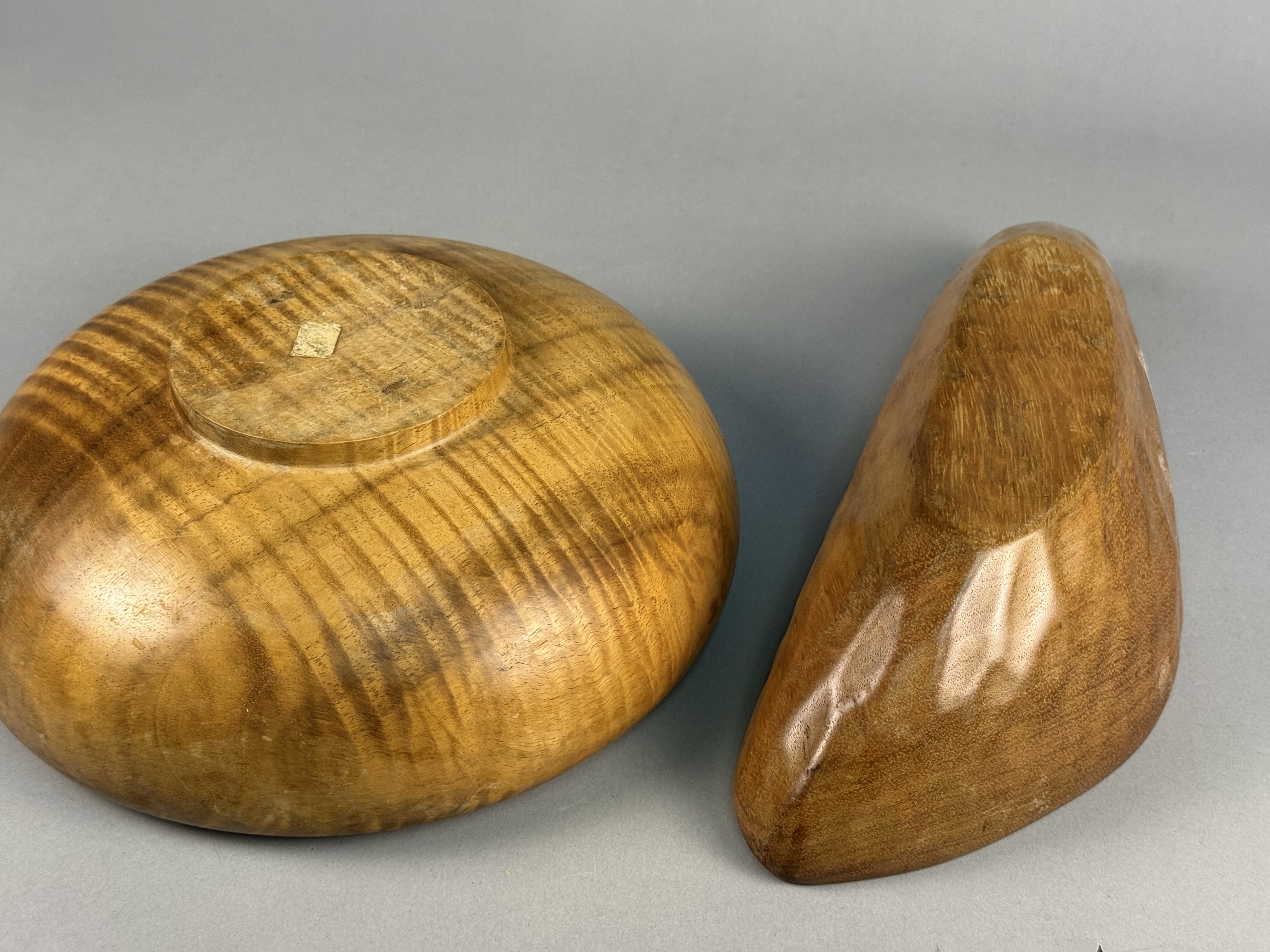 A pair of mid-century modern vessels carved from monkey pod wood. The first is a circular hand-turned bowl featuring a tiger grain pattern, a rounded rim, and a raised circular foot. The second is an asymmetrical, free-form vessel with a tapered end and organic contours. Both pieces exhibit a polished finish. Circular bowl: 10 inches diameter, 3.5 inches height Asymmetrical bowl: 13 inches length Both items are in good vintage condition with minor surface abrasions and light wear consistent with age and use.