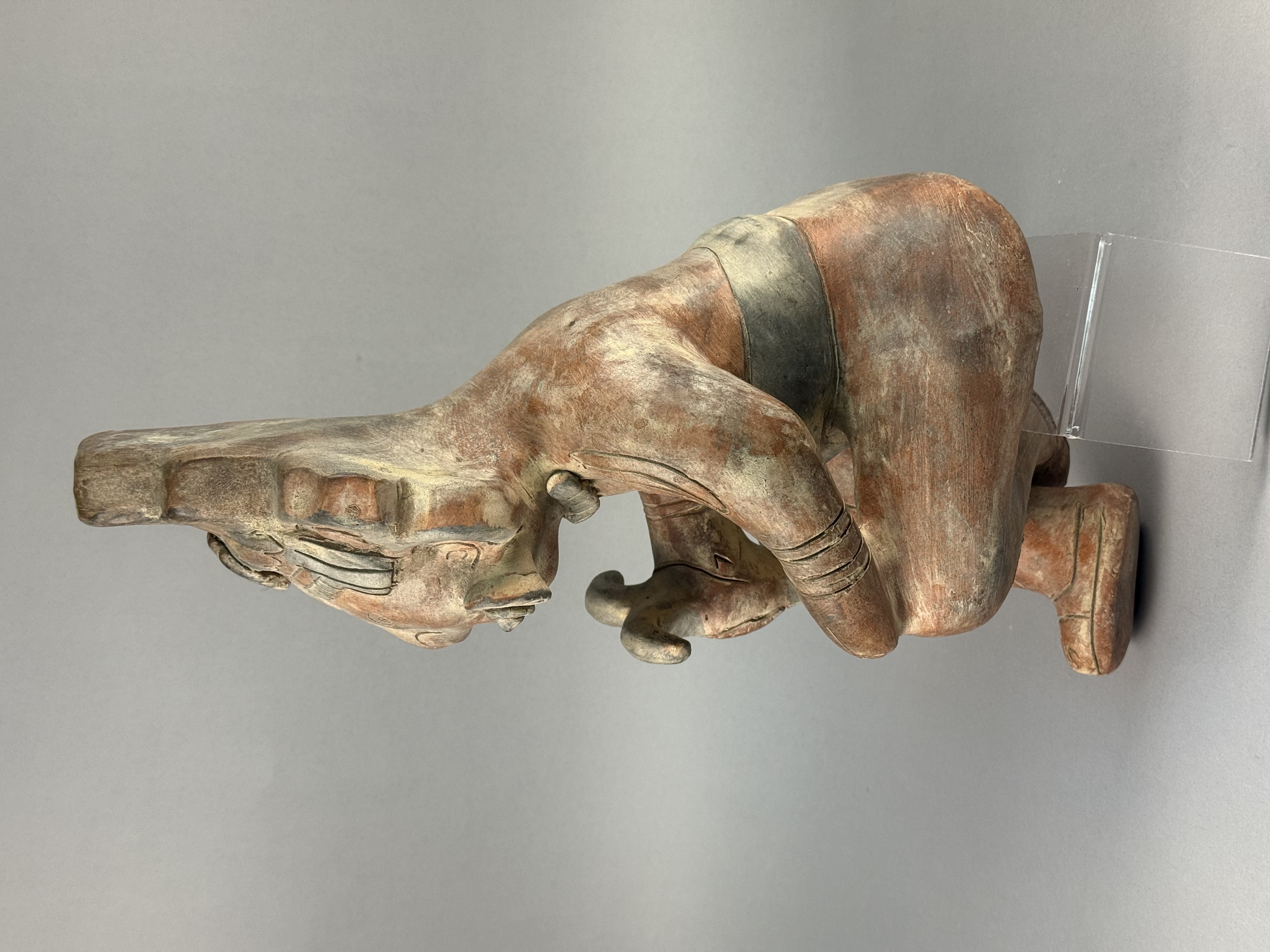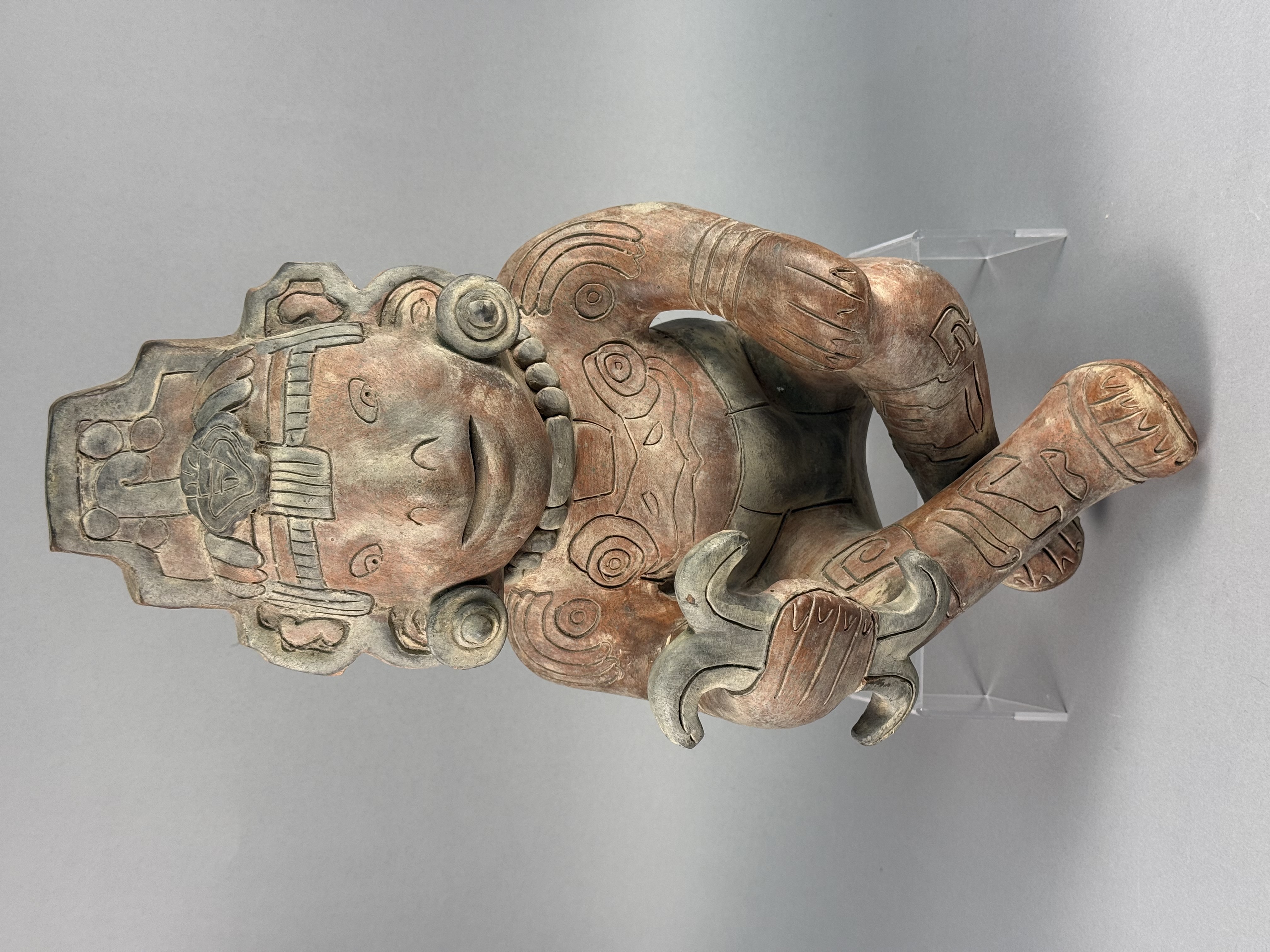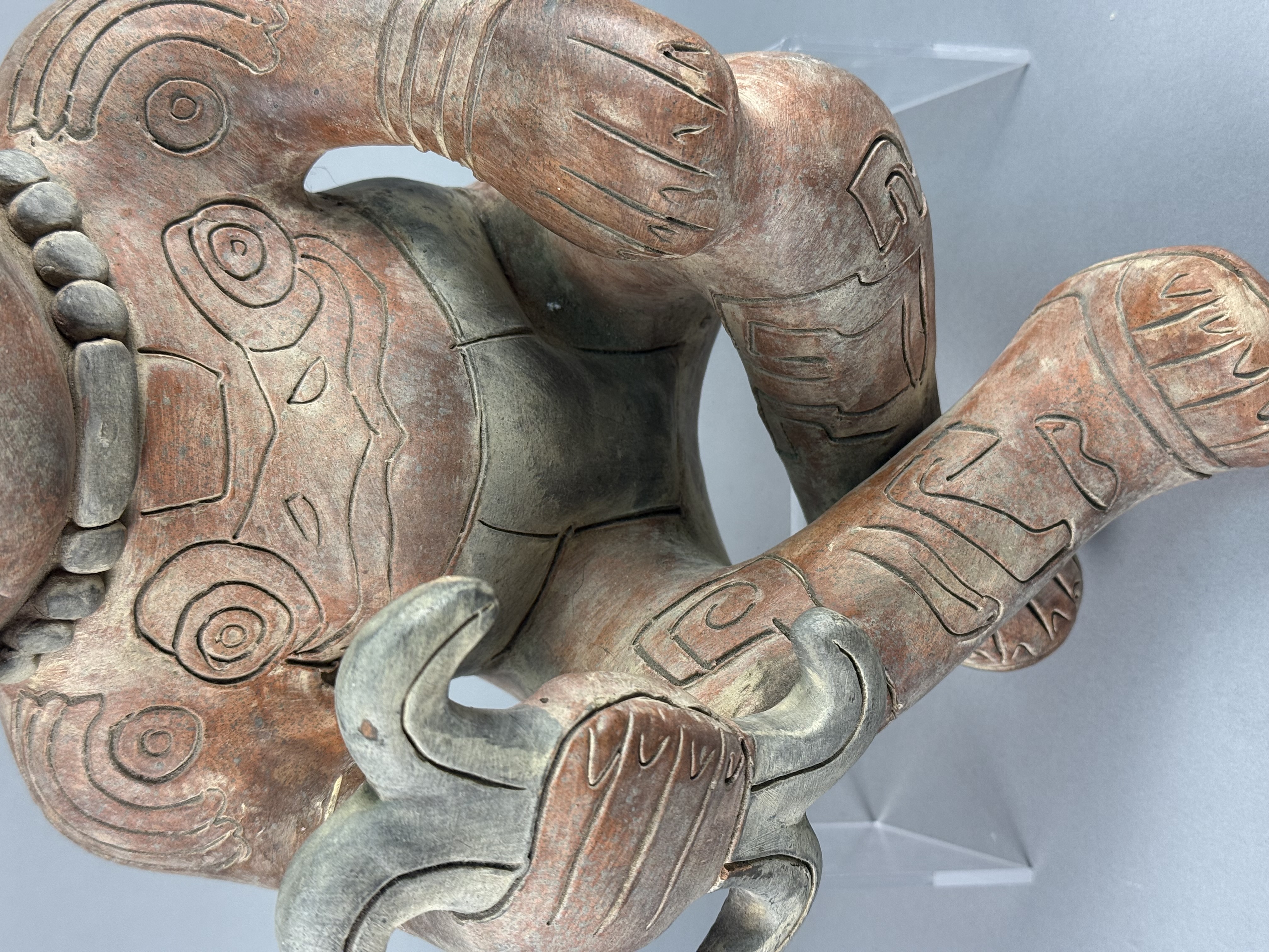 This large-scale ceramic anthropomorphic figure is rendered in a Pre-Columbian style, characteristic of Mesoamerican traditions such as those from West Mexico or the Gulf Coast. The object is constructed from terracotta with a burnished red slip and dark pigment highlights. The figure is depicted in a crouching posture, holding a three-pronged manopla or hand-stone in the right hand, a tool traditionally associated with the Mesoamerican ballgame. The figure is adorned with an elaborate tiered headdress containing a central zoomorphic mask, large circular earspools, and a heavy beaded necklace. A wide waistband or belt is visible around the torso. Detailed incised curvilinear and geometric motifs decorate the arms, legs, and chest, representing ritual body paint or tattoos. No maker marks or signatures are present on the piece. Height: 17 inches The item shows an aged appearance with surface wear, pitting, and losses to the slip and pigment throughout. Visible seam lines and surface inconsistencies indicate areas of professional restoration, specifically around the neck and limbs.