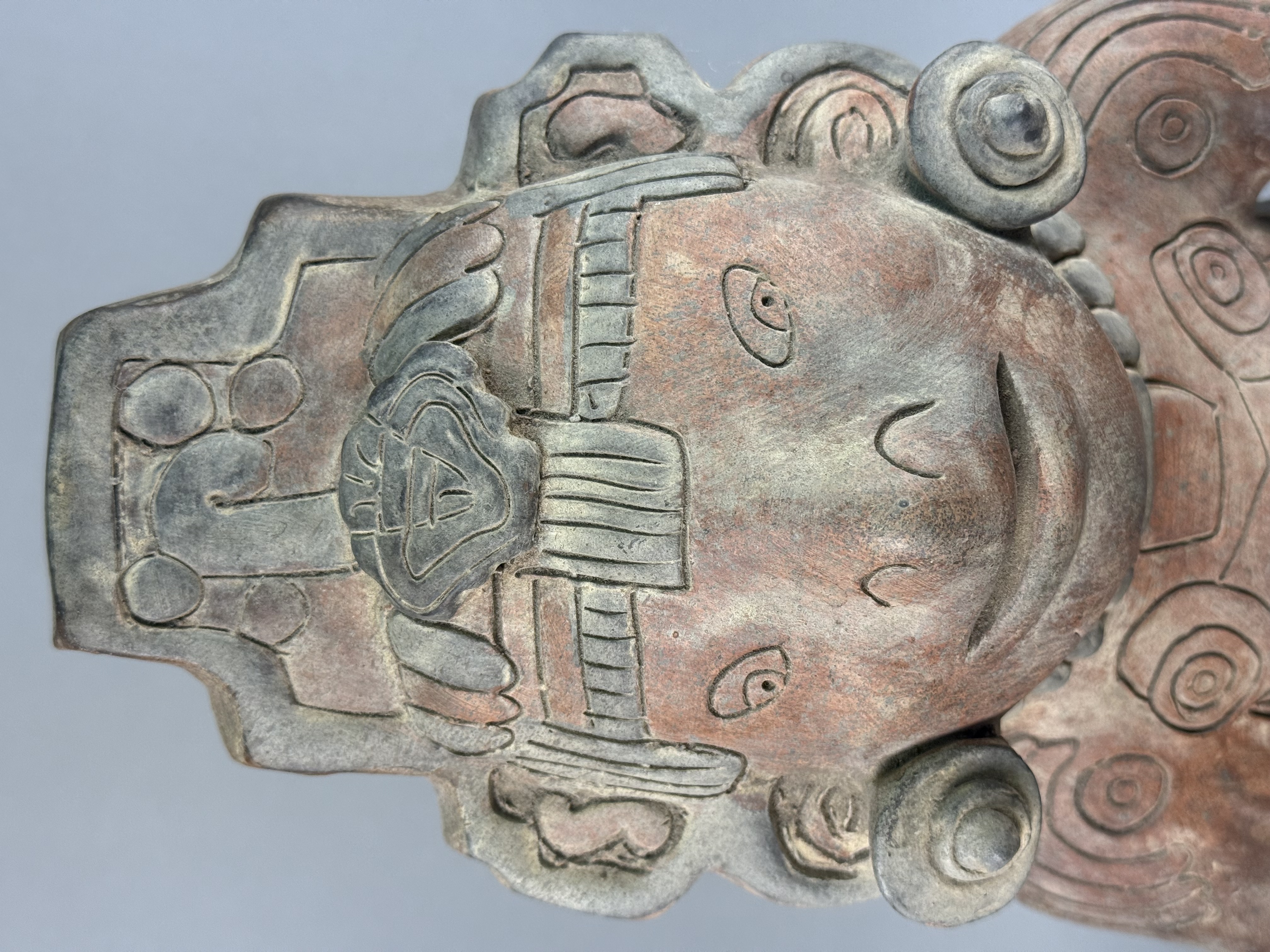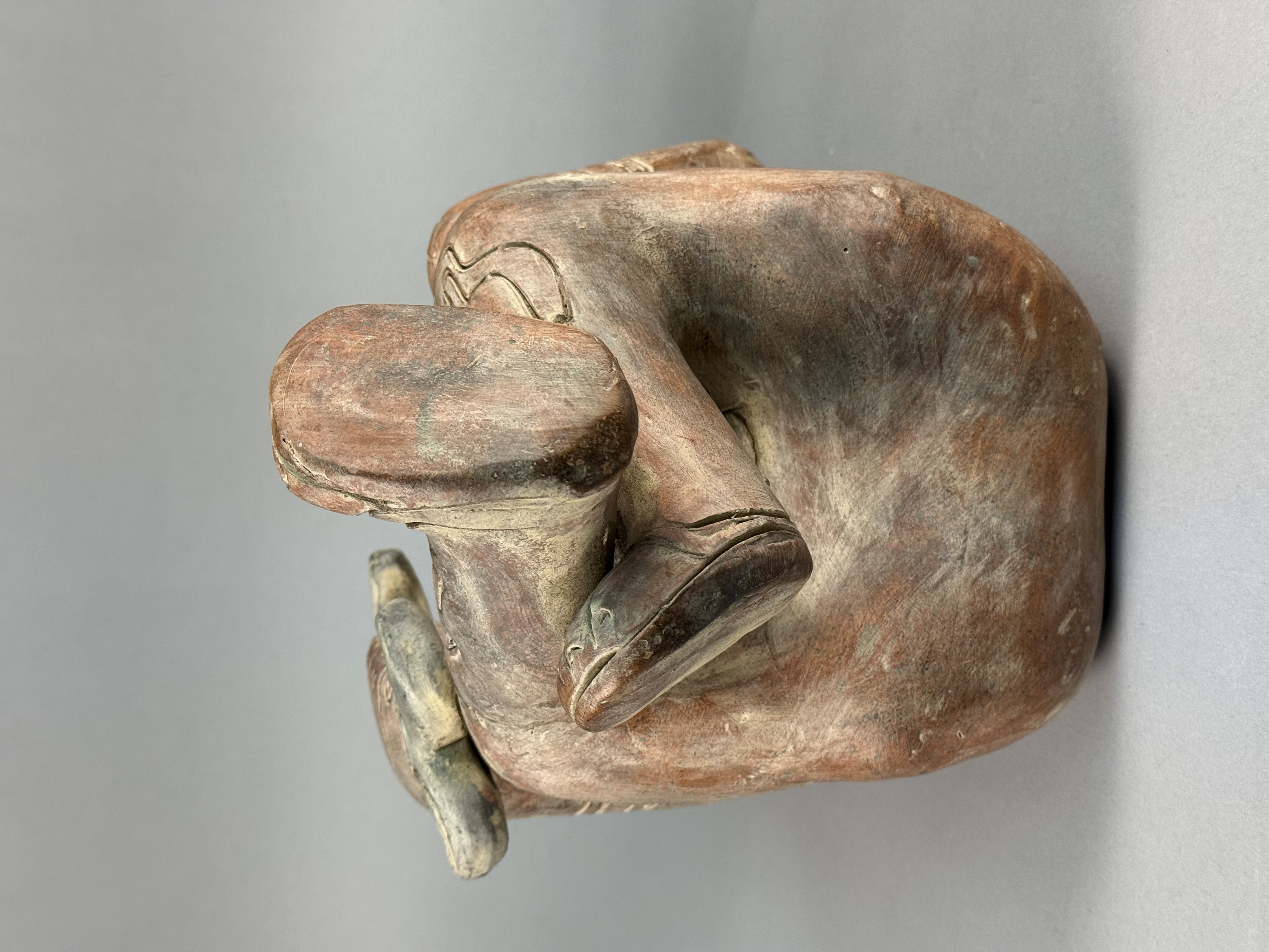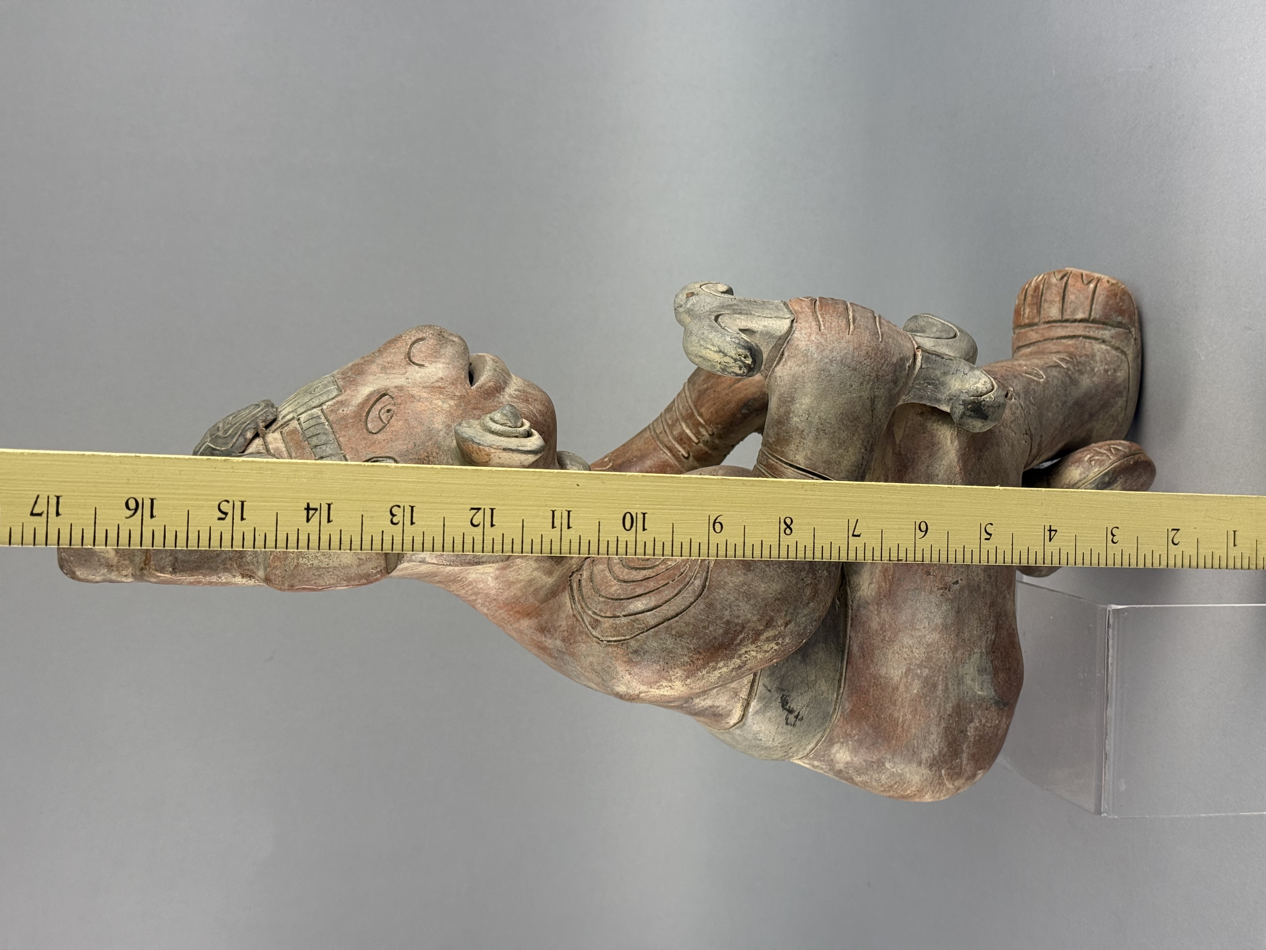 This large-scale ceramic anthropomorphic figure is rendered in a Pre-Columbian style, characteristic of Mesoamerican traditions such as those from West Mexico or the Gulf Coast. The object is constructed from terracotta with a burnished red slip and dark pigment highlights. The figure is depicted in a crouching posture, holding a three-pronged manopla or hand-stone in the right hand, a tool traditionally associated with the Mesoamerican ballgame. The figure is adorned with an elaborate tiered headdress containing a central zoomorphic mask, large circular earspools, and a heavy beaded necklace. A wide waistband or belt is visible around the torso. Detailed incised curvilinear and geometric motifs decorate the arms, legs, and chest, representing ritual body paint or tattoos. No maker marks or signatures are present on the piece. Height: 17 inches The item shows an aged appearance with surface wear, pitting, and losses to the slip and pigment throughout. Visible seam lines and surface inconsistencies indicate areas of professional restoration, specifically around the neck and limbs.
