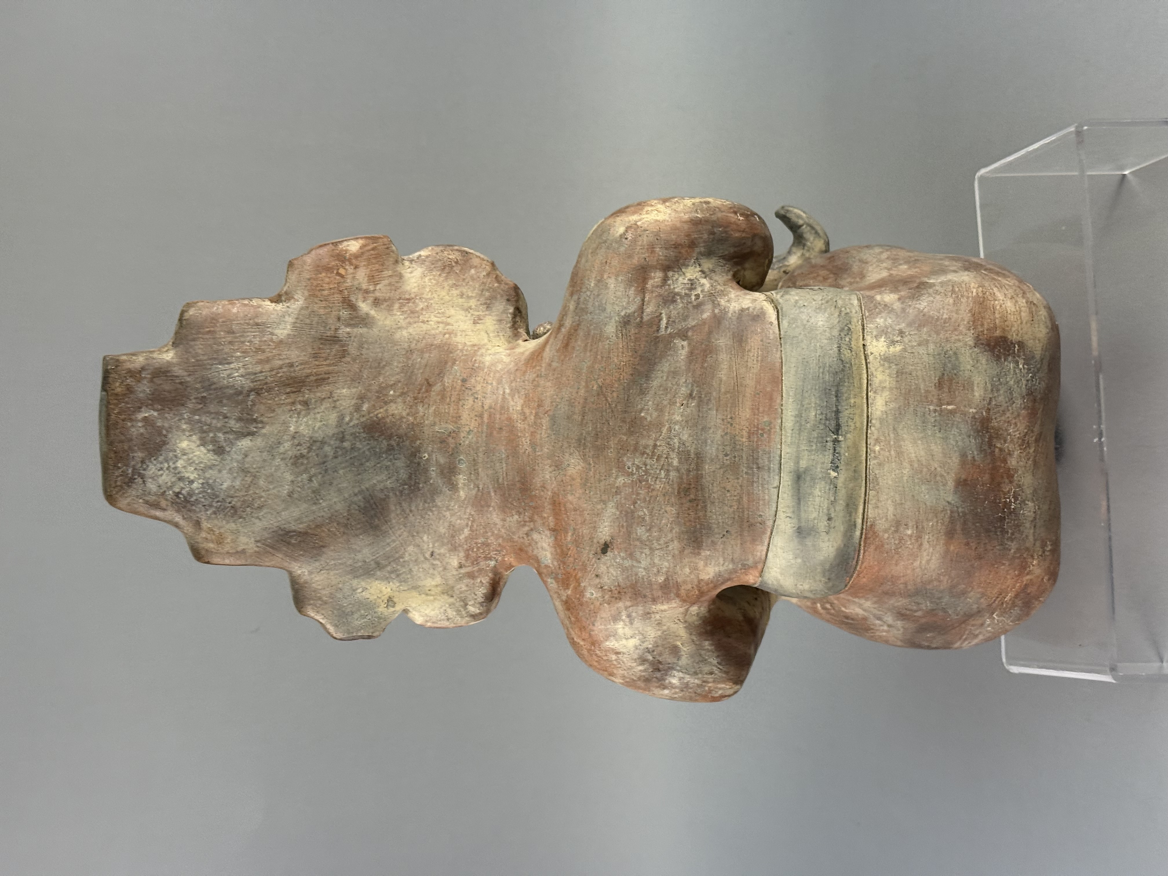 The item shows an aged appearance with surface wear, pitting, and losses to the slip and pigment throughout. Visible seam lines and surface inconsistencies indicate areas of professional restoration, specifically around the neck and limbs.