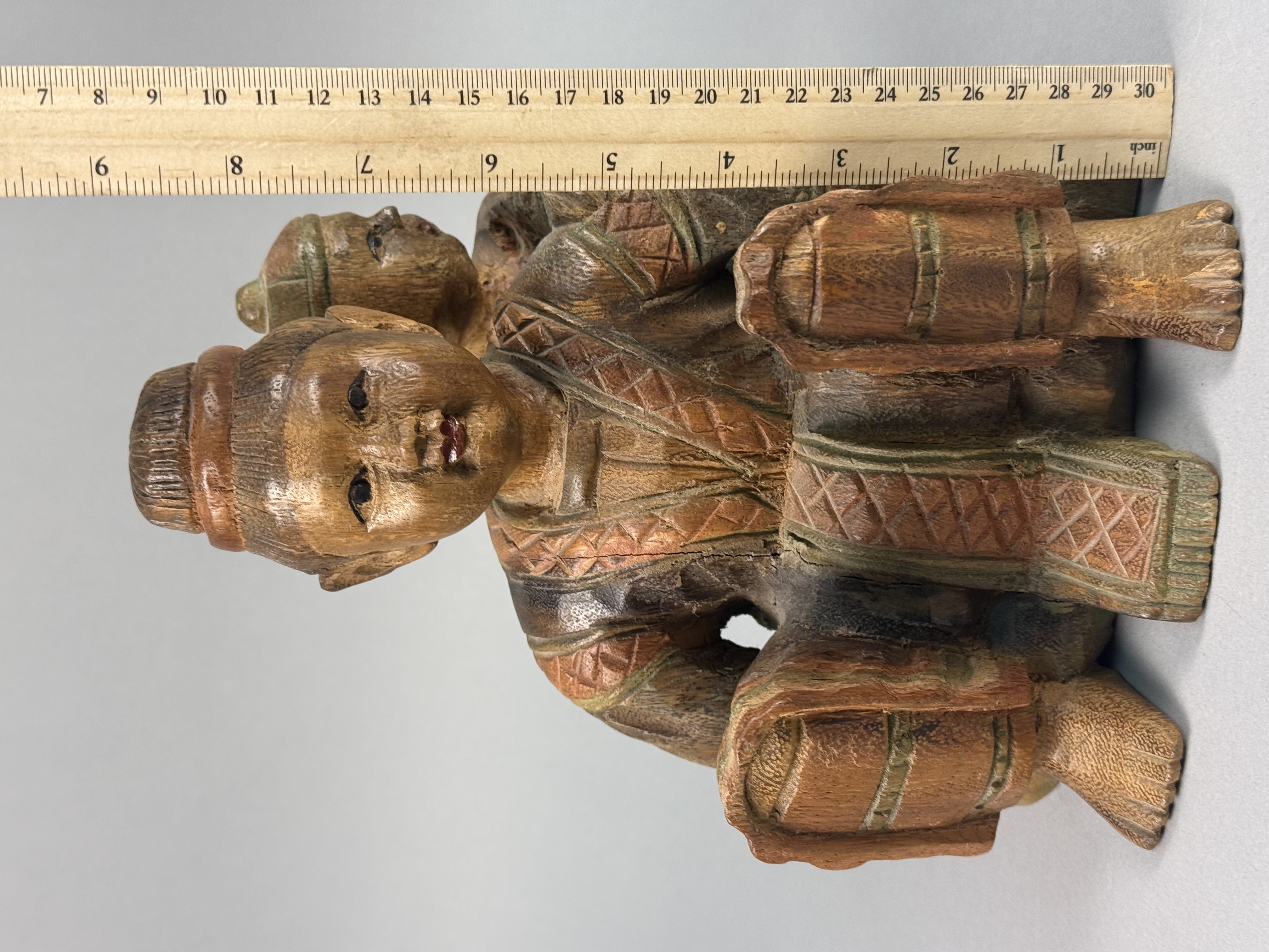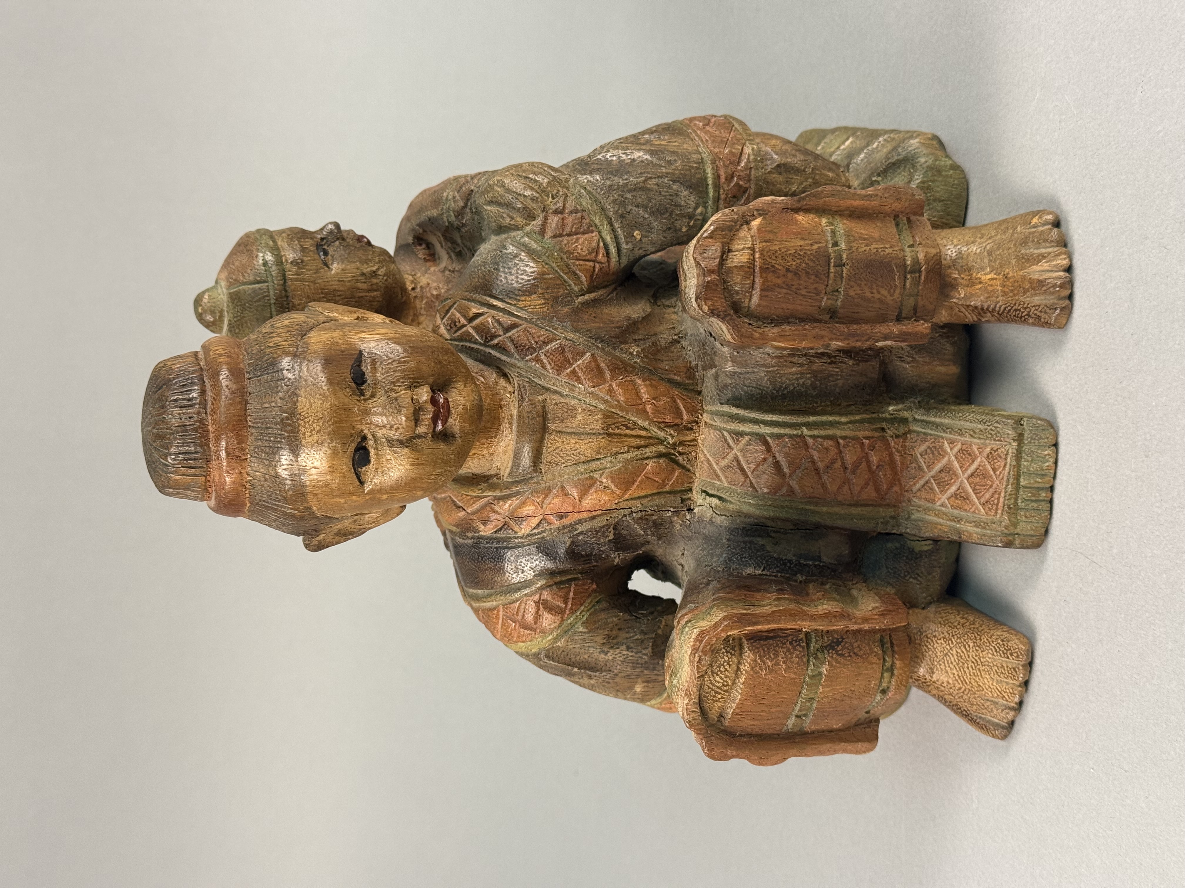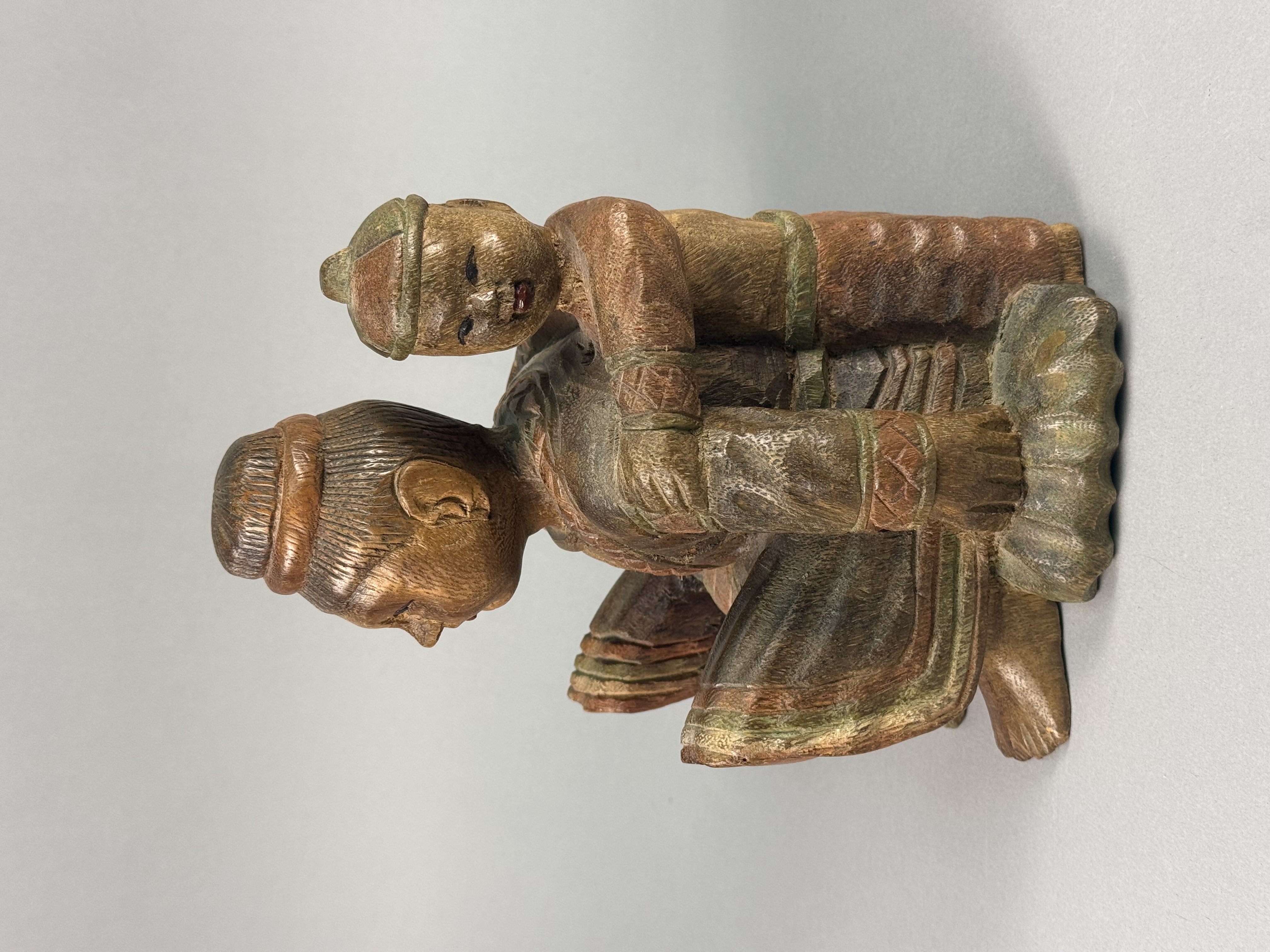 This hand-carved wooden sculpture depicts two figures in a secular folk scene, featuring a larger crouching adult carrying a smaller child on their back. The figures are rendered in a style characteristic of Southeast Asian folk art, possibly originating from Burma or a neighboring region. Both figures wear traditional garments decorated with incised geometric patterns, including cross-hatched diamond motifs on the borders and sleeves. They are depicted with stylized facial features and traditional headpieces. The sculpture is finished with traces of polychrome pigment in reddish-brown and green tones. The construction shows evidence of manual carving techniques throughout the form and decorative details. No maker marks or signatures are present on the visible surfaces. 6 inches H x 7.5 inches W The sculpture is in good overall condition consistent with age and handling. A prominent vertical age-related crack is visible on the front chest of the larger figure. The polychrome finish shows significant fading and wear. General surface scuffs, minor chips, and natural desiccation of the wood are present throughout the piece.