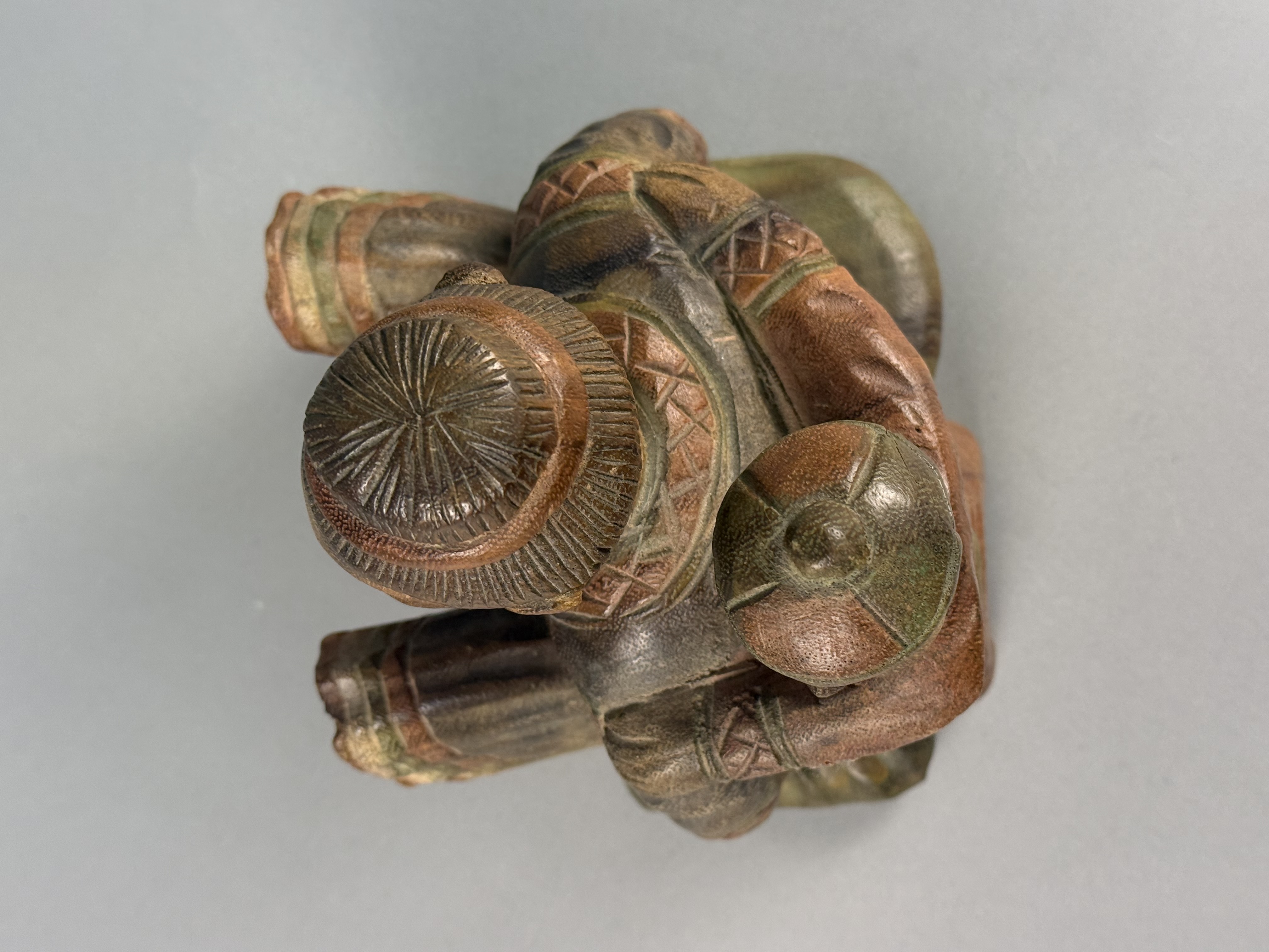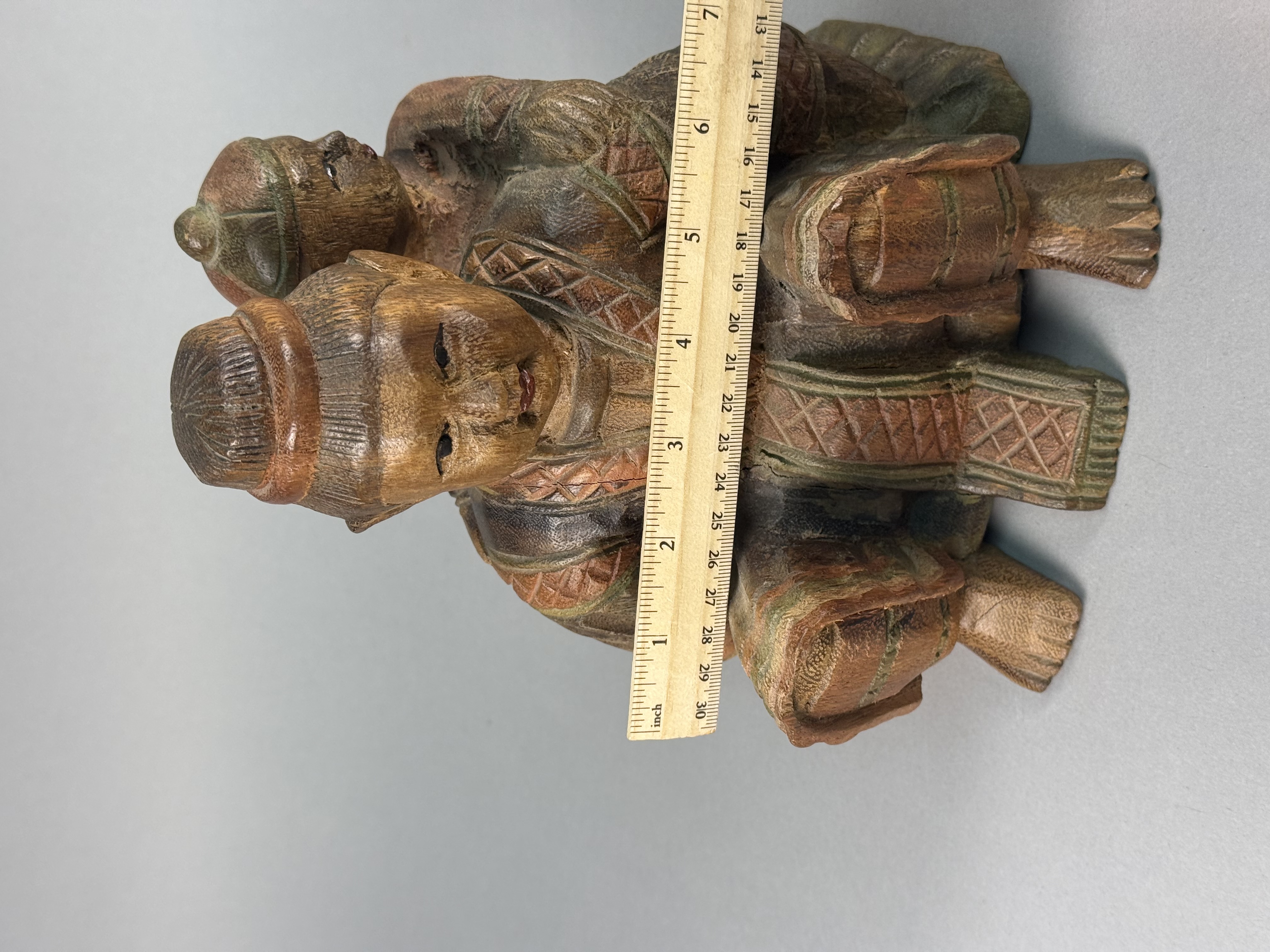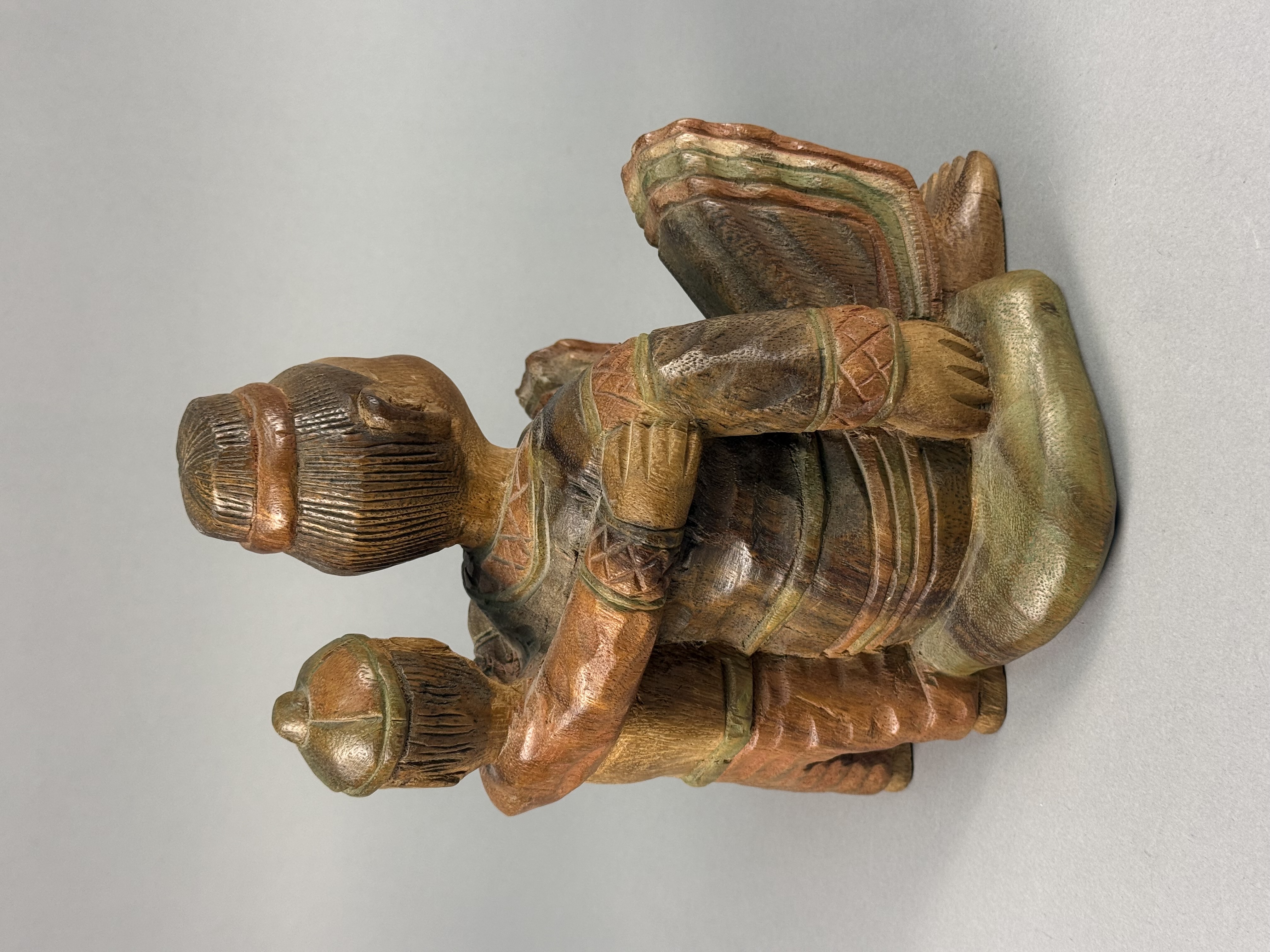 This hand-carved wooden sculpture depicts two figures in a secular folk scene, featuring a larger crouching adult carrying a smaller child on their back. The figures are rendered in a style characteristic of Southeast Asian folk art, possibly originating from Burma or a neighboring region. Both figures wear traditional garments decorated with incised geometric patterns, including cross-hatched diamond motifs on the borders and sleeves. They are depicted with stylized facial features and traditional headpieces. The sculpture is finished with traces of polychrome pigment in reddish-brown and green tones. The construction shows evidence of manual carving techniques throughout the form and decorative details. No maker marks or signatures are present on the visible surfaces. 6 inches H x 7.5 inches W The sculpture is in good overall condition consistent with age and handling. A prominent vertical age-related crack is visible on the front chest of the larger figure. The polychrome finish shows significant fading and wear. General surface scuffs, minor chips, and natural desiccation of the wood are present throughout the piece.