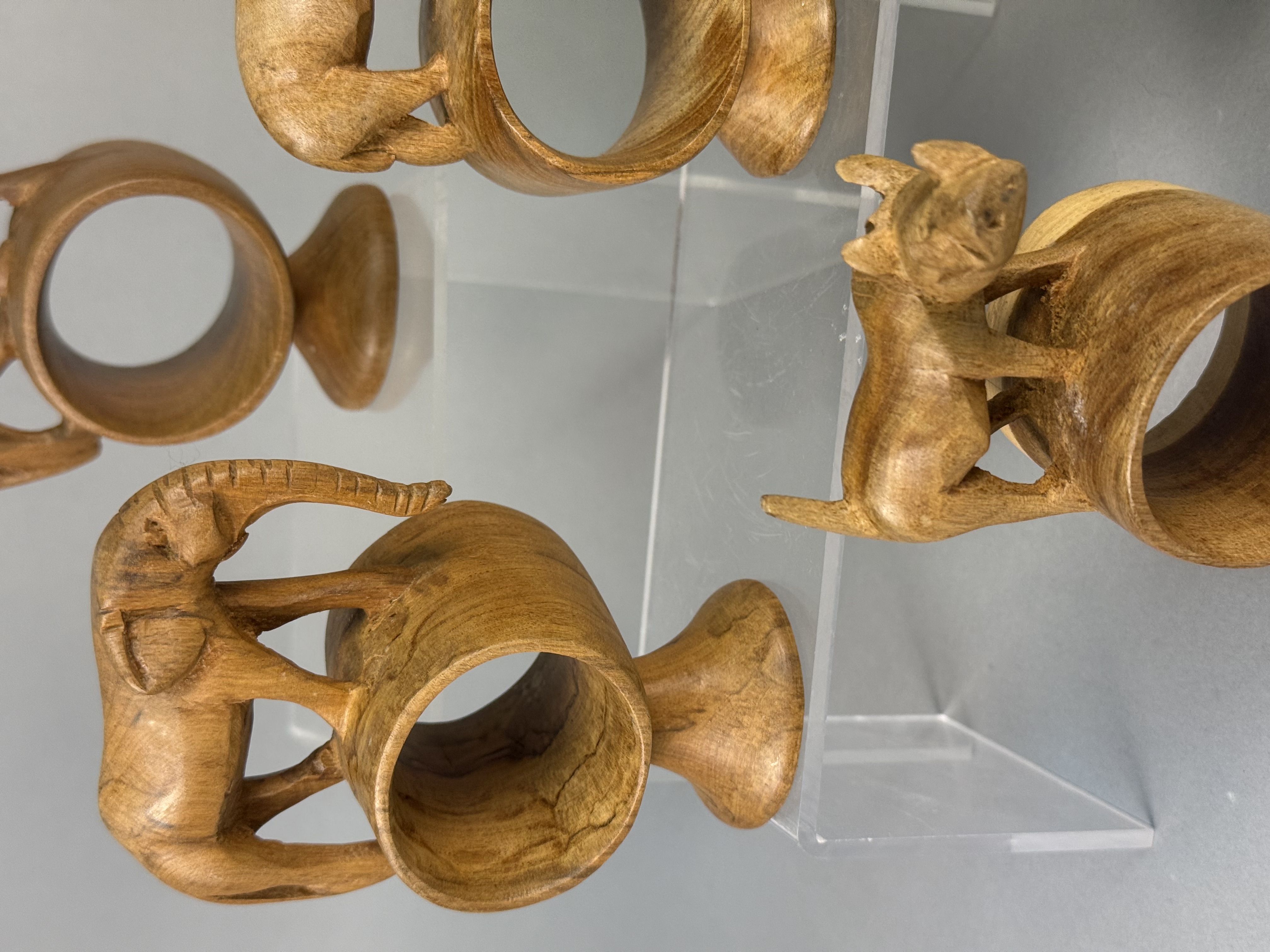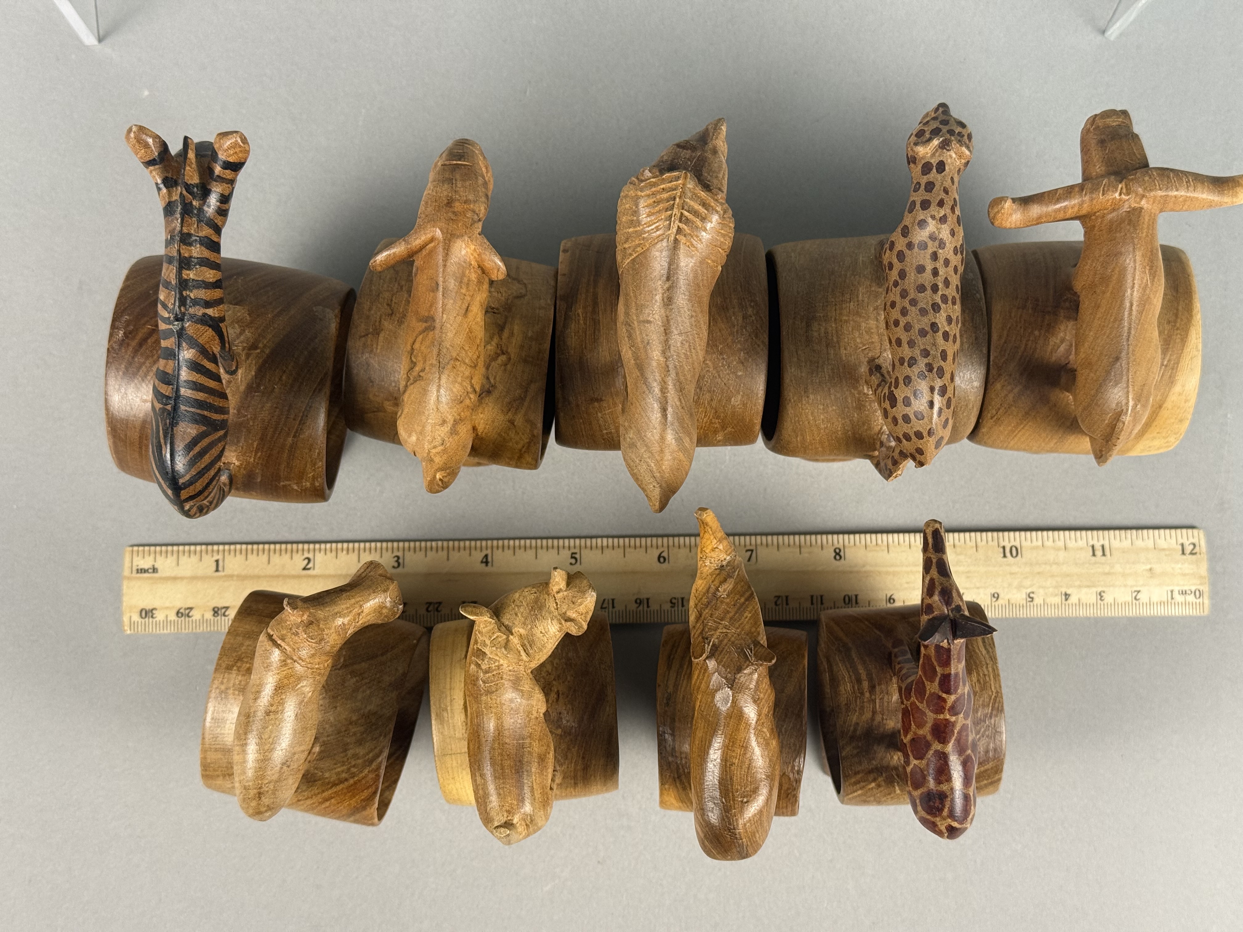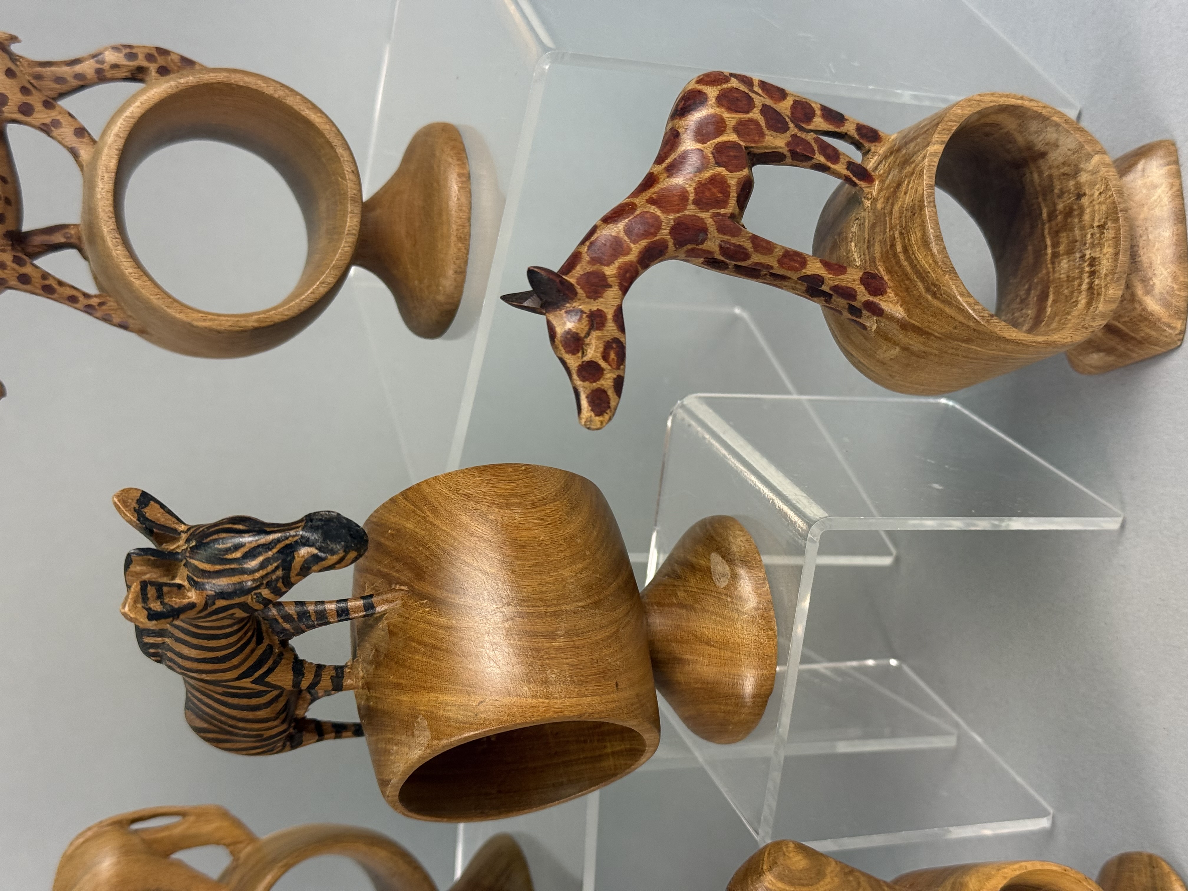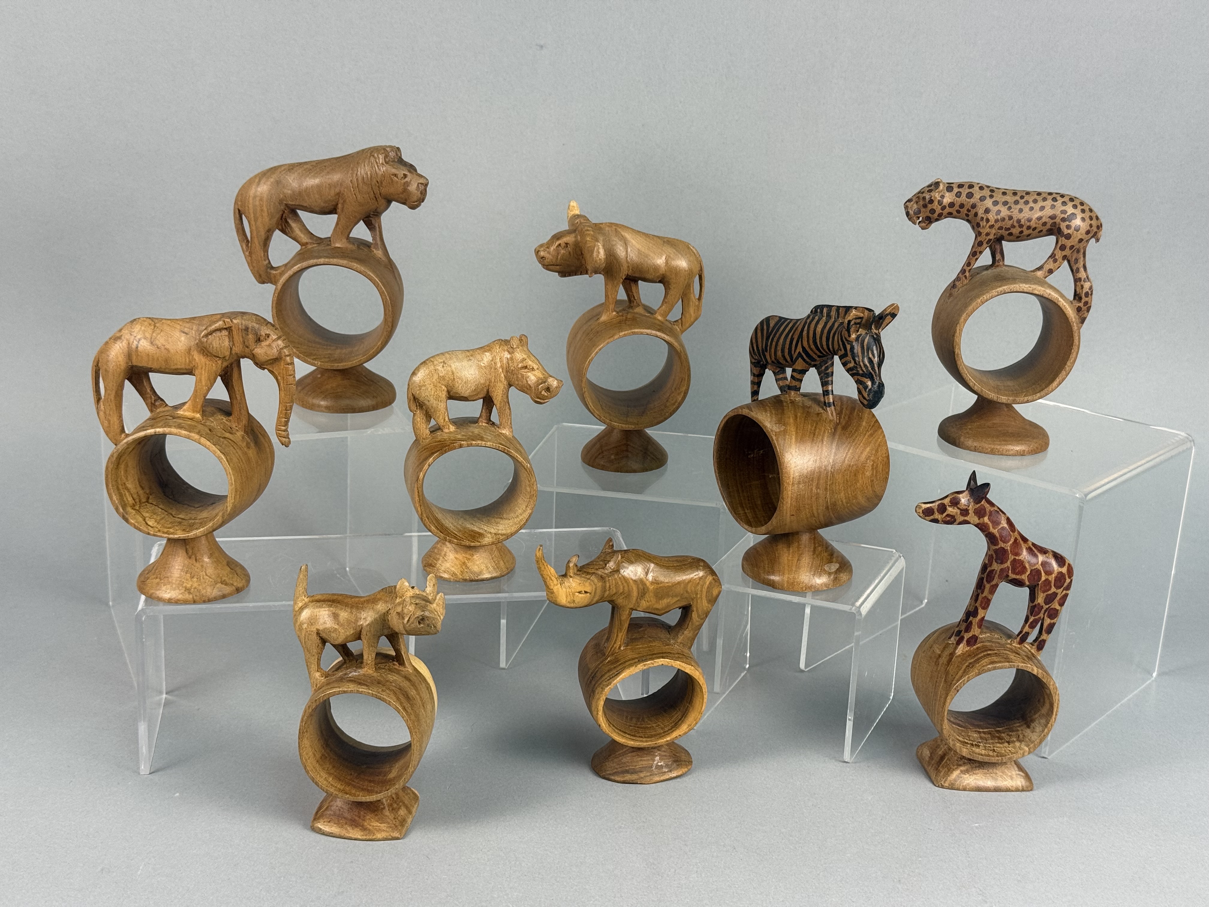 A collection of hand-carved wooden napkin rings, each featuring a different African safari animal figure including a lion, elephant, rhinoceros, giraffe, zebra, Cape buffalo, cheetah, hippopotamus, and warthog. The figures are mounted atop thick cylindrical rings, which are supported by integral, flared circular pedestals. Several pieces, specifically the zebra, giraffe, and cheetah, exhibit hand-painted decorative patterns to represent their respective coats, while the remainder are finished in a natural, polished wood tone. No maker’s marks or signatures are visible on the bases or bodies of the items. Heights range from approximately 3.5 to 5 inches The collection is in good vintage condition with minor surface scuffing and natural variations in the wood grain.