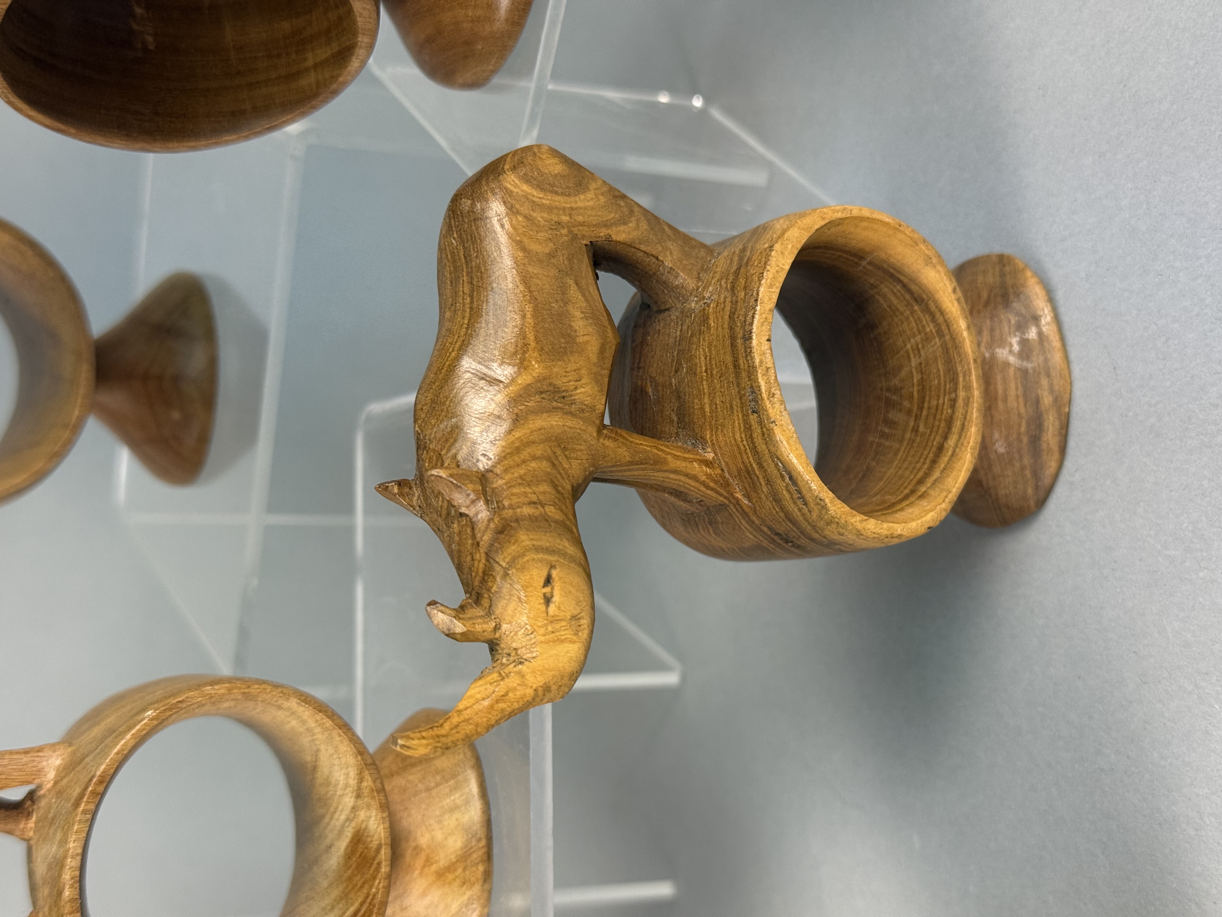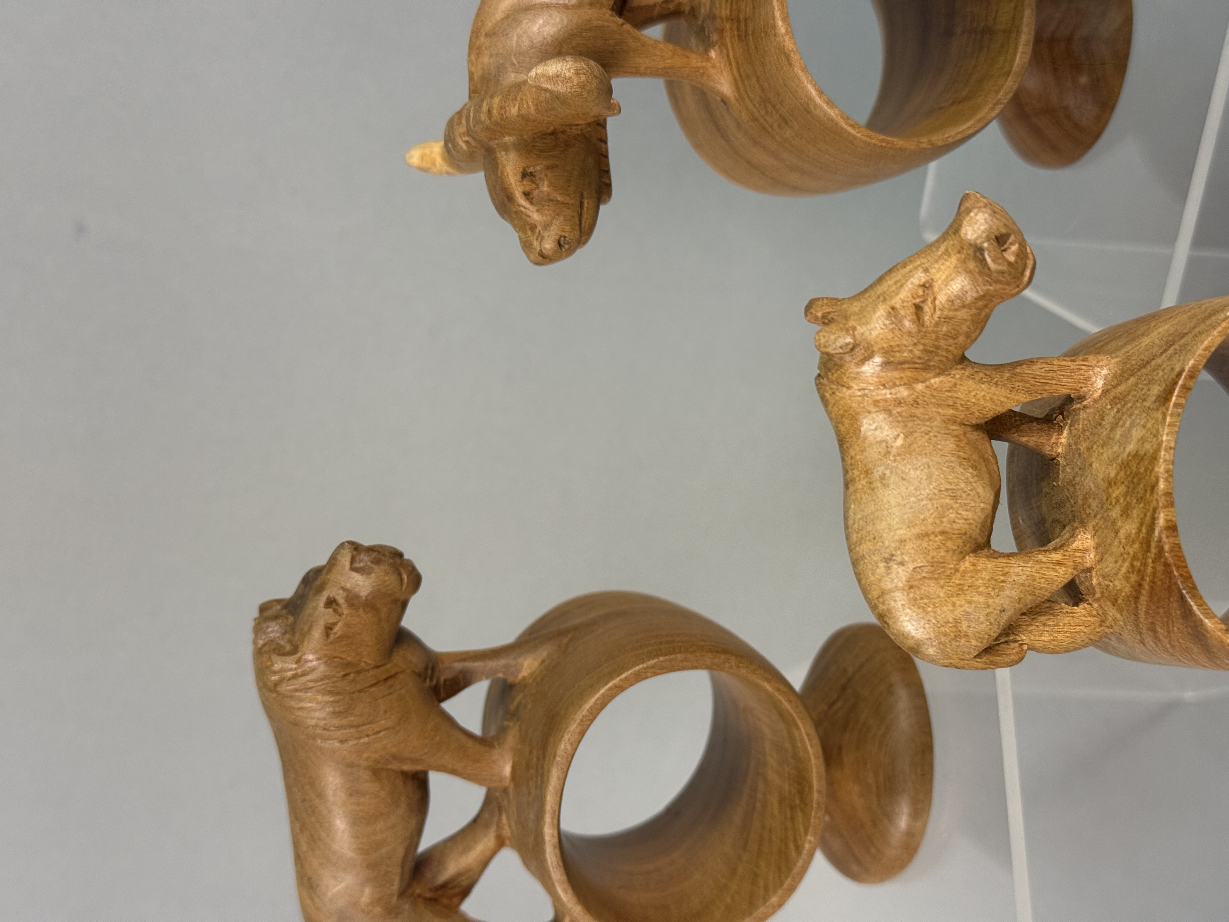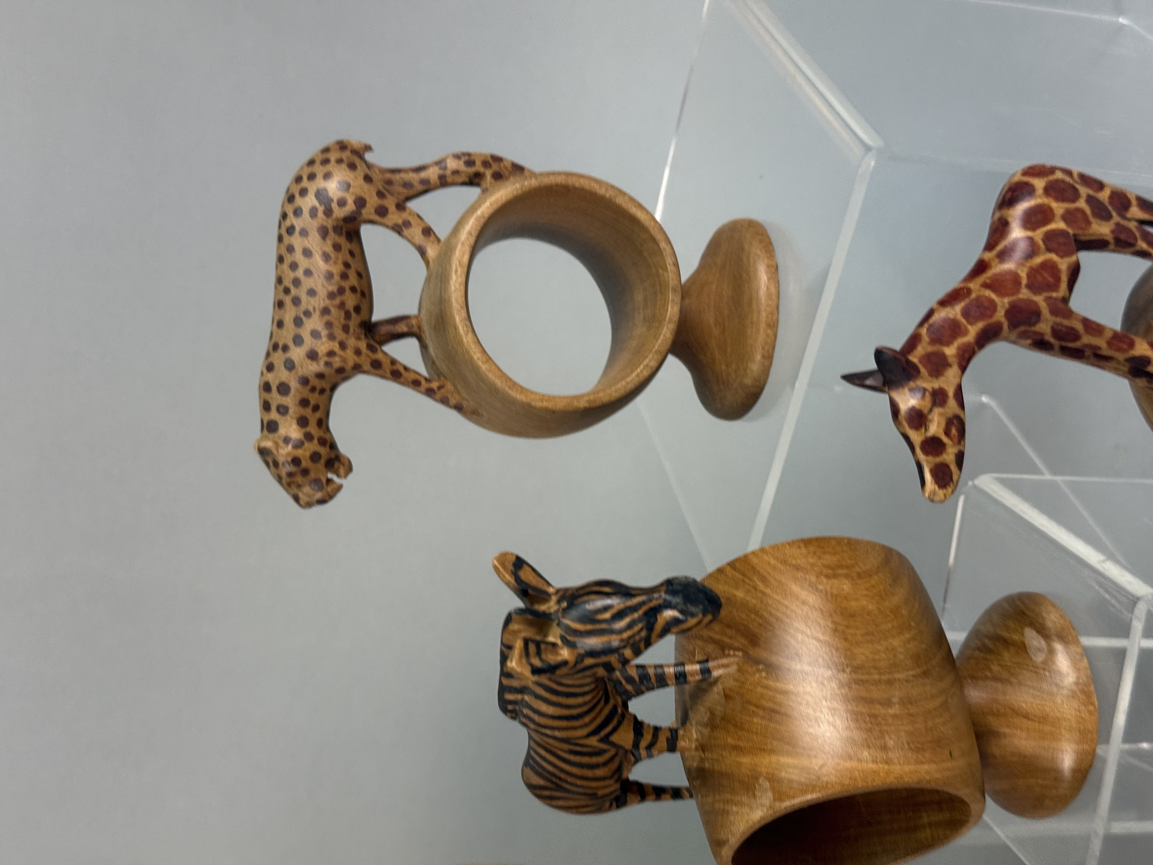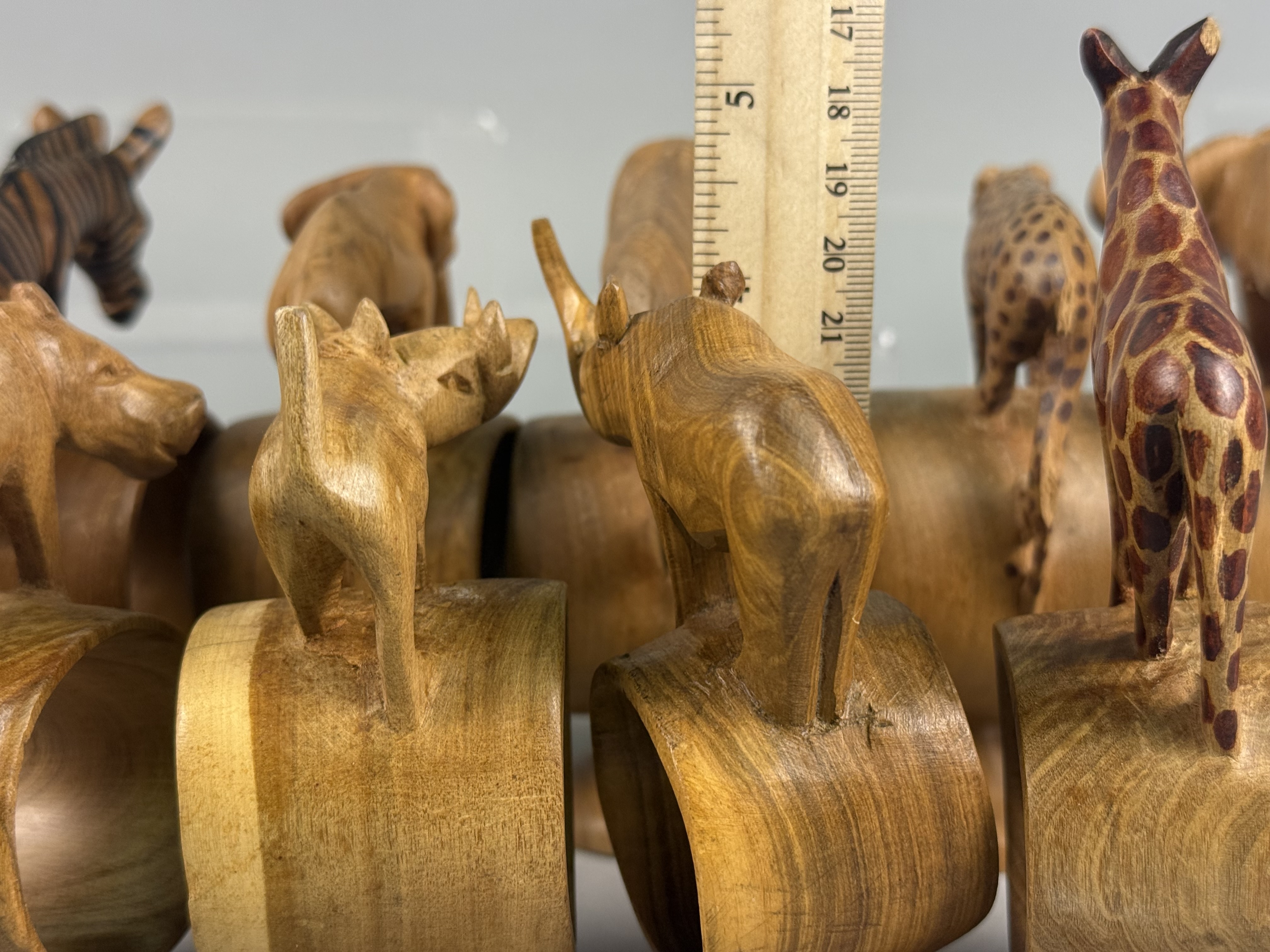 A collection of hand-carved wooden napkin rings, each featuring a different African safari animal figure including a lion, elephant, rhinoceros, giraffe, zebra, Cape buffalo, cheetah, hippopotamus, and warthog. The figures are mounted atop thick cylindrical rings, which are supported by integral, flared circular pedestals. Several pieces, specifically the zebra, giraffe, and cheetah, exhibit hand-painted decorative patterns to represent their respective coats, while the remainder are finished in a natural, polished wood tone. No maker’s marks or signatures are visible on the bases or bodies of the items. Heights range from approximately 3.5 to 5 inches The collection is in good vintage condition with minor surface scuffing and natural variations in the wood grain.