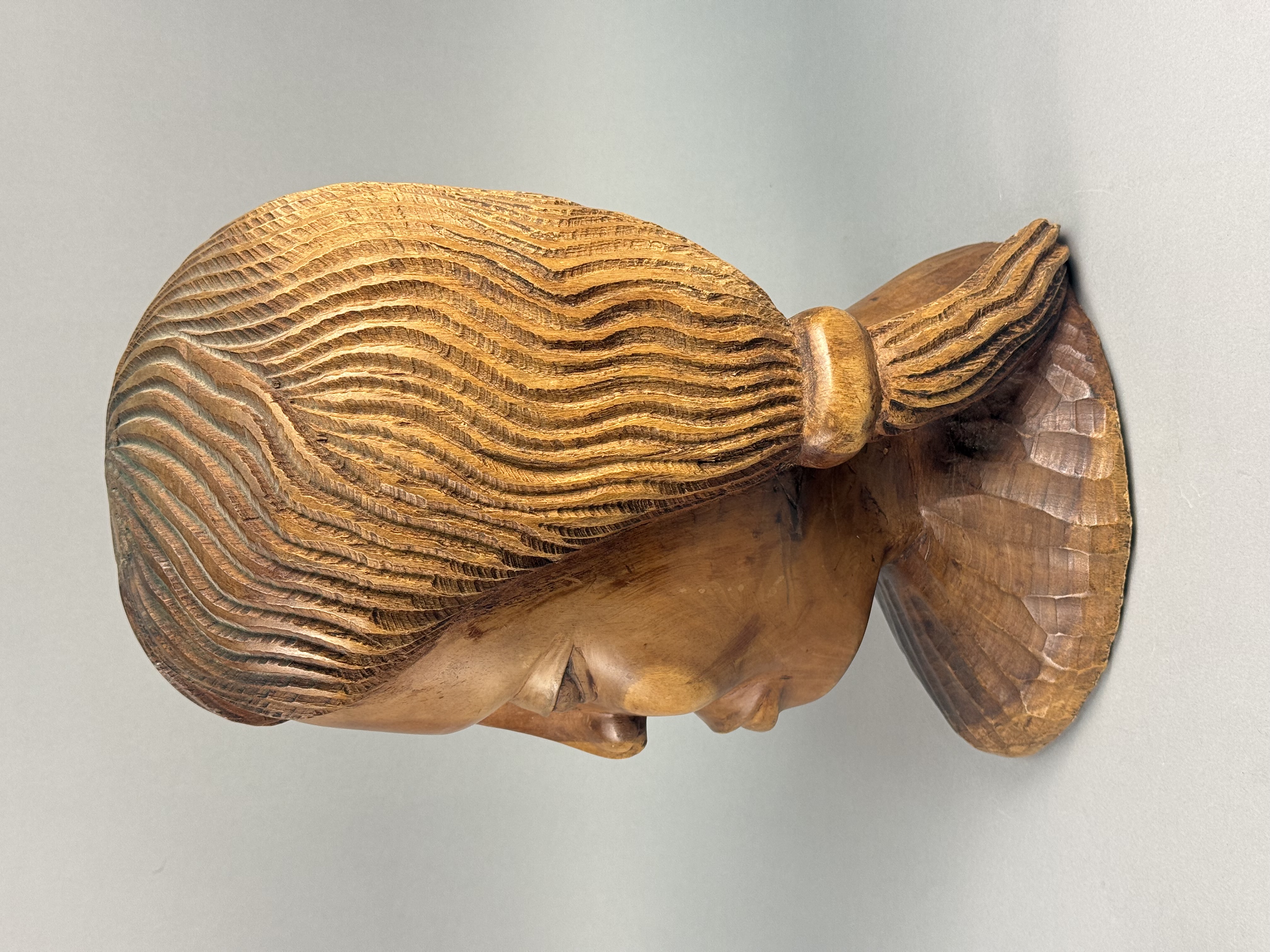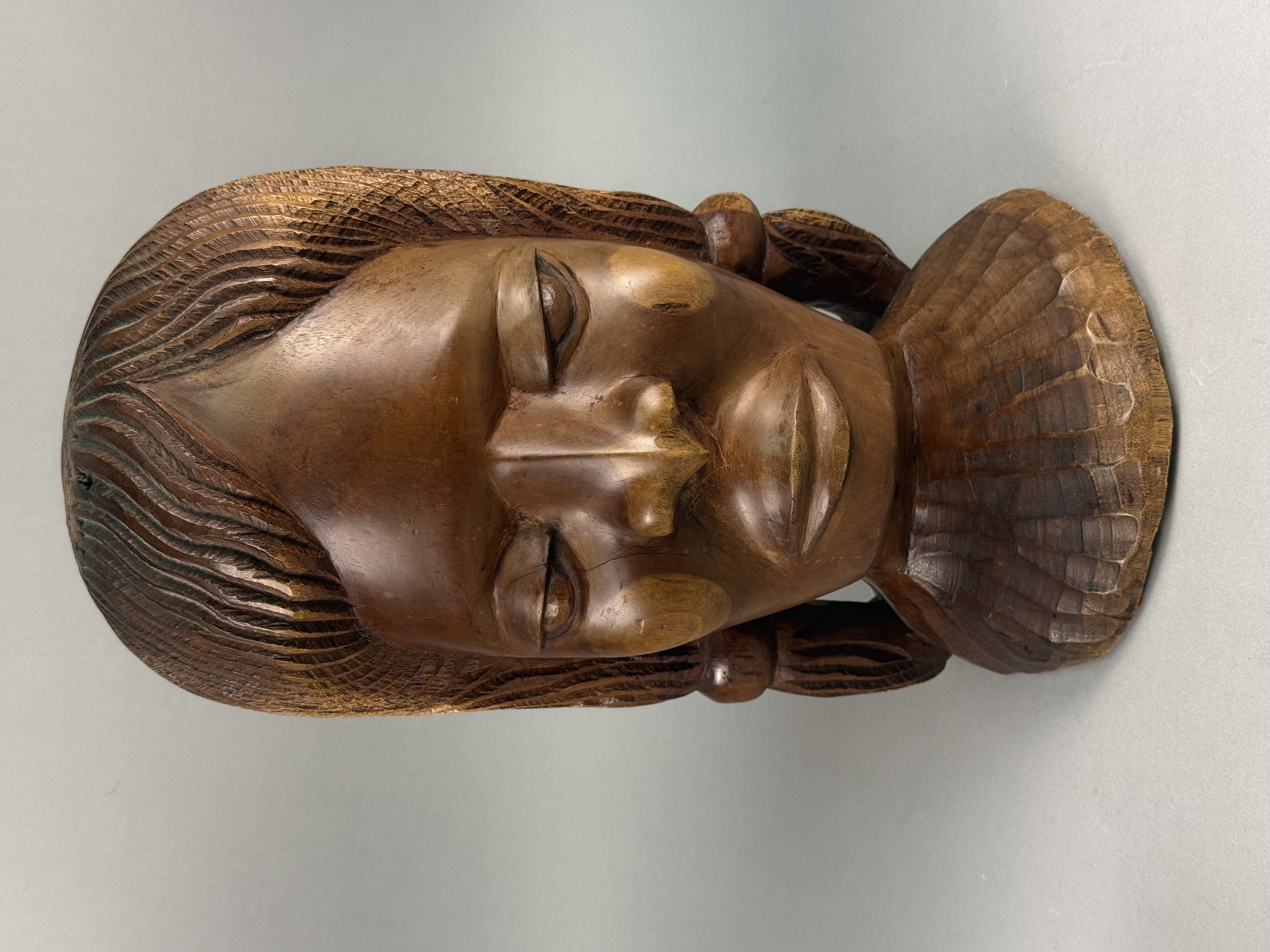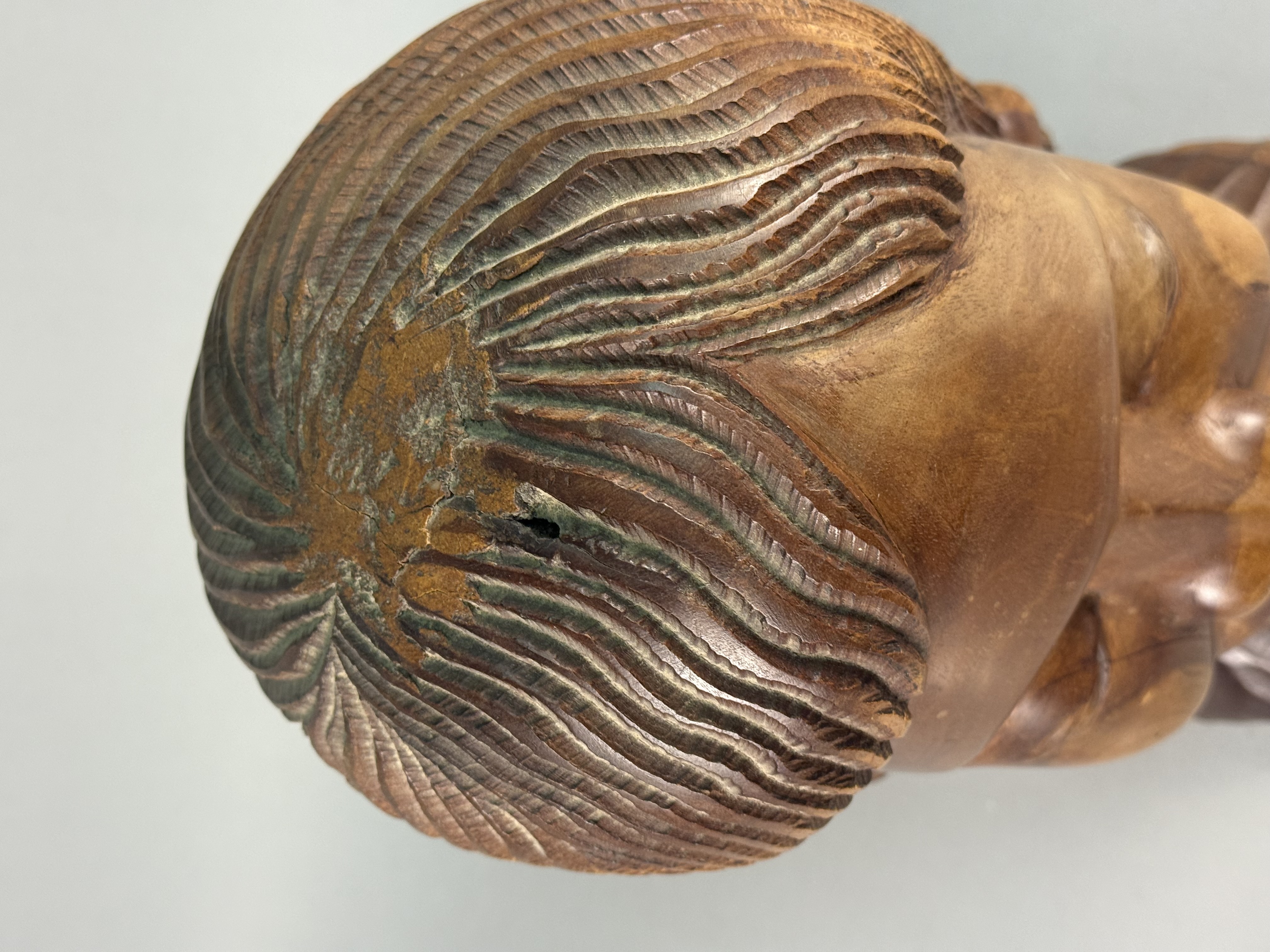 The sculpture is in good vintage condition. The surface shows light wear, minor scuffs, and small abrasions consistent with age and handling. A small natural fissure or hole is present at the crown of the head. The integral base remains structurally stable.