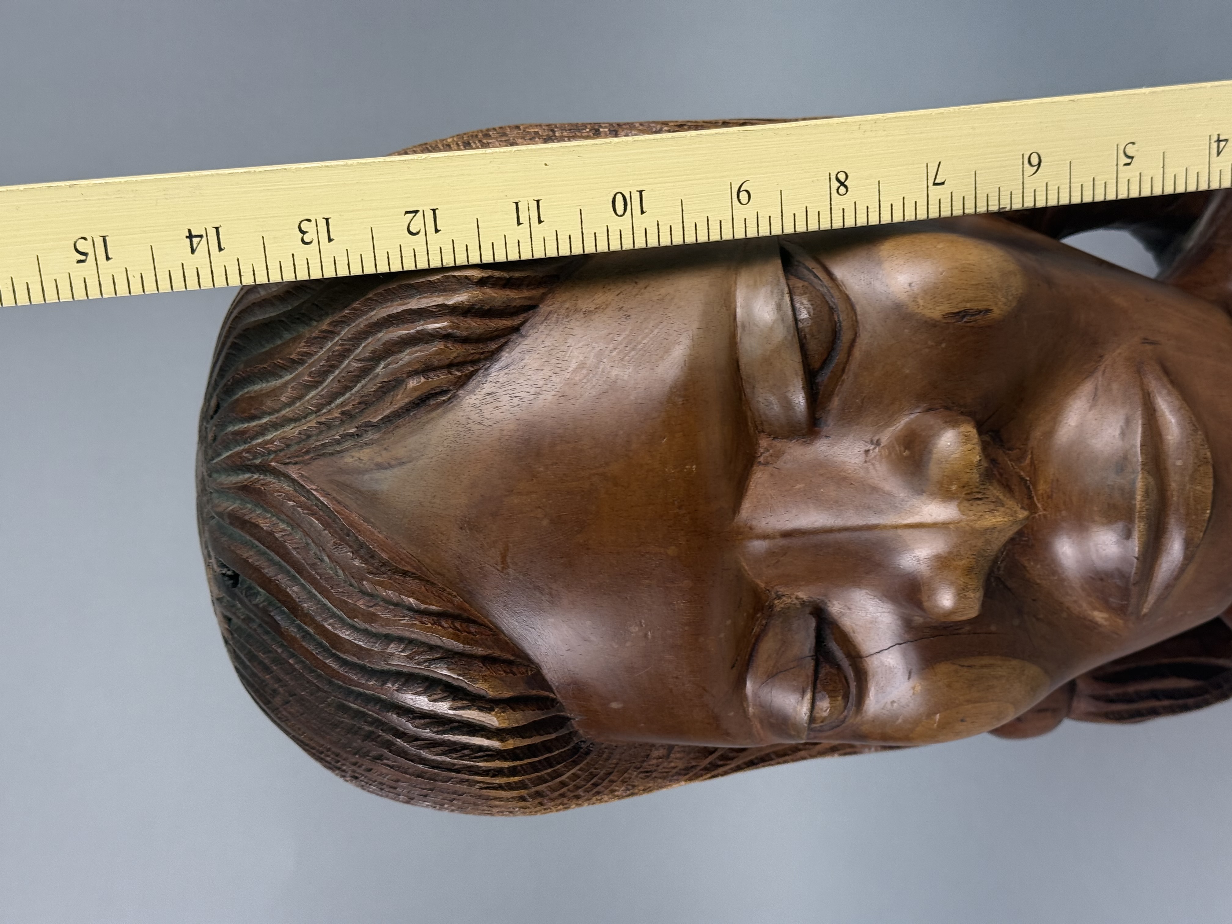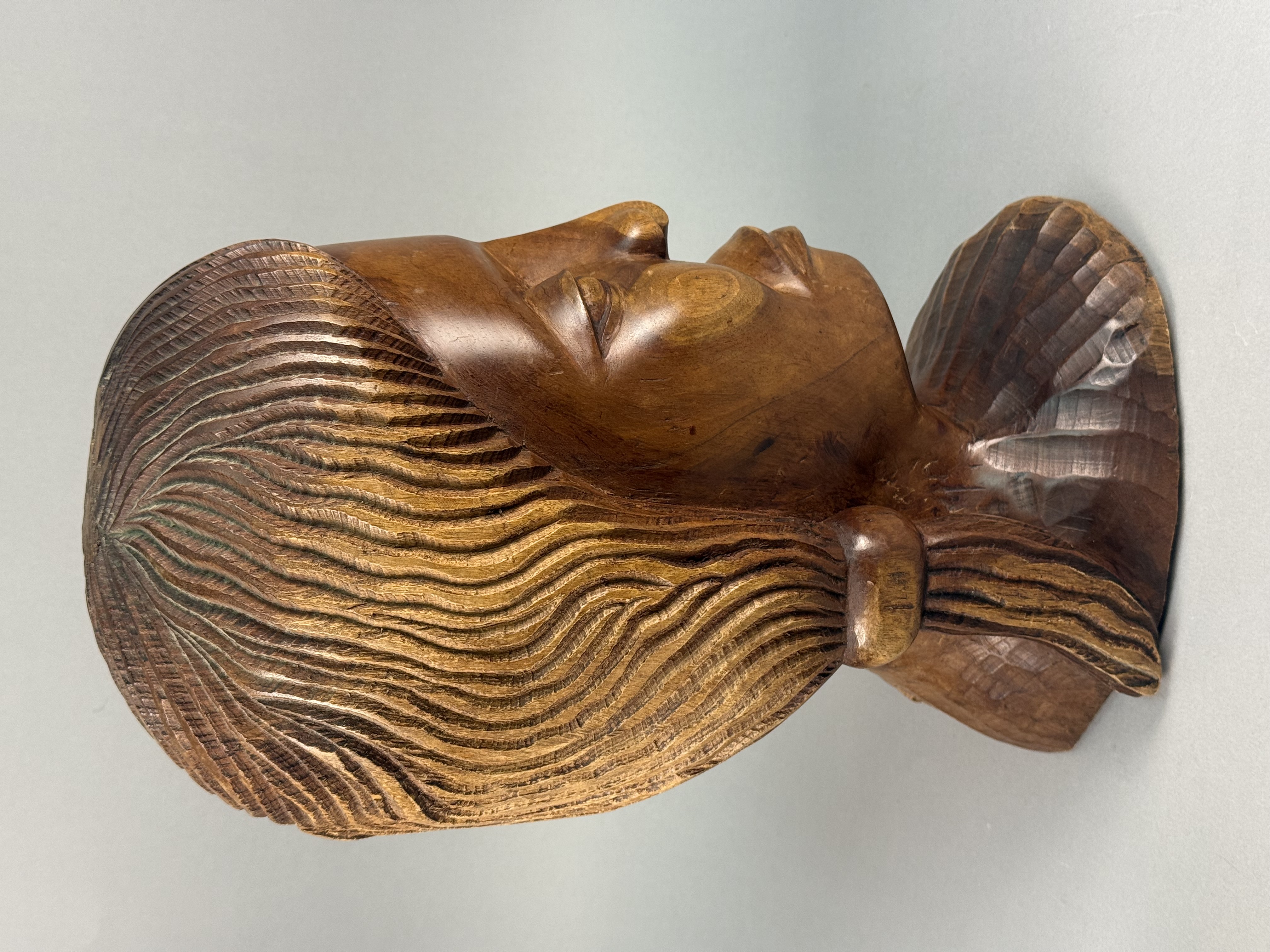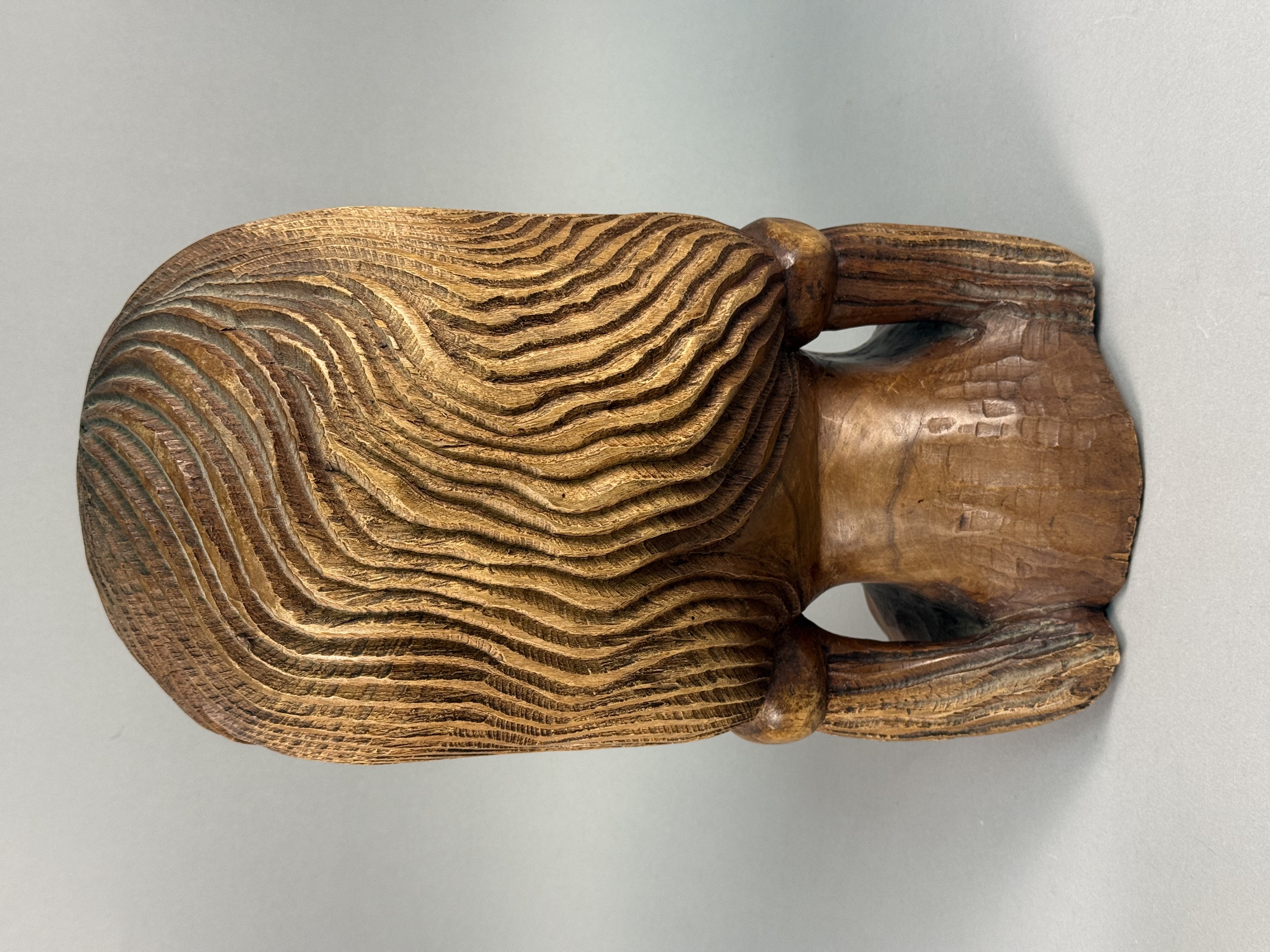 The sculpture is in good vintage condition. The surface shows light wear, minor scuffs, and small abrasions consistent with age and handling. A small natural fissure or hole is present at the crown of the head. The integral base remains structurally stable.