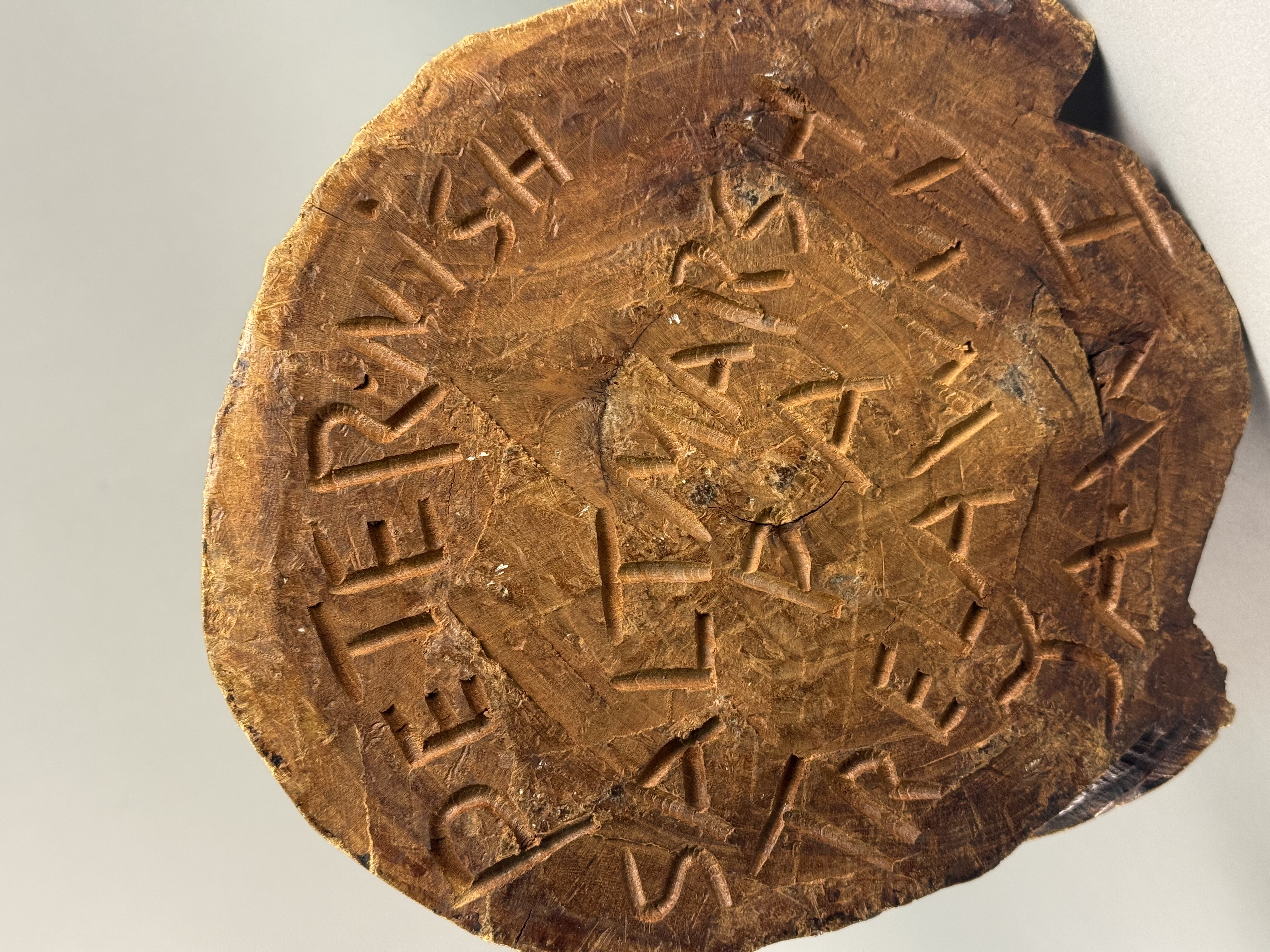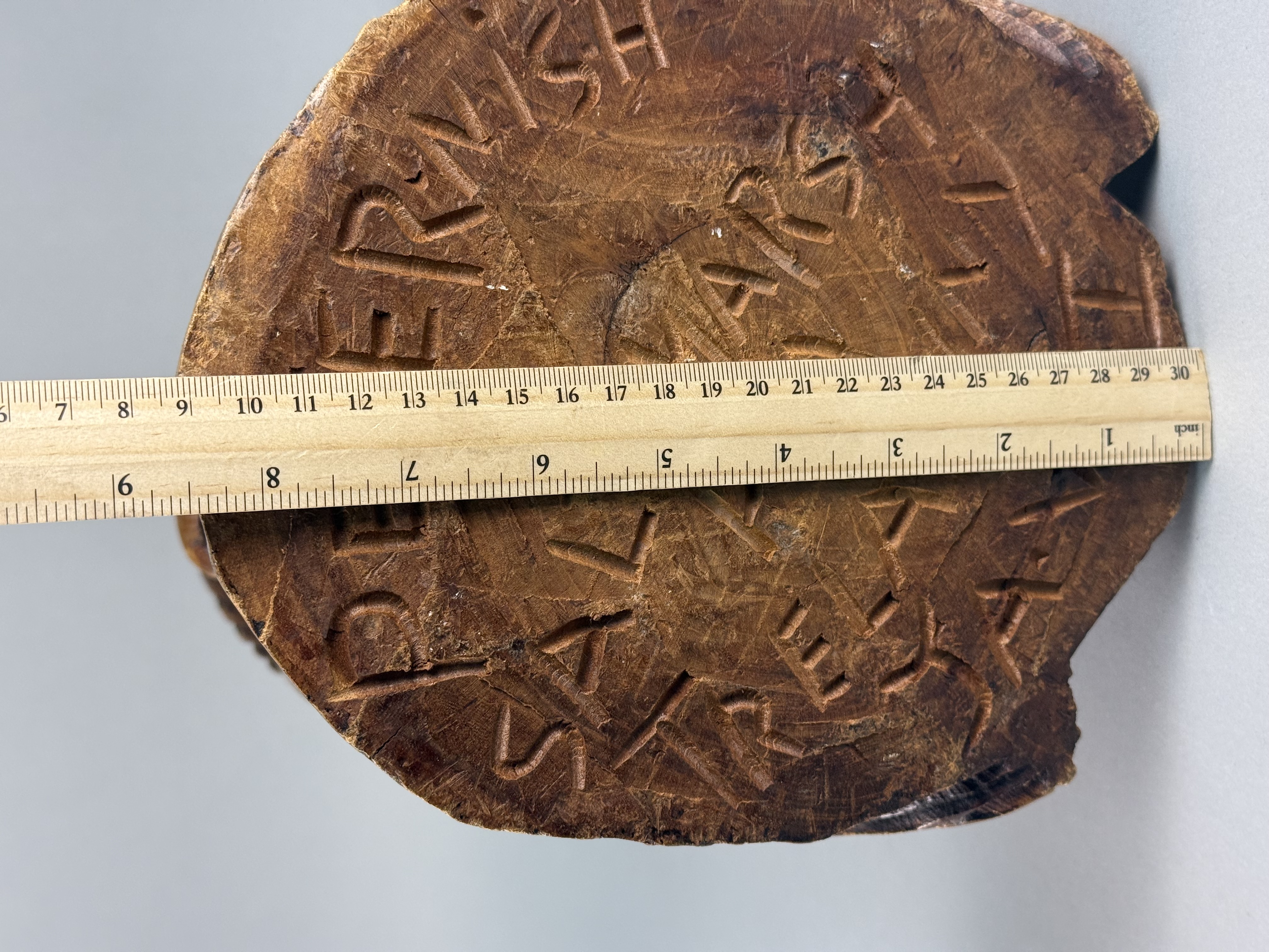 A hand-carved hardwood sculpture depicting the head and neck of a woman. The figure is rendered with a serene expression, closed eyes, and a broad nose. The hairstyle is highly stylized, featuring deep, wavy linear incisions that gather into two distinct tied bundles at the back. The bust rises from an integral, flared circular base that displays visible tool marks from the carving process. The wood has a polished, warm brown finish with natural variations in the grain. The underside of the base contains incised capital letters arranged in three lines. The upper curve reads PETER WISH, the center reads SALTMARSH, and the lower curve reads SAKREBAIA. The style and construction are consistent with mid-20th-century artisanal wood carvings produced in East Africa for the international export market. Base diameter: 8.75 inches Total height: 14 inches