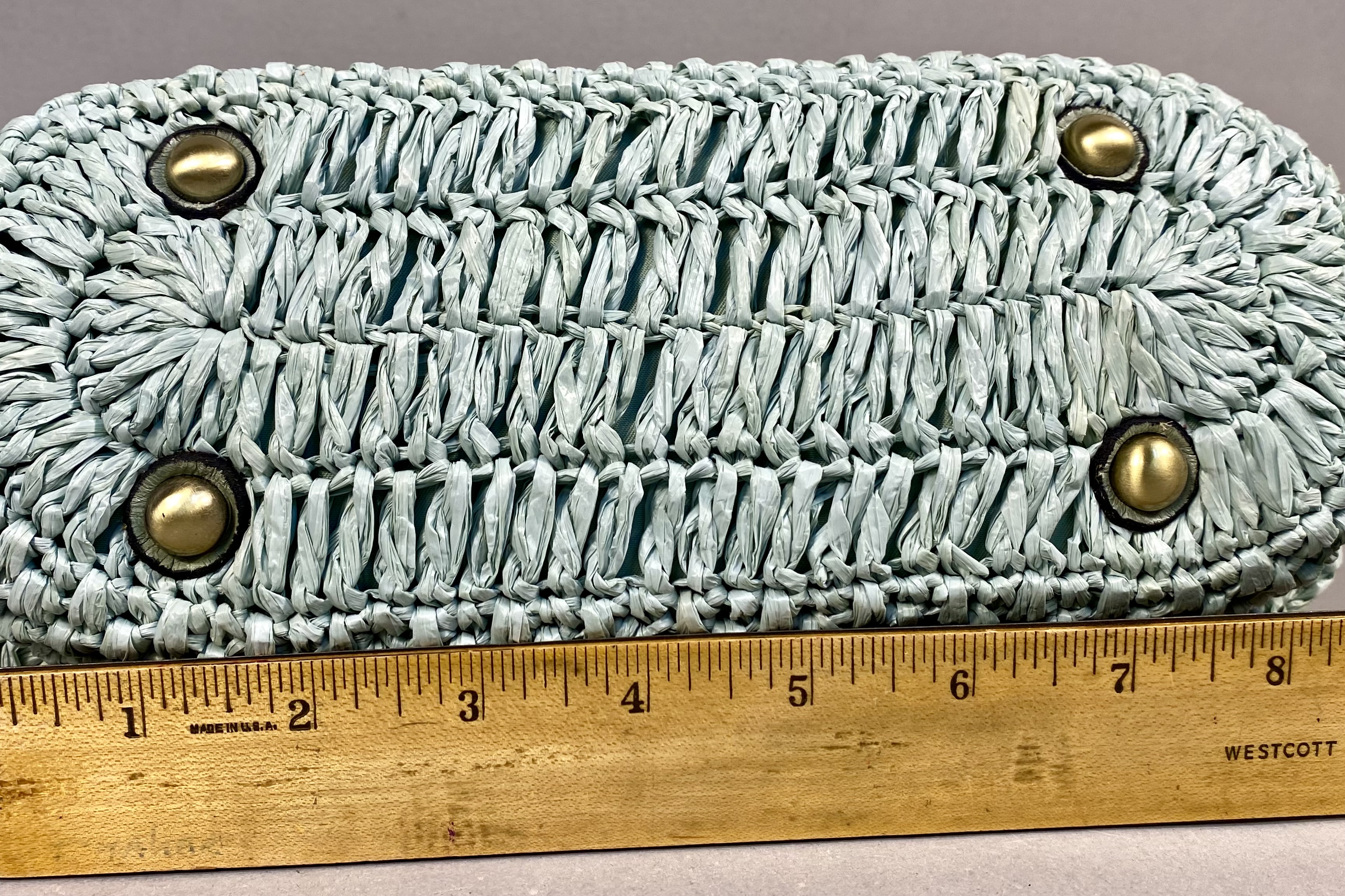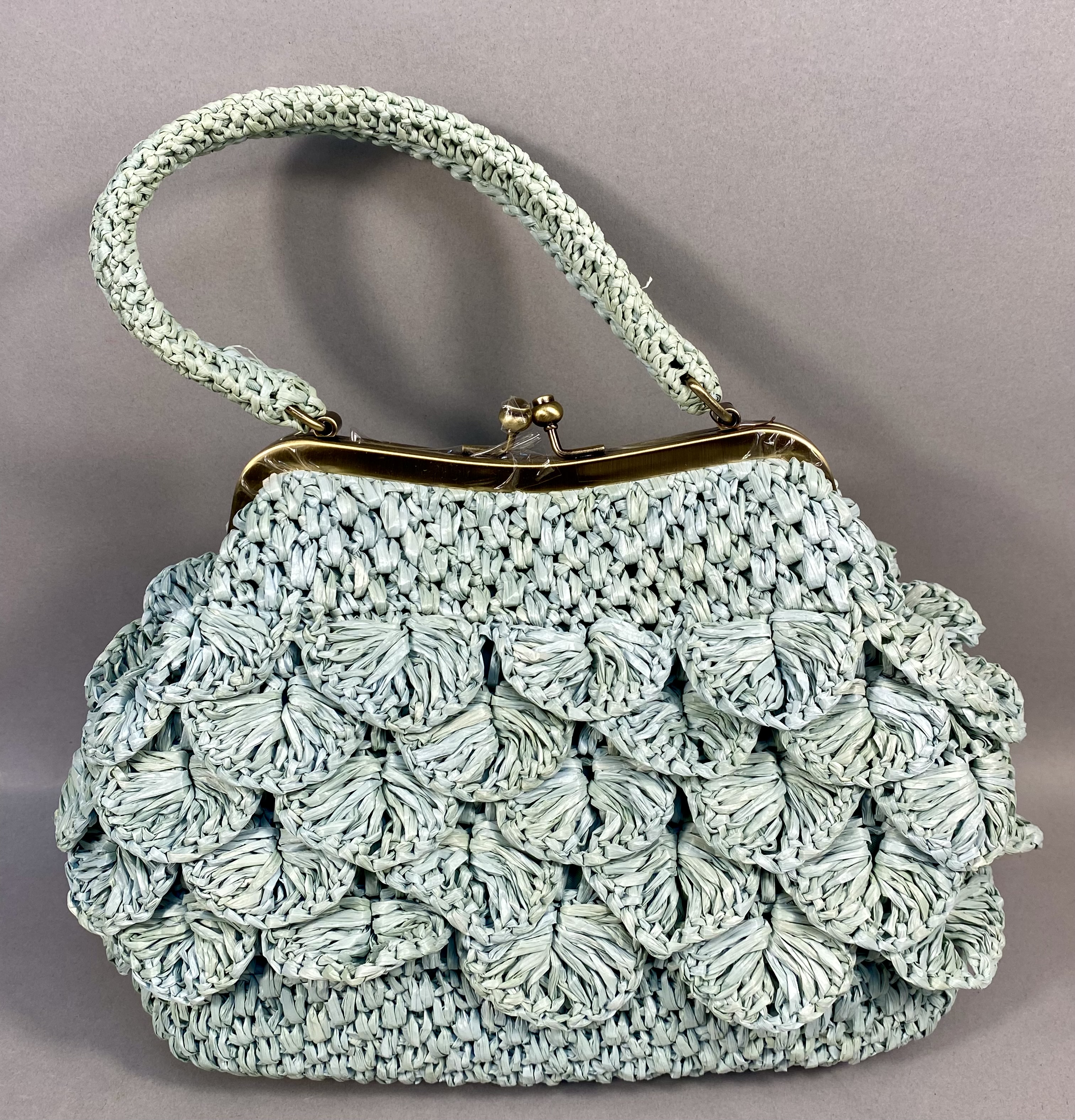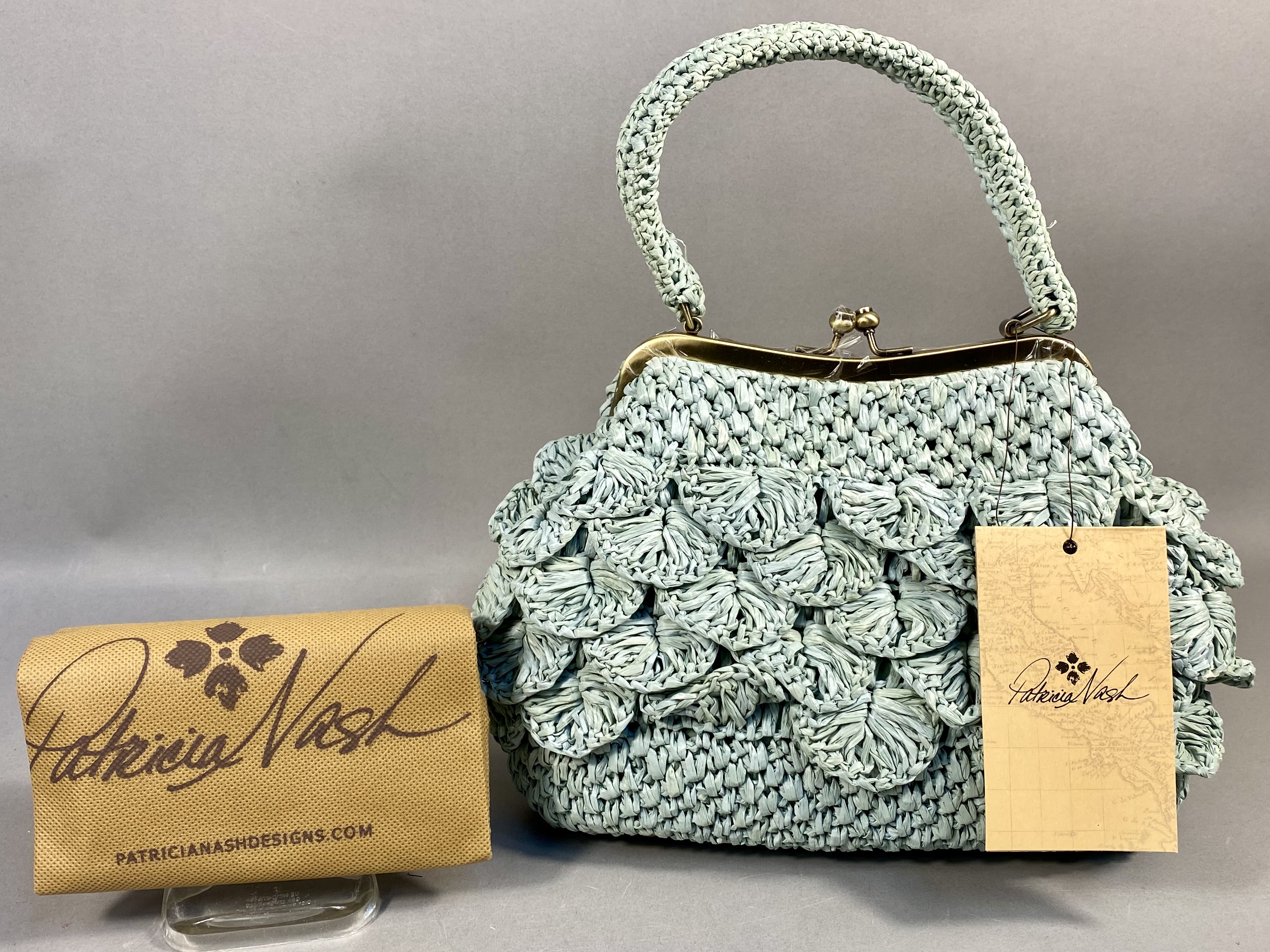 This Patricia Nash Laureana frame bag features a crocheted raffia exterior in a seafoam green color with a tiered scalloped petal design. The bag is constructed with an antique brass-tone metal frame and a ball-top kiss-lock closure. It includes a single integrated crocheted top handle and four protective brass-tone feet at the base. The interior is lined with tan fabric and contains one zippered wall pocket with a branded metal pull and two elasticized slip pockets. A leather patch inside bears the Patricia Nash script signature and floral logo. The item is accompanied by a branded tan fabric dust bag and original retail hangtags.