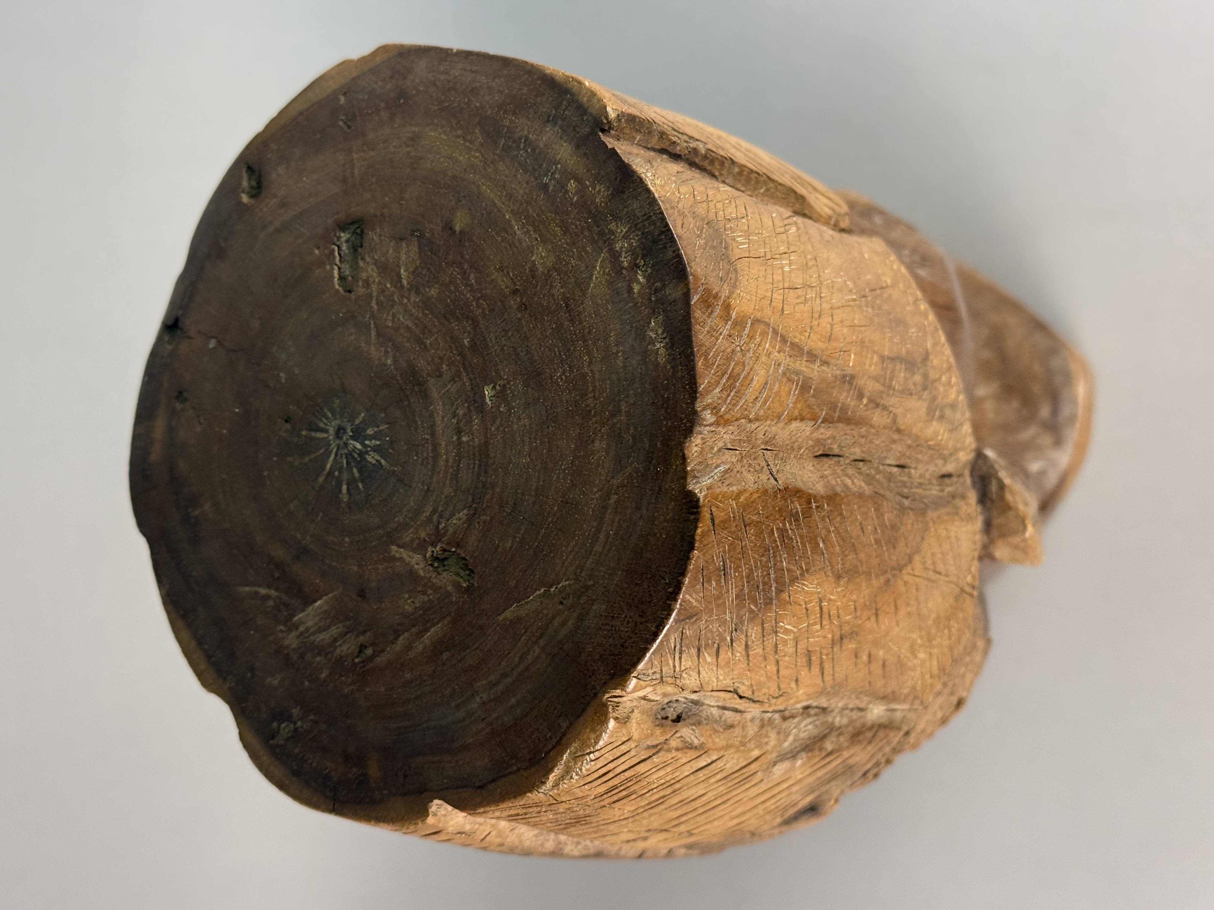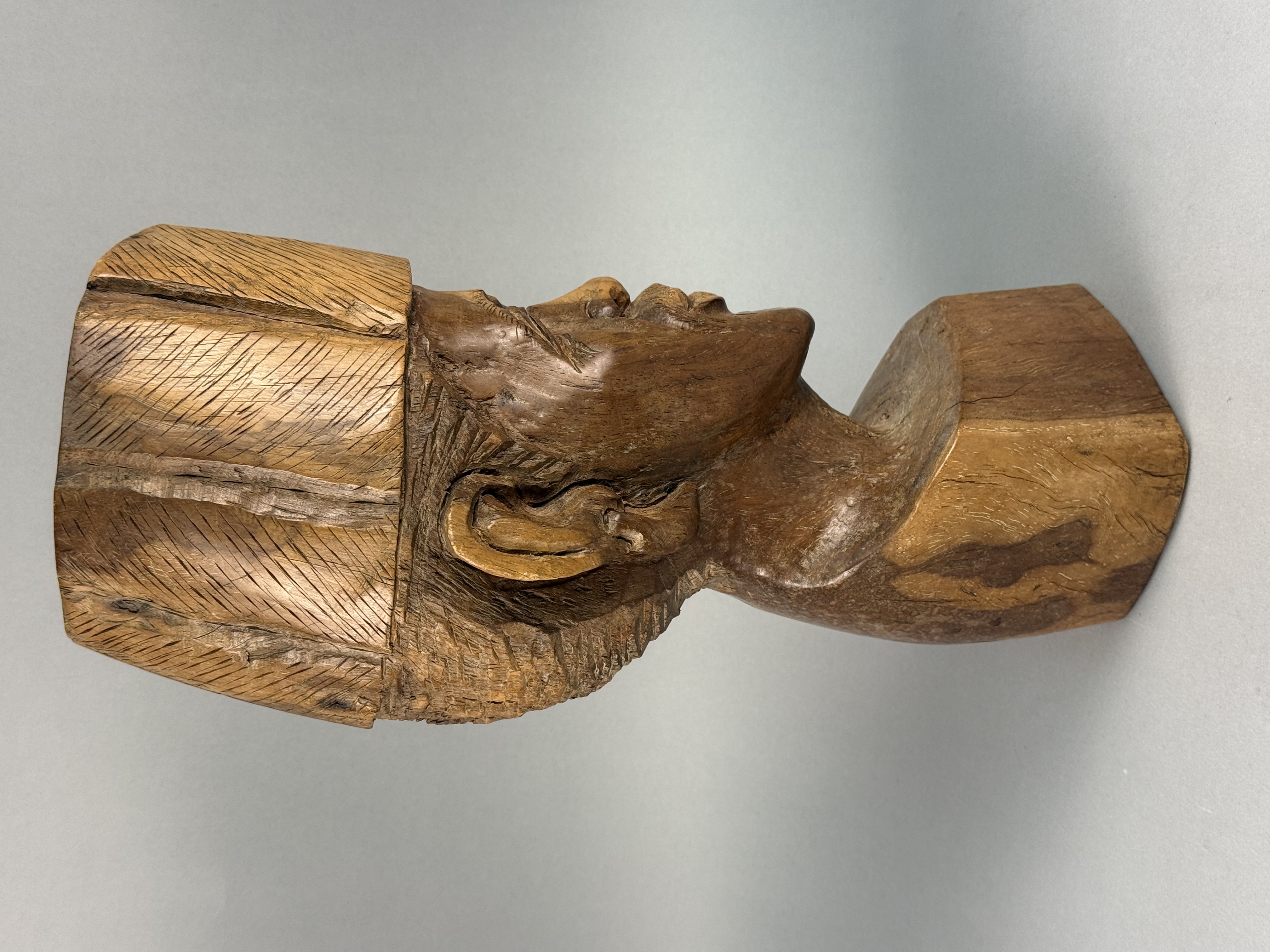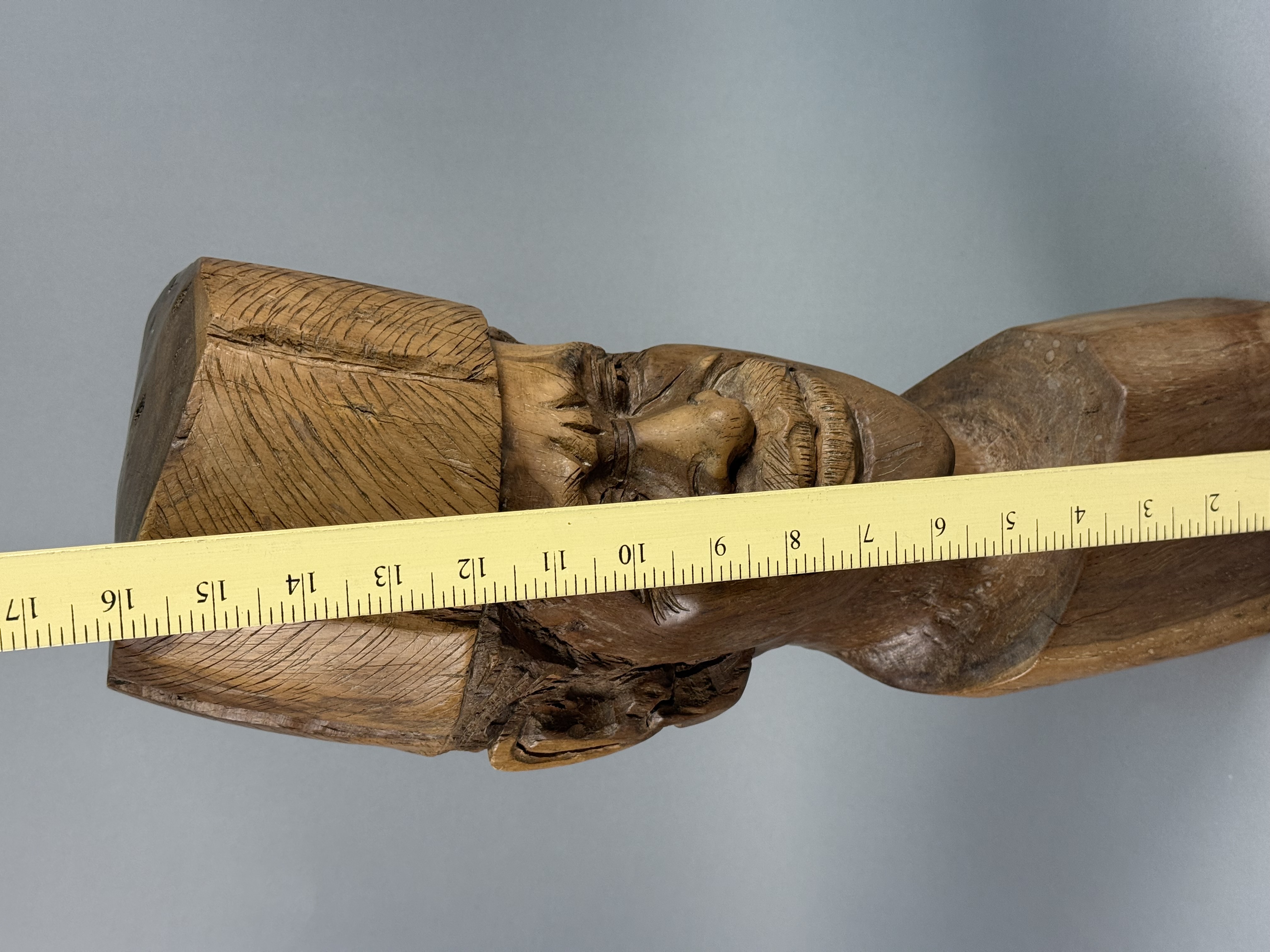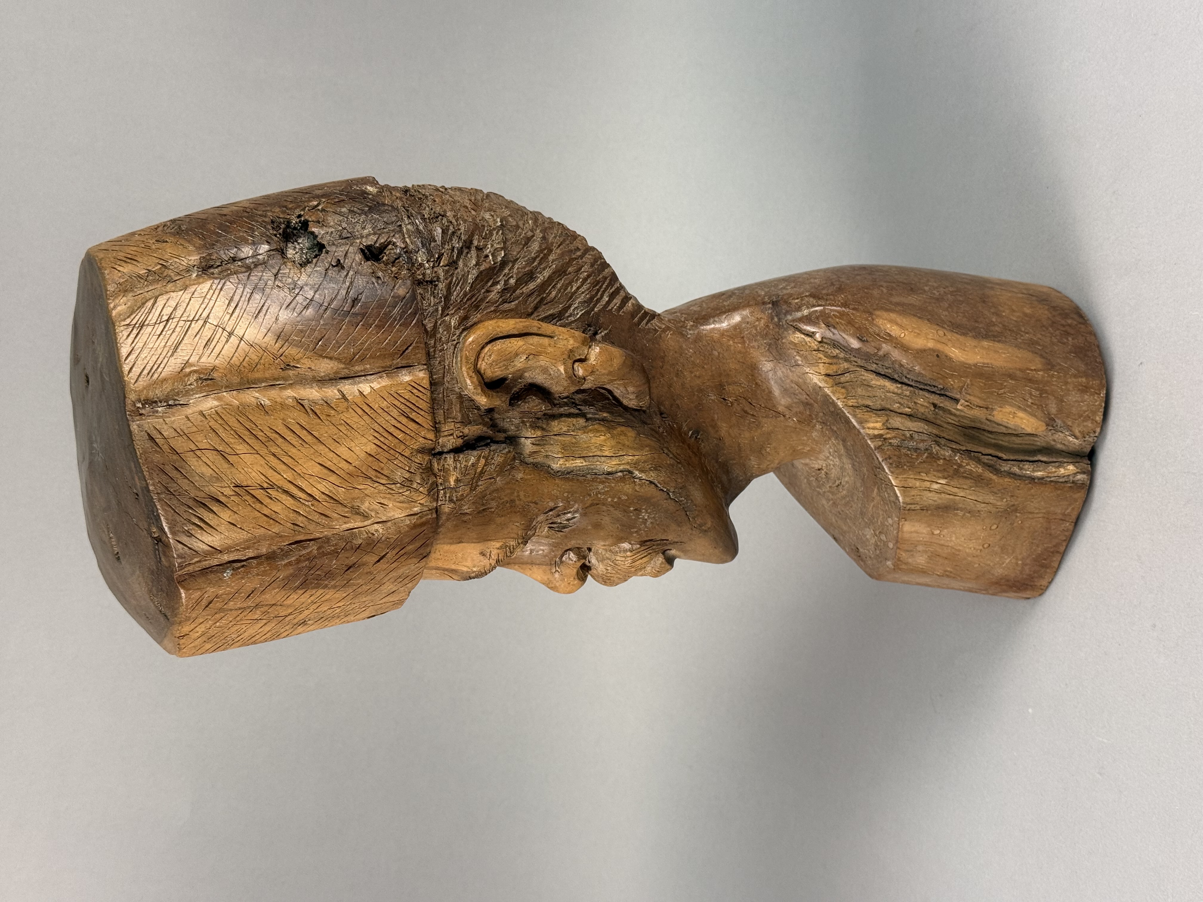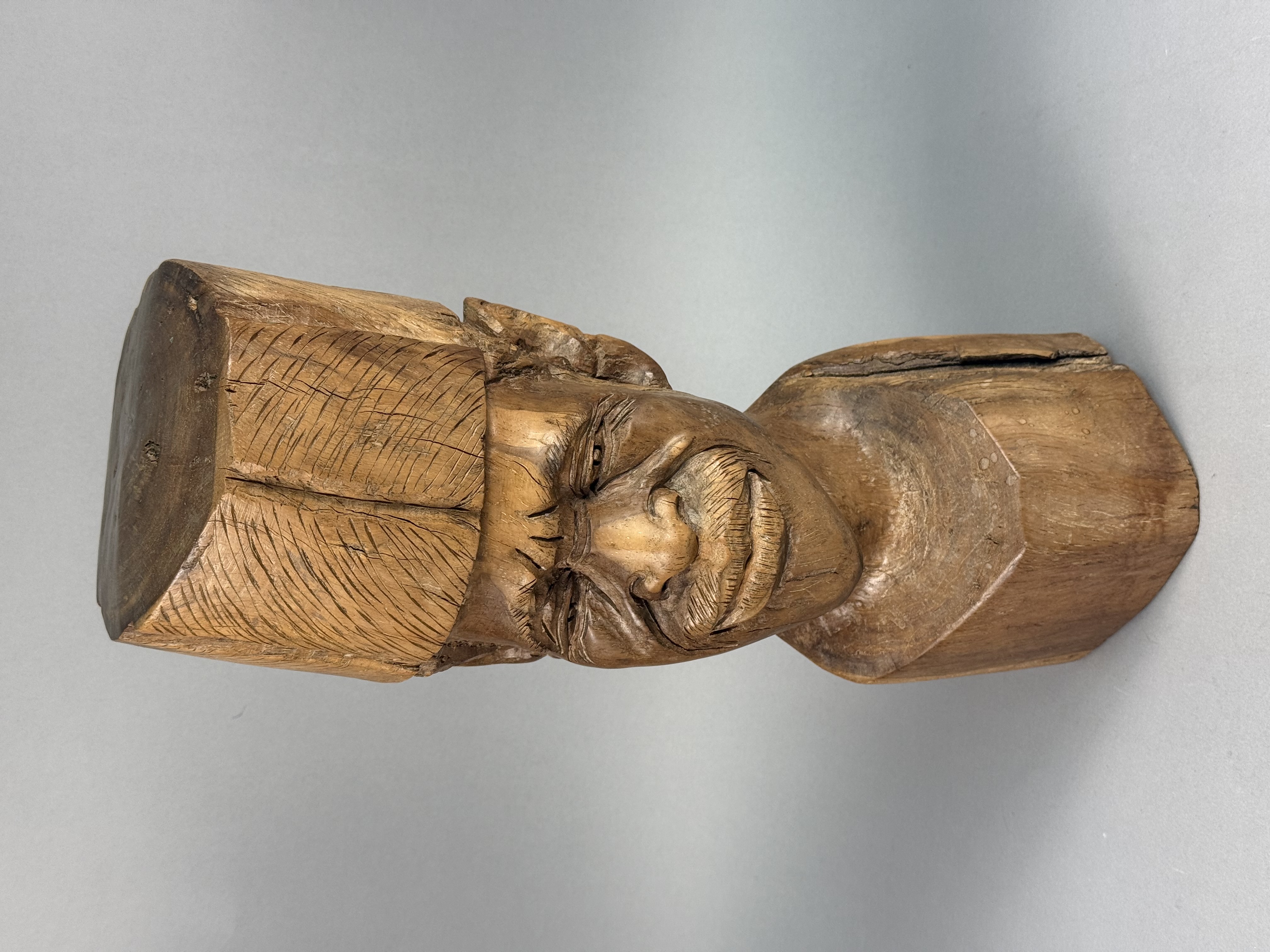 This hand-carved wood sculpture depicts a male bust with a mustache and a tall cylindrical cap, executed in a rustic folk-art style. The work is carved from a single block of wood, with the top of the head and the base displaying the natural end grain and growth rings of the timber. The facial features are deeply carved, including expressive eyes and a textured mustache. The cap and hair sections feature rhythmic, linear tool marks. The sculpture is finished with a warm brown patina. No signatures, maker marks, or inscriptions are visible on the piece. 16 x 5.5 x 5 inches The sculpture exhibits prominent age-related longitudinal checking running down the back and side. Several smaller surface cracks and natural knot voids are present within the wood. There are minor scuffs and surface wear to the patina consistent with age and handling.