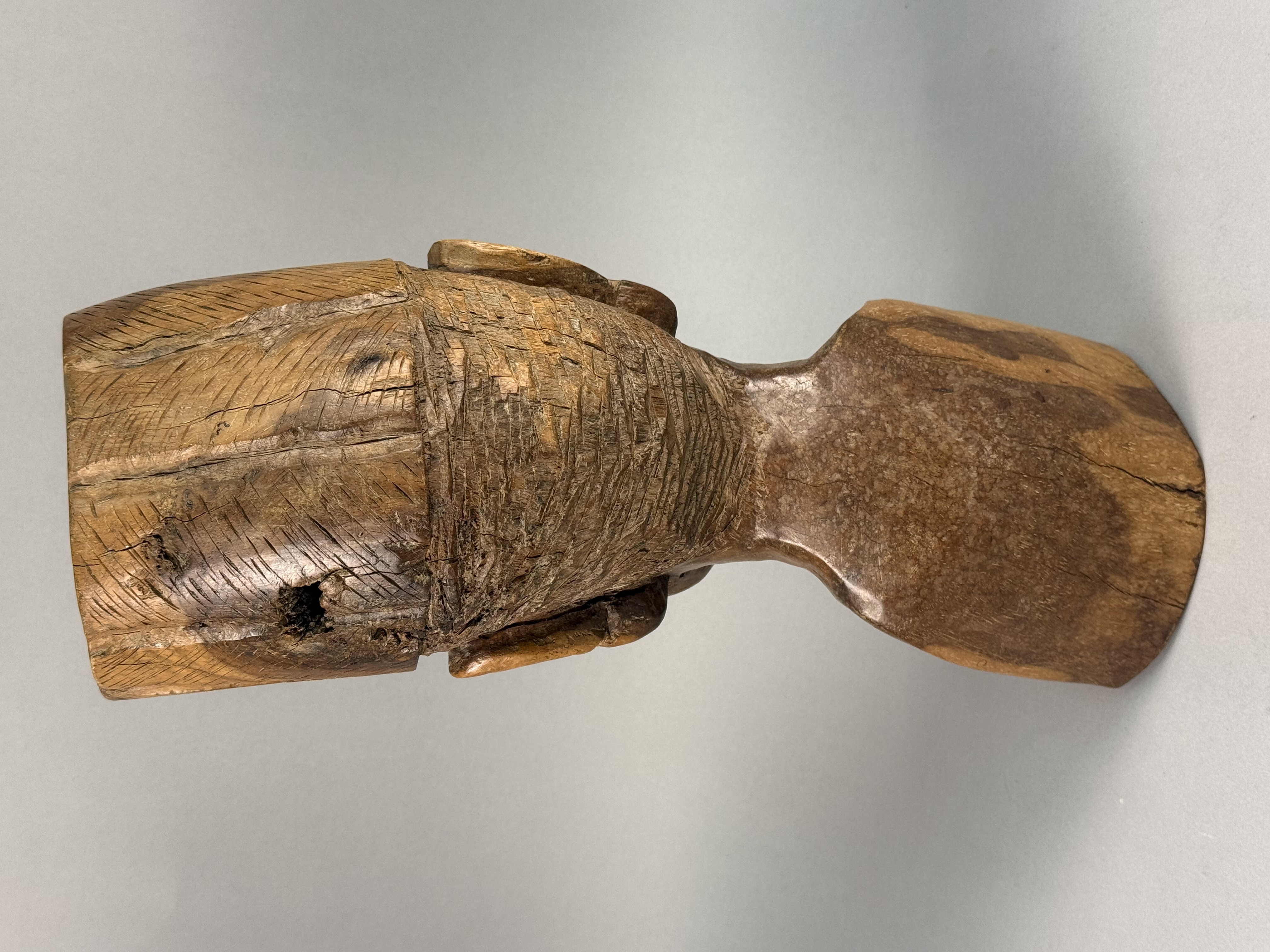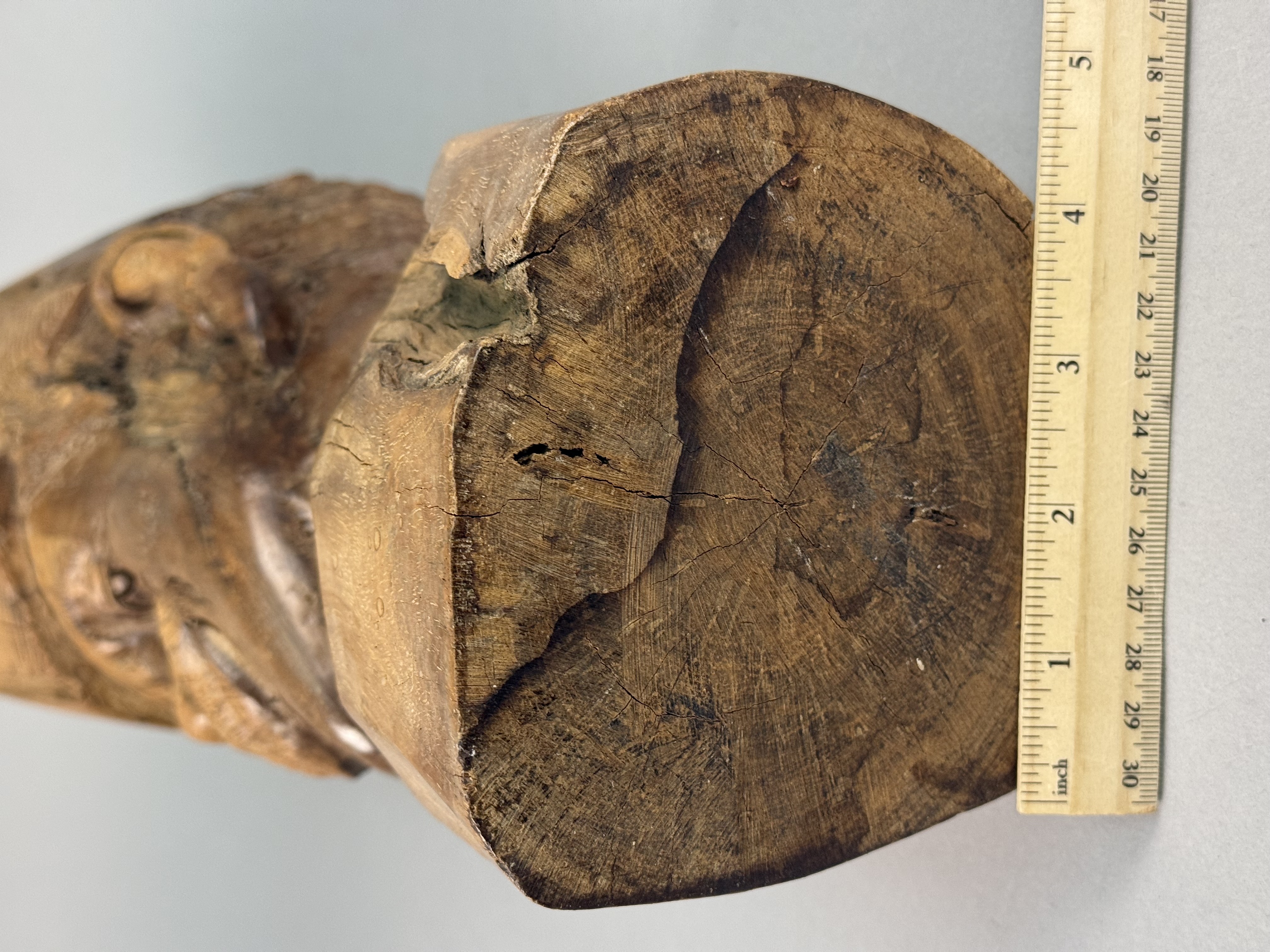 The sculpture exhibits prominent age-related longitudinal checking running down the back and side. Several smaller surface cracks and natural knot voids are present within the wood. There are minor scuffs and surface wear to the patina consistent with age and handling.