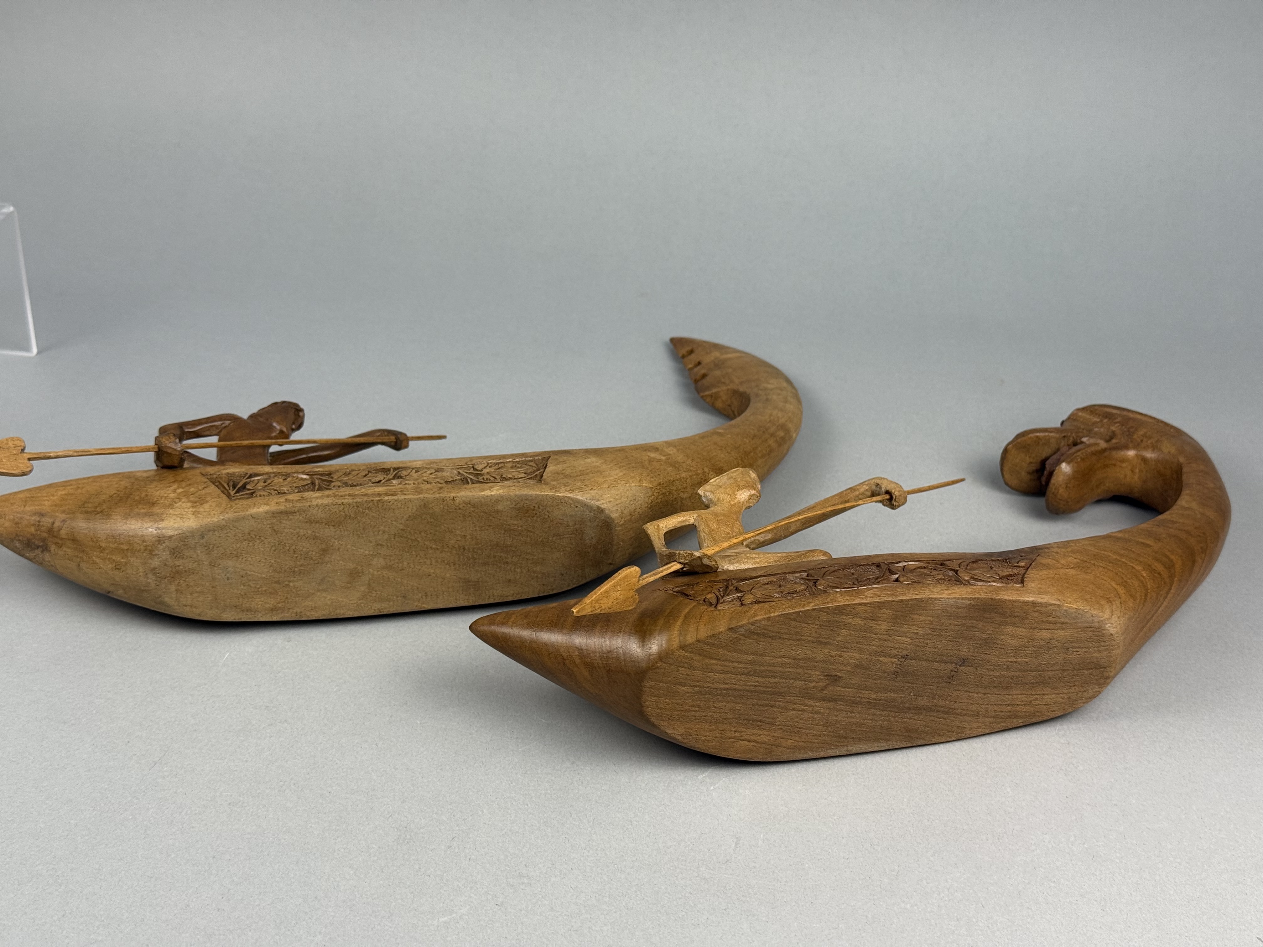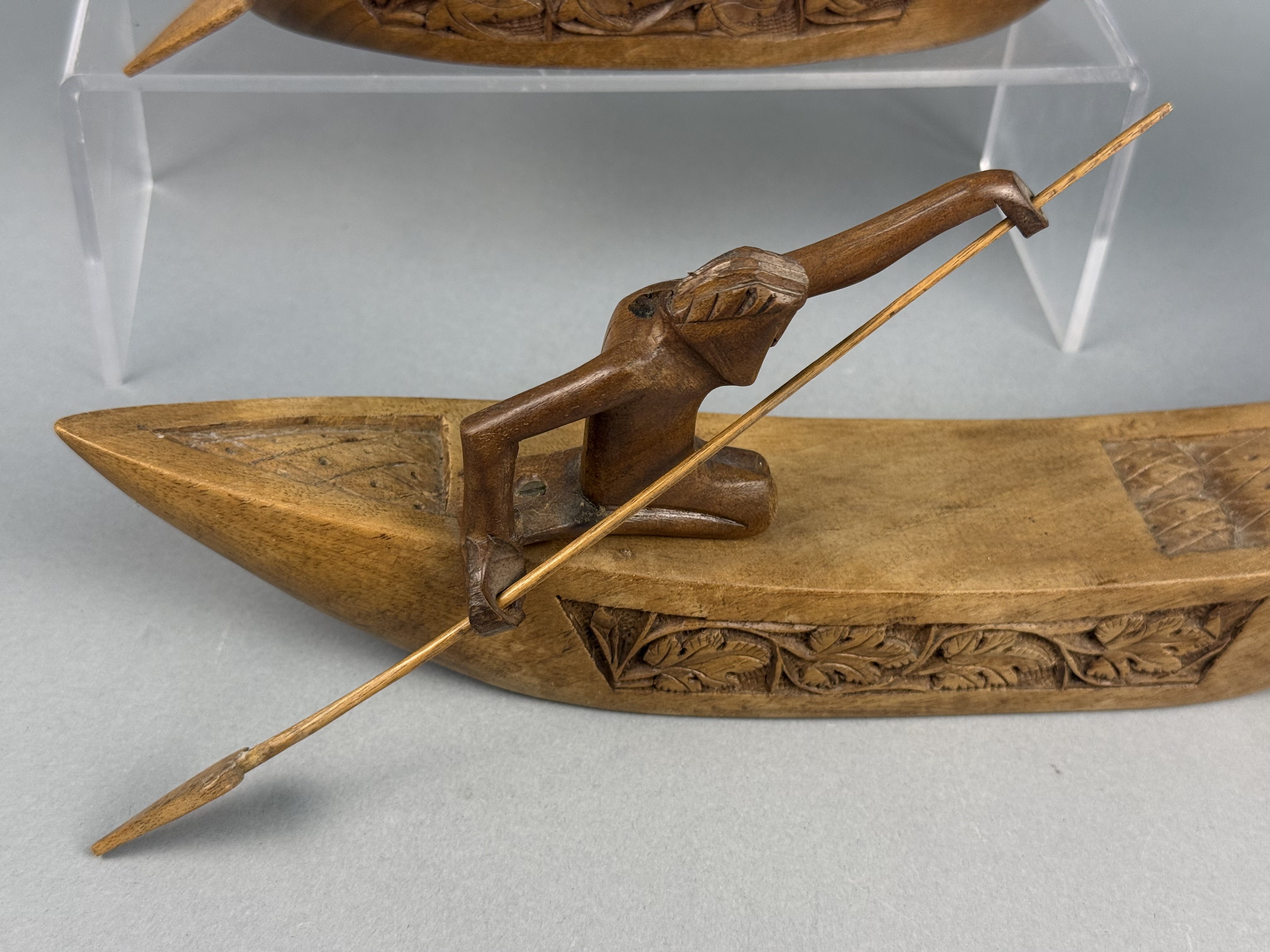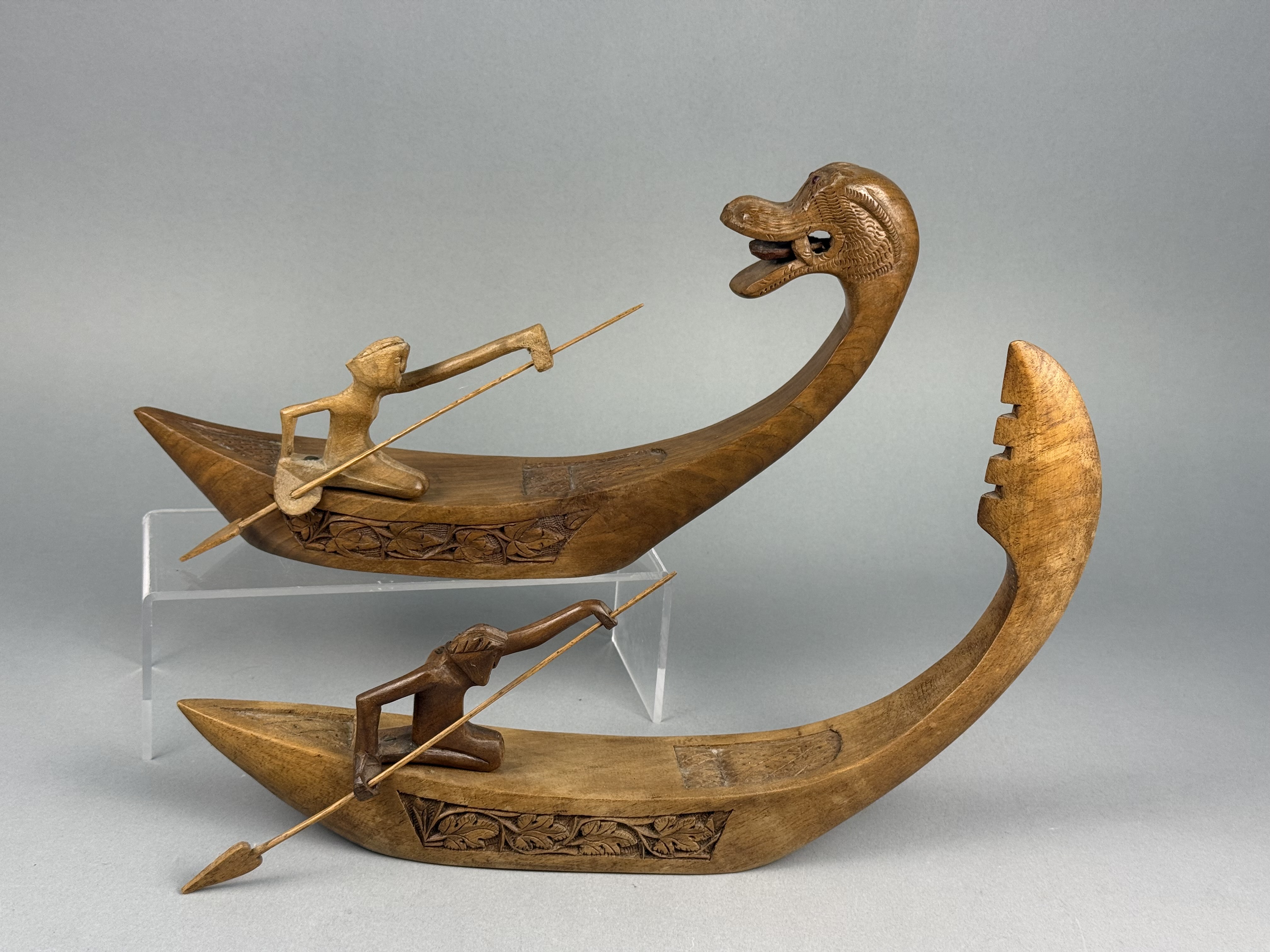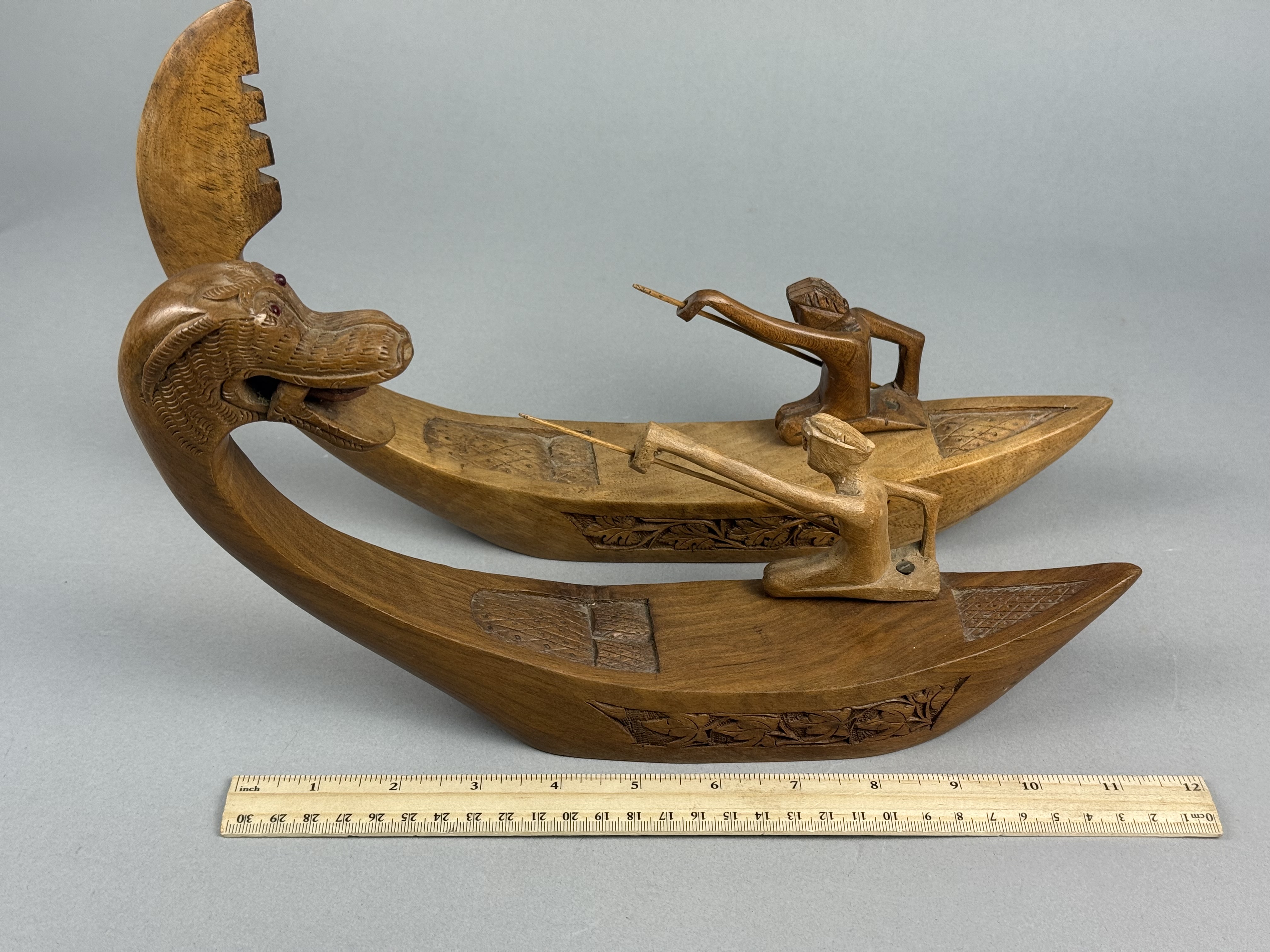 This pair of decorative boat figurines is crafted from polished hardwood featuring a warm honey-to-brown tone. Each vessel carries a single kneeling figure holding a slender wooden spear. The figures are separate carvings attached to the boat decks using flathead metal screws. The sides of the boats are decorated with incised bands of foliate motifs, while the bow and stern sections feature geometric cross-hatched patterns. One boat is distinguished by a prow carved as a mythical naga head with inset red bead eyes. The other boat features a tall, serrated upright prow. The style and construction are characteristic of mid-to-late 20th-century Southeast Asian folk art, likely of Indonesian origin. Length: 12 inches The items are in good condition with light surface wear and minor scuffs on the edges and undersides consistent with age and display. The wood joinery remains stable. One figure exhibits slightly more color fading than the other. Metal screw heads are visible on the decks where the figures are attached.