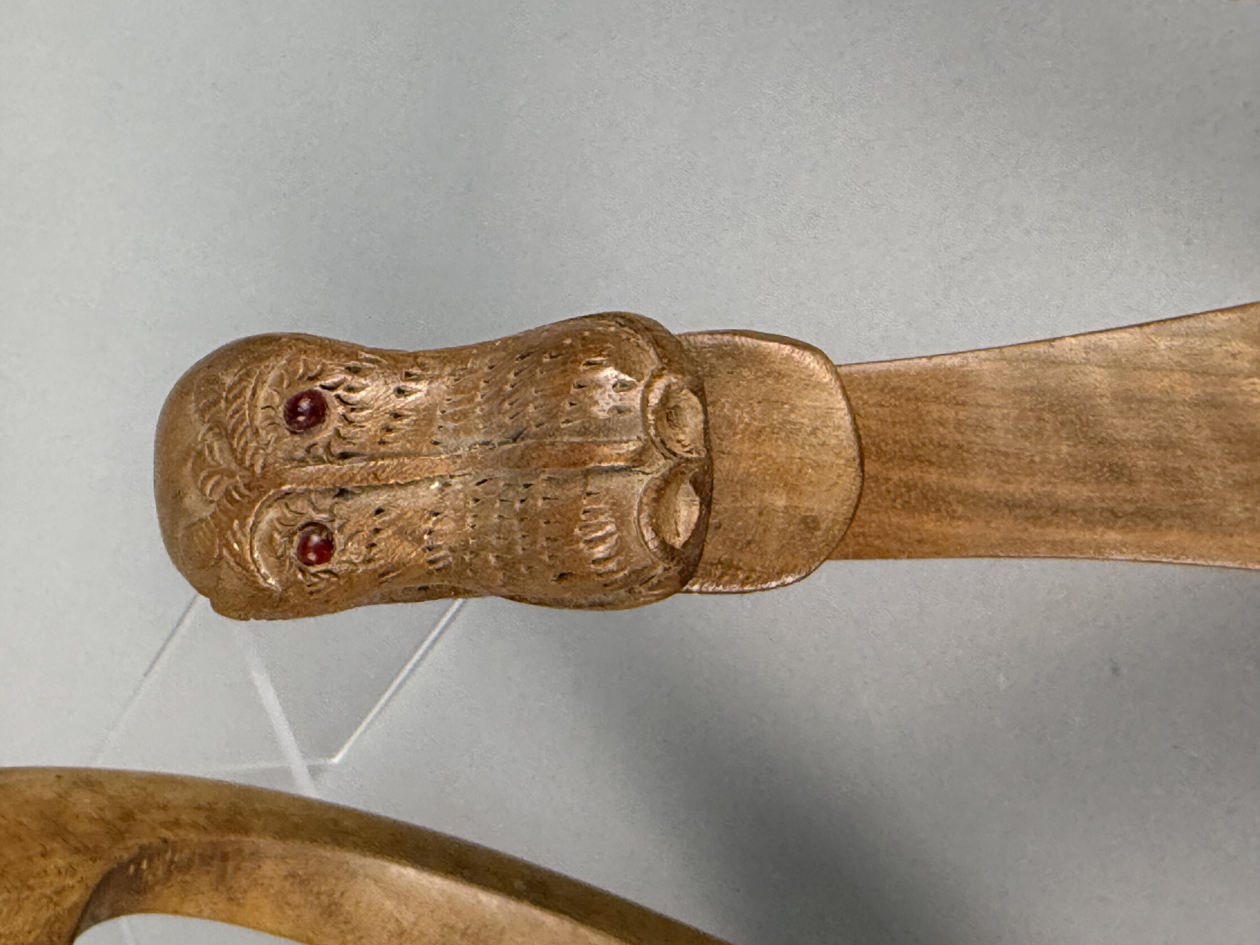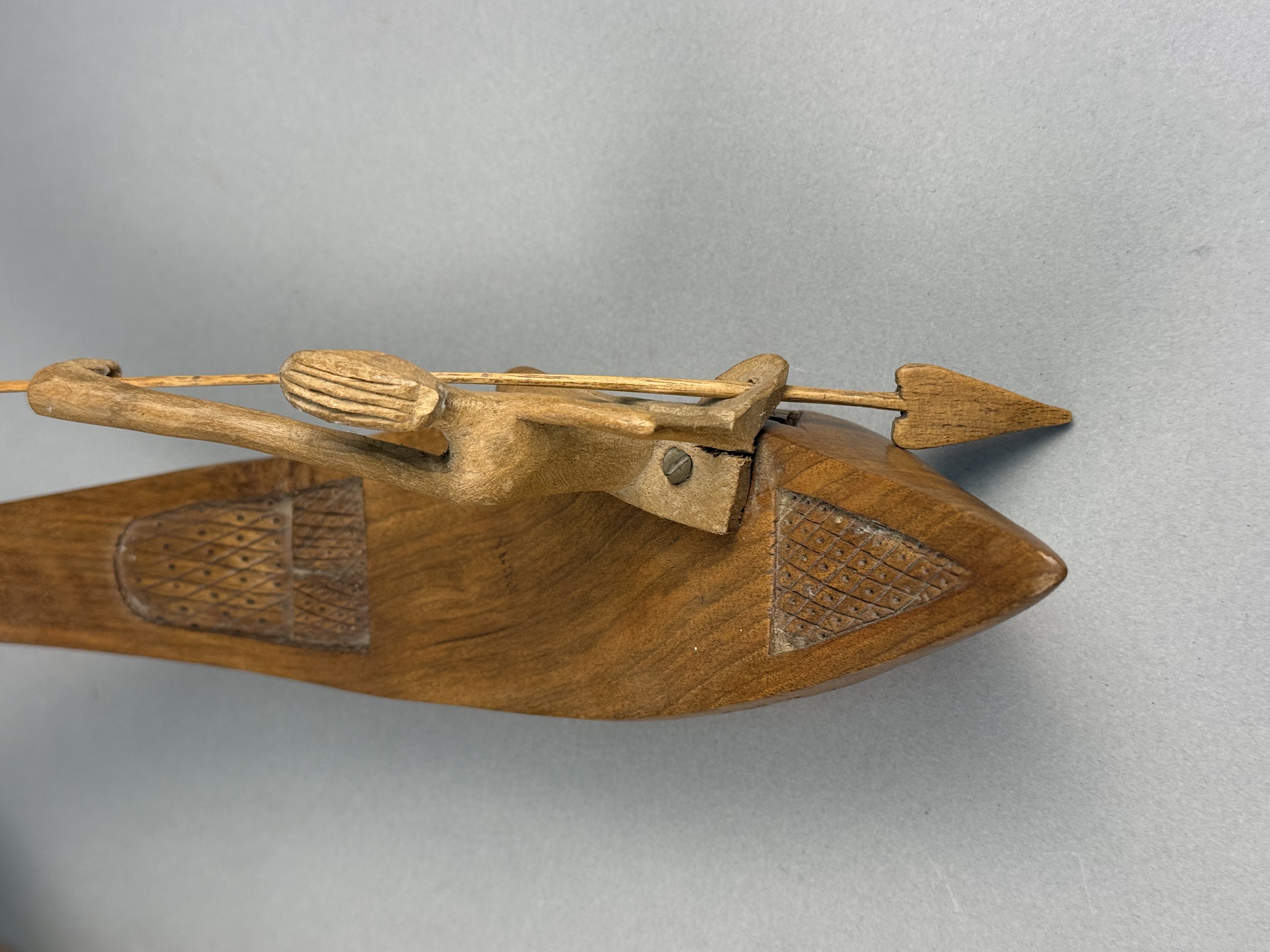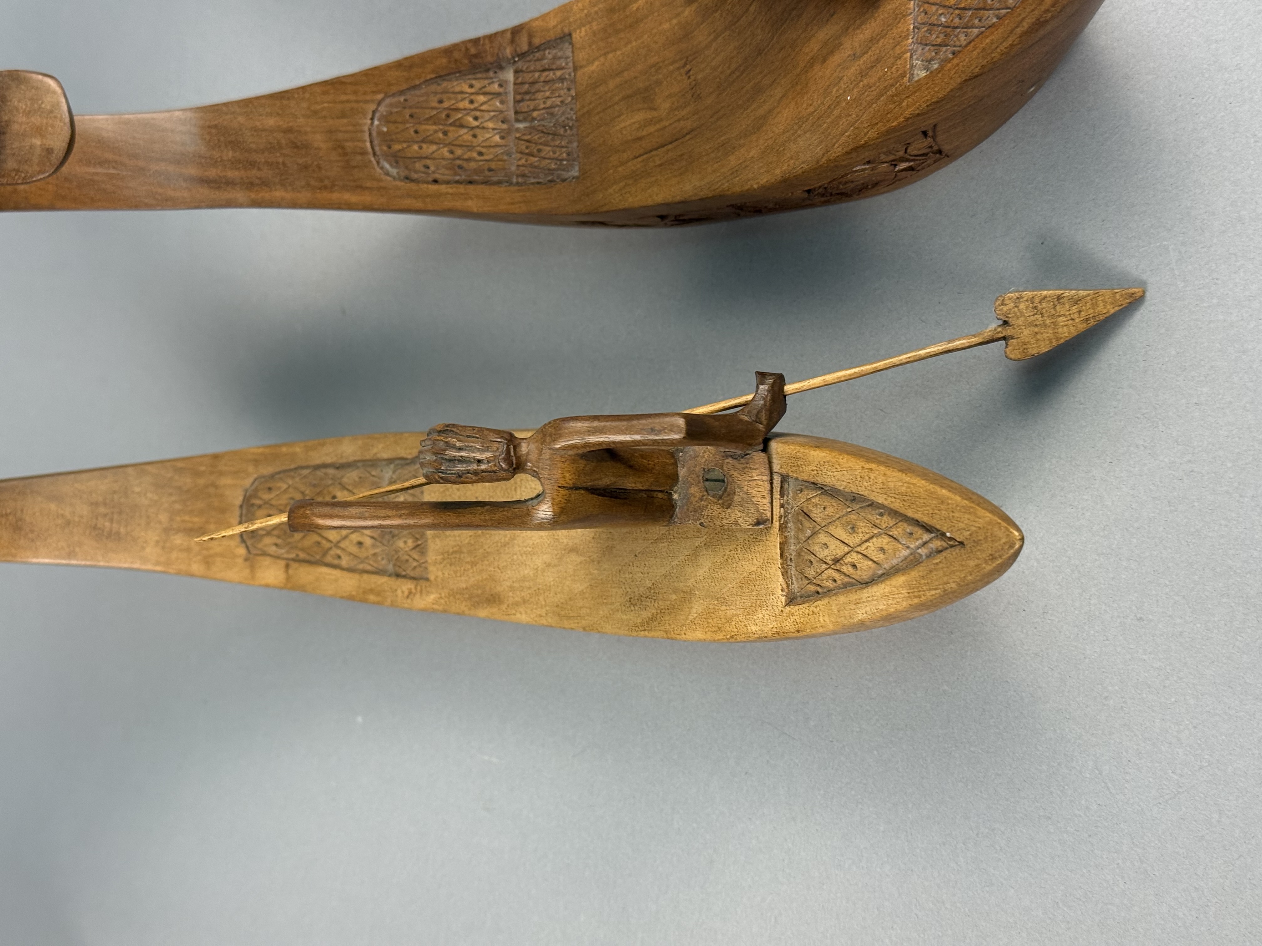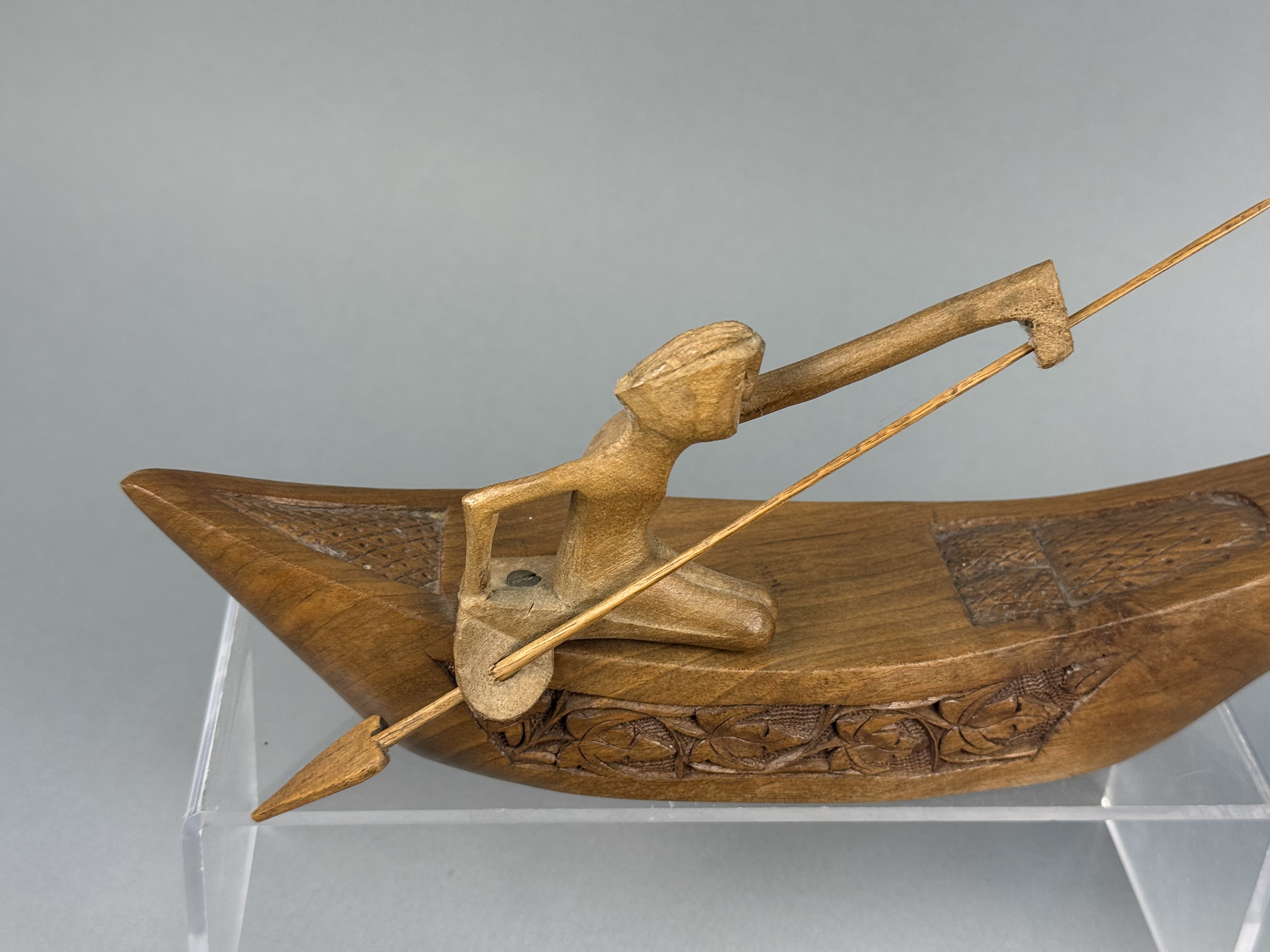 This pair of decorative boat figurines is crafted from polished hardwood featuring a warm honey-to-brown tone. Each vessel carries a single kneeling figure holding a slender wooden spear. The figures are separate carvings attached to the boat decks using flathead metal screws. The sides of the boats are decorated with incised bands of foliate motifs, while the bow and stern sections feature geometric cross-hatched patterns. One boat is distinguished by a prow carved as a mythical naga head with inset red bead eyes. The other boat features a tall, serrated upright prow. The style and construction are characteristic of mid-to-late 20th-century Southeast Asian folk art, likely of Indonesian origin. Length: 12 inches The items are in good condition with light surface wear and minor scuffs on the edges and undersides consistent with age and display. The wood joinery remains stable. One figure exhibits slightly more color fading than the other. Metal screw heads are visible on the decks where the figures are attached.