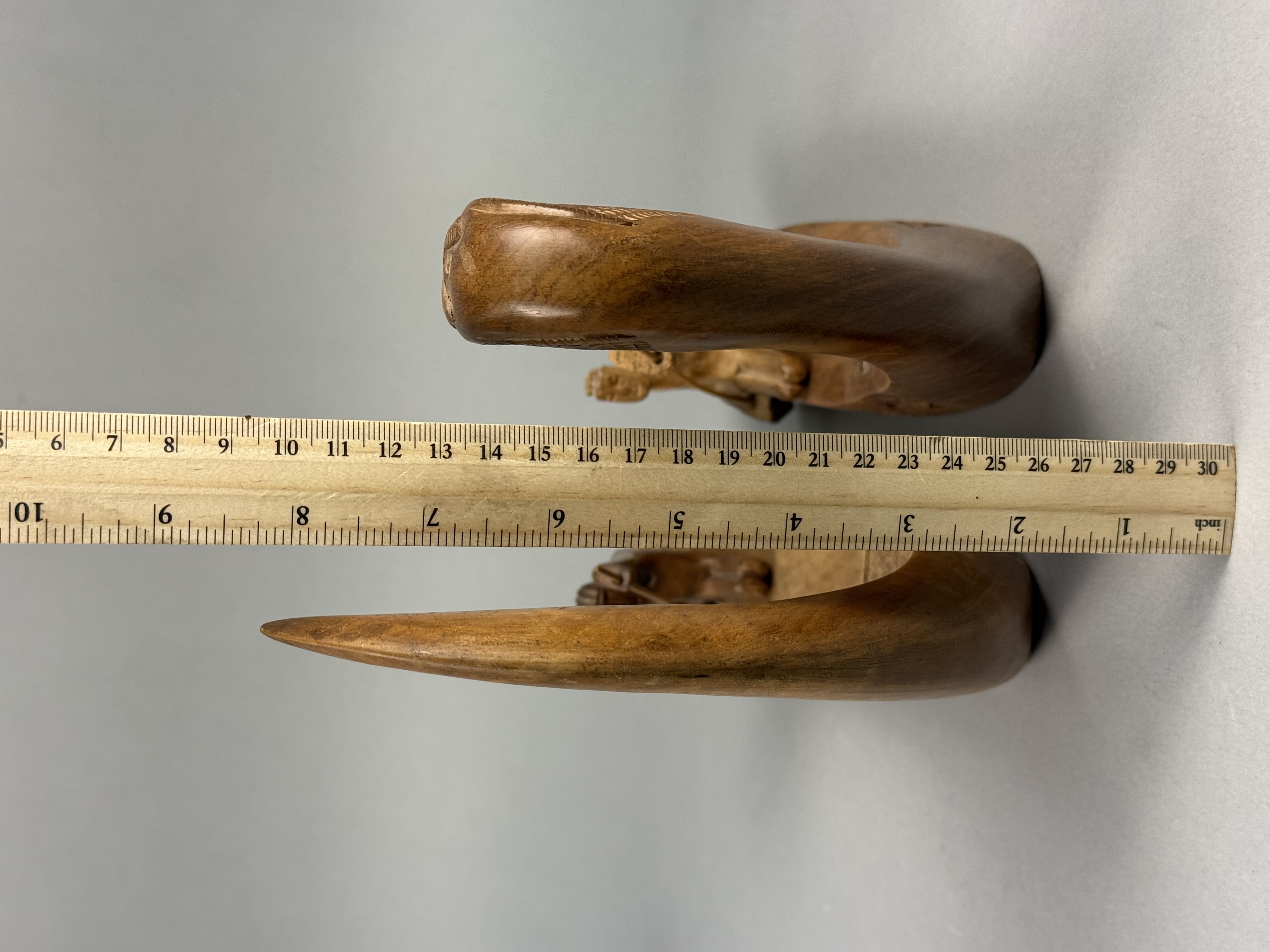 The items are in good condition with light surface wear and minor scuffs on the edges and undersides consistent with age and display. The wood joinery remains stable. One figure exhibits slightly more color fading than the other. Metal screw heads are visible on the decks where the figures are attached.