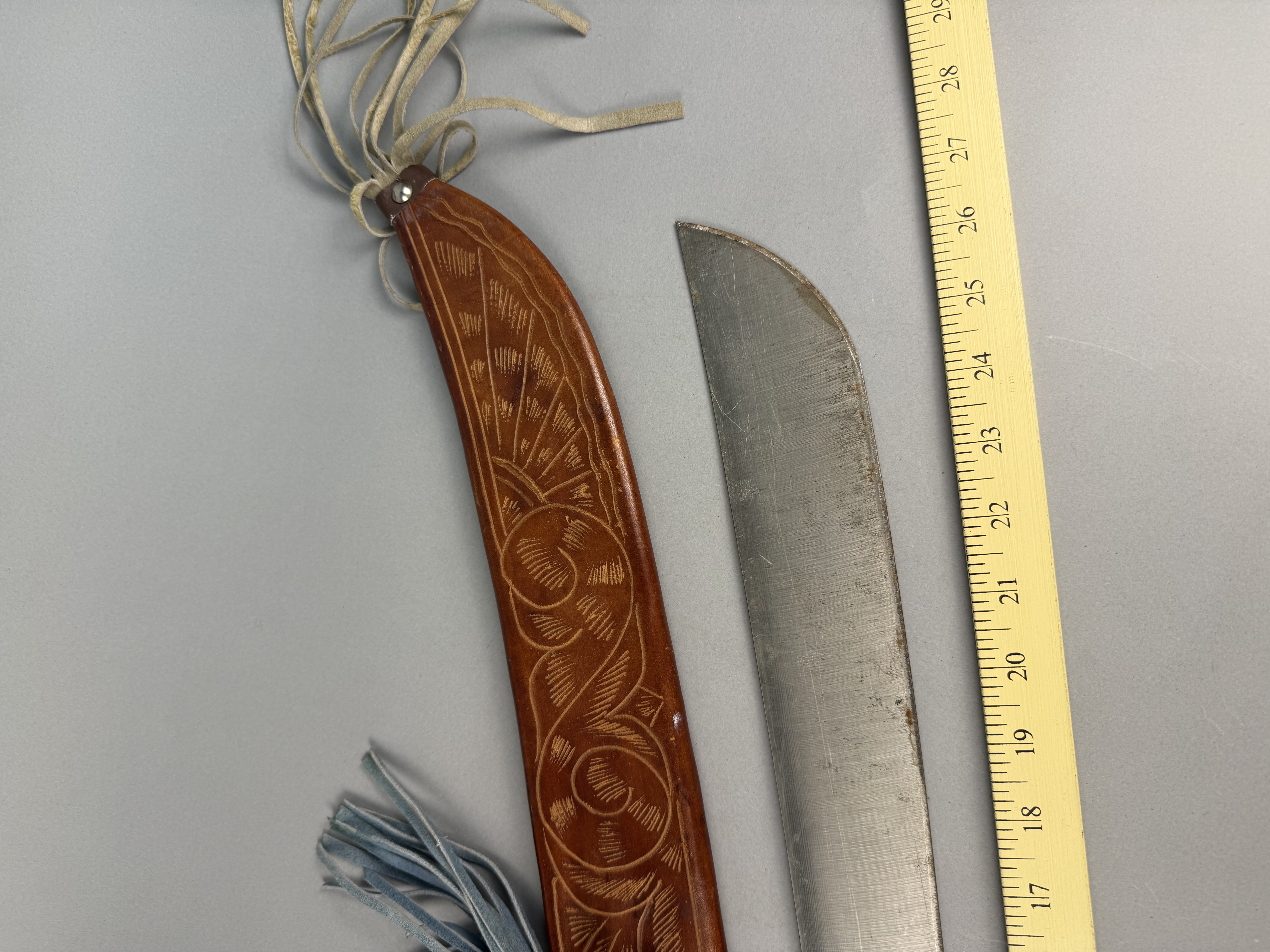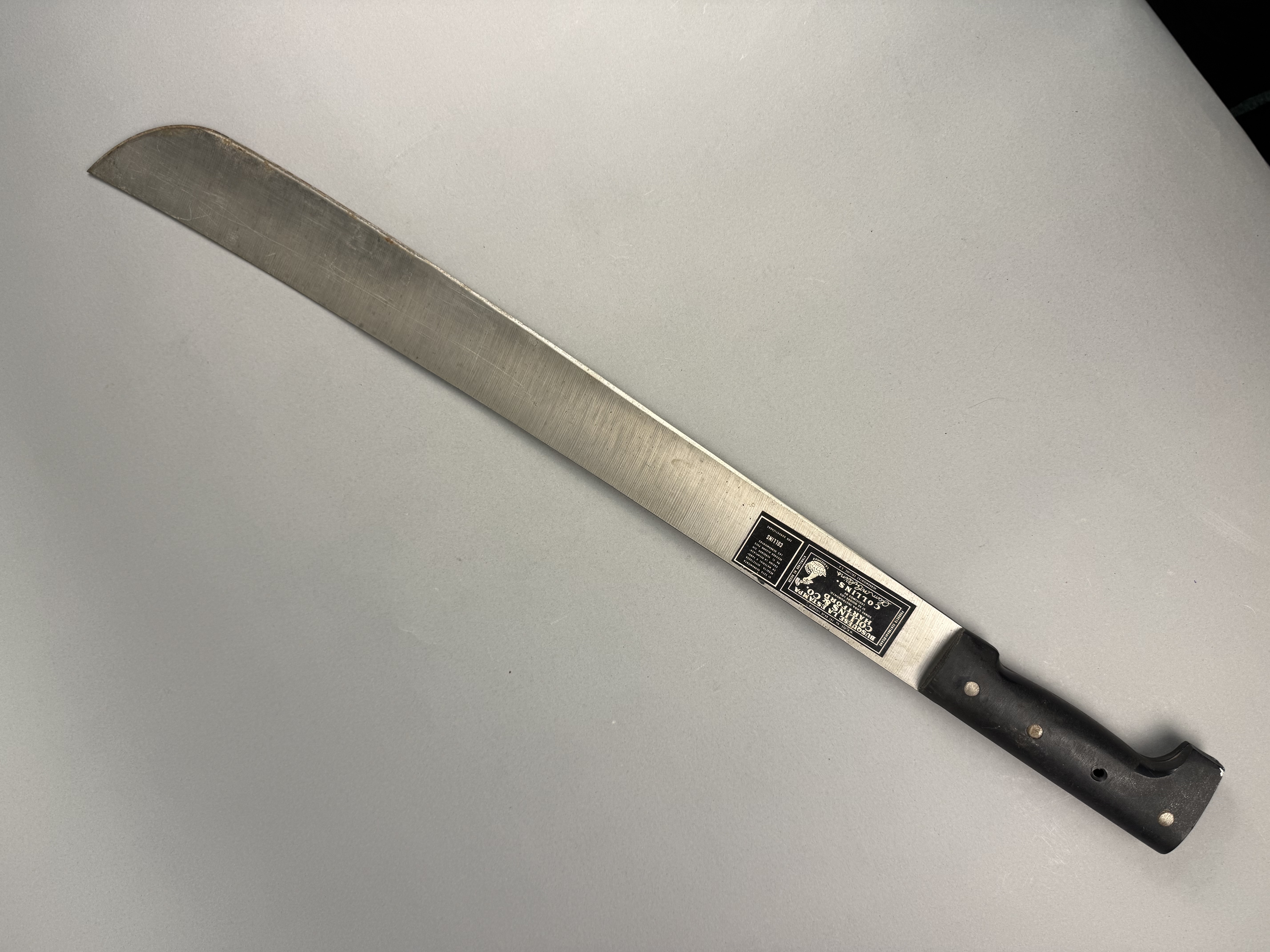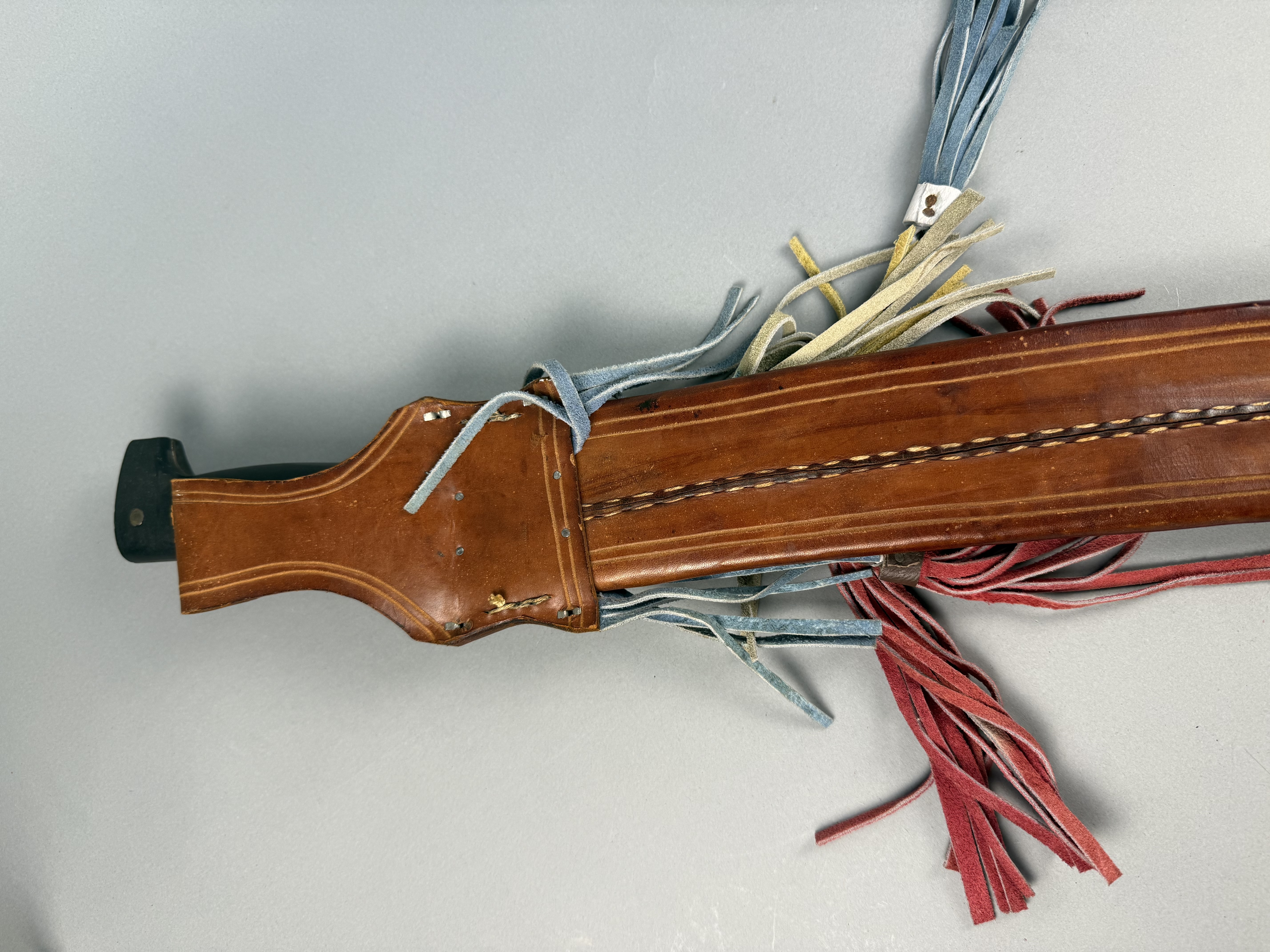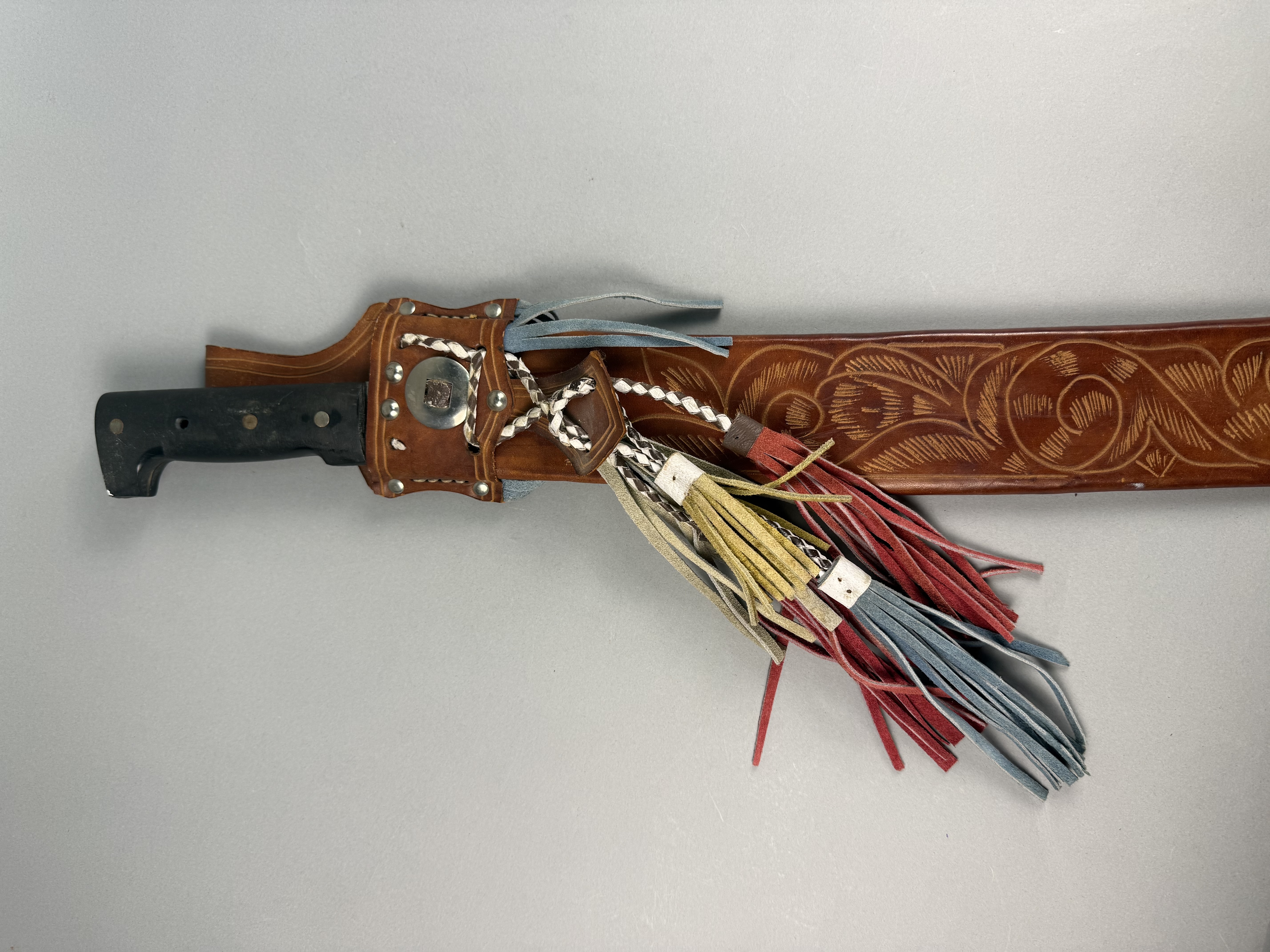 This lot features a mid-to-late 20th-century machete manufactured by Herramientas Collins S.A. in Guatemala under license from Collins and Co. of Hartford, Connecticut. The tool is constructed with a straight-back steel blade featuring a curved tip and a black molded composite hilt. The hilt is secured to the tang with three metal rivets and features a bird’s head pommel with a lanyard hole. The face of the blade retains a large black and white adhesive label bearing the Legitimus arm and hammer graphic and text including Busquese La Estampa, Collins and Co. Hartford, and Hecho en Guatemala. The machete is housed in a decorative, custom-style brown leather scabbard. The leather is heavily tooled with floral and scrollwork motifs and is embellished with multiple multi-colored suede leather tassels in red, light blue, and tan. A silver-tone metal concho is affixed to the throat of the scabbard, and long leather fringe ties are attached to the tip. The reverse of the scabbard features a stitched leather belt loop. Overall Machete Length: 27 inches Blade Length: 22 inches The blade is in good overall condition, showing original factory grinding marks and a well-preserved adhesive maker’s label. There is visible surface oxidation and light pitting concentrated near the tip of the blade. The composite hilt shows minor surface scuffing but remains secure. The leather scabbard is in very good condition with supple leather and intact stitching. The multi-colored suede tassels show light age-related wear and some accumulated dust.