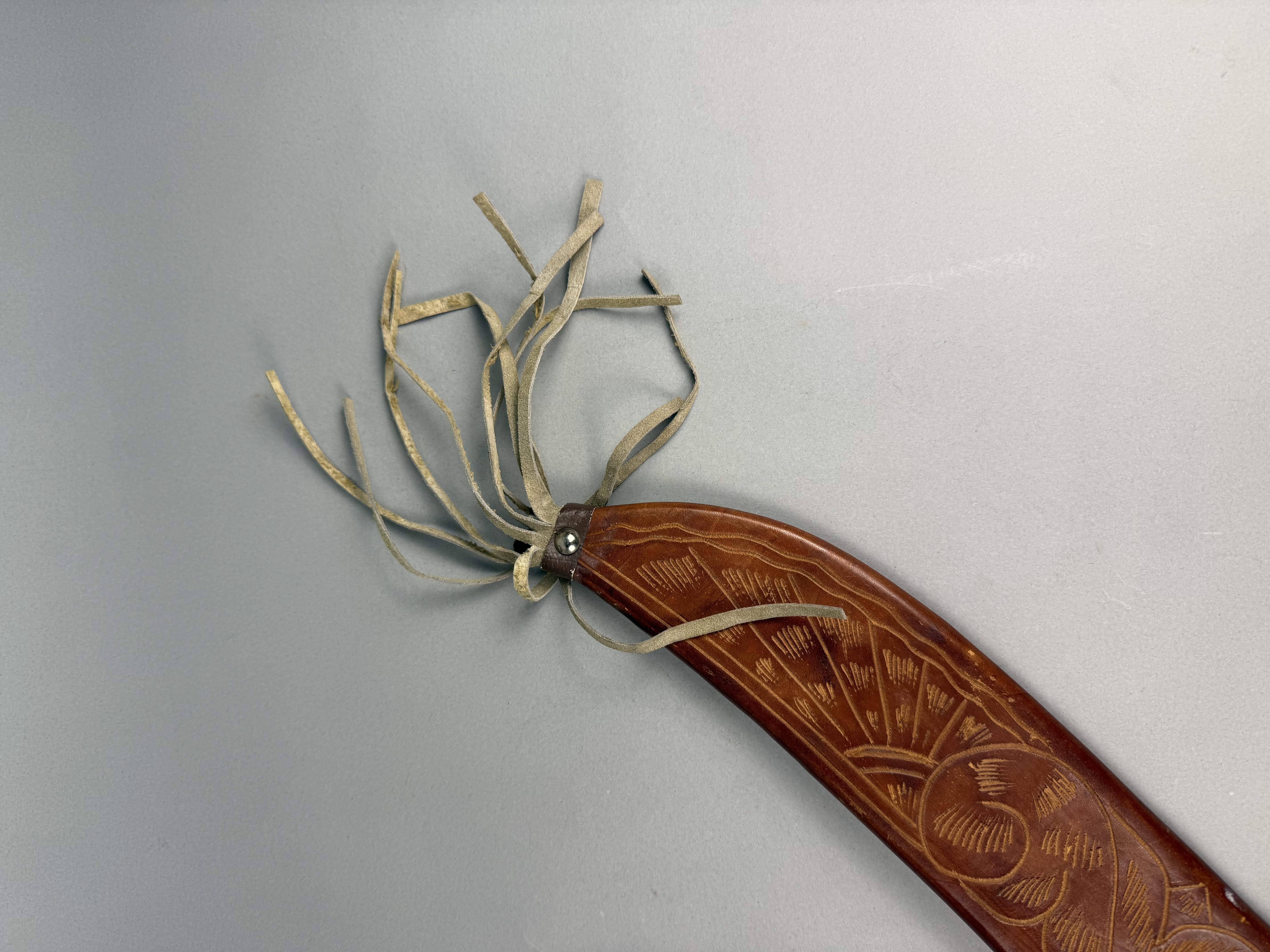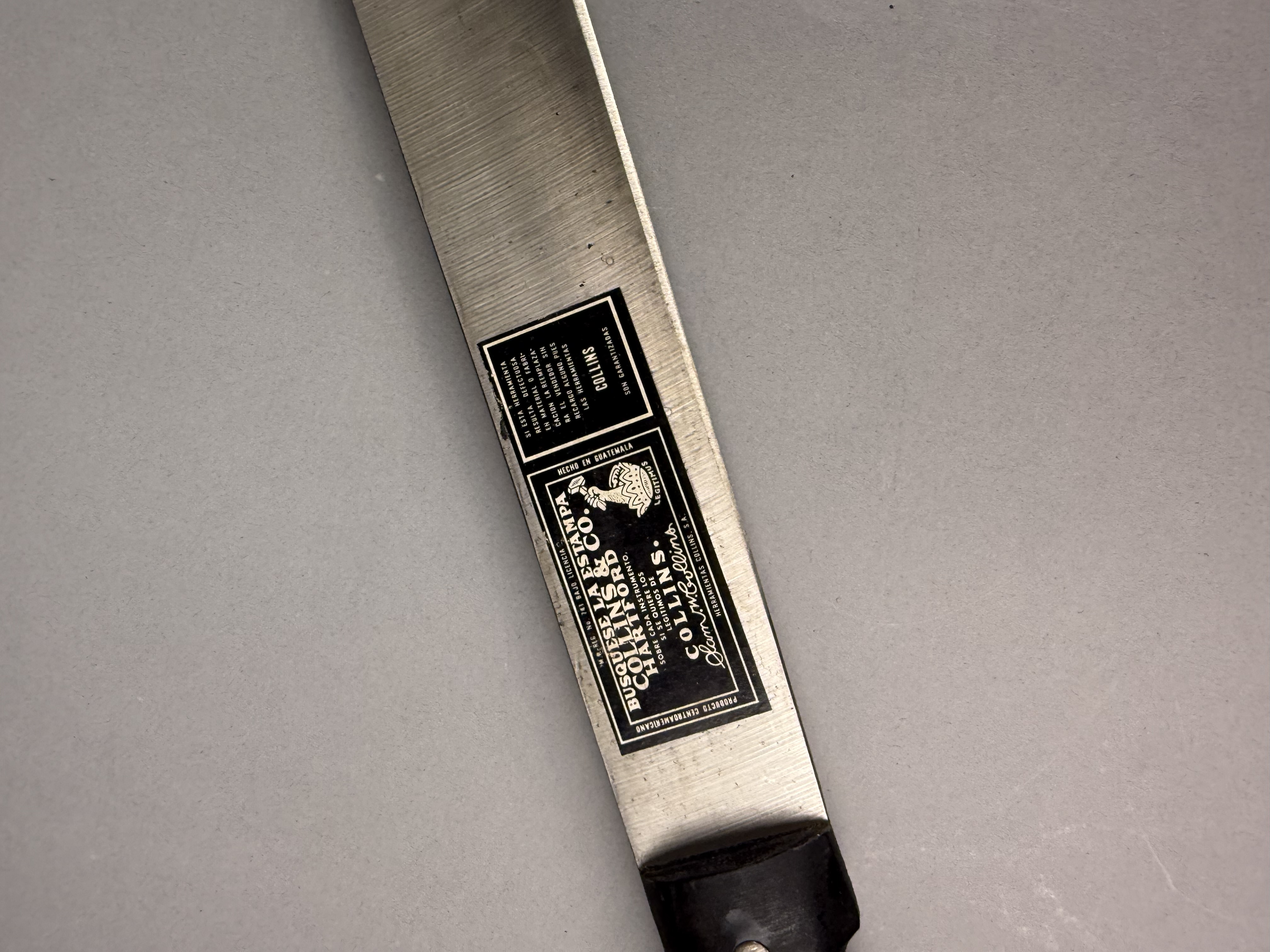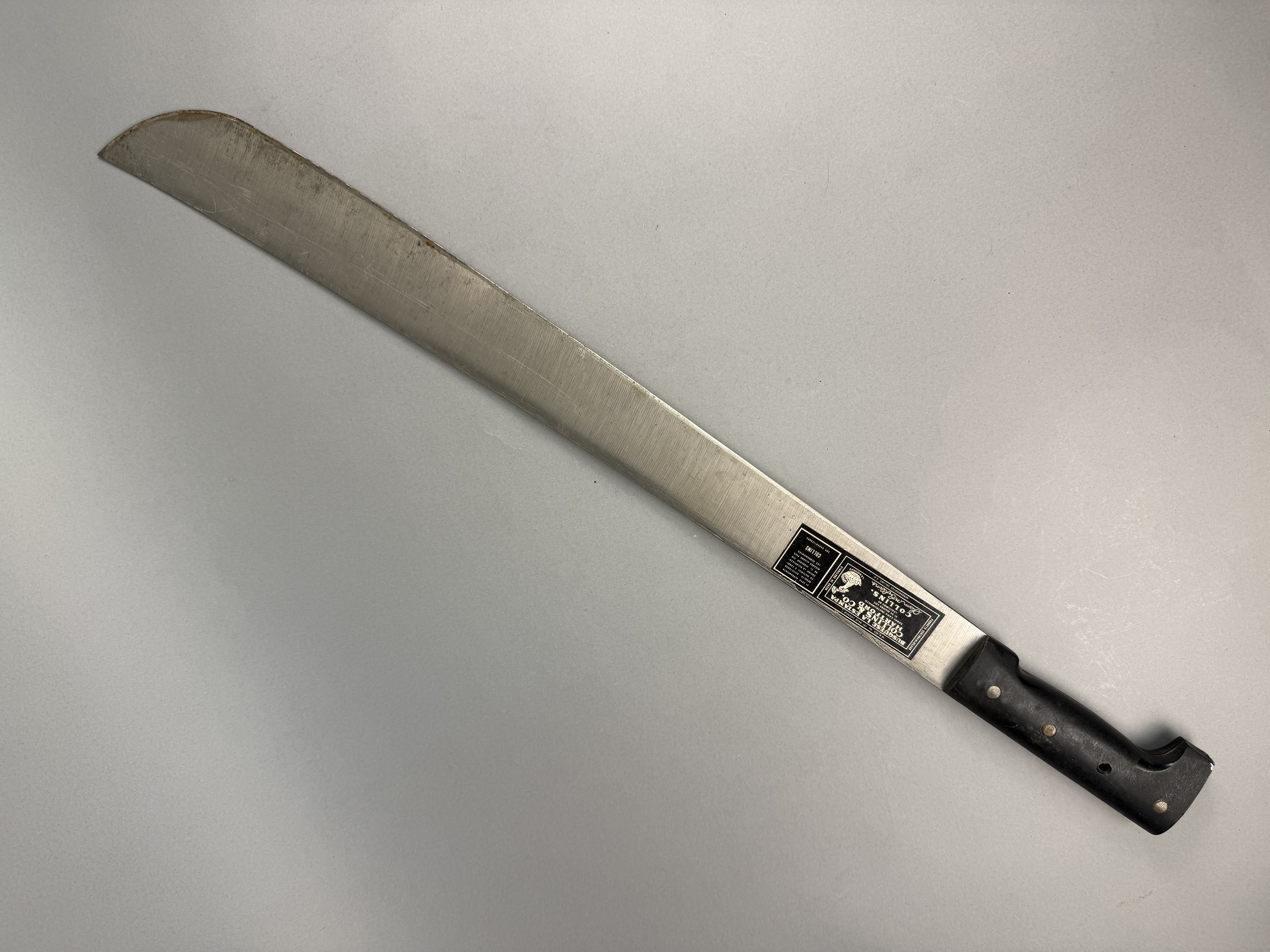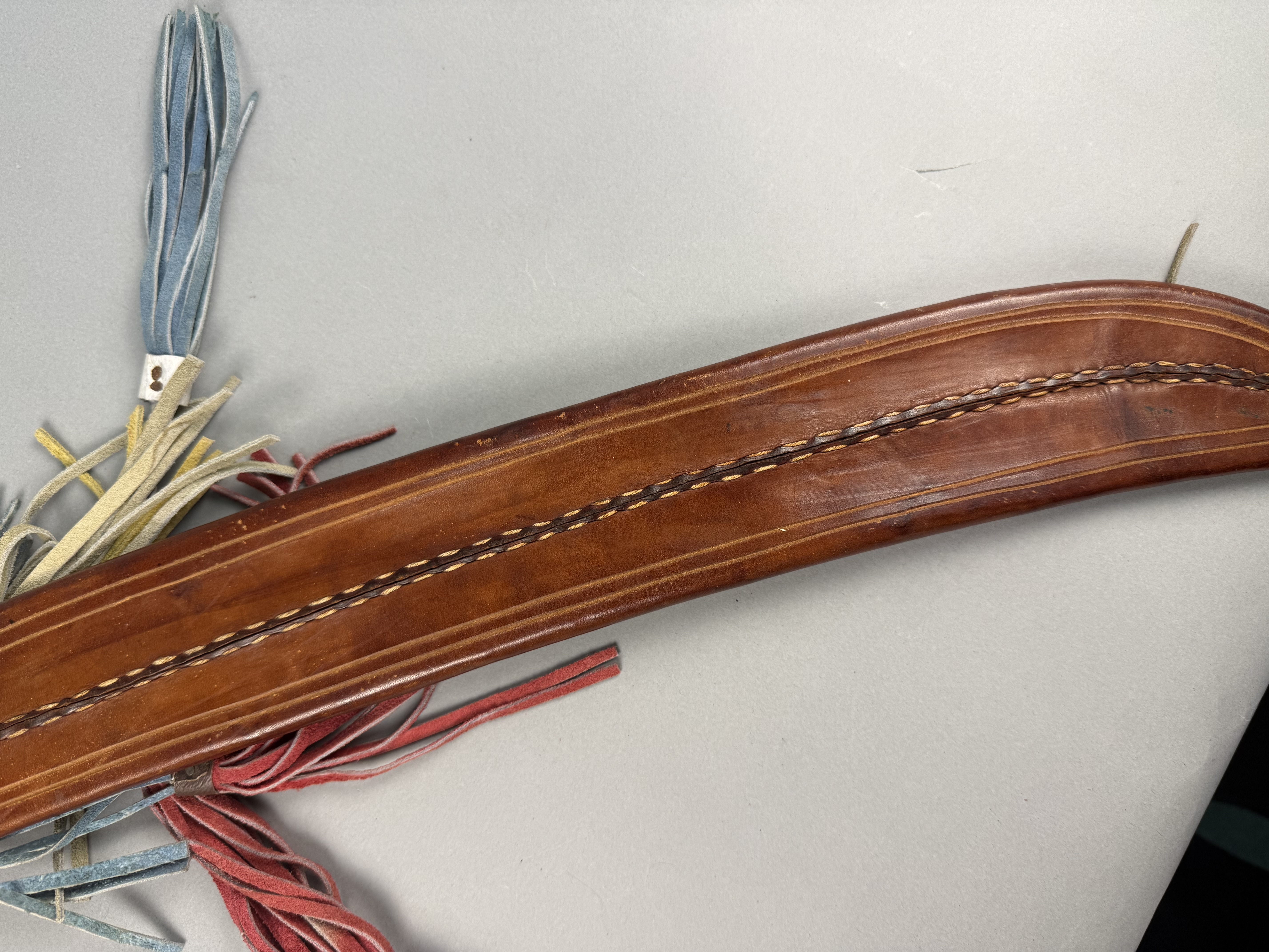 This lot features a mid-to-late 20th-century machete manufactured by Herramientas Collins S.A. in Guatemala under license from Collins and Co. of Hartford, Connecticut. The tool is constructed with a straight-back steel blade featuring a curved tip and a black molded composite hilt. The hilt is secured to the tang with three metal rivets and features a bird’s head pommel with a lanyard hole. The face of the blade retains a large black and white adhesive label bearing the Legitimus arm and hammer graphic and text including Busquese La Estampa, Collins and Co. Hartford, and Hecho en Guatemala. The machete is housed in a decorative, custom-style brown leather scabbard. The leather is heavily tooled with floral and scrollwork motifs and is embellished with multiple multi-colored suede leather tassels in red, light blue, and tan. A silver-tone metal concho is affixed to the throat of the scabbard, and long leather fringe ties are attached to the tip. The reverse of the scabbard features a stitched leather belt loop. Overall Machete Length: 27 inches Blade Length: 22 inches The blade is in good overall condition, showing original factory grinding marks and a well-preserved adhesive maker’s label. There is visible surface oxidation and light pitting concentrated near the tip of the blade. The composite hilt shows minor surface scuffing but remains secure. The leather scabbard is in very good condition with supple leather and intact stitching. The multi-colored suede tassels show light age-related wear and some accumulated dust.