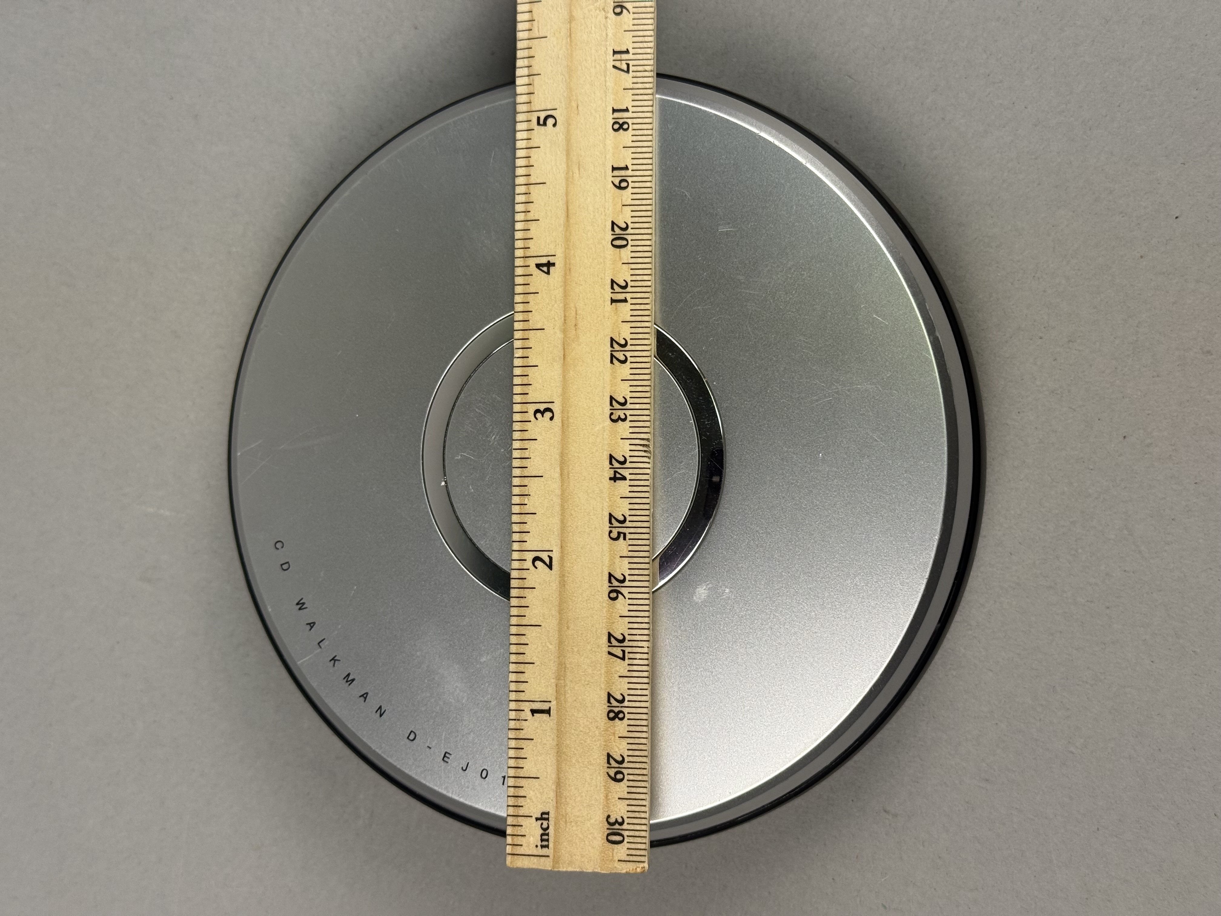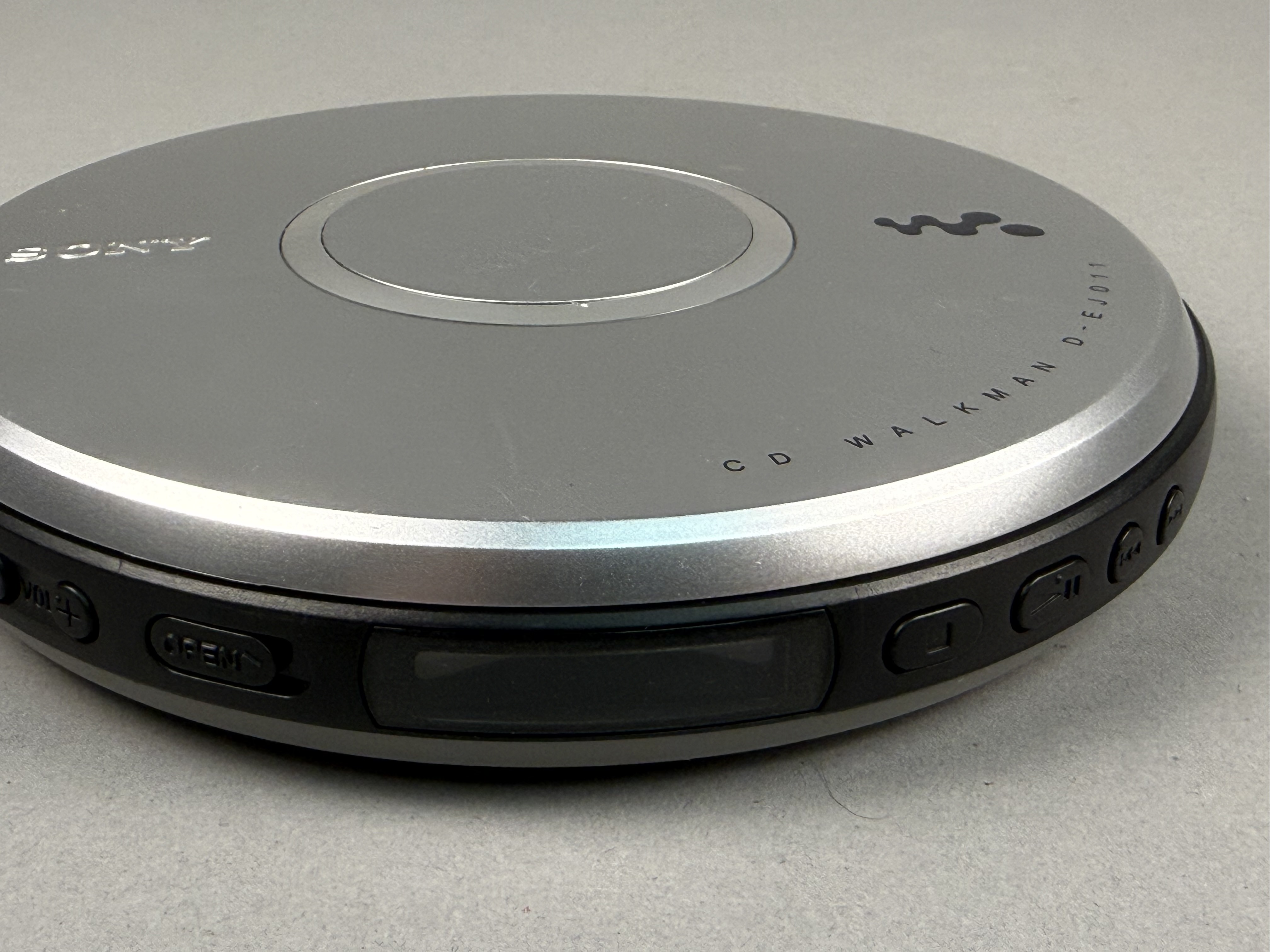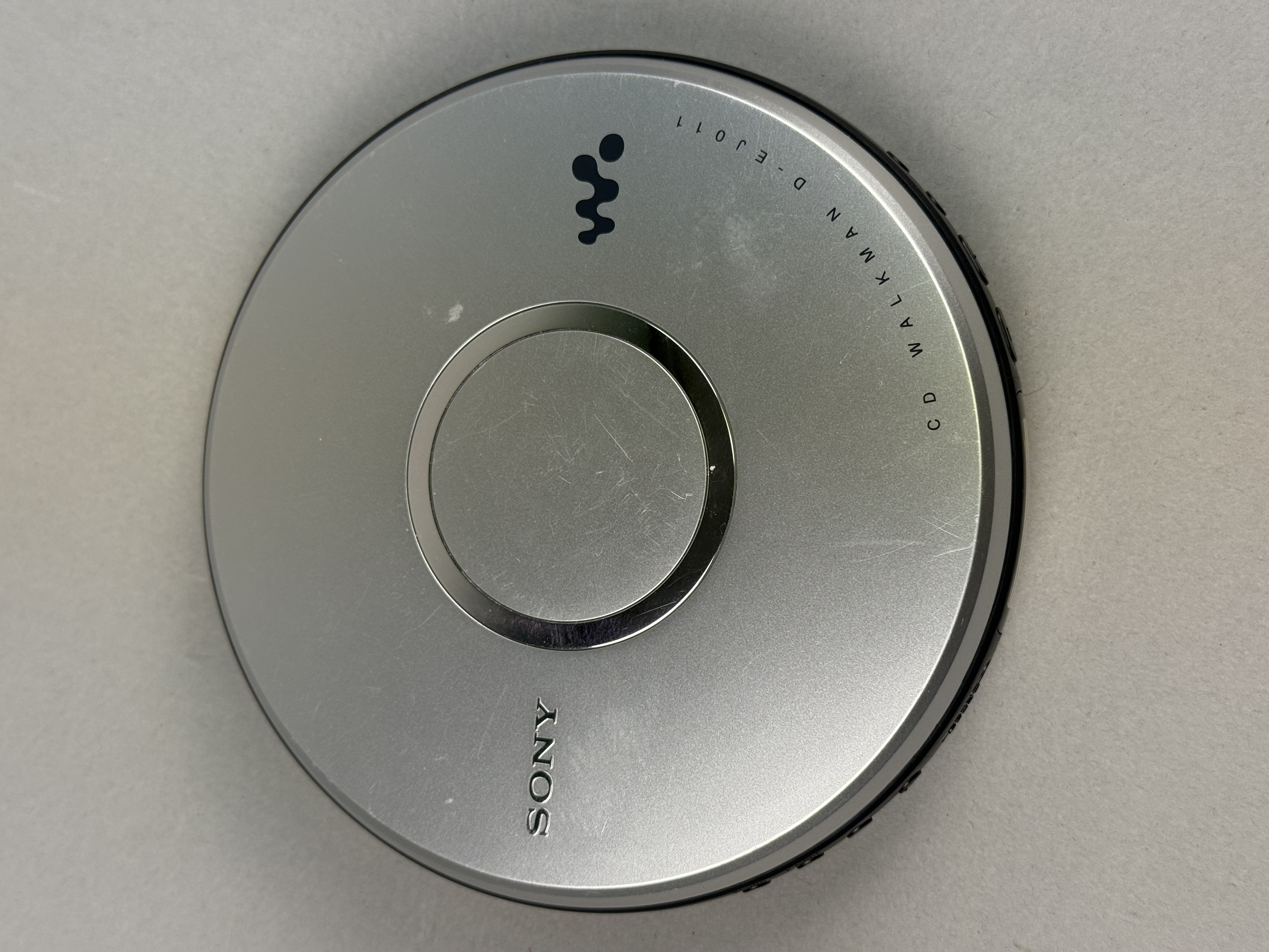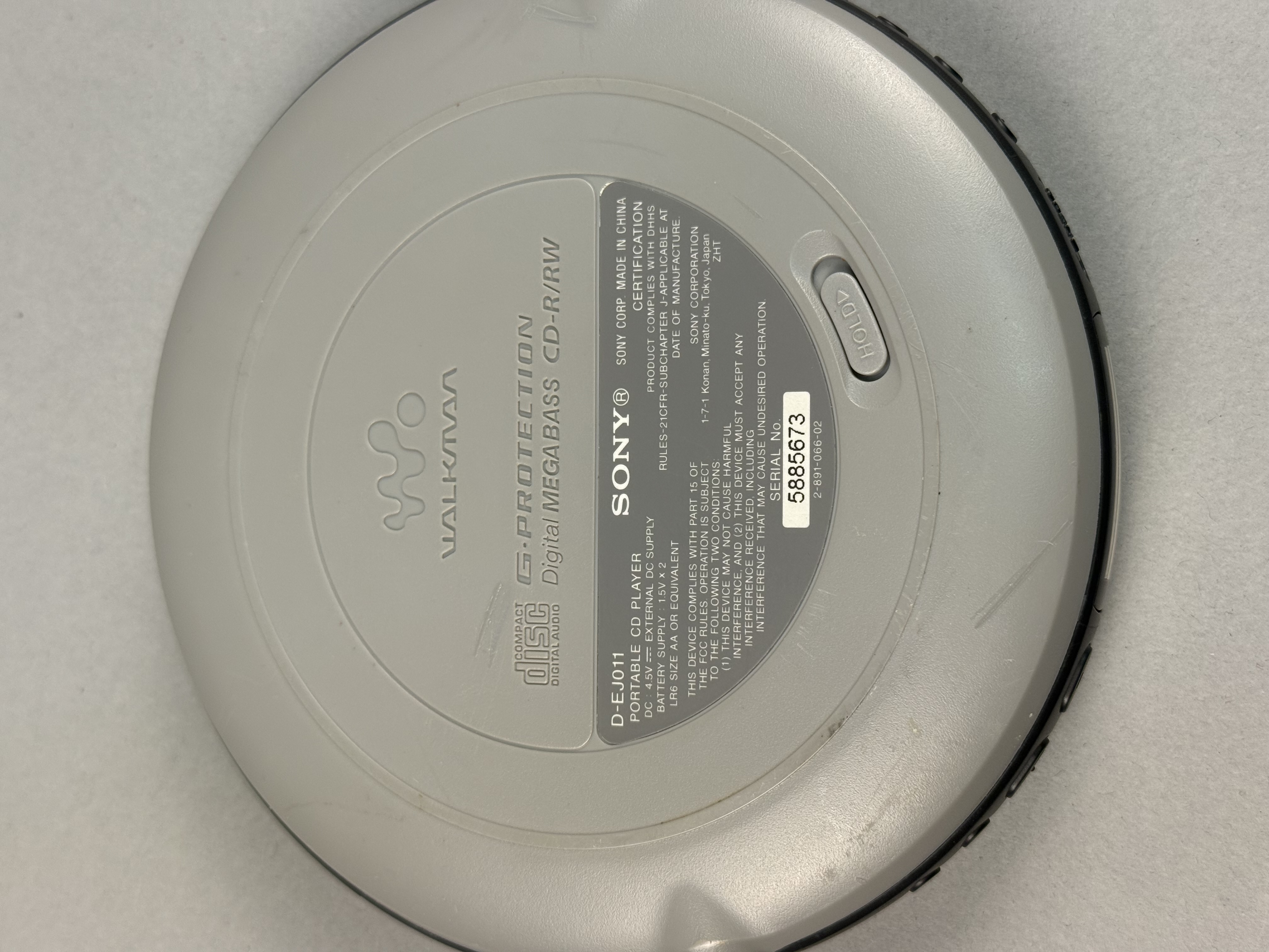 Tested and working. This Sony CD Walkman, model D-EJ011, is a portable compact disc player constructed with a silver-tone plastic top and a black plastic lower housing. The top lid features the Sony brand name, the stylized Walkman logo, and the model number. The device is equipped with G-Protection skip protection and Digital Mega Bass technology, as noted on the base. It is designed for compatibility with CD-R and CD-RW disc formats. The perimeter of the unit contains a small monochrome LCD screen, volume adjustment buttons, an open latch, and playback controls for play, pause, stop, and track navigation. The bottom includes a sliding hold switch and a product label detailing power requirements of two 1.5V AA batteries or a 4.5V DC external power source. The label also lists the serial number 5885673 and indicates manufacture in China. Diameter: 5.5 inches The exterior silver finish shows moderate signs of wear, including visible surface scratches and scuffing on the top lid. The interior disc spindle and battery compartment terminals appear clean and free of corrosion.