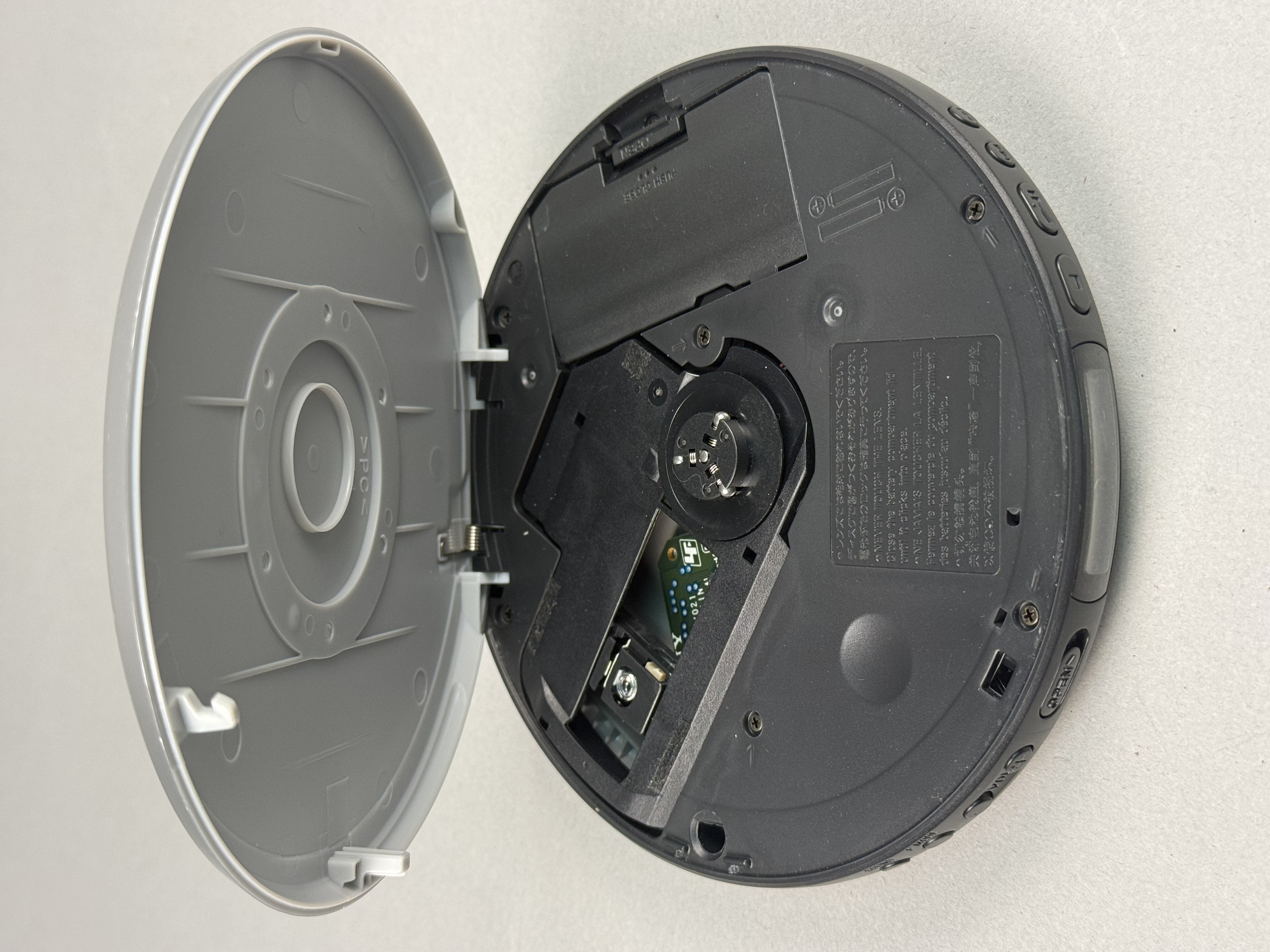 The exterior silver finish shows moderate signs of wear, including visible surface scratches and scuffing on the top lid. The interior disc spindle and battery compartment terminals appear clean and free of corrosion.