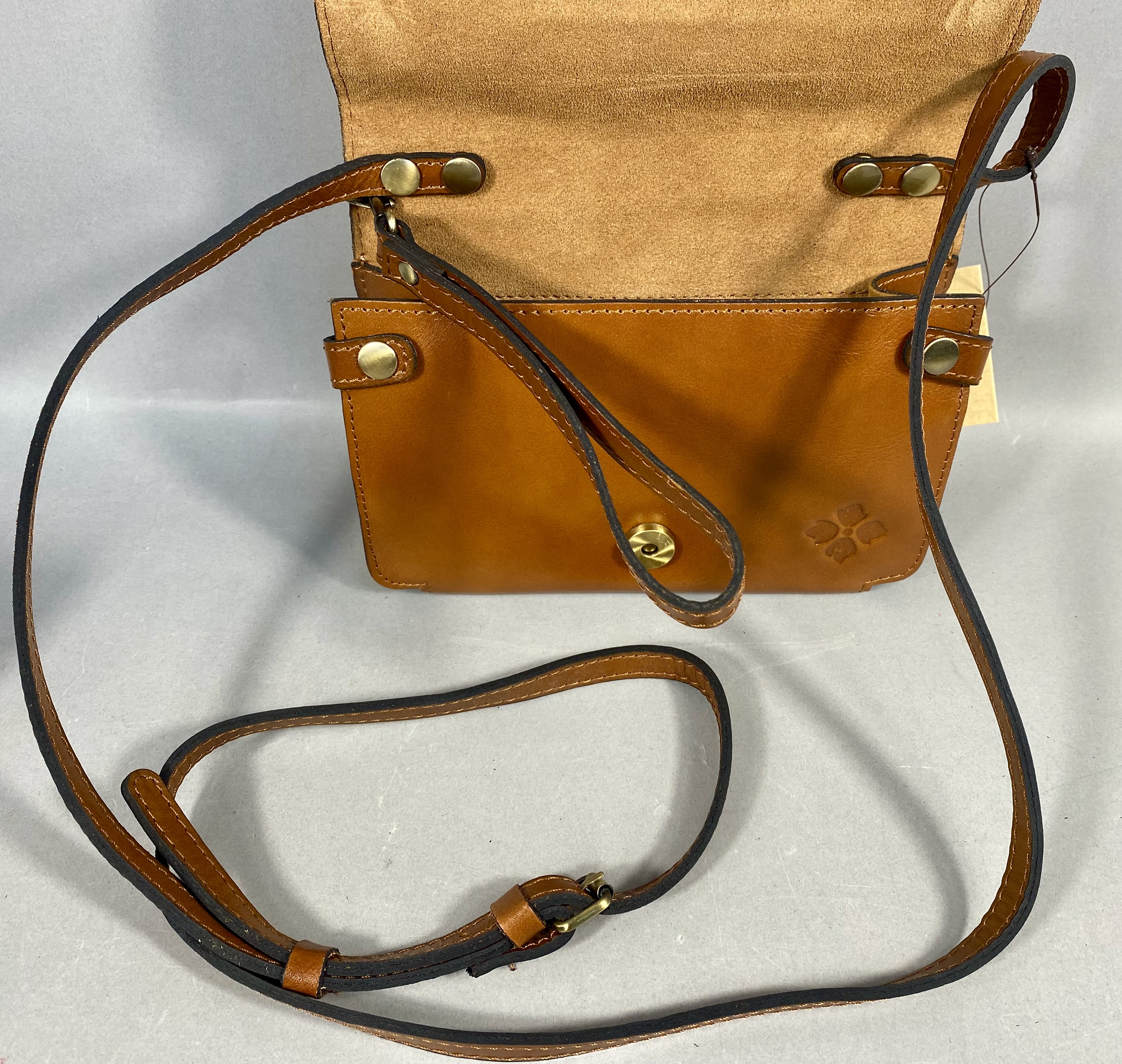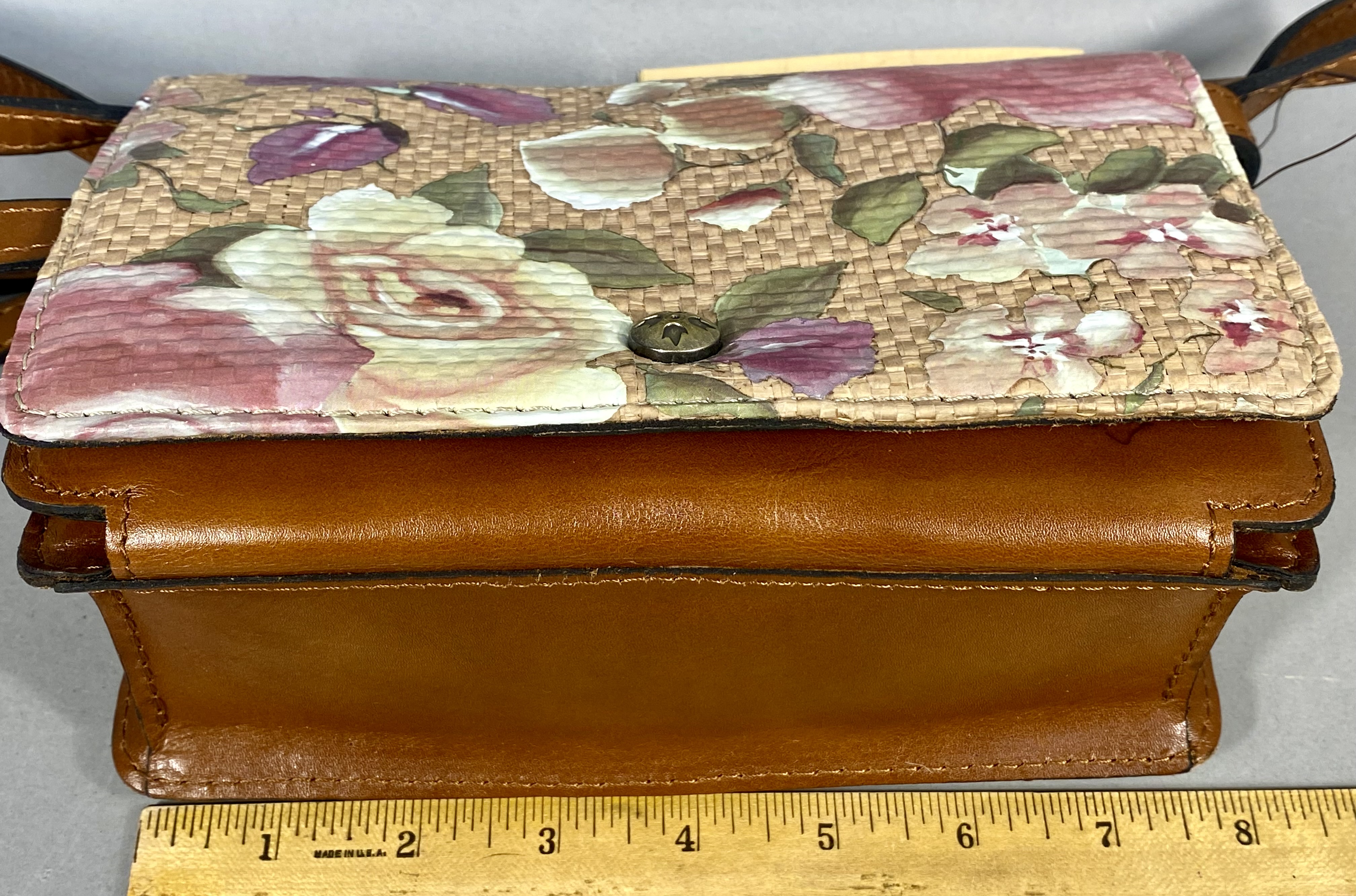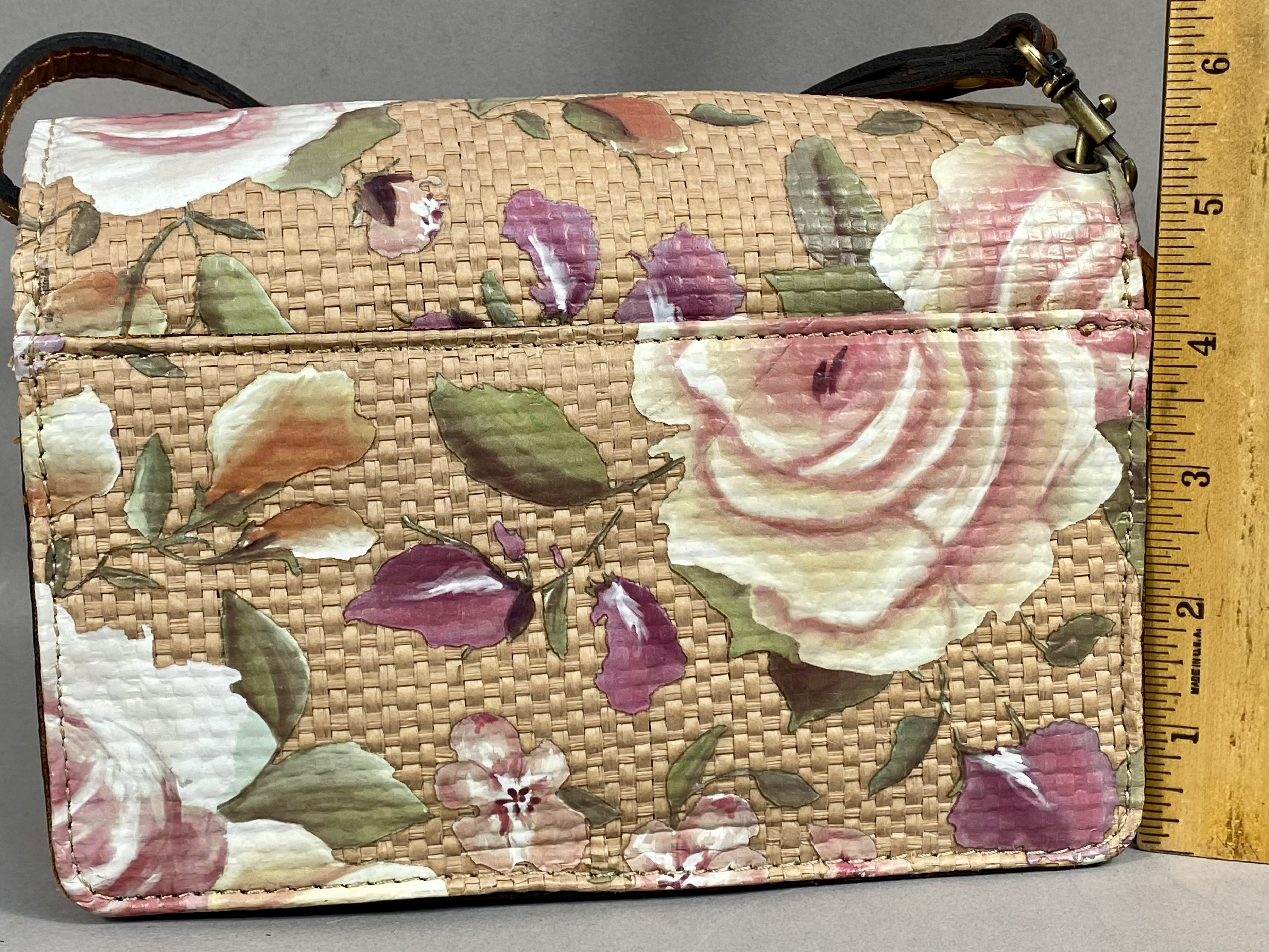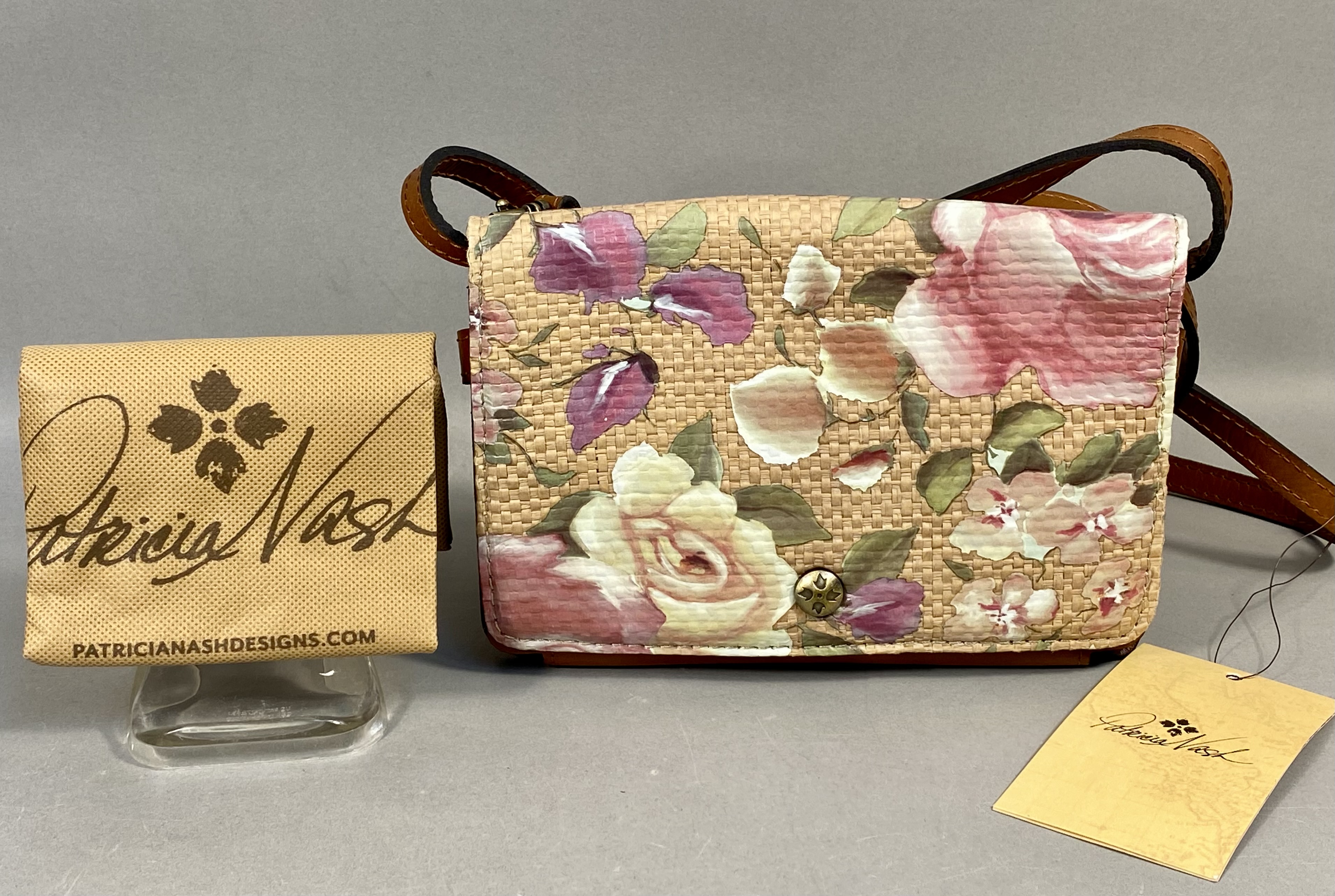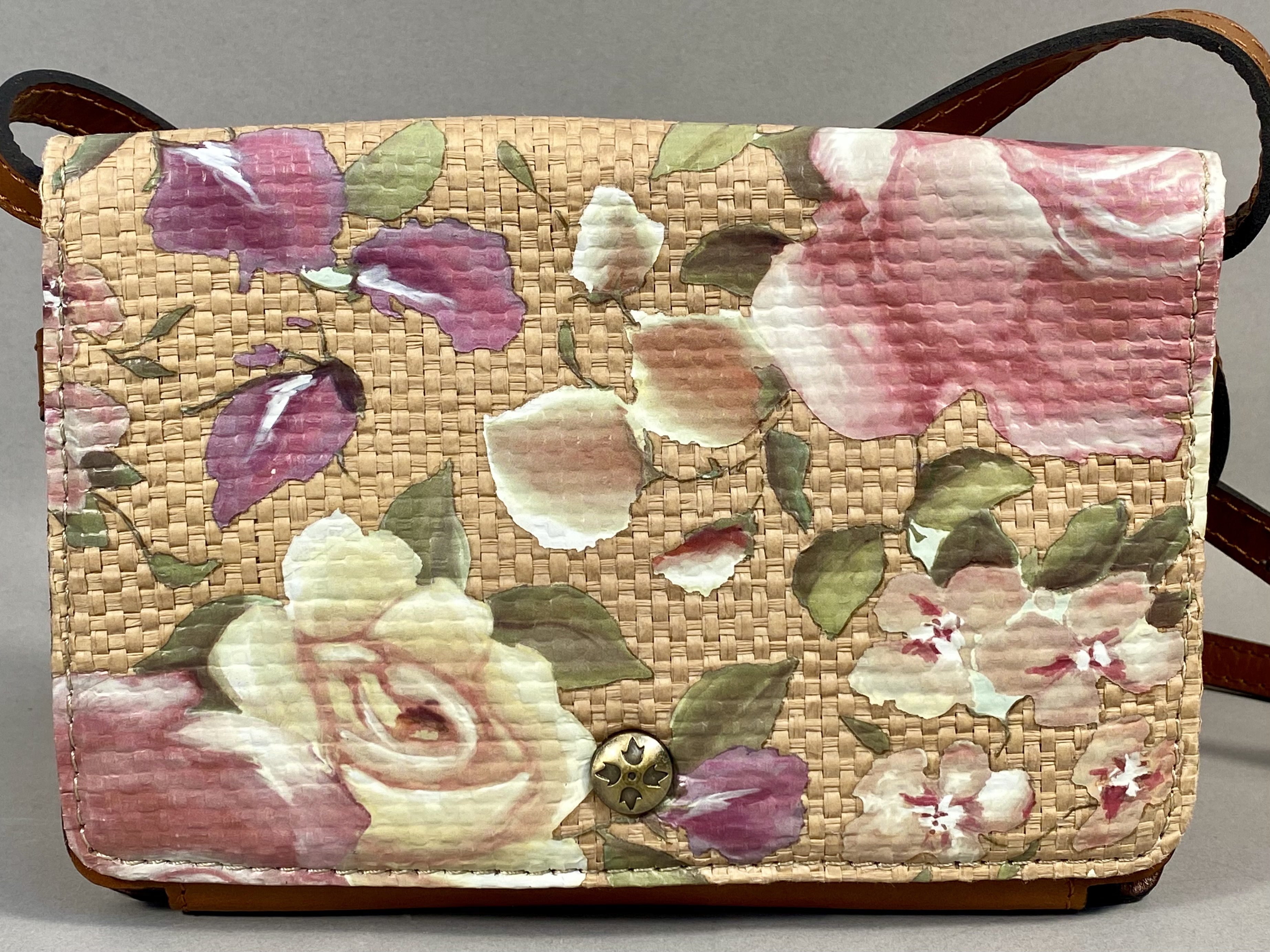 This Patricia Nash Francia crossbody bag is constructed from a combination of full-grain cognac leather and woven straw. The front flap and back panel feature a printed woven straw design in the Cracked Rose Garden pattern, which depicts large roses in shades of pink, cream, and purple against a natural-toned background. The bag is trimmed in cognac tan leather and includes an adjustable leather crossbody strap with antique brass-tone buckle hardware. The front flap secures with a magnetic snap closure embellished with a signature antique brass-tone floret-embossed button.