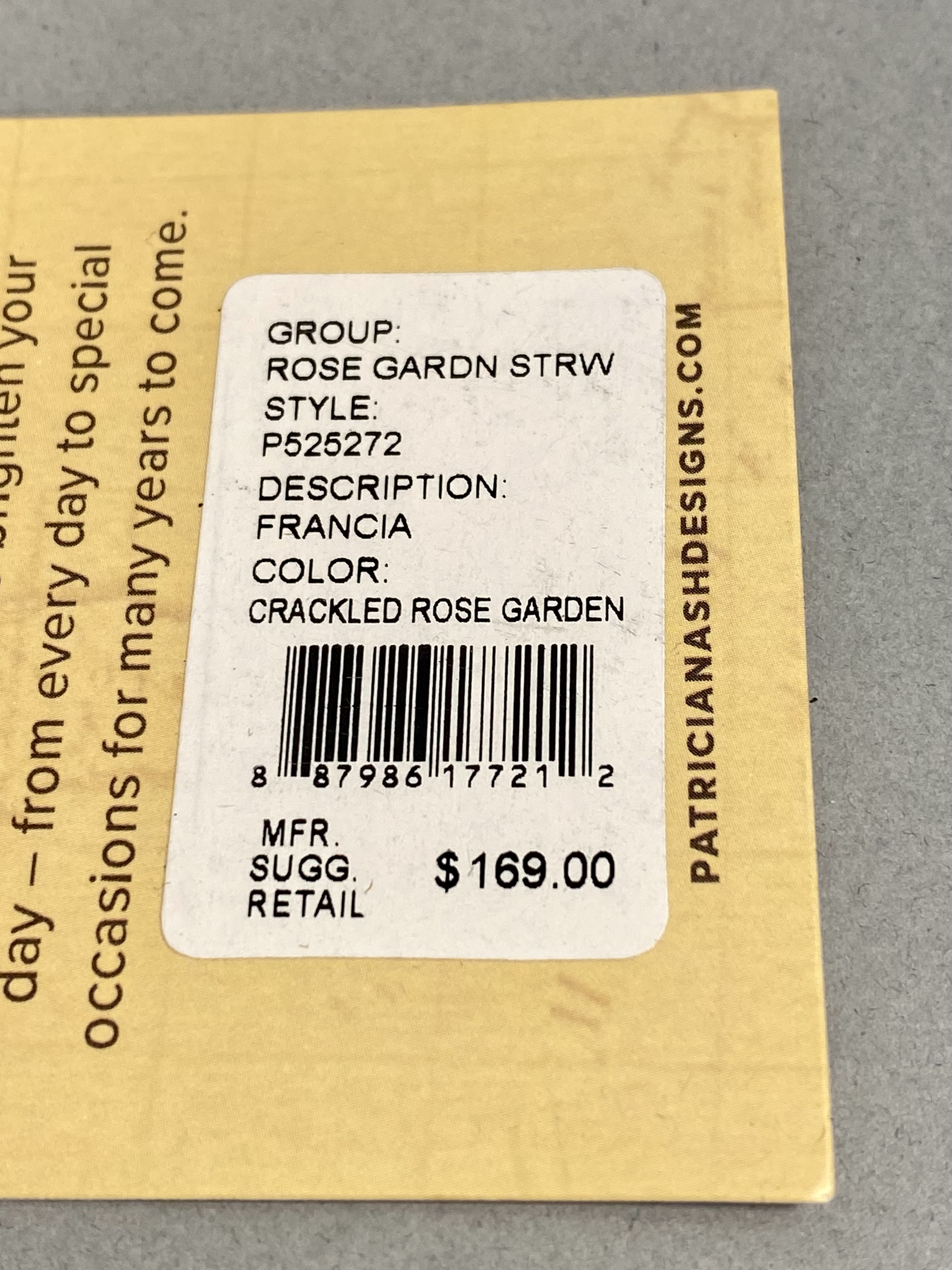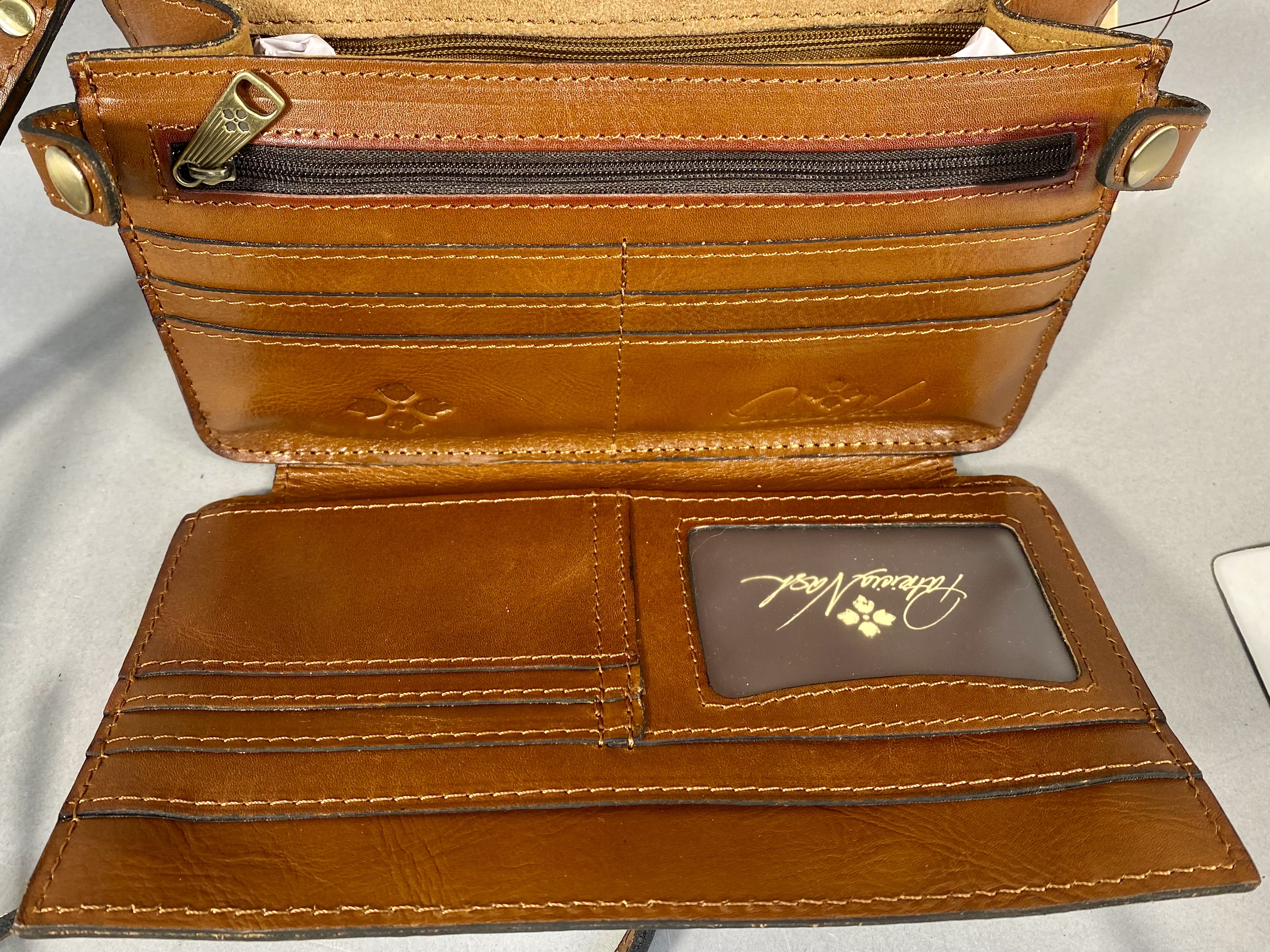 The interior is designed as an organizer or wallet-on-string, featuring a tan suede-like lining. The organization includes multiple credit card slots, a clear ID window with the Patricia Nash logo, a zippered compartment with a signature floret pull, and an accordion-style main pocket. A full-width slip pocket is located on the exterior back. The interior leather is embossed with the Patricia Nash floret symbol. The original retail hangtag is attached, identifying the style as Francia (P525272) and the group as Rose Garden Straw.