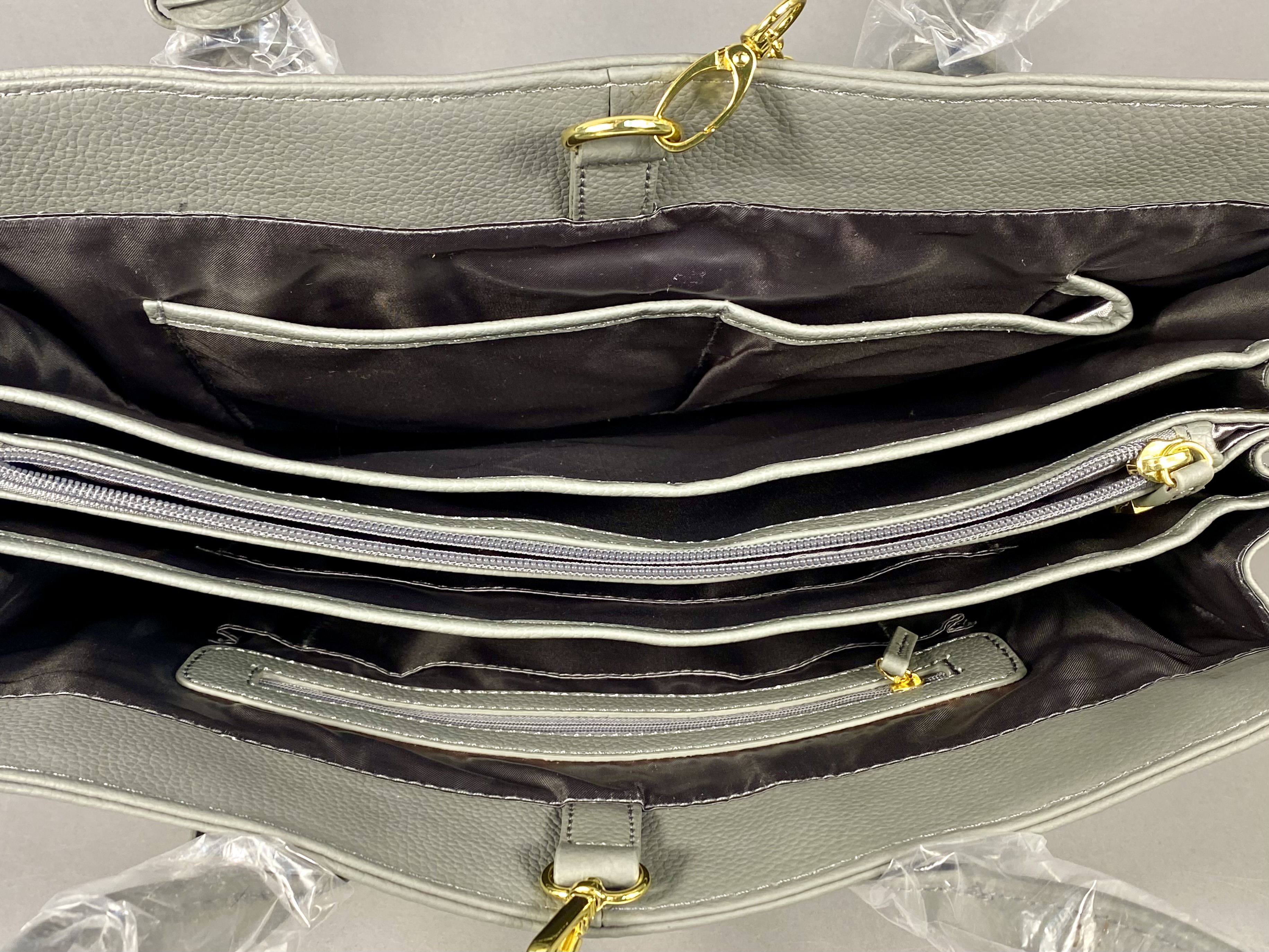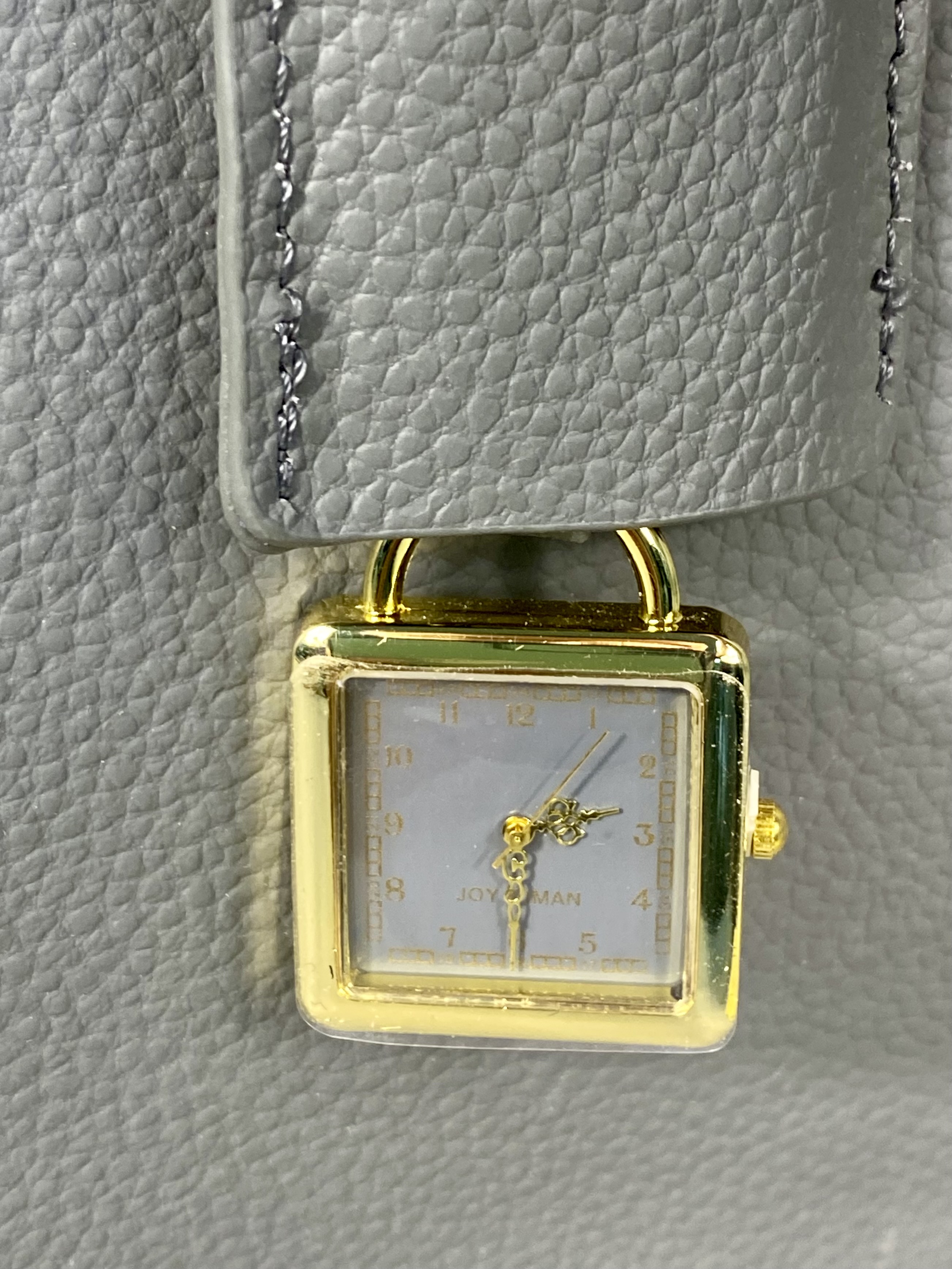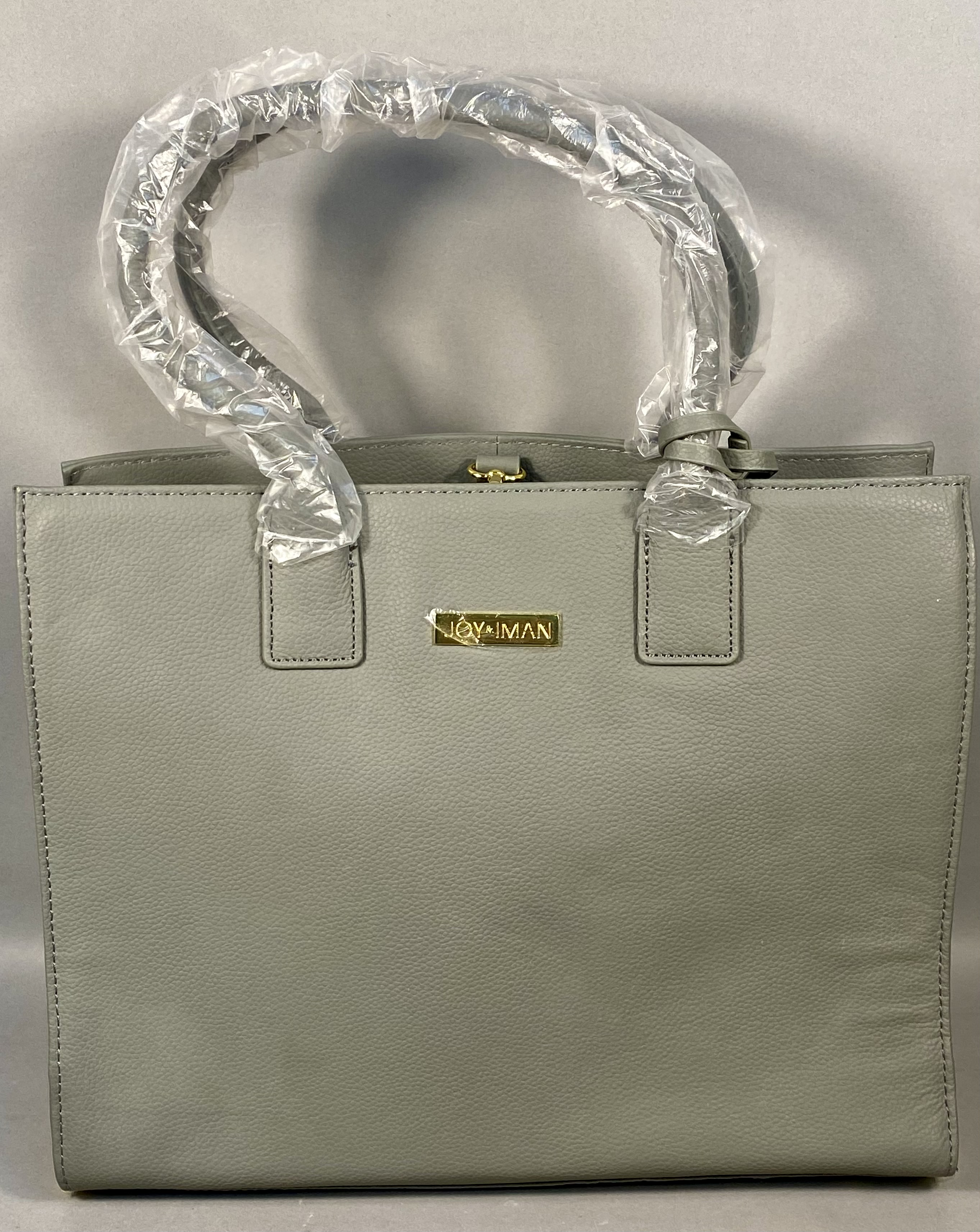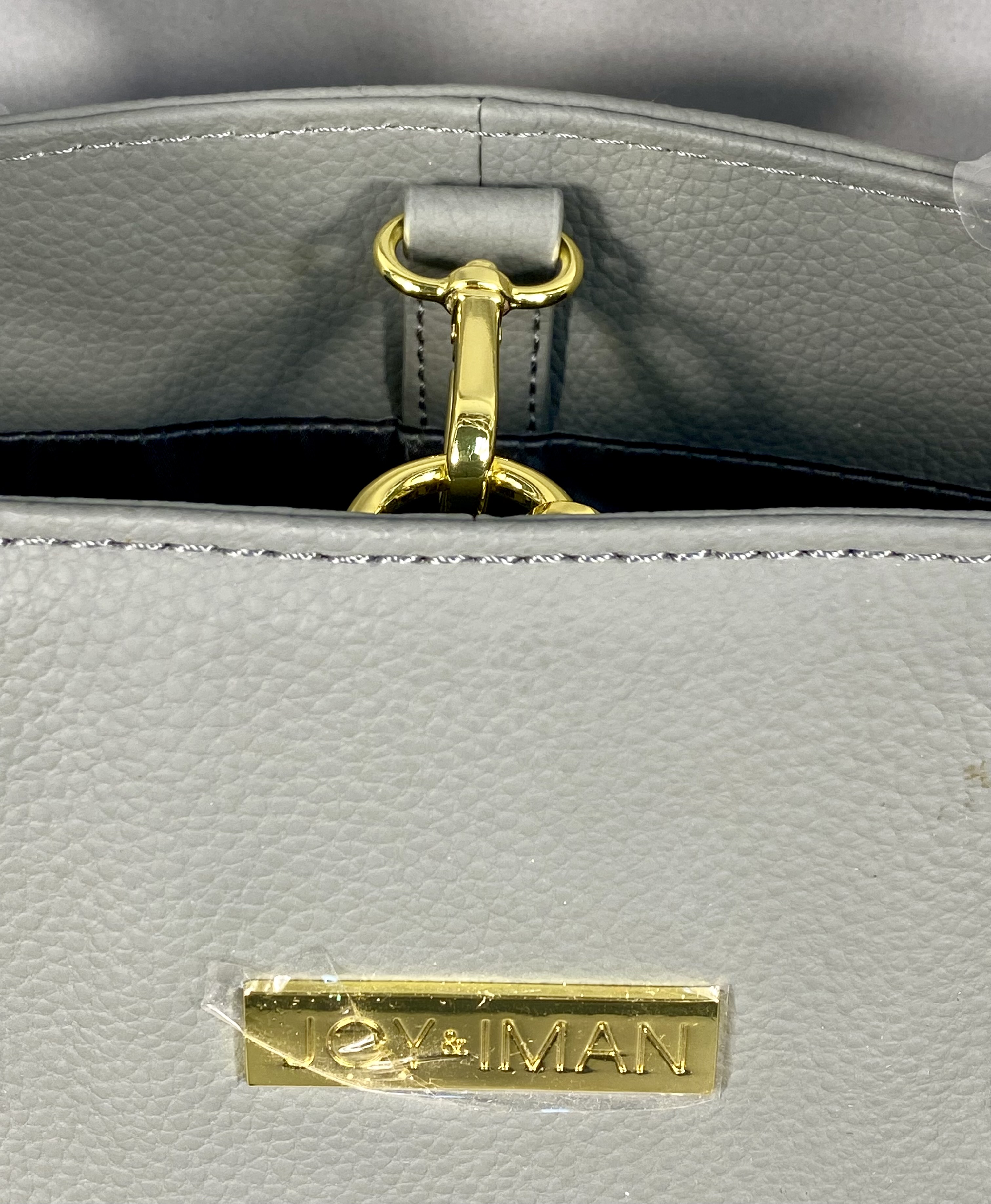 A structured tote bag by Joy and Iman crafted from gray pebble-grained leather with gold-tone hardware. The exterior features dual rolled top handles and a rear zippered pocket. The front is detailed with a gold-tone metal plaque bearing the Joy and Iman logo. The base is fitted with four gold-tone metal feet. The interior is organized into five main compartments, including two full-length zippered sections and three open sections, all lined with a dark brown branded fabric. Internal storage includes multiple slip pockets and one zippered wall pocket. A notable accessory is an integrated square gold-tone watch charm with a gray face and Joy and Iman branding attached to an interior zipper pull.