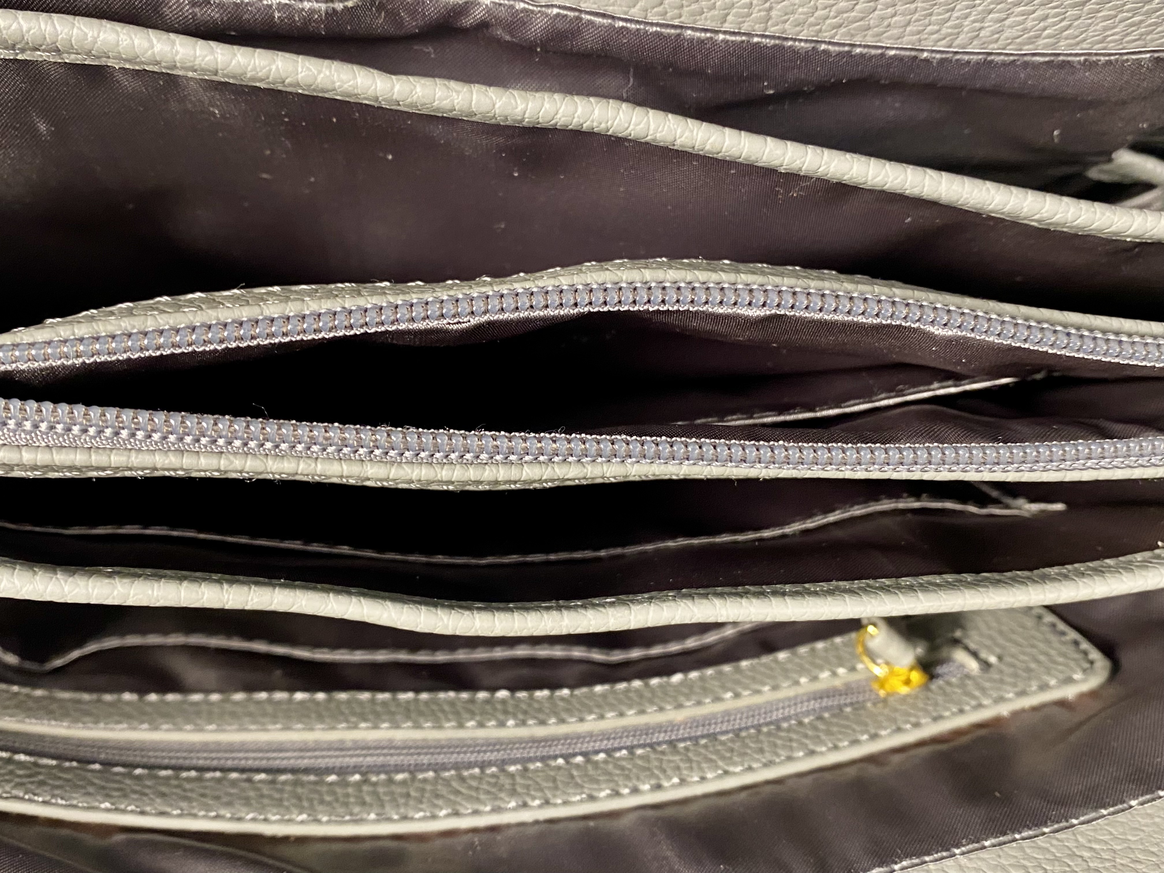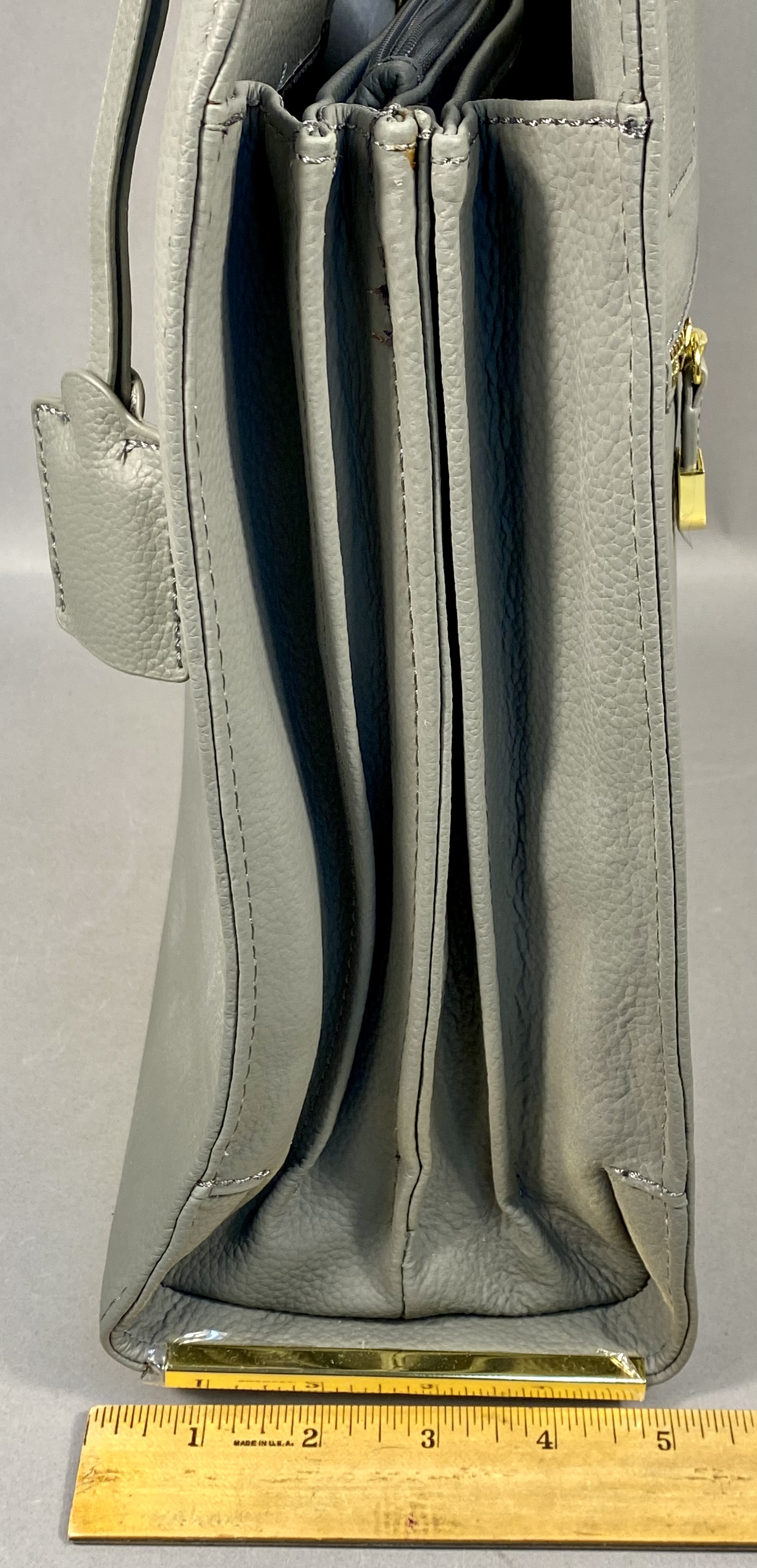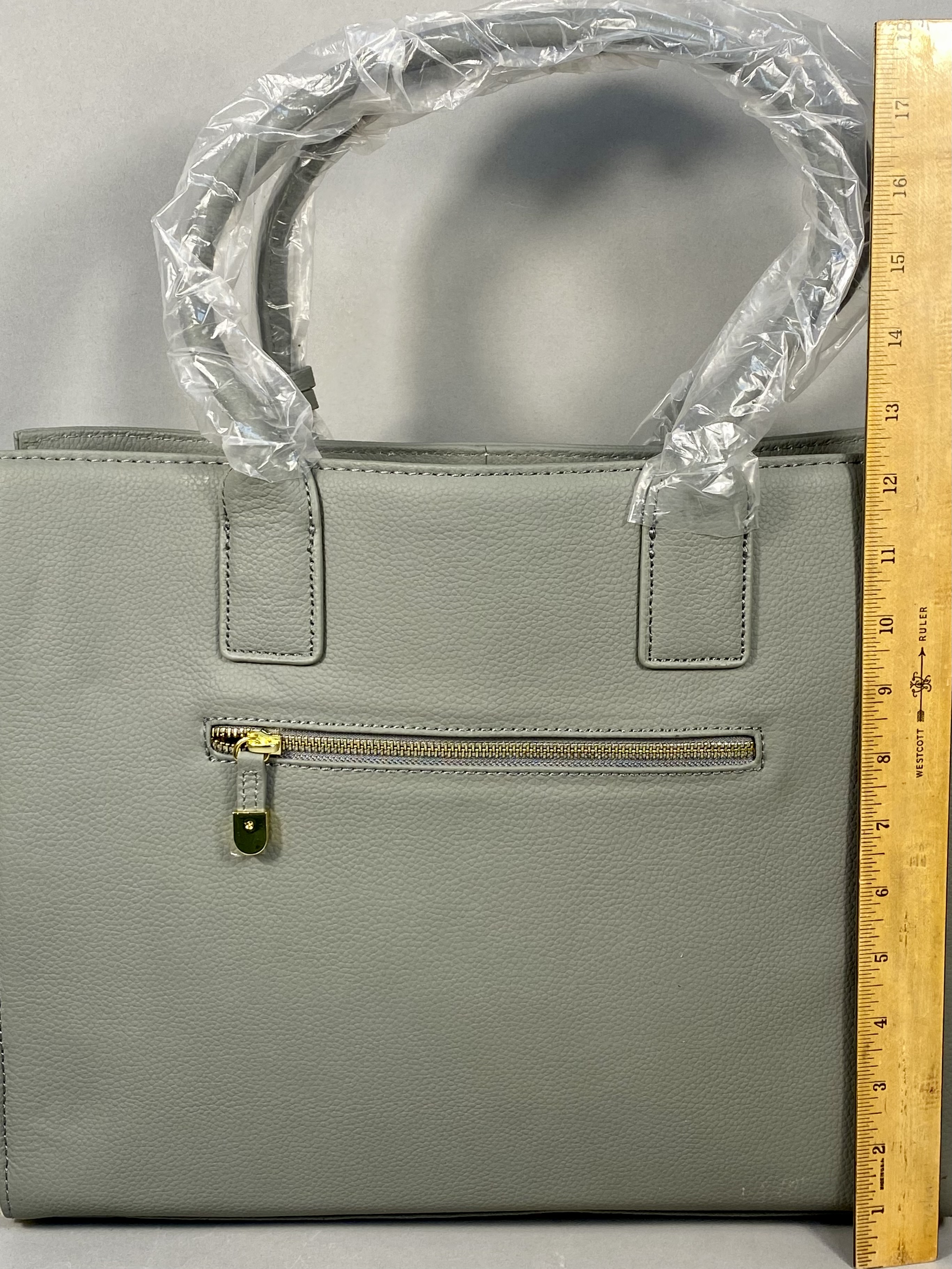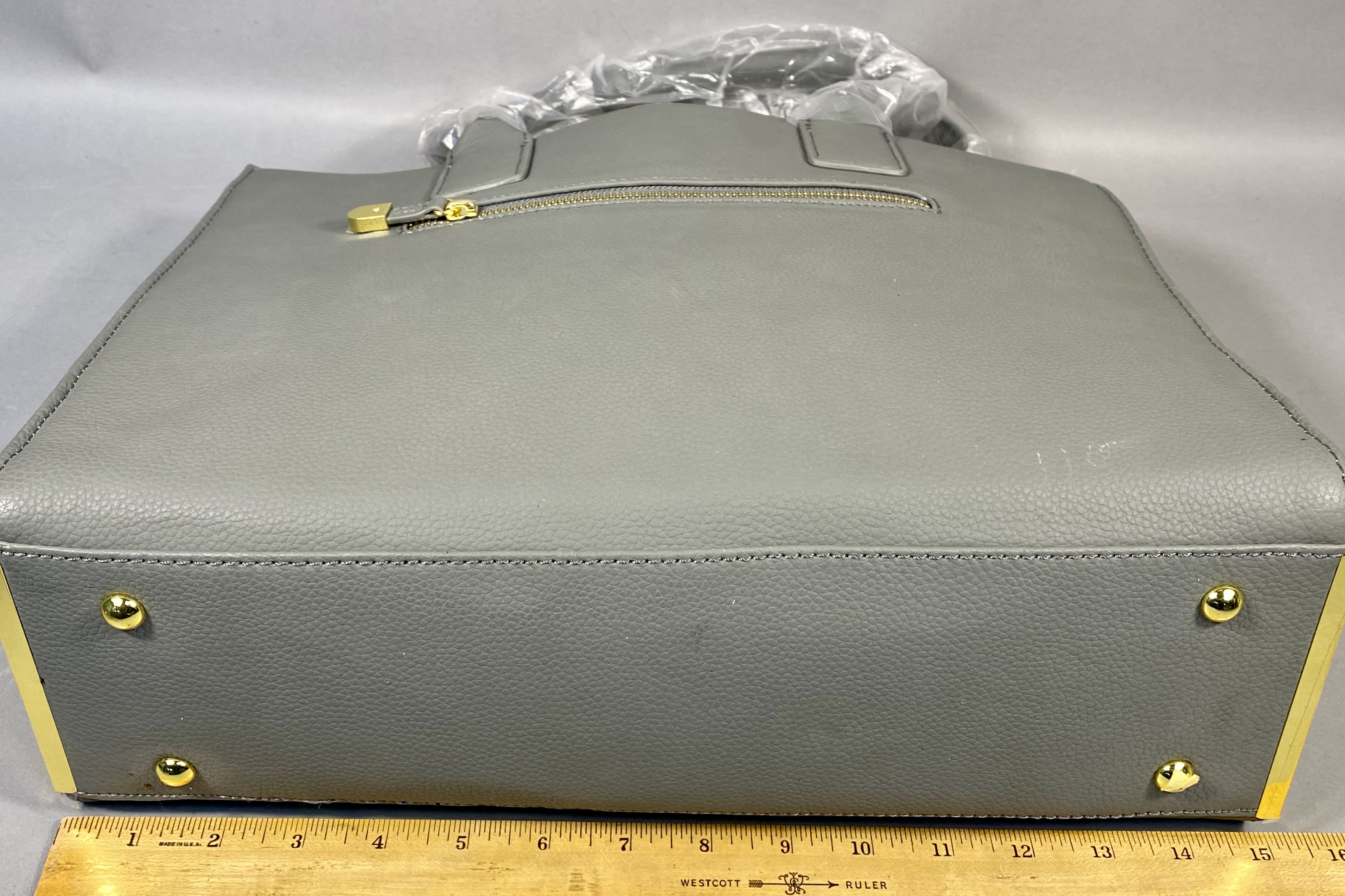 A structured tote bag by Joy and Iman crafted from gray pebble-grained leather with gold-tone hardware. The exterior features dual rolled top handles and a rear zippered pocket. The front is detailed with a gold-tone metal plaque bearing the Joy and Iman logo. The base is fitted with four gold-tone metal feet. The interior is organized into five main compartments, including two full-length zippered sections and three open sections, all lined with a dark brown branded fabric. Internal storage includes multiple slip pockets and one zippered wall pocket. A notable accessory is an integrated square gold-tone watch charm with a gray face and Joy and Iman branding attached to an interior zipper pull.