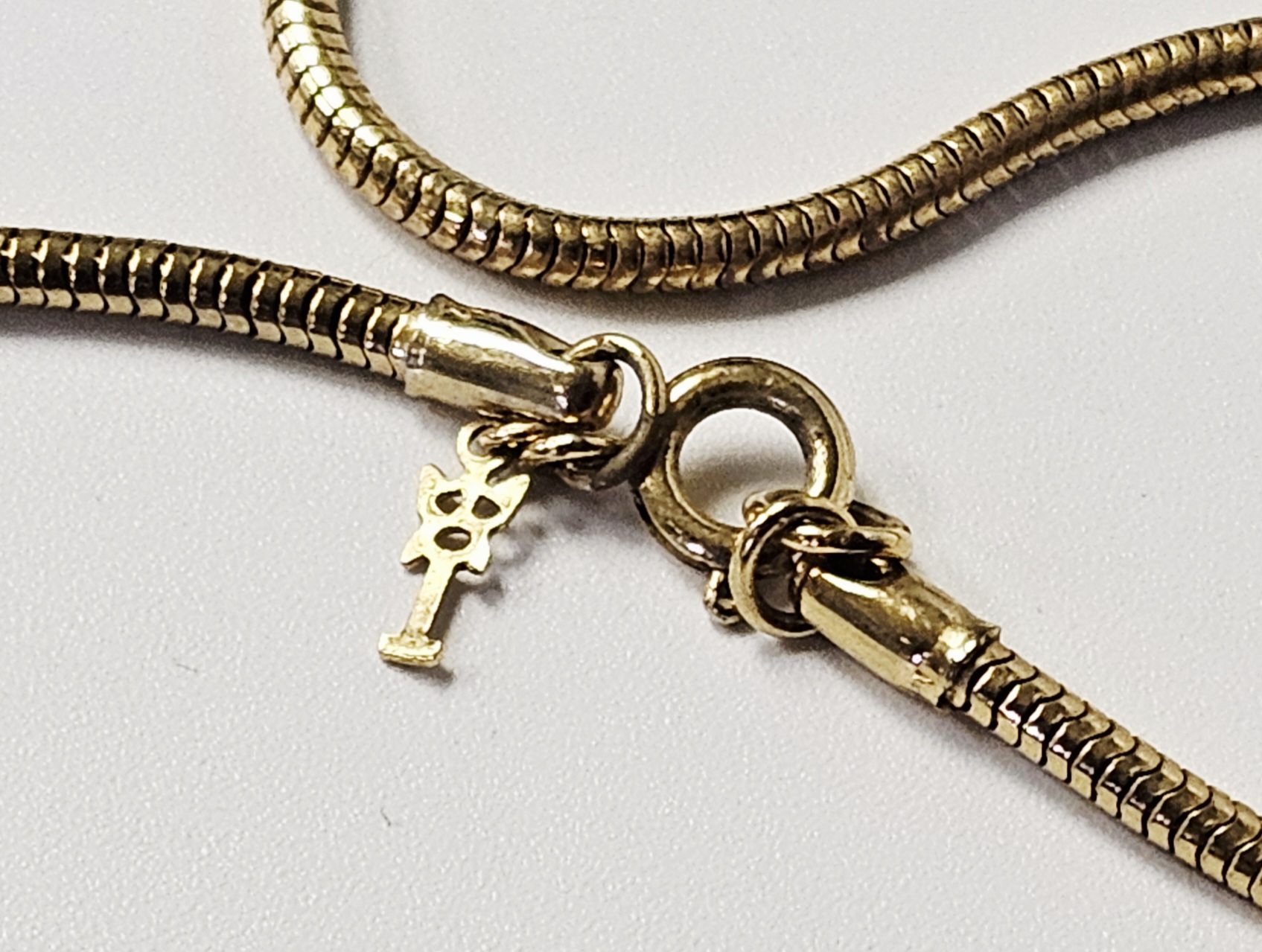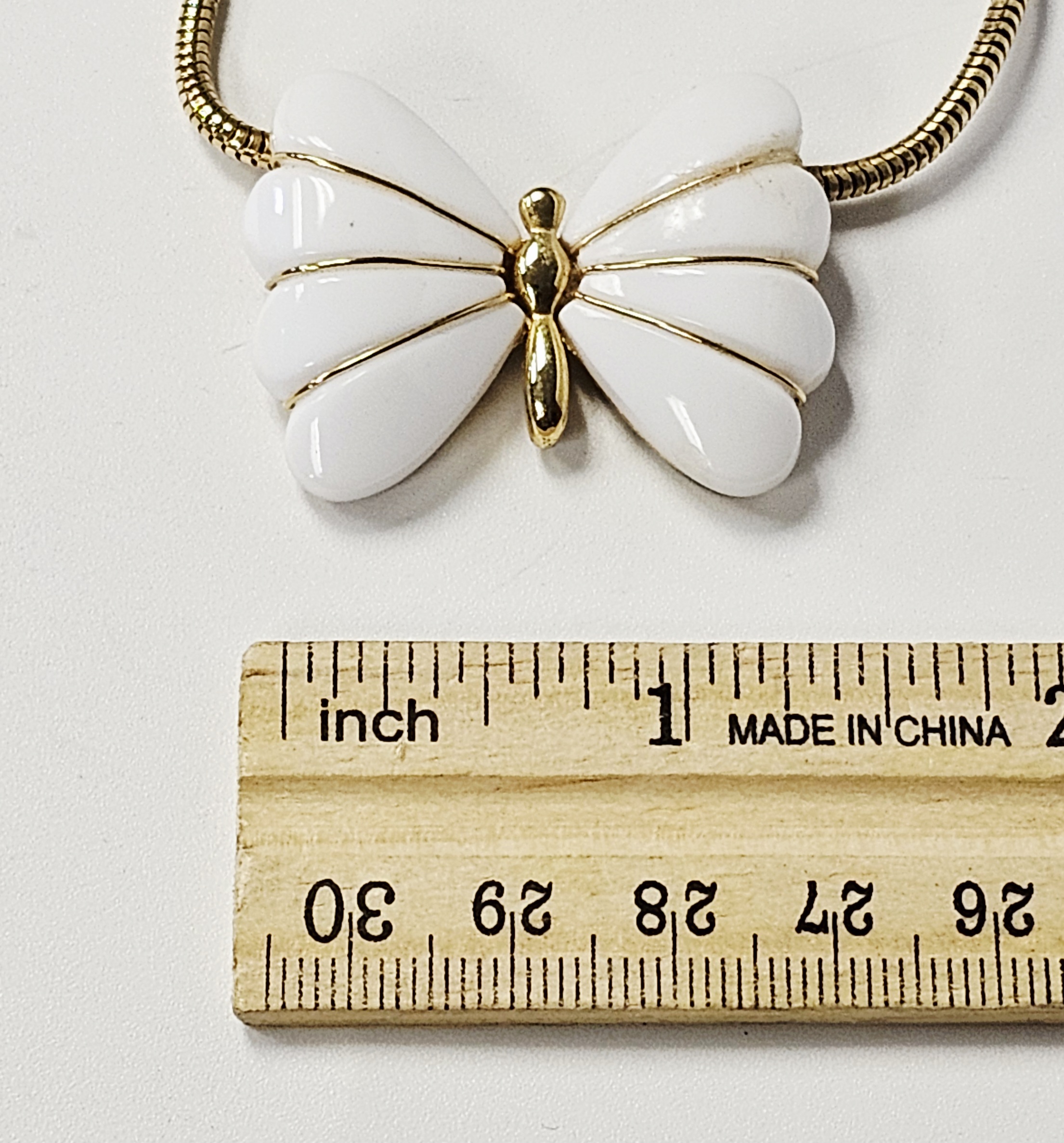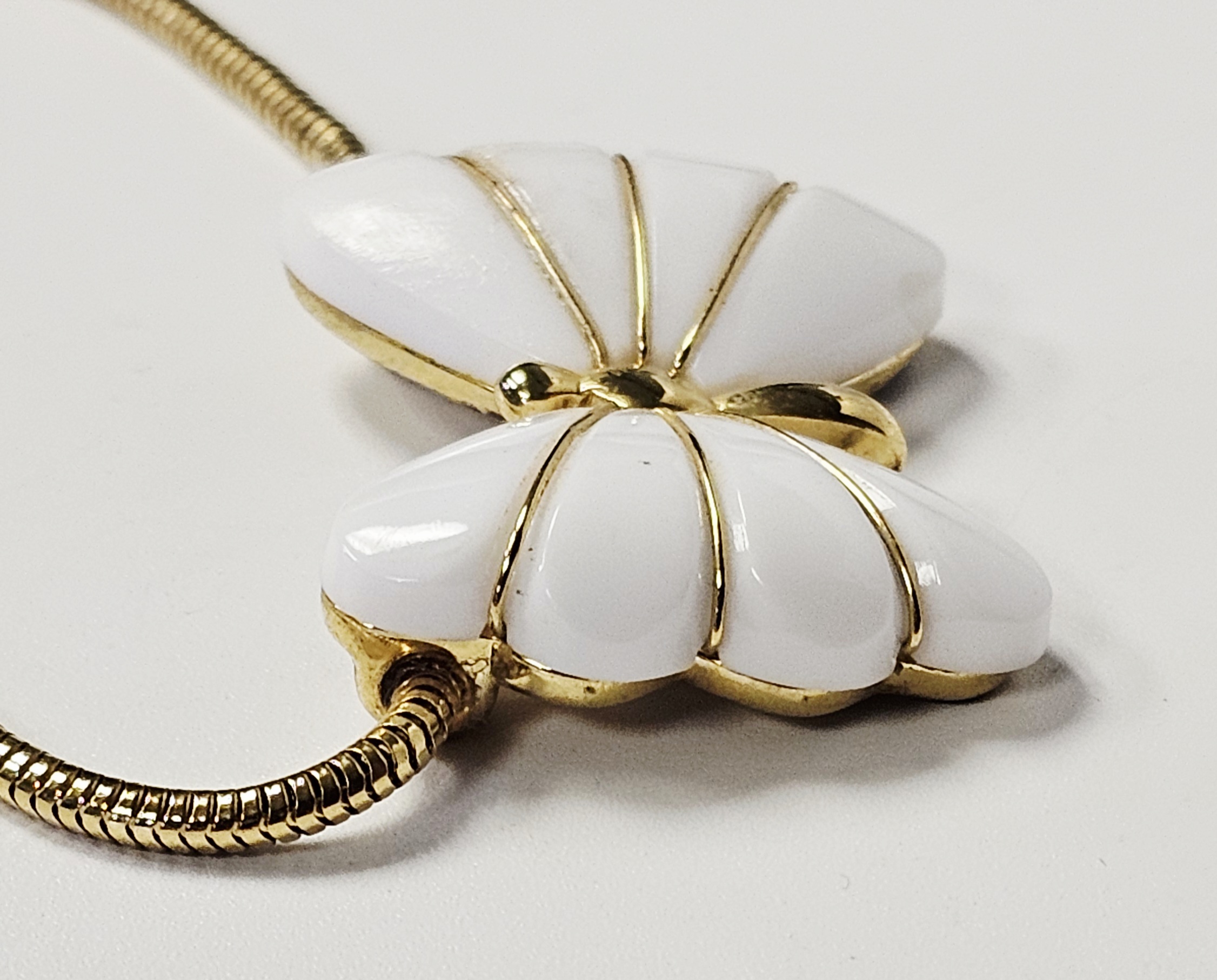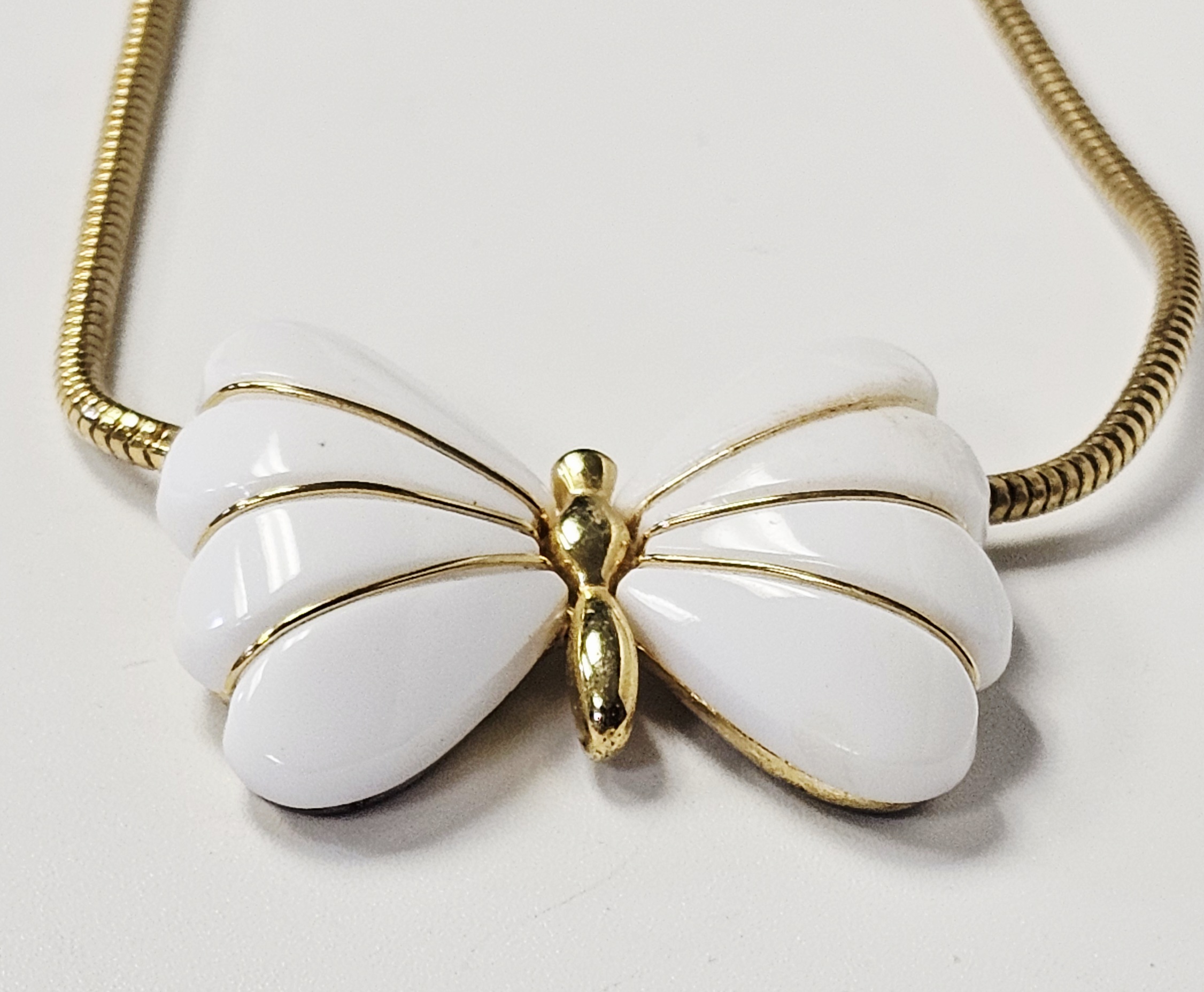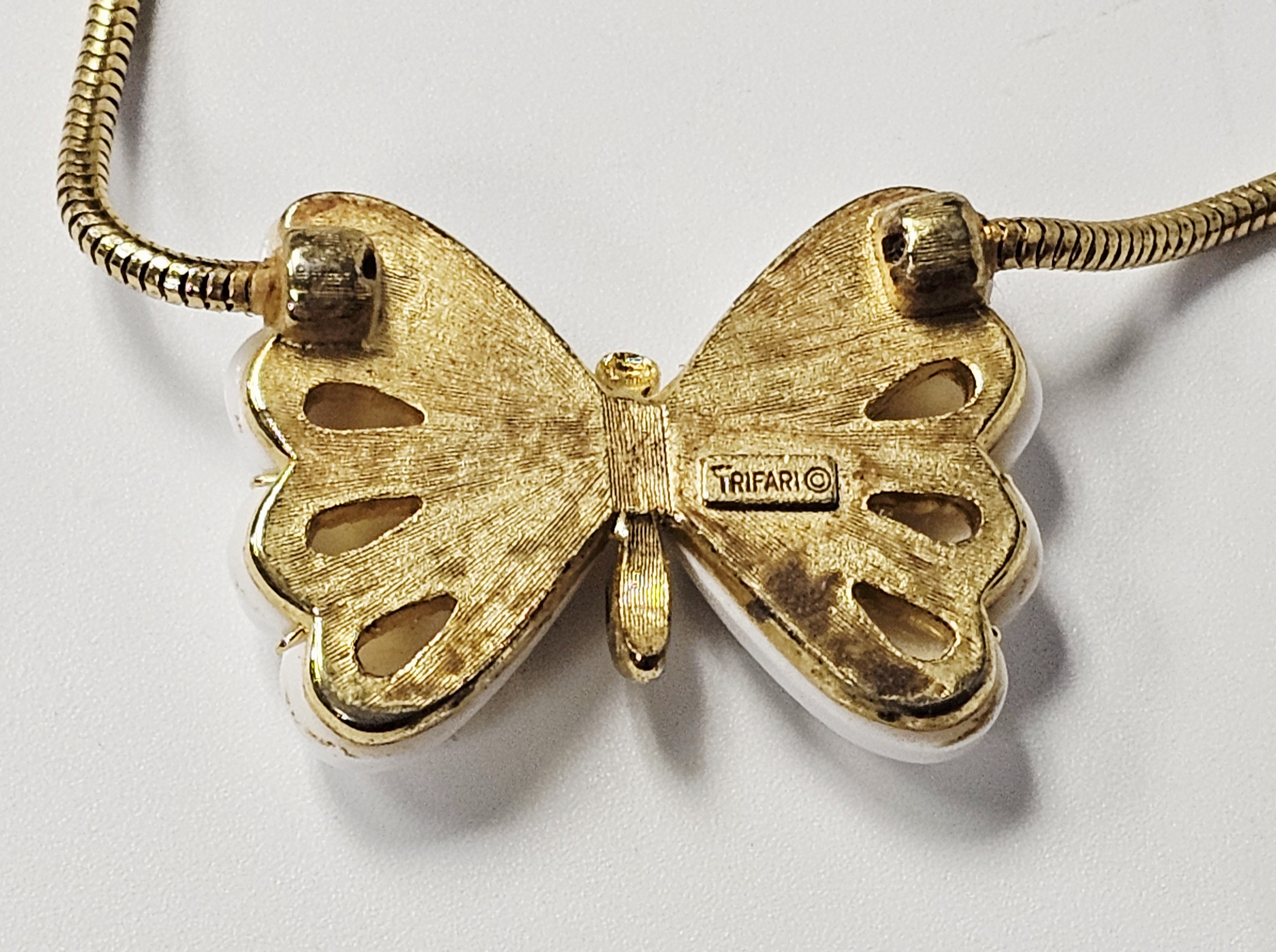 A gold toned snake chain necklace featuring a butterfly pendant with white inset segments and a Trifari maker mark on the reverse, measuring approximately 1.5 inches wide. Measures 16 inches. Good Condition.