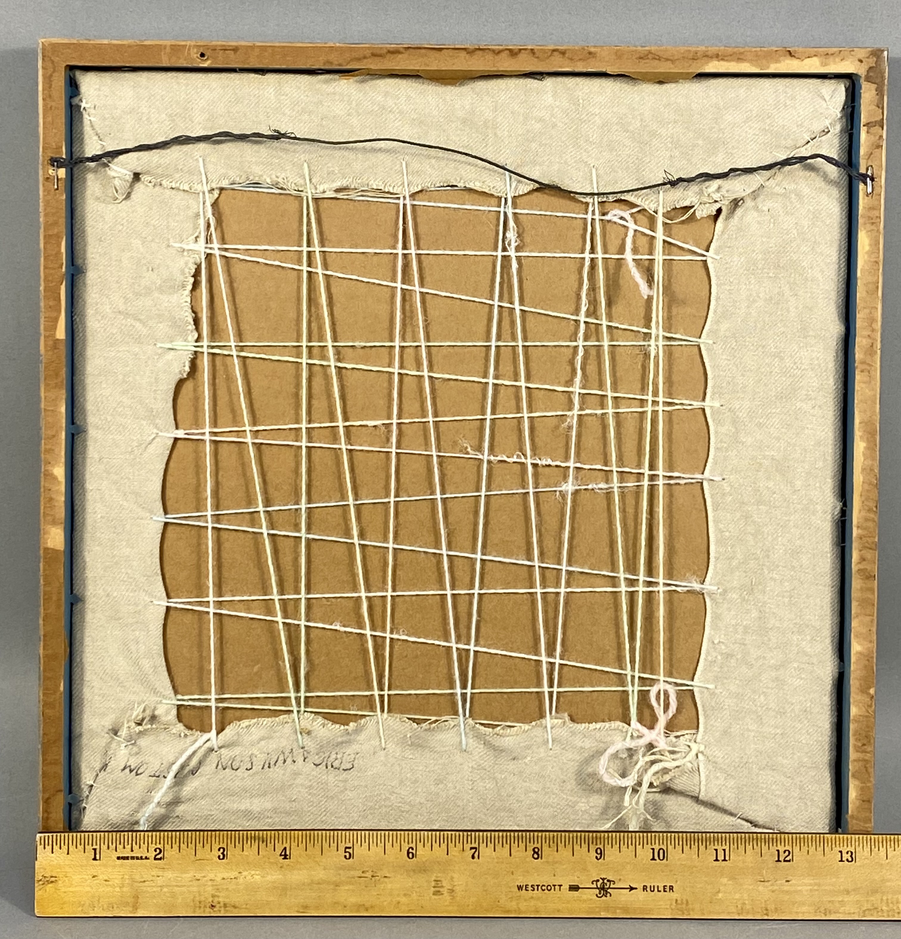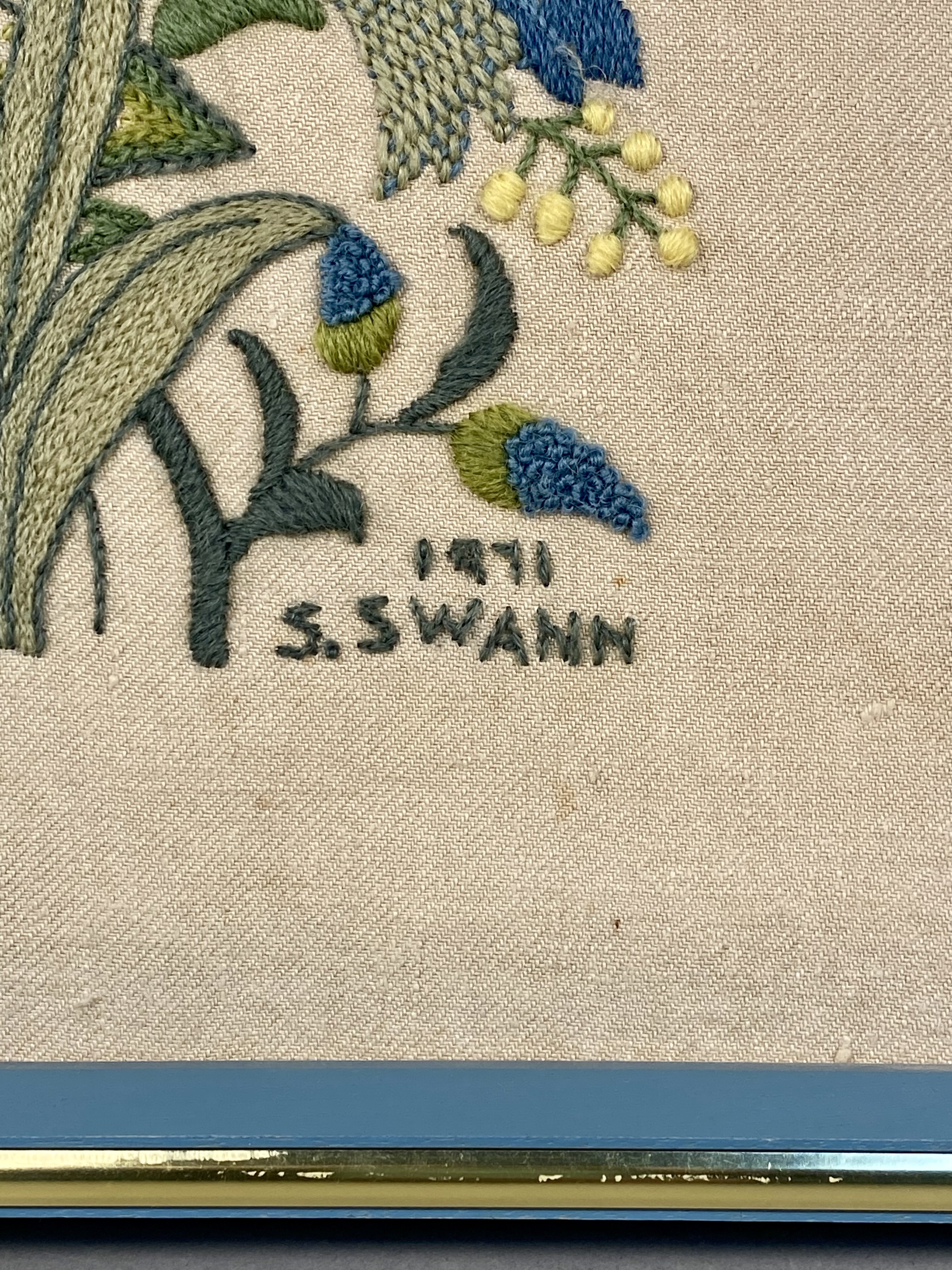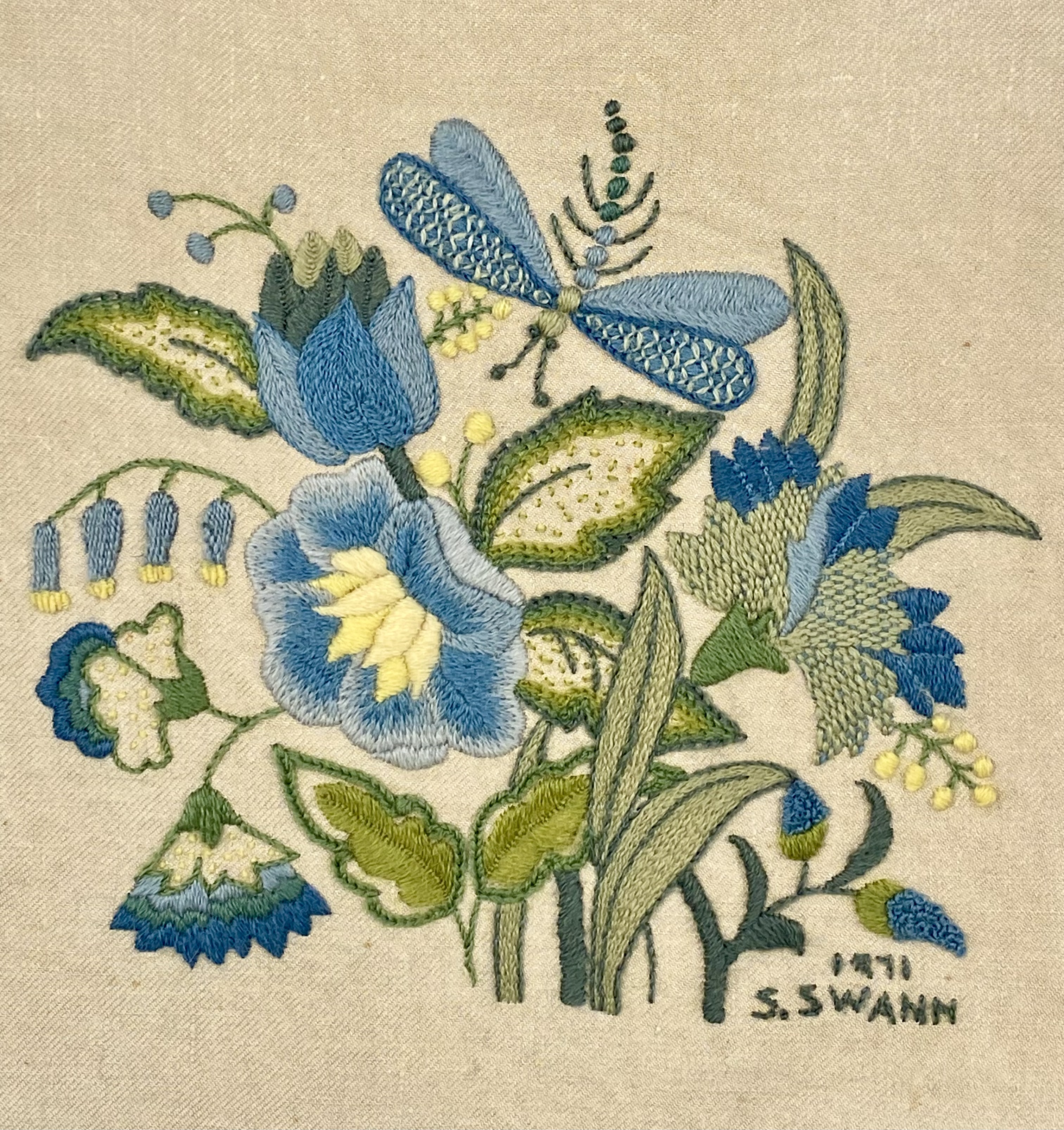 A framed crewel embroidery piece featuring a stylized floral arrangement with a central blue dragonfly. The work is executed in wool thread on a light-colored linen or cotton-blend ground fabric. The composition includes various blossoms in shades of blue, green, and yellow, utilizing needlework techniques such as satin stitch, stem stitch, and French knots. The lower right corner is embroidered with the signature S. SWANN and the date 1971. The reverse of the fabric bears a partially visible stamp reading ERICA WILSON WOOL, identifying the design and materials as originating from an Erica Wilson needlework kit. The textile is hand-laced over a cardboard support for tension and is housed in a blue-painted wooden frame with a metallic inner lip and a wire hanger. Frame: 13 1/2 inches x 13 1/2 inches. The piece is in fair to good vintage condition. There is visible foxing and brown staining on the background fabric, most notably a circular spot in the lower-left corner and smaller scattered specks. The colors of the wool embroidery remain bright. The blue-painted wooden frame shows minor scuffing and paint loss along the edges.