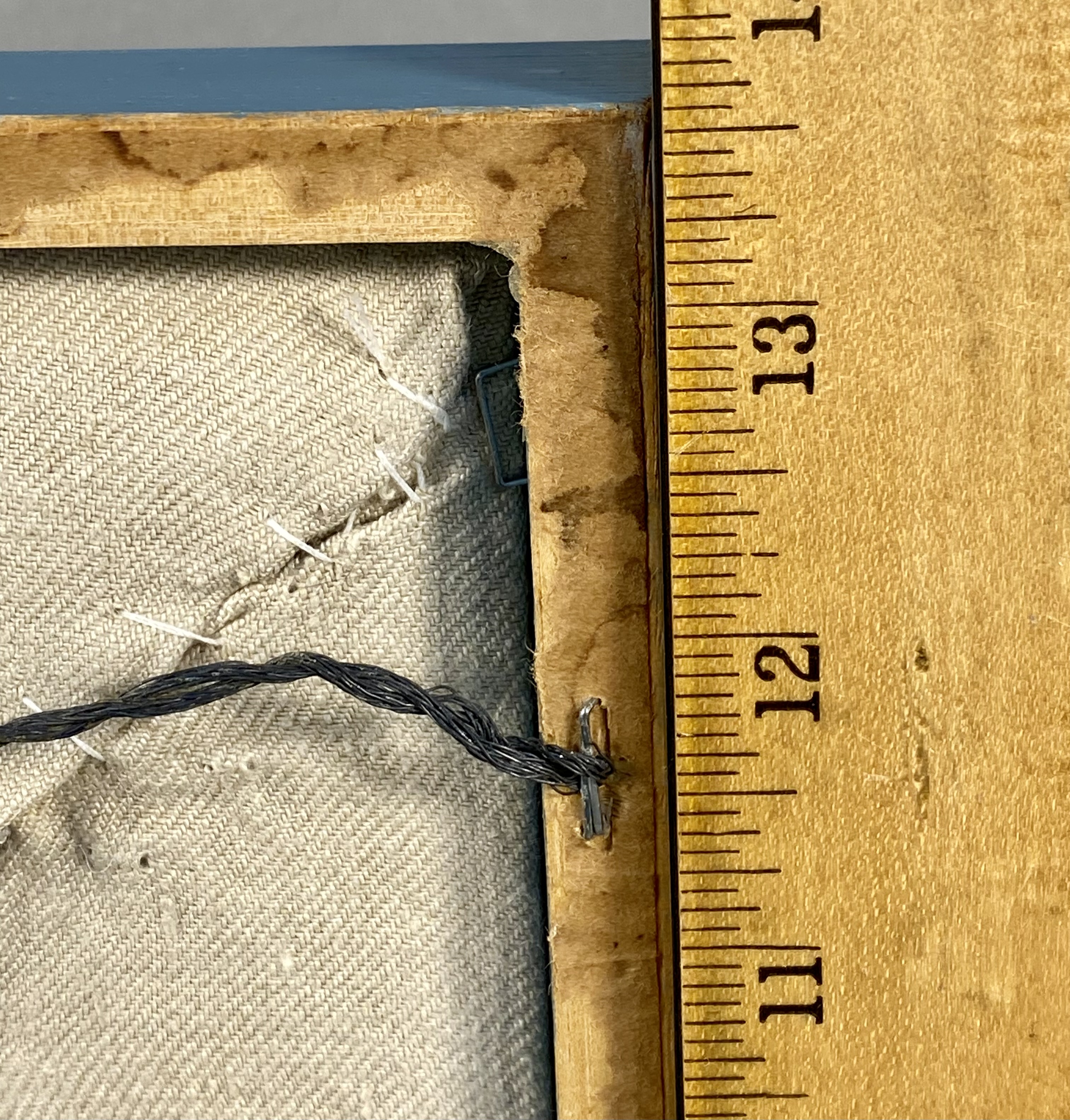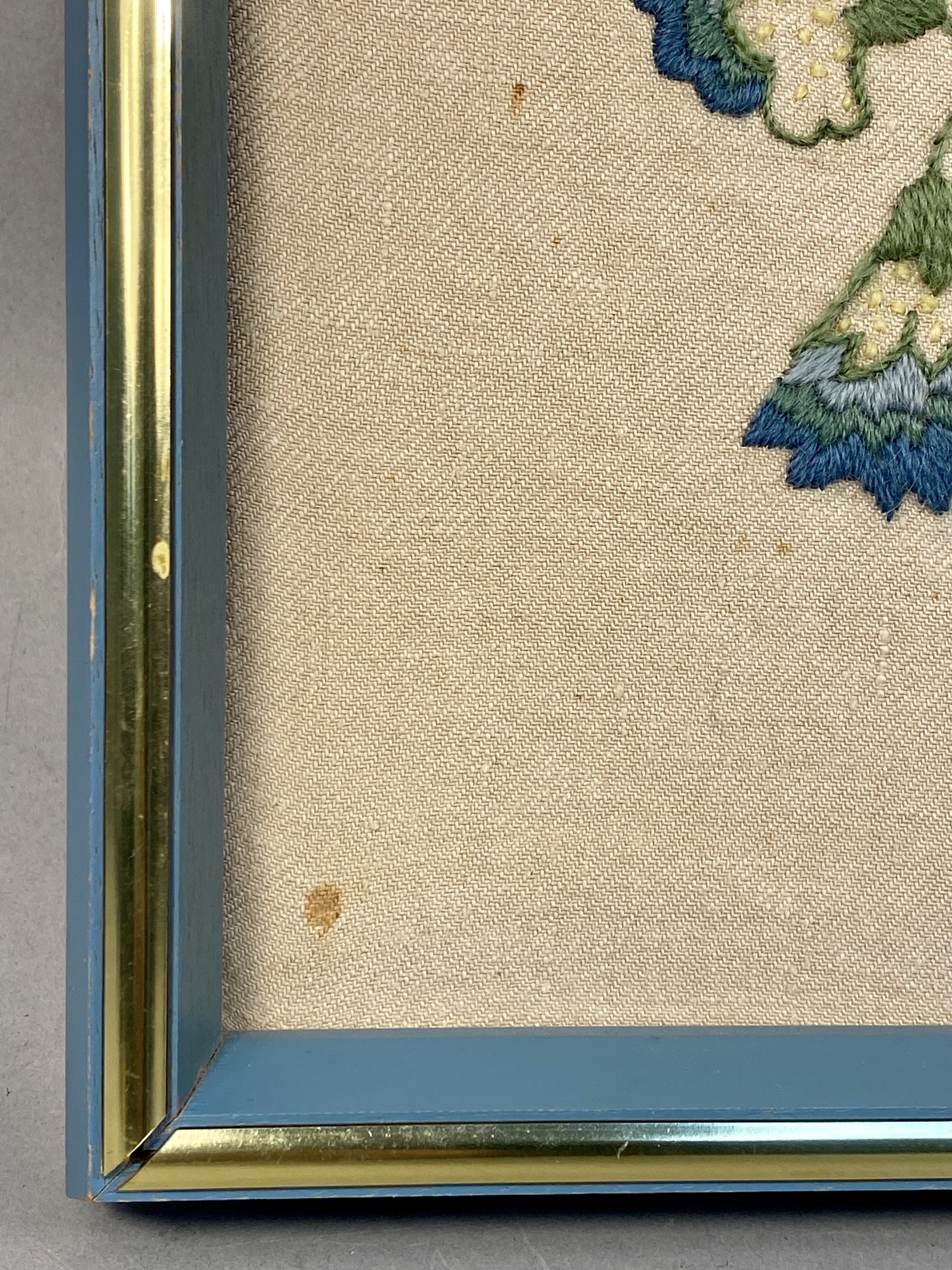 The piece is in fair to good vintage condition. There is visible foxing and brown staining on the background fabric, most notably a circular spot in the lower-left corner and smaller scattered specks. The colors of the wool embroidery remain bright. The blue-painted wooden frame shows minor scuffing and paint loss along the edges.