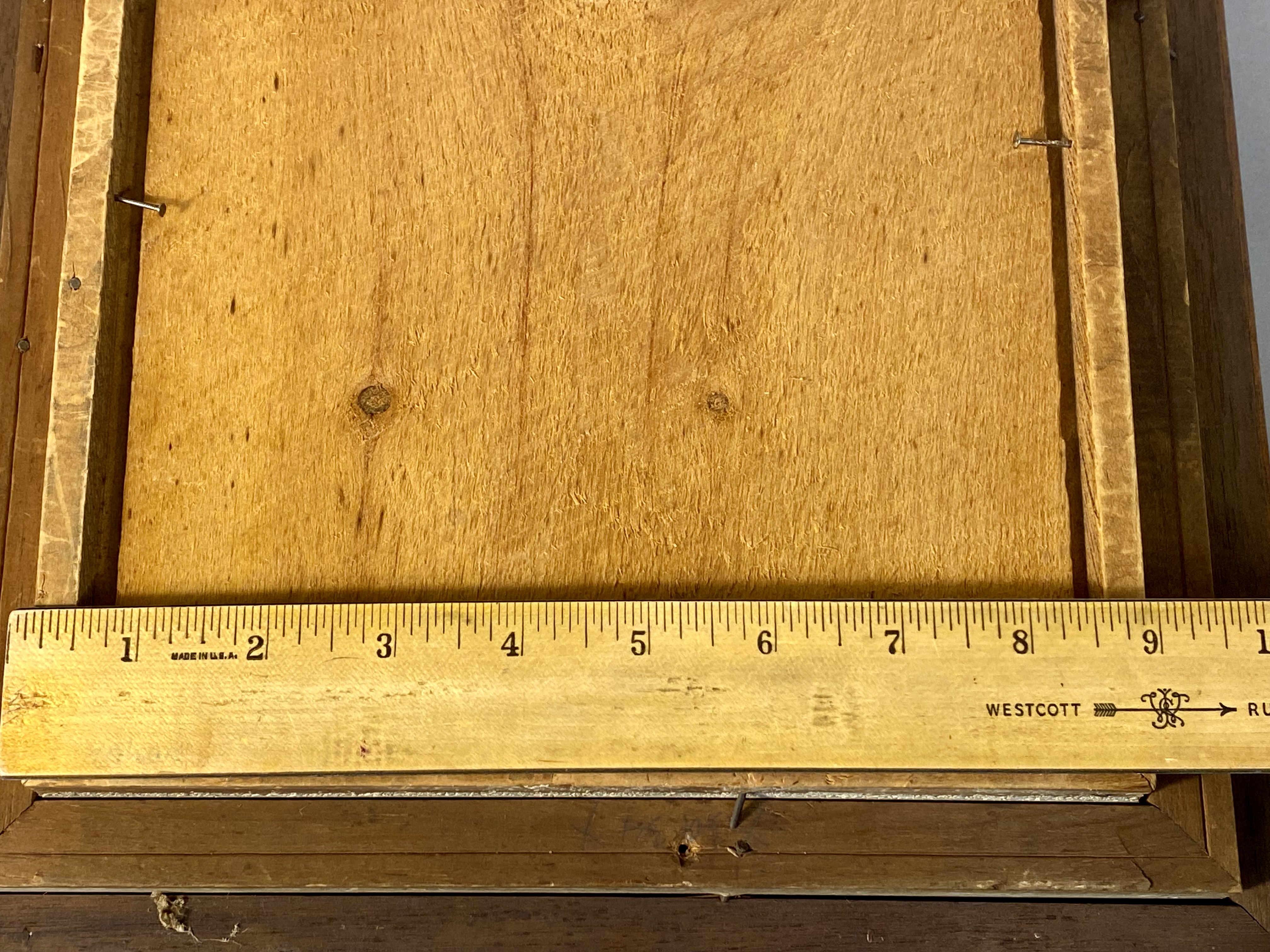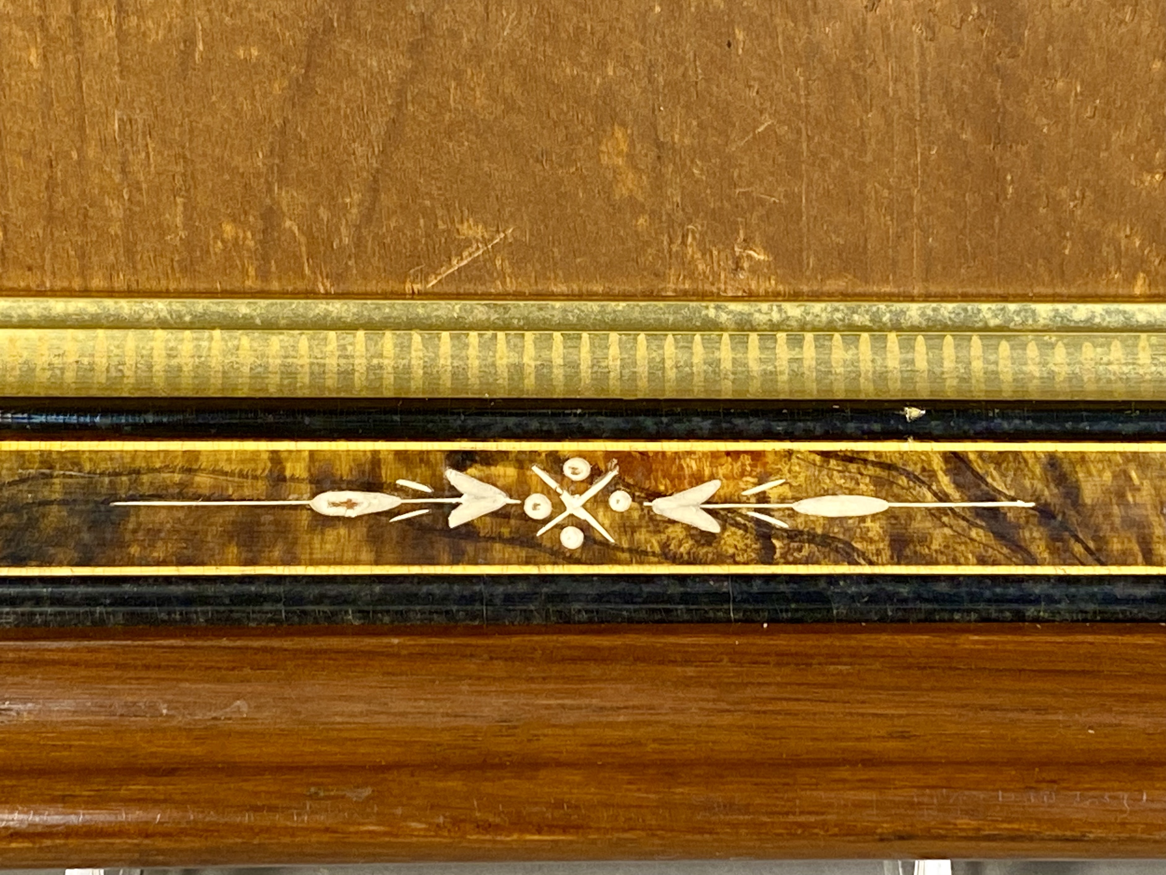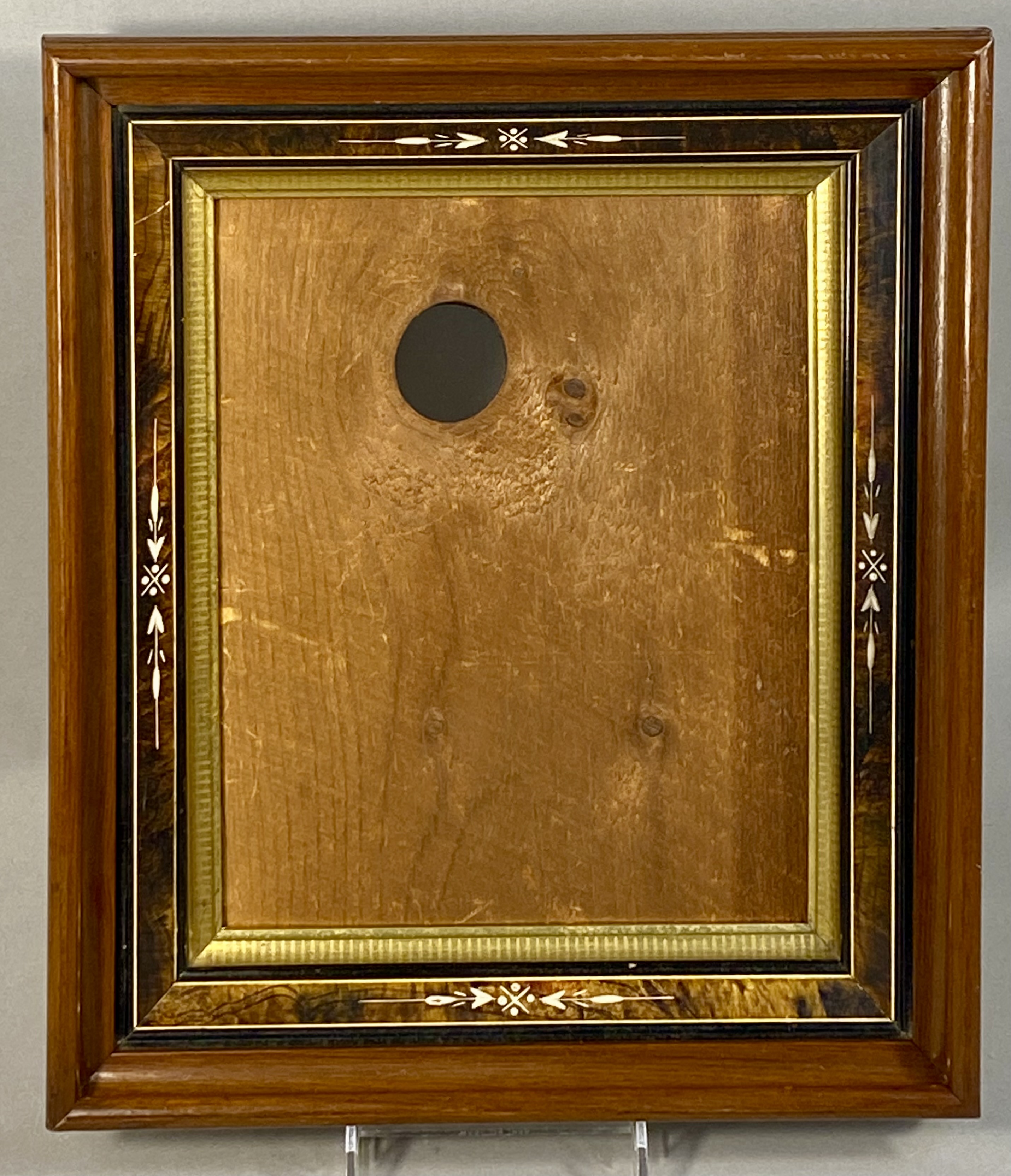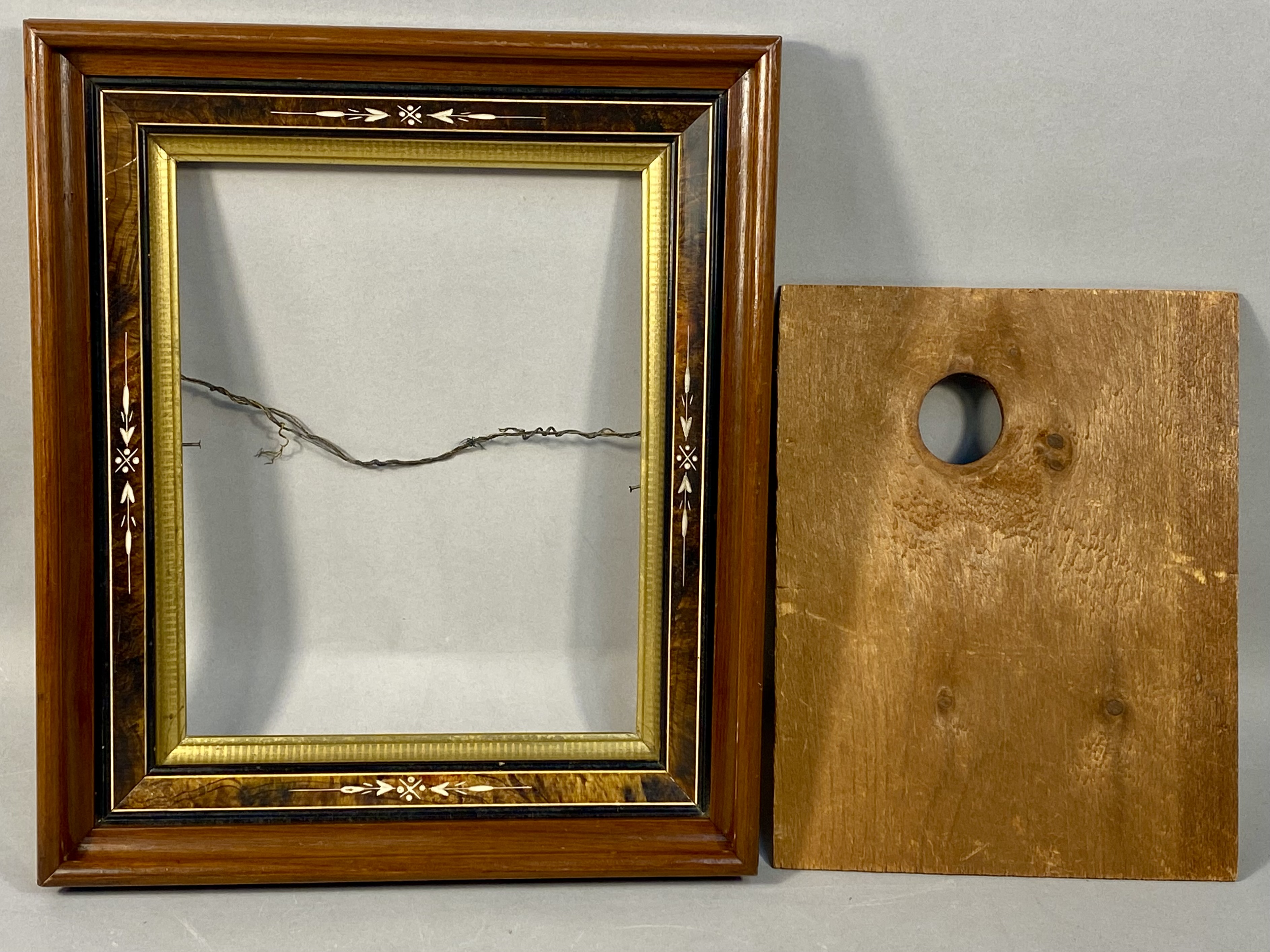 This lot features a Victorian-style wooden picture frame with a multi-tiered construction. The frame consists of a polished wood outer border and a wide central section finished in a burl-effect veneer. This section is embellished with bone or light-wood marquetry inlays in a foliate and geometric pattern, featuring stylized arrows and dots. This specific inlay motif is characteristic of decorative elements found on Carrom-Archarena Company game boards from the late 19th to early 20th century. The interior of the frame is finished with a gilded, fluted liner. Contained within the frame is a rectangular wooden backboard with a circular cutout. The reverse side is constructed with a rough-hewn wooden backboard held by small nails and includes a twisted wire hanger. No manufacturer marks or signatures are present. Frame: 12 inches by 9.5 inches Internal board: 10.5 inches by 8 inches. The item shows age-appropriate wear throughout. The frame shows minor scuffs and light wear to the polished finish and burl veneer. The gilded inner liner shows minor surface dulling and small areas of gilding loss. The reverse components, including the backboard and wire hanger, are intact and functional.