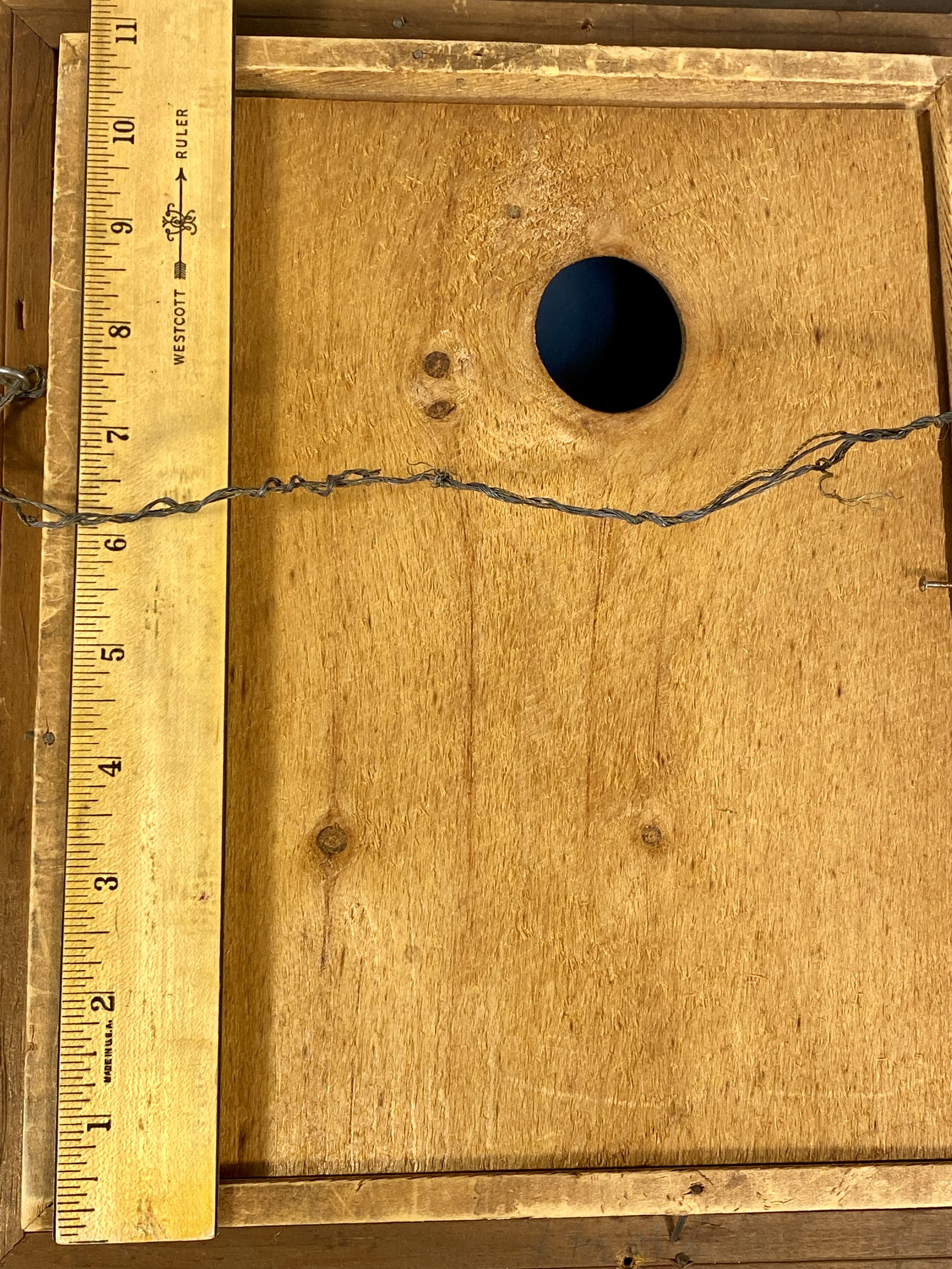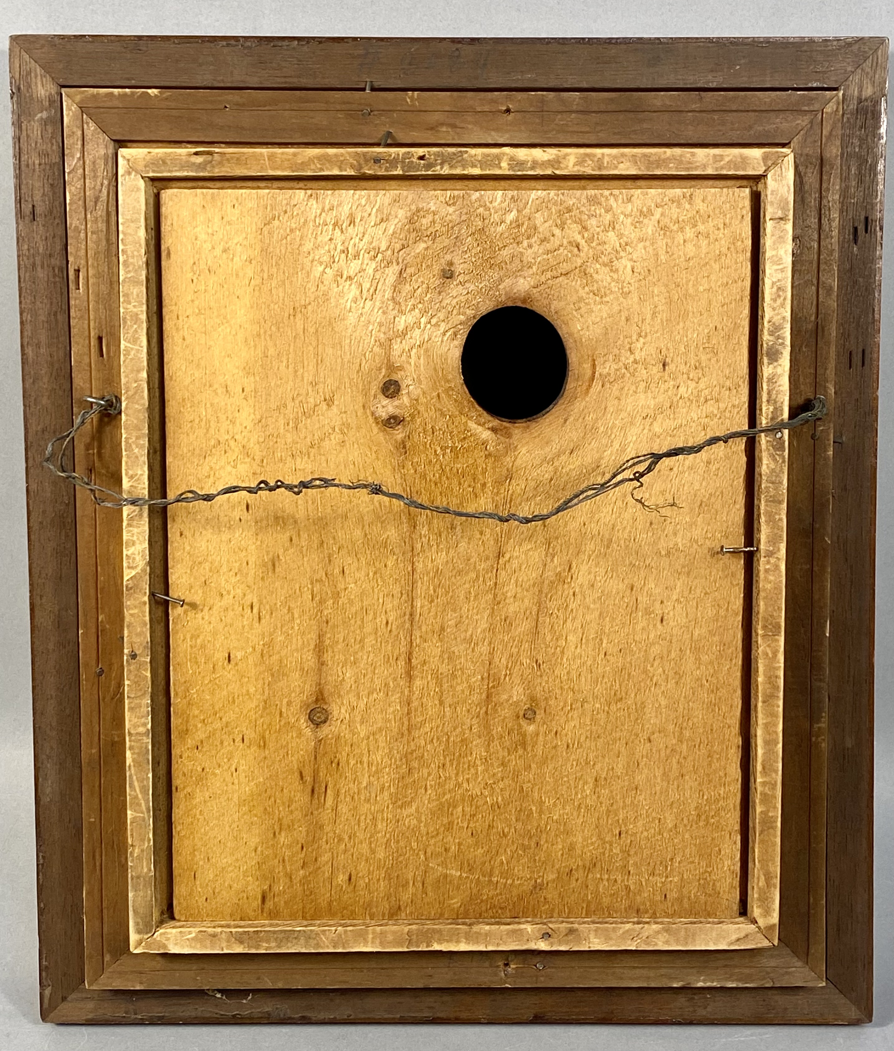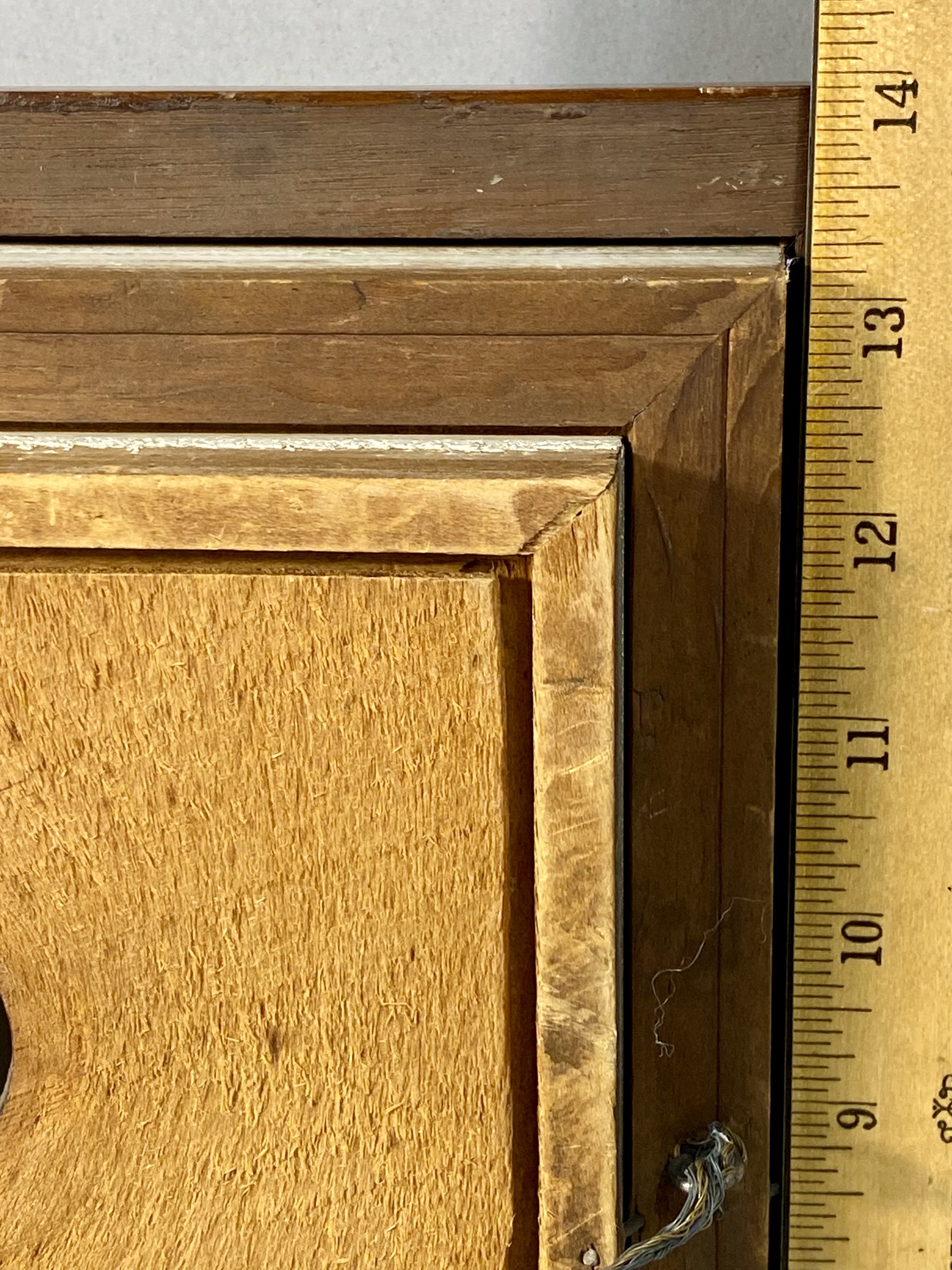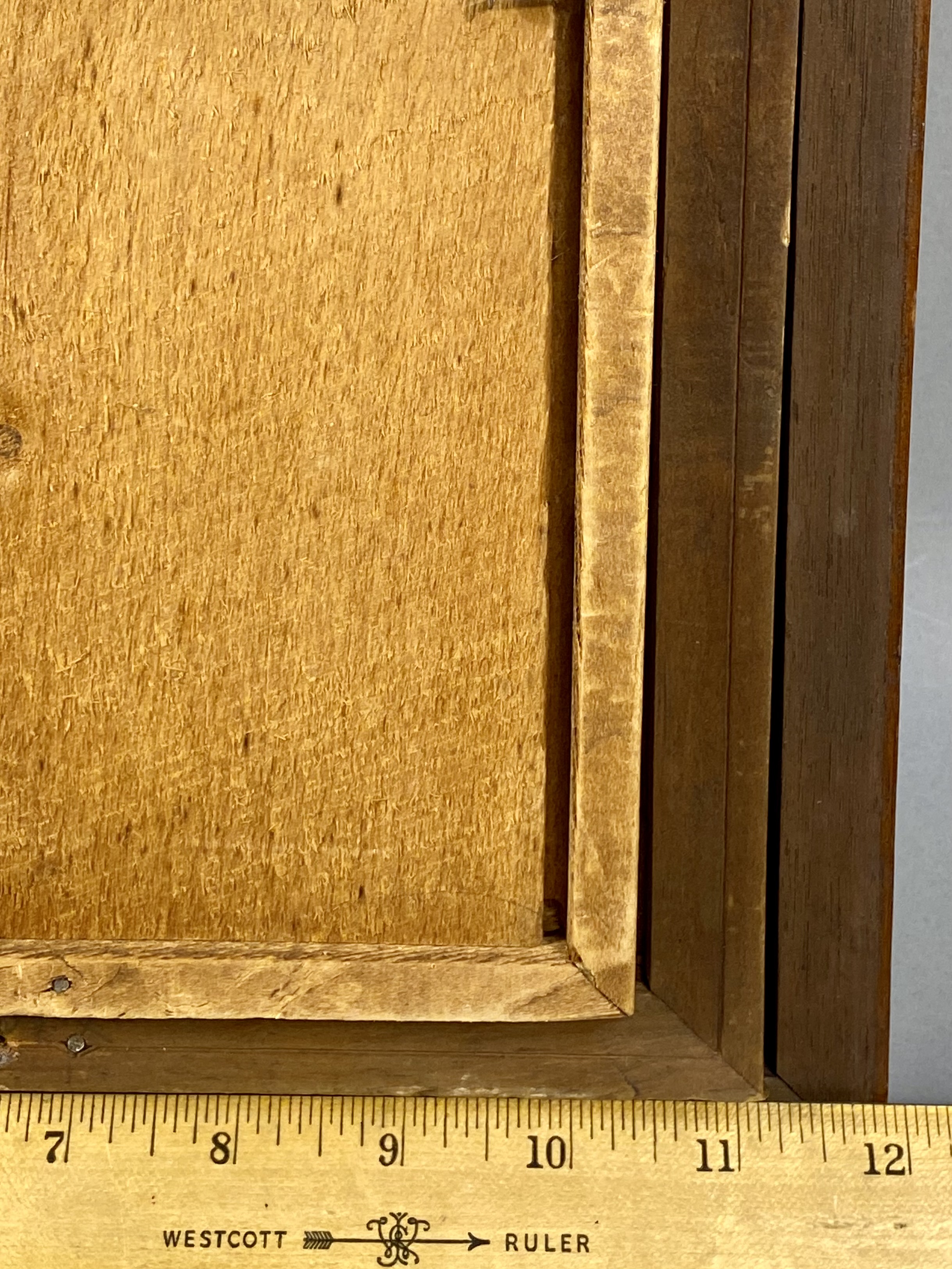 This lot features a Victorian-style wooden picture frame with a multi-tiered construction. The frame consists of a polished wood outer border and a wide central section finished in a burl-effect veneer. This section is embellished with bone or light-wood marquetry inlays in a foliate and geometric pattern, featuring stylized arrows and dots. This specific inlay motif is characteristic of decorative elements found on Carrom-Archarena Company game boards from the late 19th to early 20th century. The interior of the frame is finished with a gilded, fluted liner. Contained within the frame is a rectangular wooden backboard with a circular cutout. The reverse side is constructed with a rough-hewn wooden backboard held by small nails and includes a twisted wire hanger. No manufacturer marks or signatures are present. Frame: 12 inches by 9.5 inches Internal board: 10.5 inches by 8 inches. The item shows age-appropriate wear throughout. The frame shows minor scuffs and light wear to the polished finish and burl veneer. The gilded inner liner shows minor surface dulling and small areas of gilding loss. The reverse components, including the backboard and wire hanger, are intact and functional.