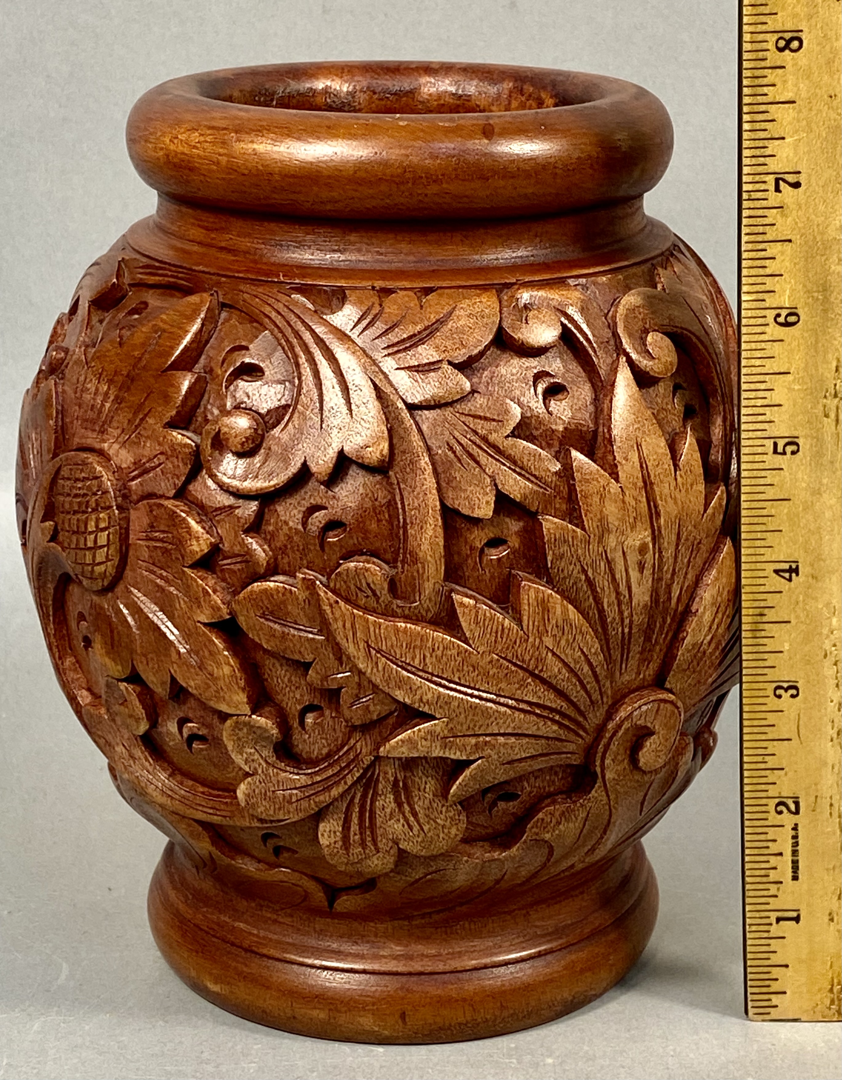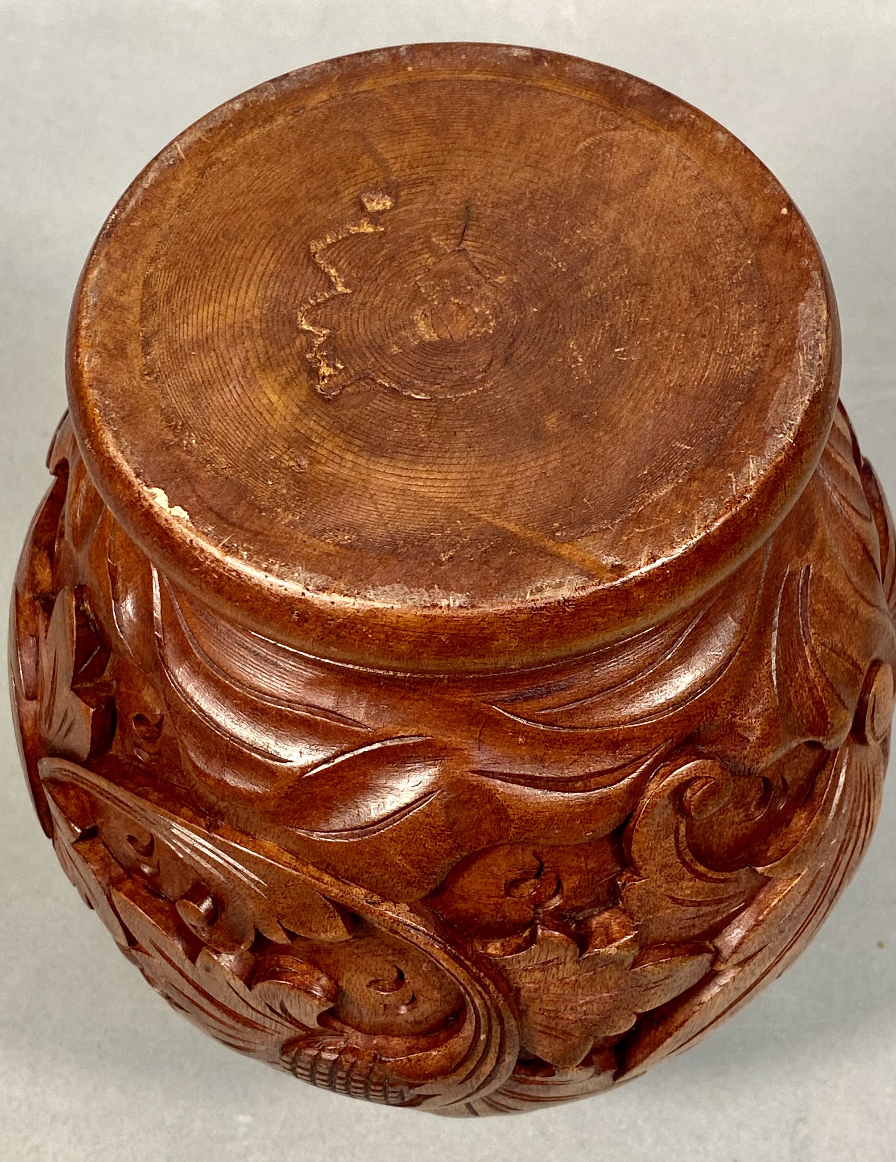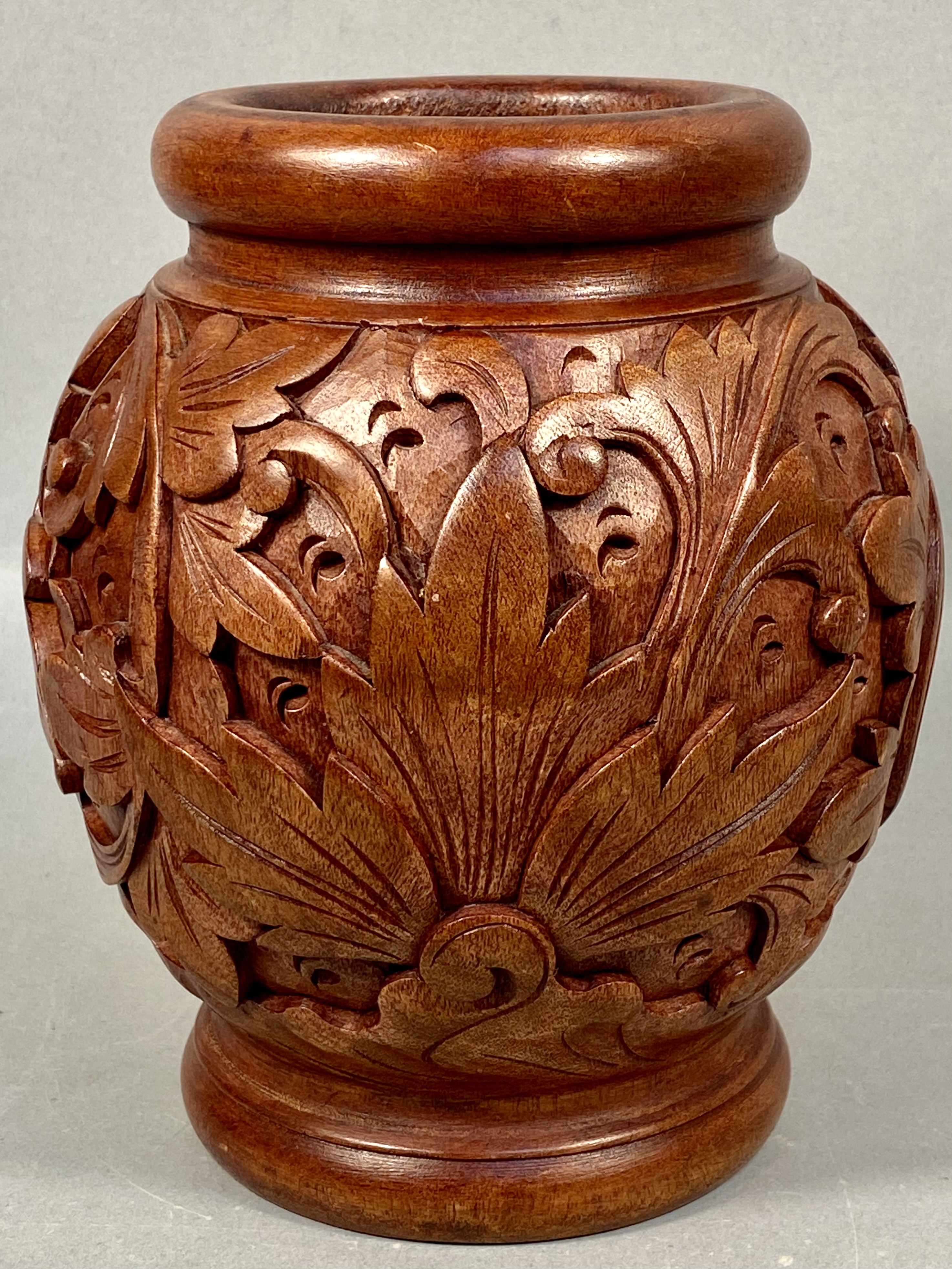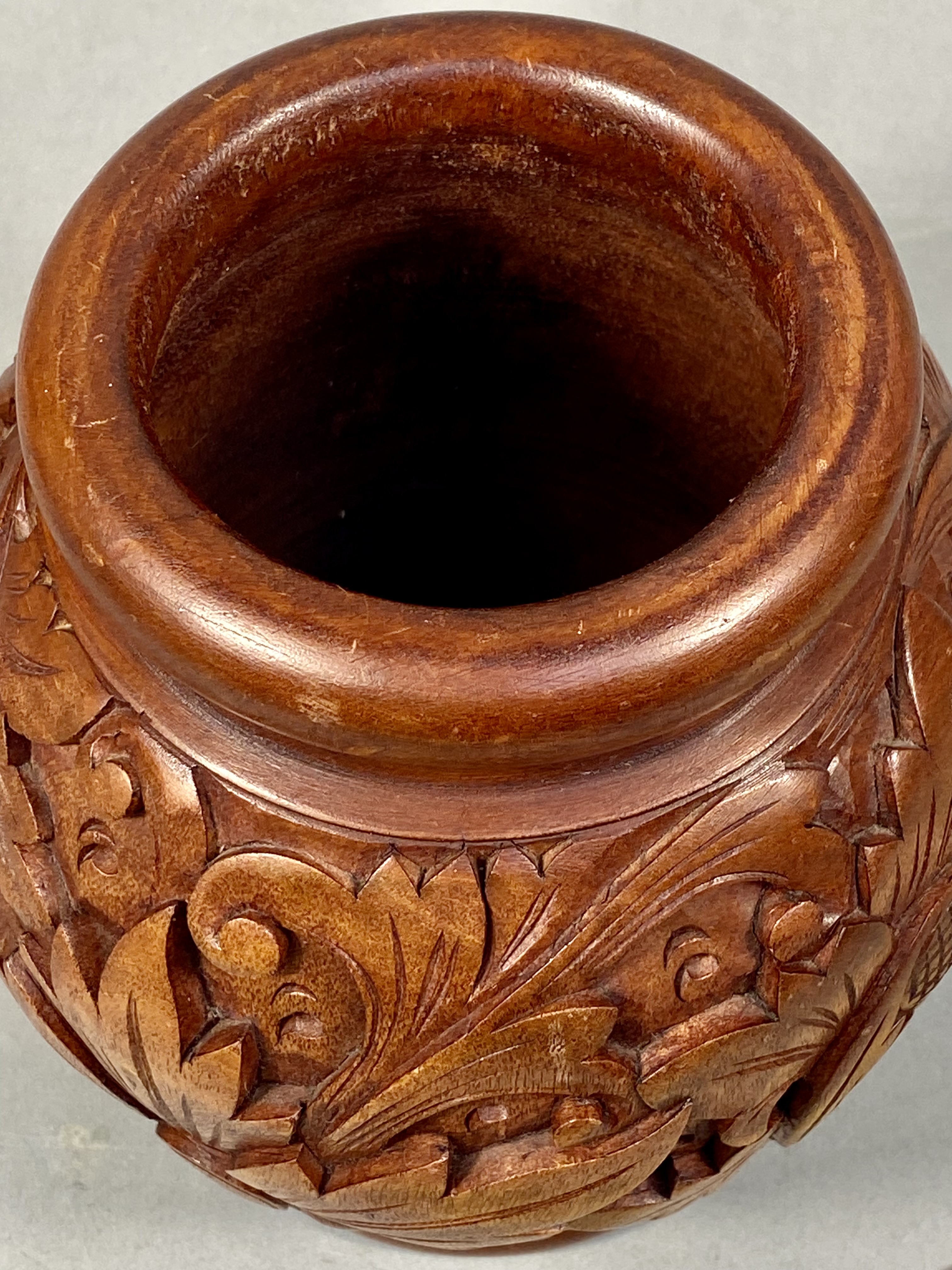A hand-carved wooden vase of globular form featuring a thick rolled rim and a stepped flared foot. The body is decorated with high-relief carvings of scrolling acanthus-style foliage and various botanical blossoms, including a prominent flower with a cross-hatched center. The piece is finished in a rich brown stain that highlights the natural wood grain. The base reveals circular lathe marks and a shallow, irregular indentation. No maker marks or signatures are present. Height: 7.5 inches. The vase is in good overall condition with minor surface wear and small nicks consistent with age and handling. No structural cracks or repairs are observed.