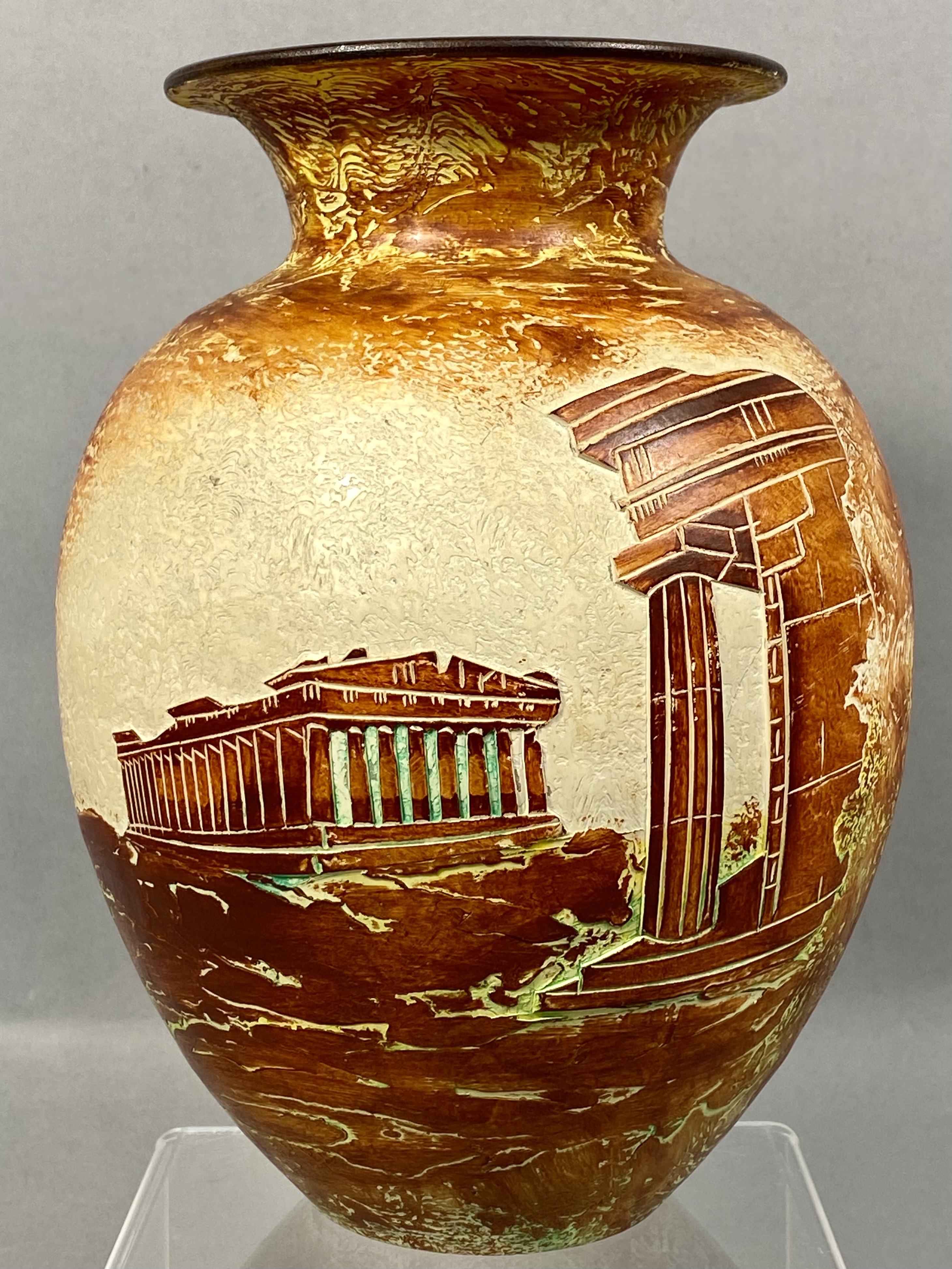 An earthenware art pottery vase of ovoid form featuring a short neck and a wide, flared rim. The interior is finished with a dark, high-gloss glaze. The exterior surface is heavily textured with an impasto-like application in earth tones of ochre, brown, and cream. The decorative program consists of incised and hand-painted architectural scenes in a classical Greek style, including a temple resembling the Parthenon and a solitary fluted column. The architectural elements are accented with green highlights. The base is marked with handwritten characters in dark ink, including the Greek letter phi followed by the numerals 500 and a circular mark. Height: 7.5 inches The vase is in overall good condition. Minor surface wear is present, including small nicks to the dark glaze at the rim and small losses to the thick, textured glaze where the body meets the base. No significant cracks or evidence of professional repair were observed.