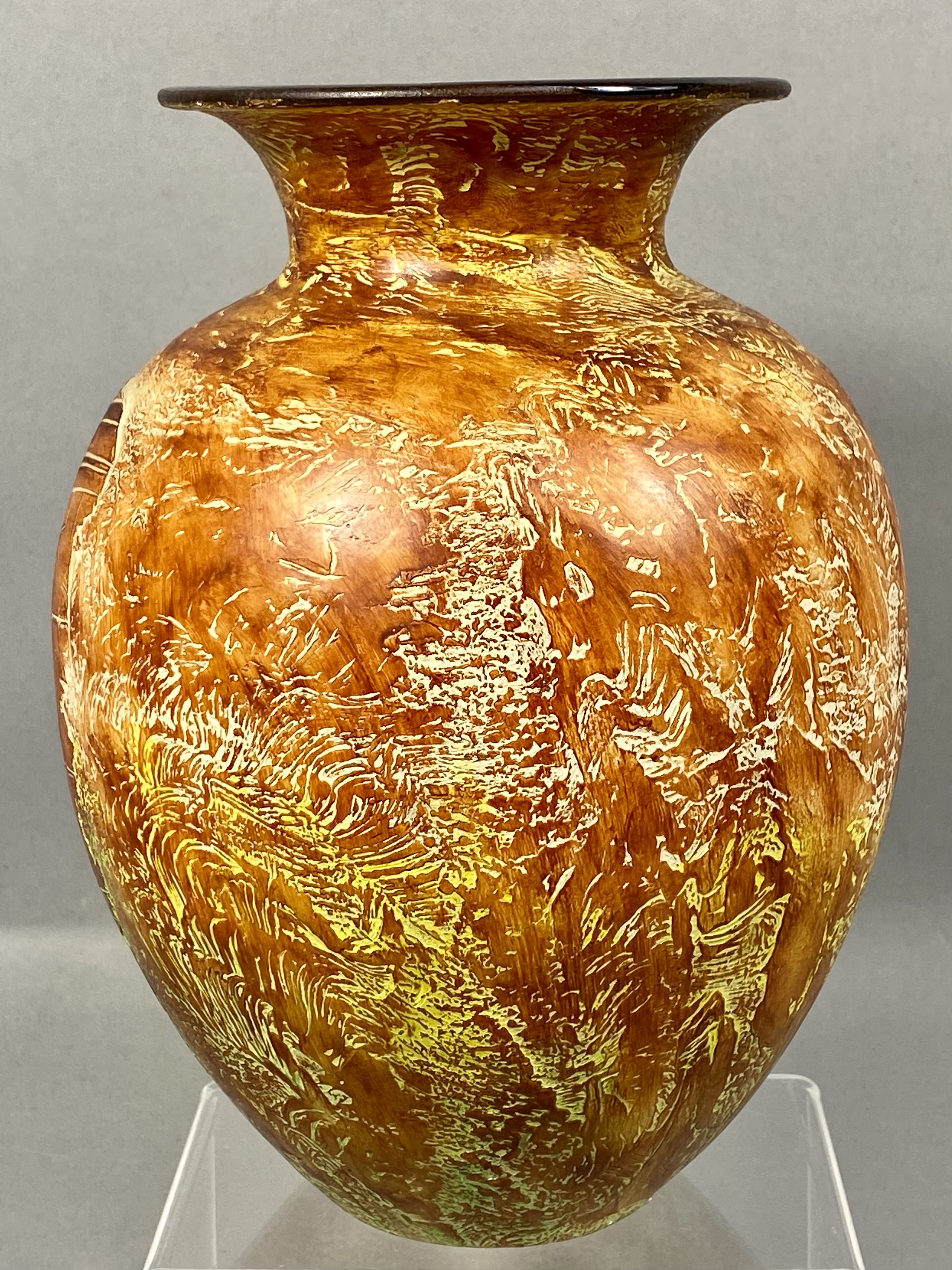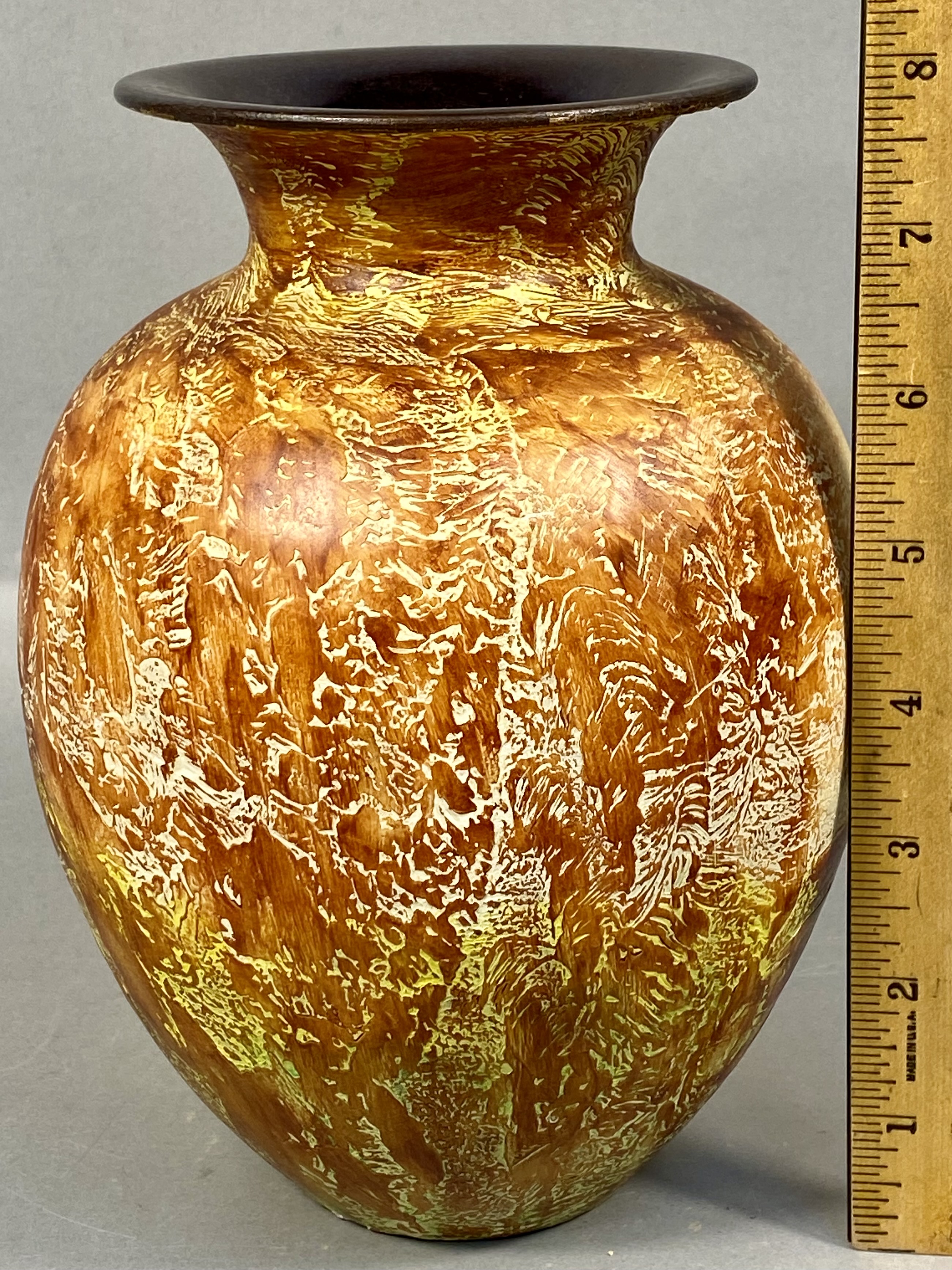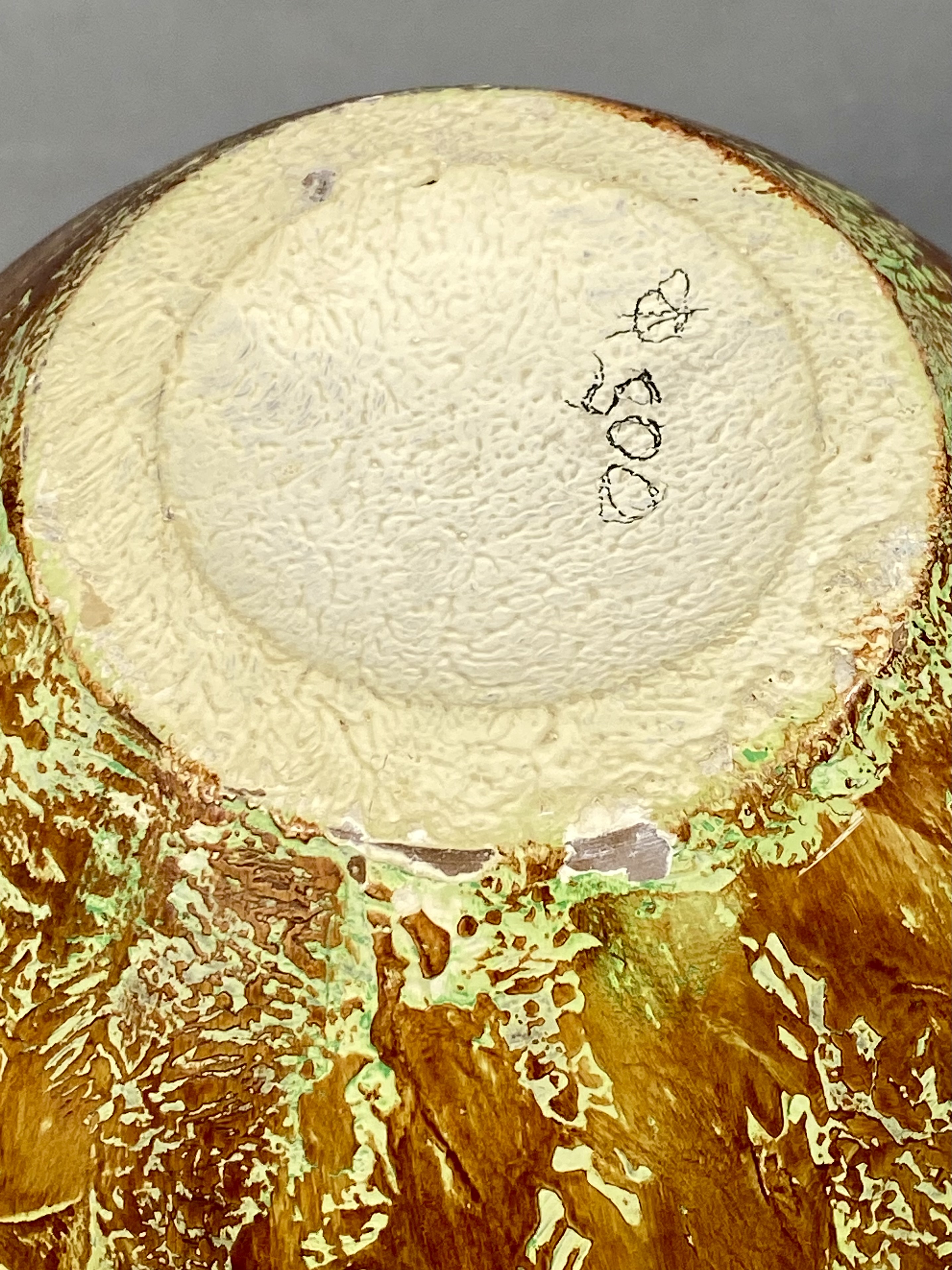 The vase is in overall good condition. Minor surface wear is present, including small nicks to the dark glaze at the rim and small losses to the thick, textured glaze where the body meets the base. No significant cracks or evidence of professional repair were observed.