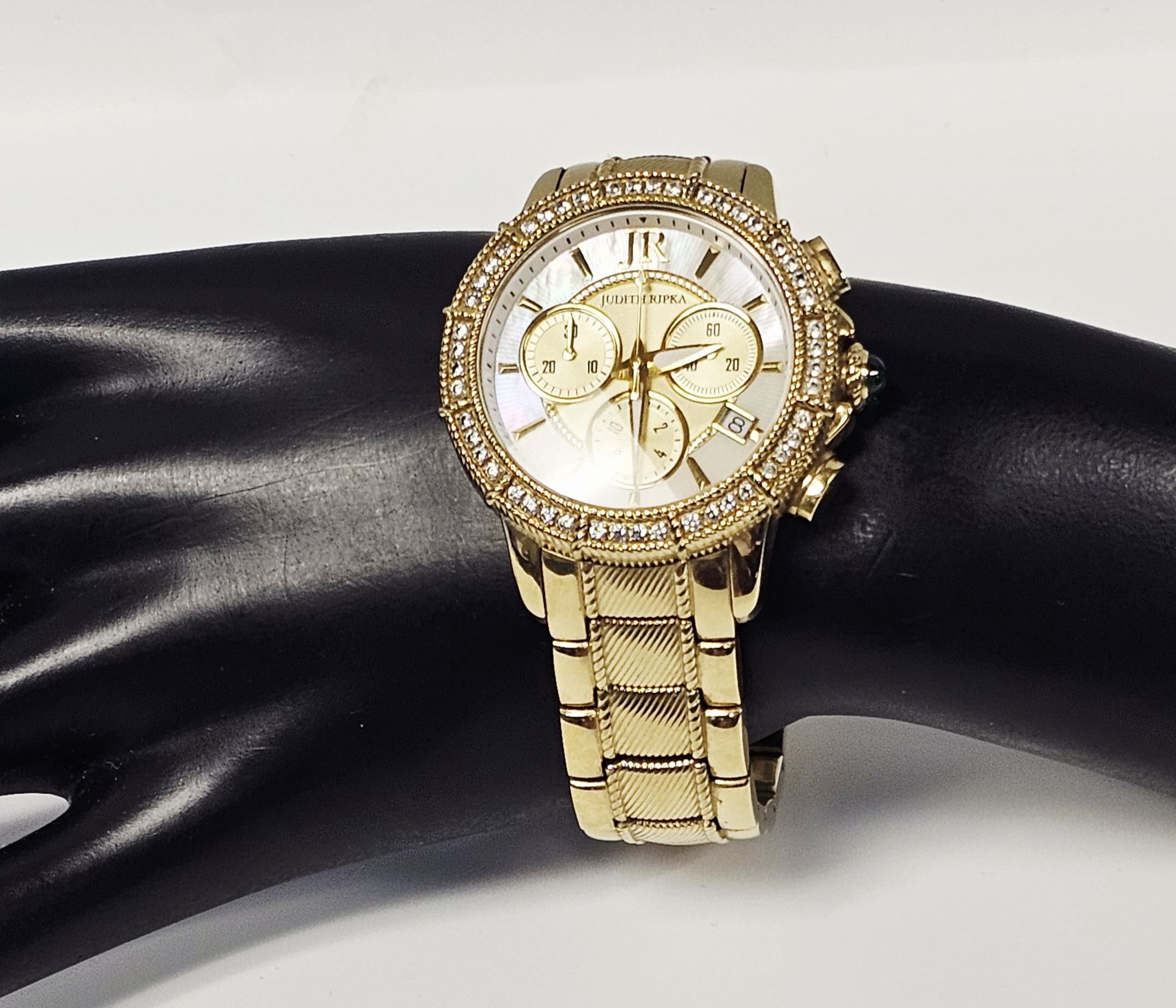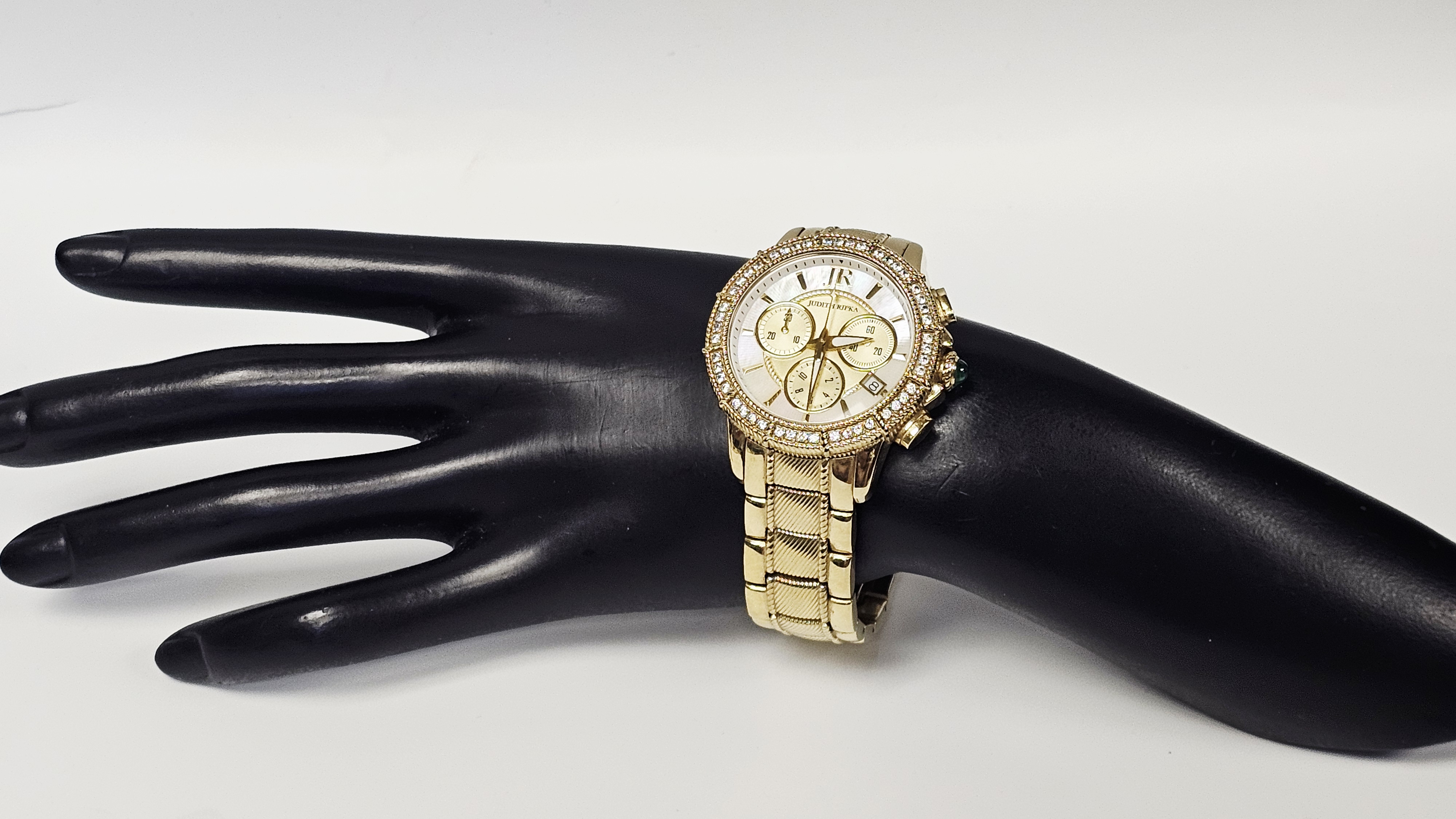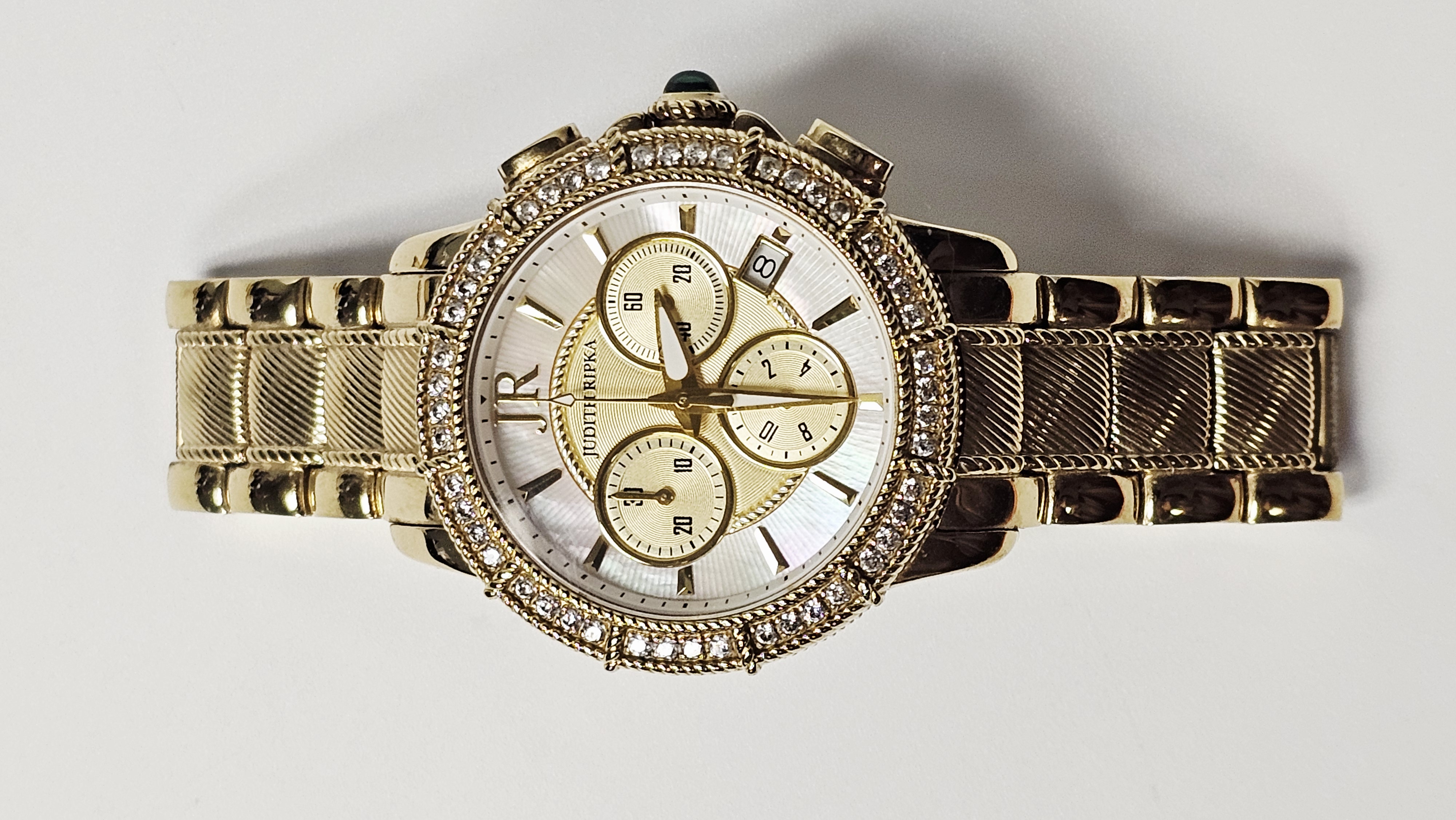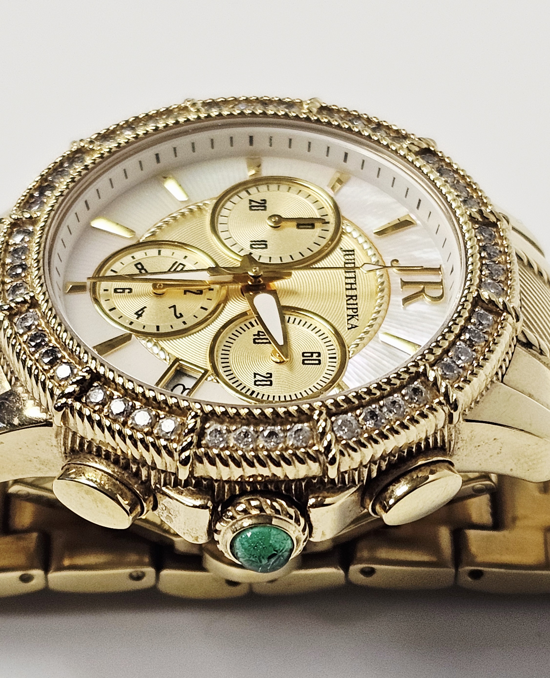 A Judith Ripka chronograph wristwatch featuring a gold-tone stainless steel case and integrated bracelet. The watch is designed with a bezel set with two rows of clear faceted Diamonique stones and a crown set with a green cabochon-cut stone. The dial consists of a mother-of-pearl outer ring and a textured gold-tone center, featuring three sub-dials and a date window positioned between the 4 and 5 o’clock markers. The dial is finished with applied gold-tone hour markers and a JR logo at the 12 o’clock position. The integrated bracelet features textured center links and a double deployment clasp. The case back is marked with the Judith Ripka name, a fleur-de-lis symbol, Swiss Parts Movement, Thailand, Stainless Steel, and 3 ATM Water Resistant. The movement is a Swiss parts quartz movement.