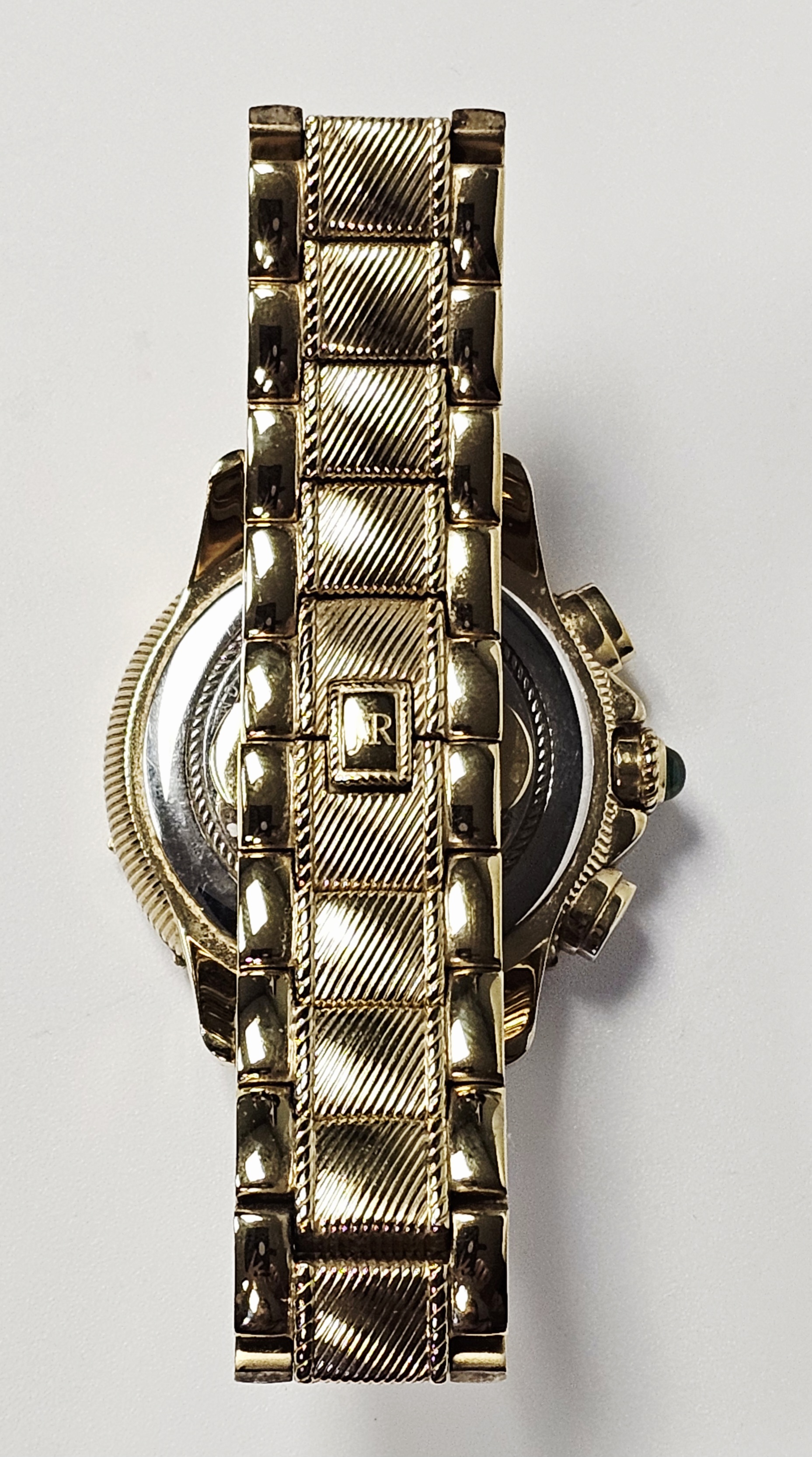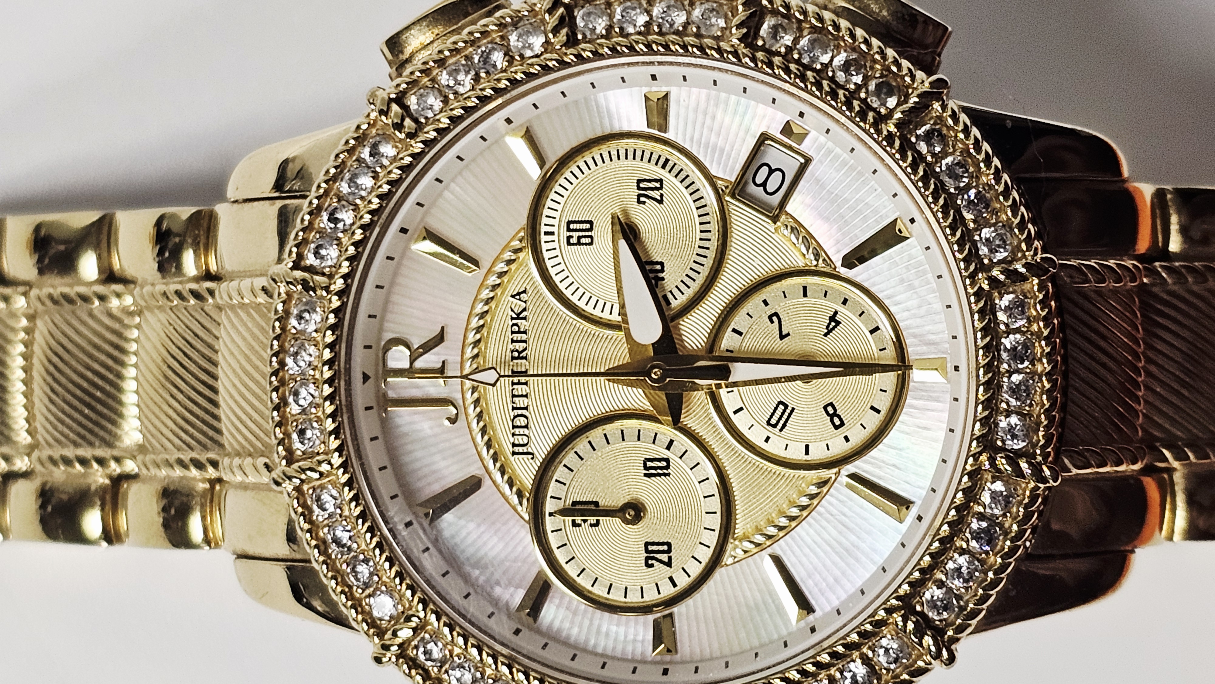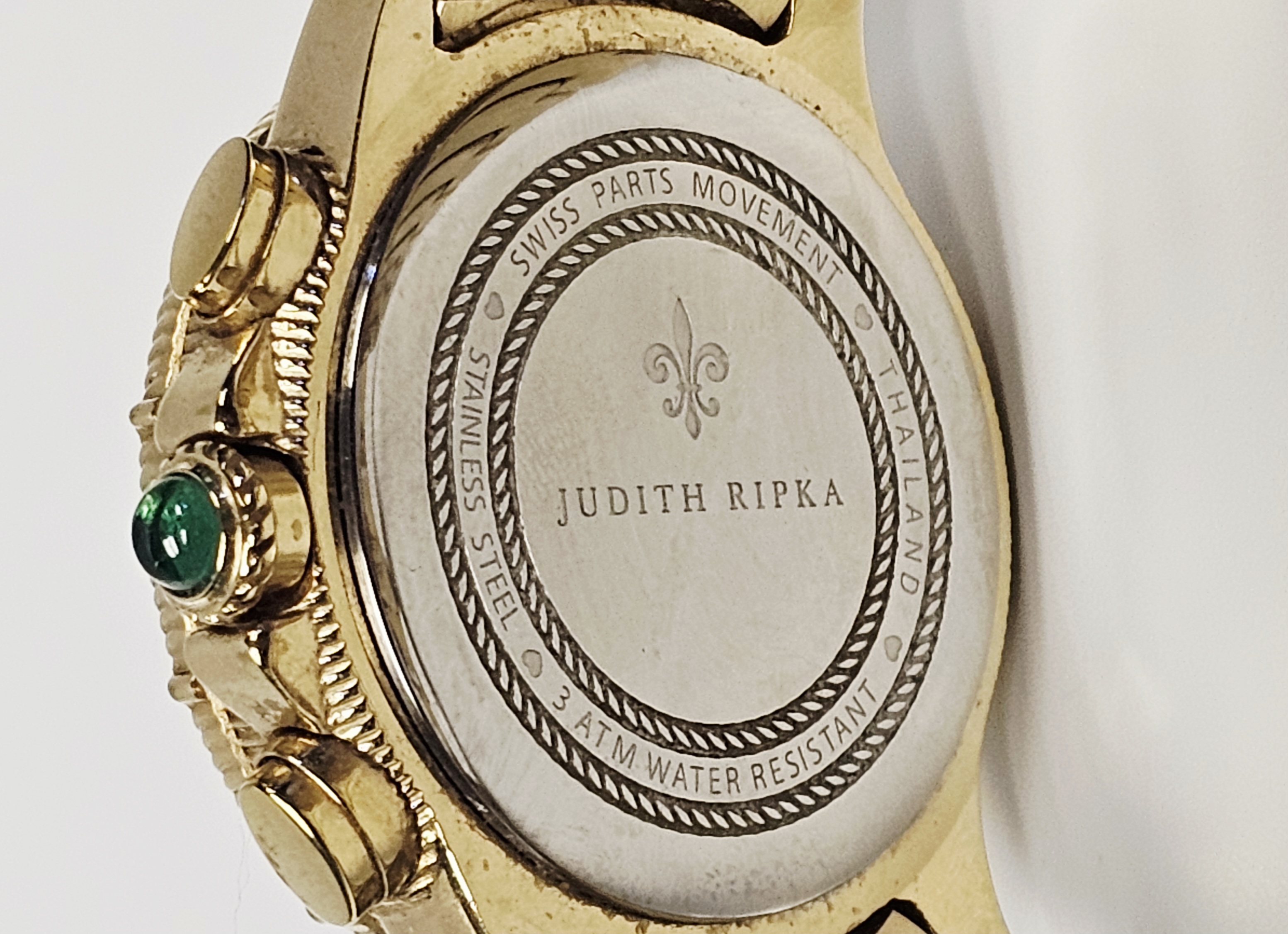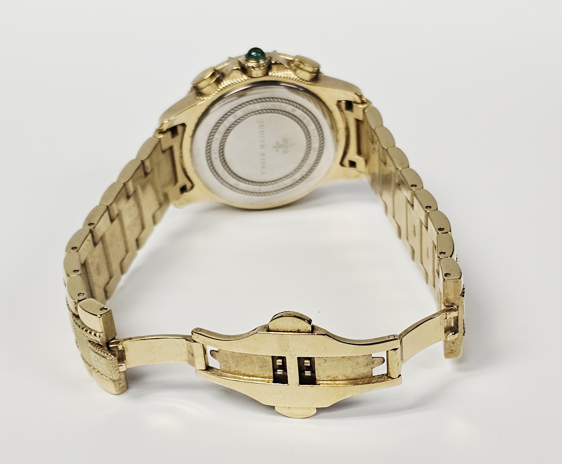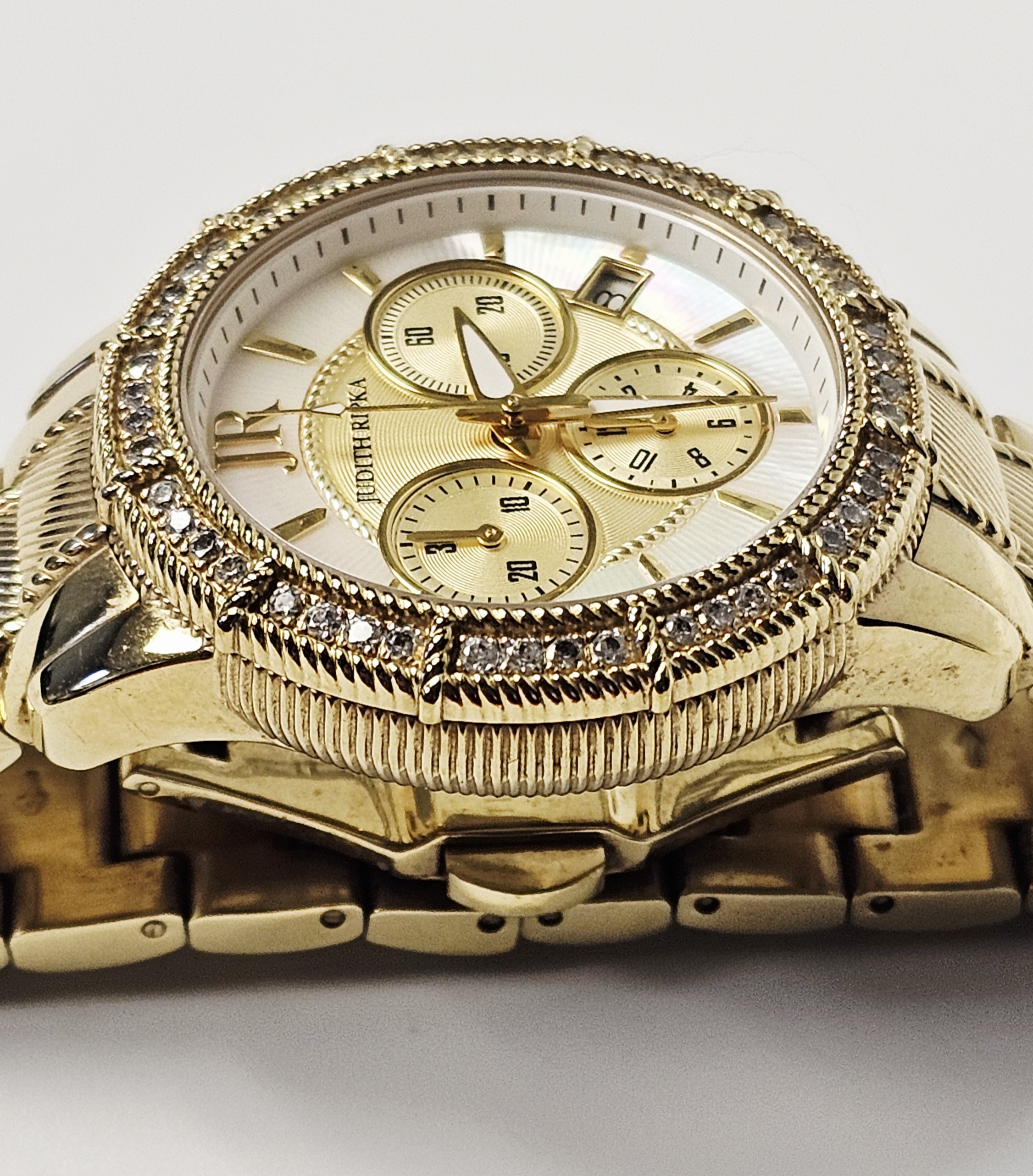 A Judith Ripka chronograph wristwatch featuring a gold-tone stainless steel case and integrated bracelet. The watch is designed with a bezel set with two rows of clear faceted Diamonique stones and a crown set with a green cabochon-cut stone. The dial consists of a mother-of-pearl outer ring and a textured gold-tone center, featuring three sub-dials and a date window positioned between the 4 and 5 o’clock markers. The dial is finished with applied gold-tone hour markers and a JR logo at the 12 o’clock position. The integrated bracelet features textured center links and a double deployment clasp. The case back is marked with the Judith Ripka name, a fleur-de-lis symbol, Swiss Parts Movement, Thailand, Stainless Steel, and 3 ATM Water Resistant. The movement is a Swiss parts quartz movement.