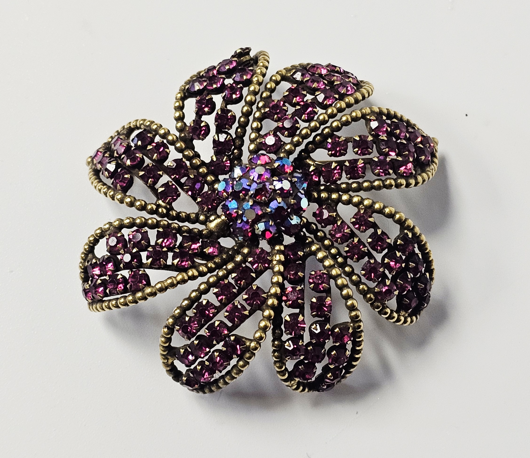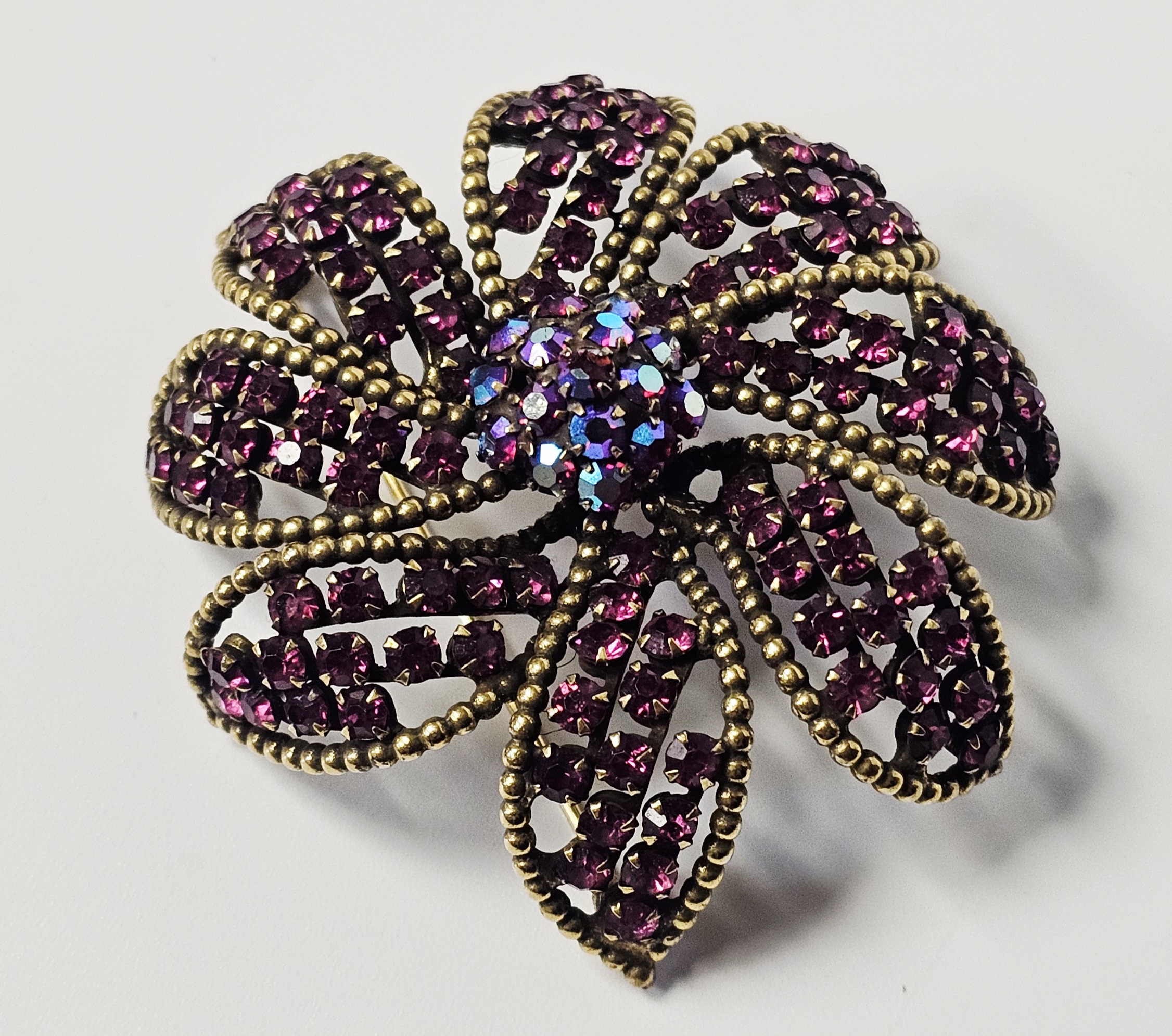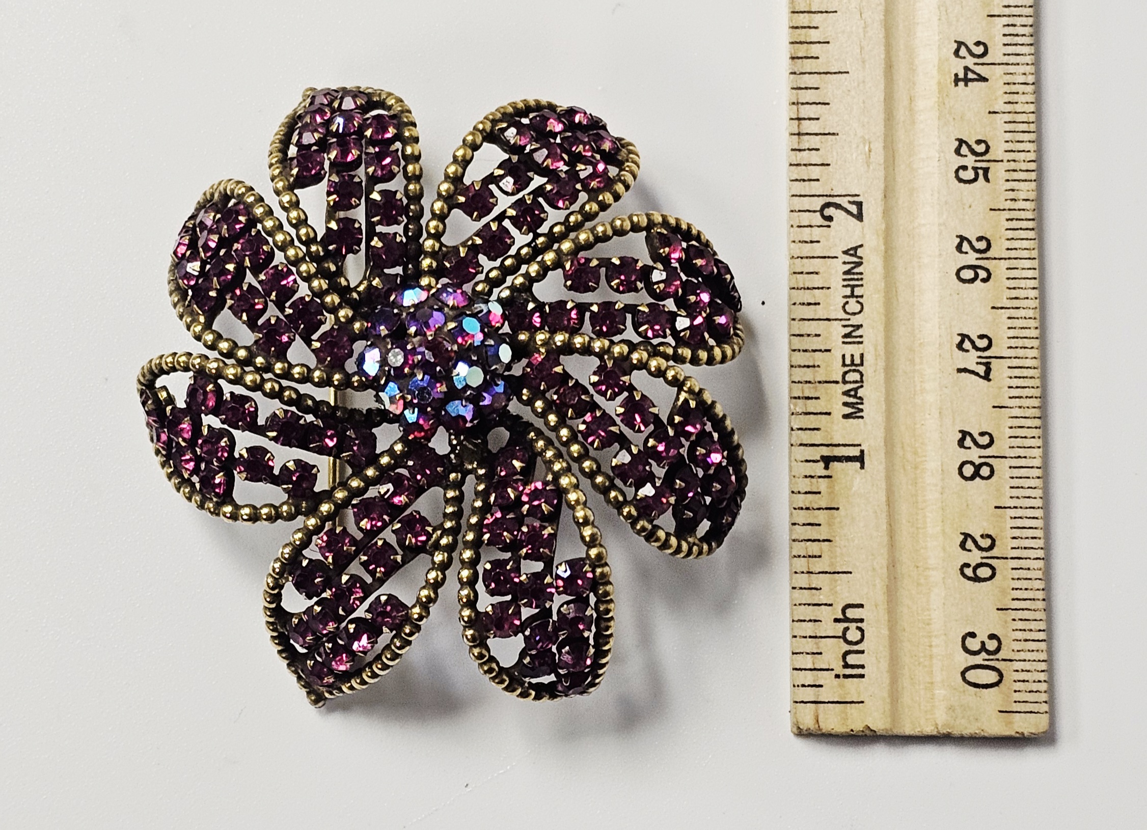 The brooch is in good vintage condition with minor surface wear and oxidation to the gold-tone finish consistent with age. One small amethyst-colored rhinestone is missing from the outer tip of one petal. The remaining stones are present and secure. The pin mechanism is functional.