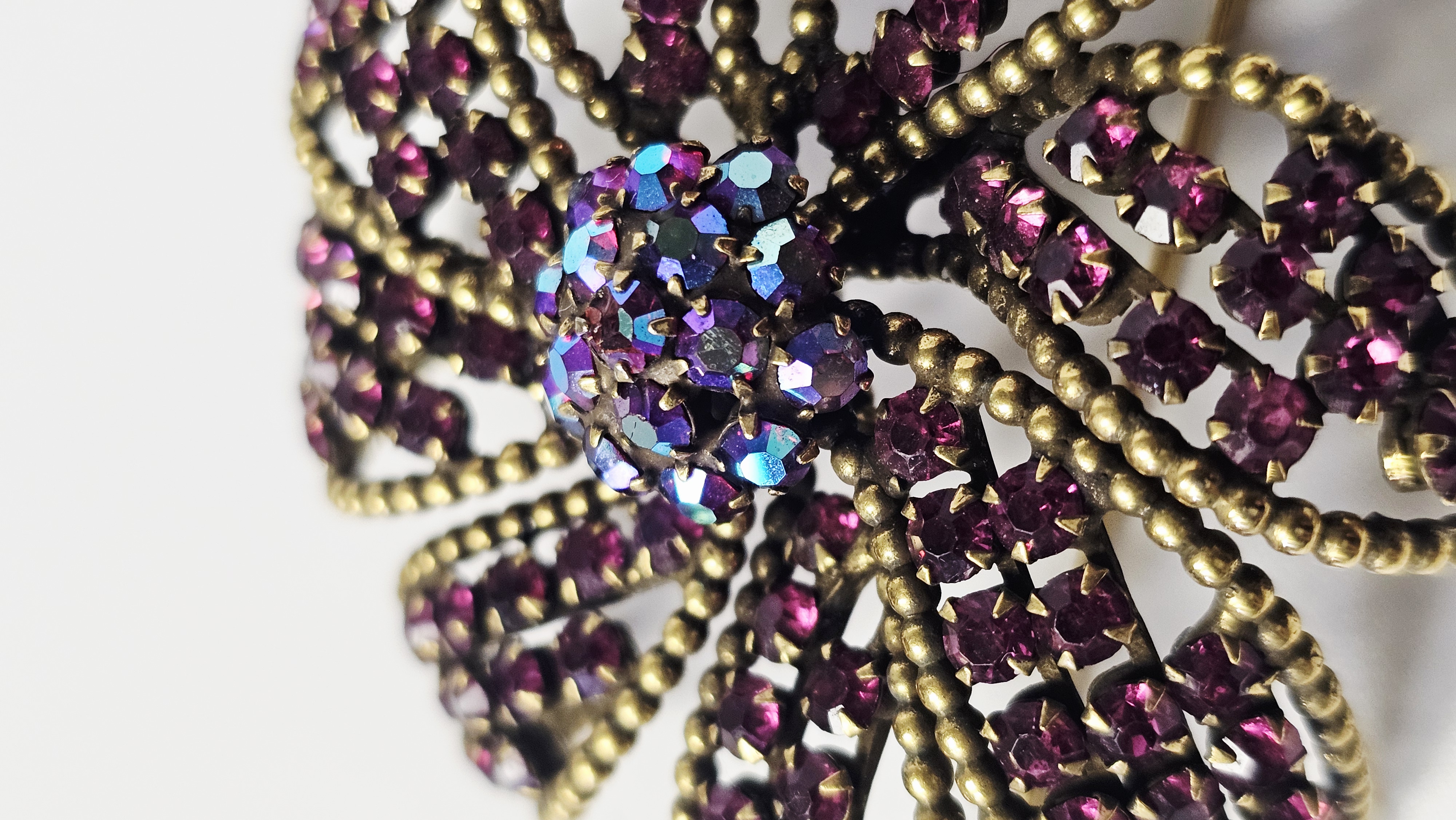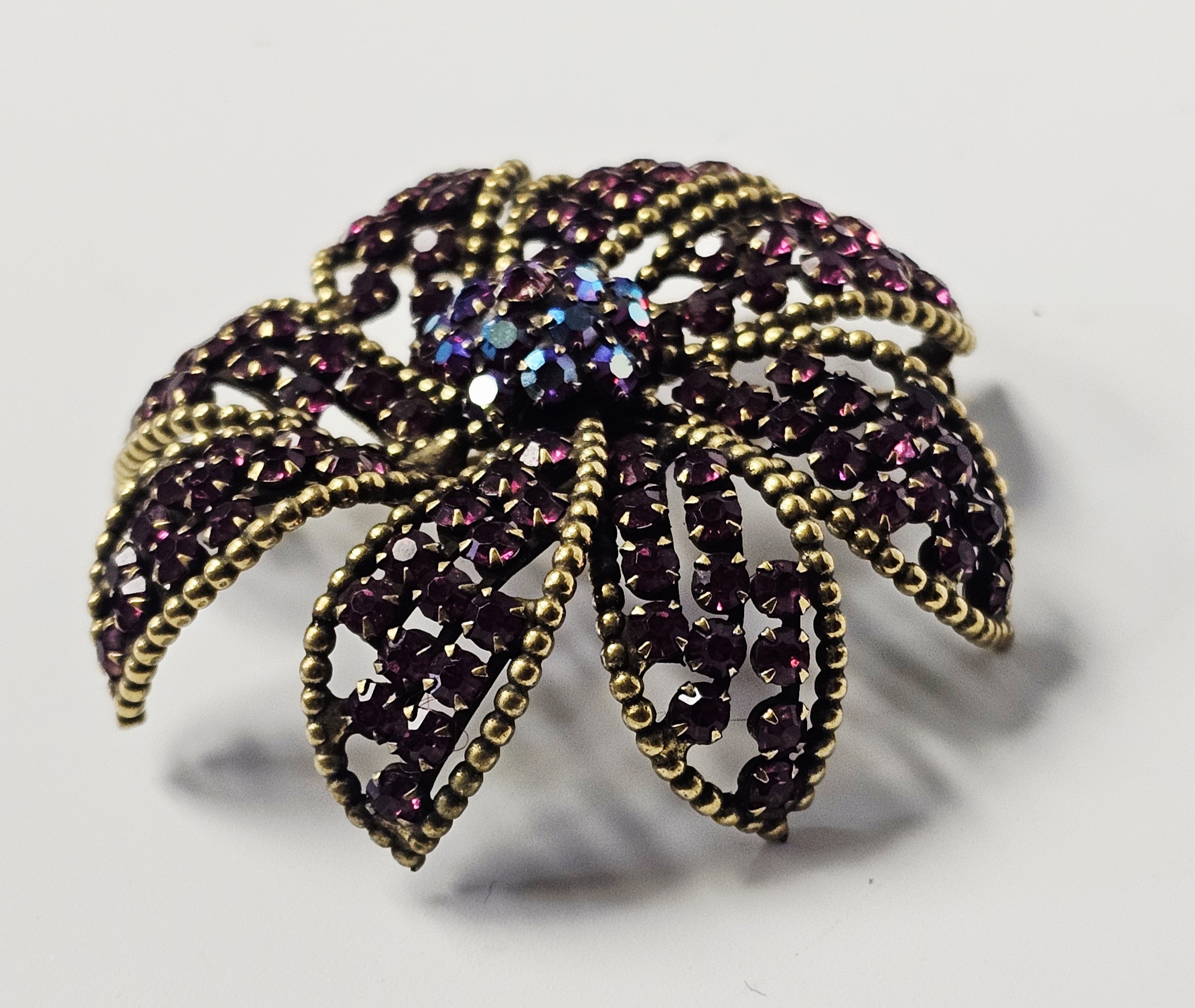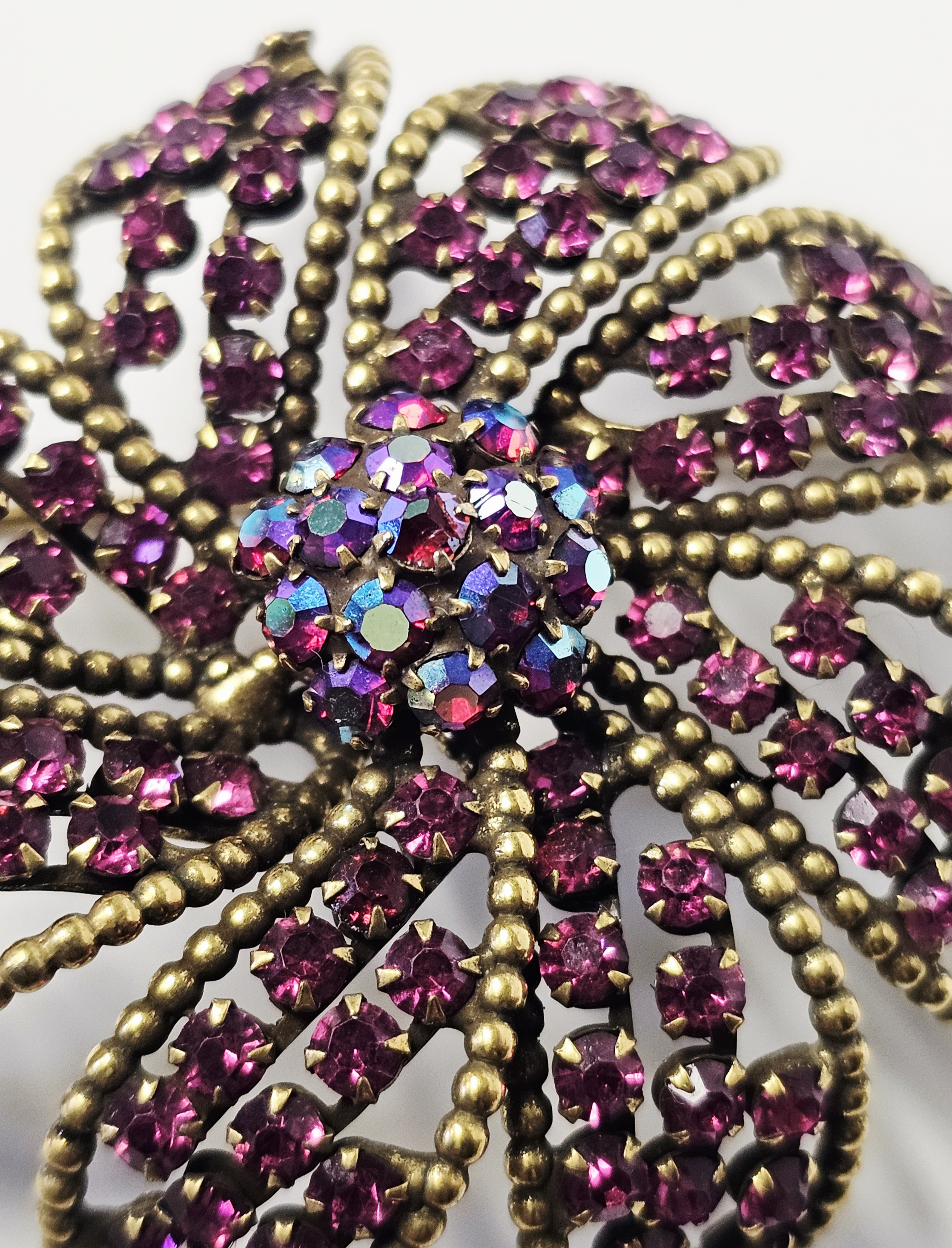 The brooch is in good vintage condition with minor surface wear and oxidation to the gold-tone finish consistent with age. One small amethyst-colored rhinestone is missing from the outer tip of one petal. The remaining stones are present and secure. The pin mechanism is functional.