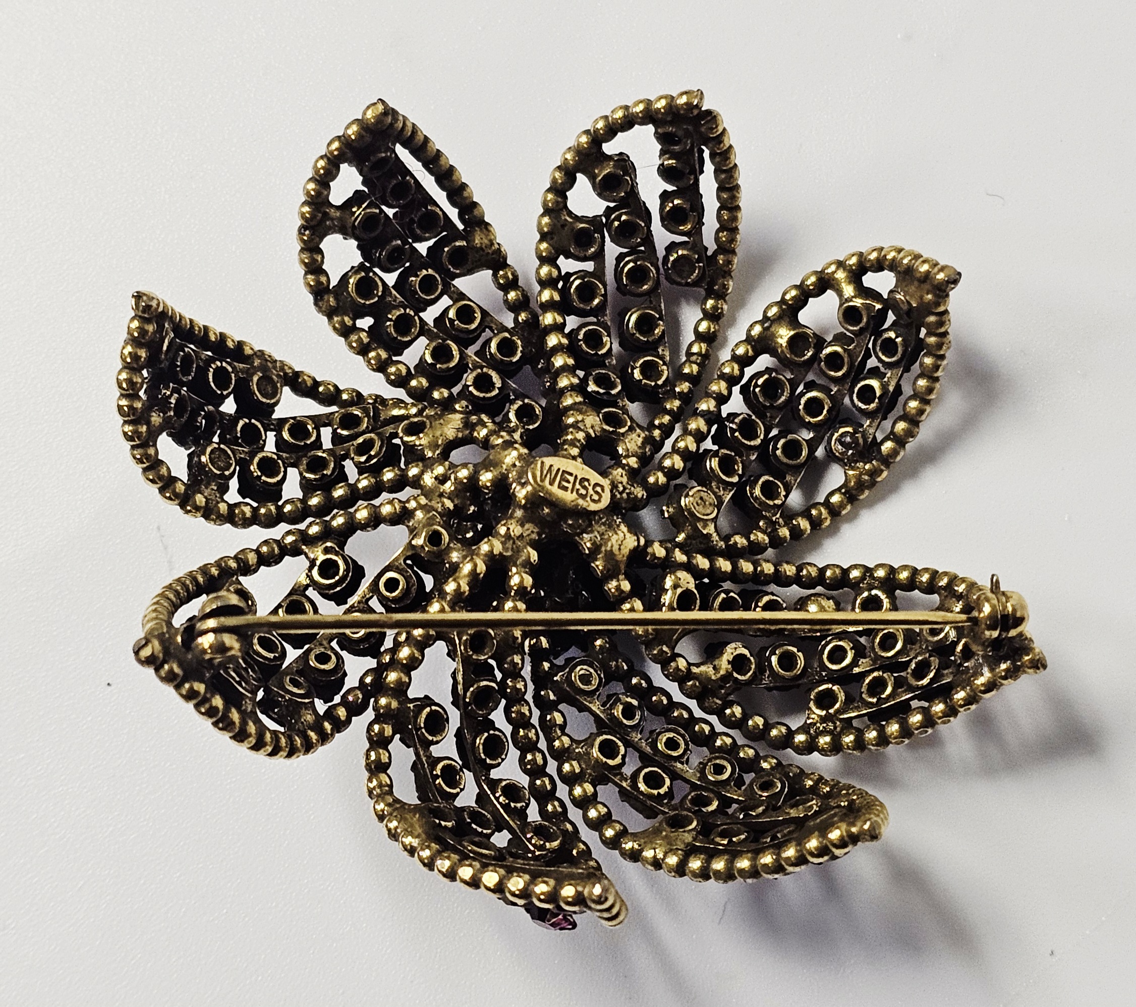 This vintage costume jewelry brooch is signed Weiss and features a stylized eight-petal pinwheel flower design. The piece is constructed from antiqued gold-tone base metal with beaded milgrain borders along each petal. The petals are set with faceted round amethyst-colored rhinestones. The center of the brooch consists of a raised, domed cluster of round rhinestones with an Aurora Borealis finish, exhibiting iridescent flashes of blue, purple, and green. The reverse features a horizontal pin stem with a rotating rolling safety clasp and an oval plaque stamped Weiss. Dimensions: 2.25 inches in diameter. The brooch is in good vintage condition with minor surface wear and oxidation to the gold-tone finish consistent with age. One small amethyst-colored rhinestone is missing from the outer tip of one petal. The remaining stones are present and secure. The pin mechanism is functional.