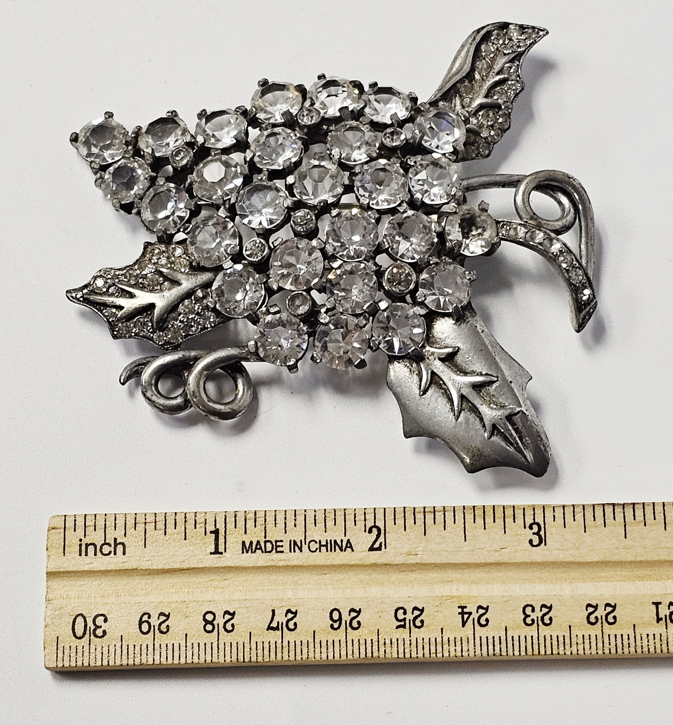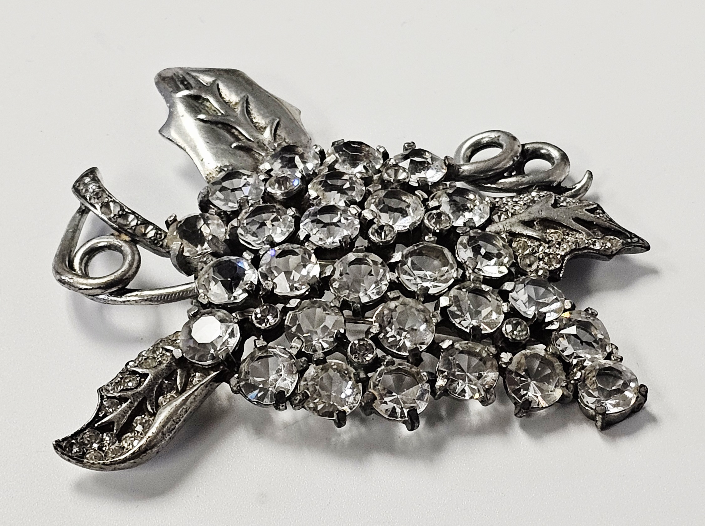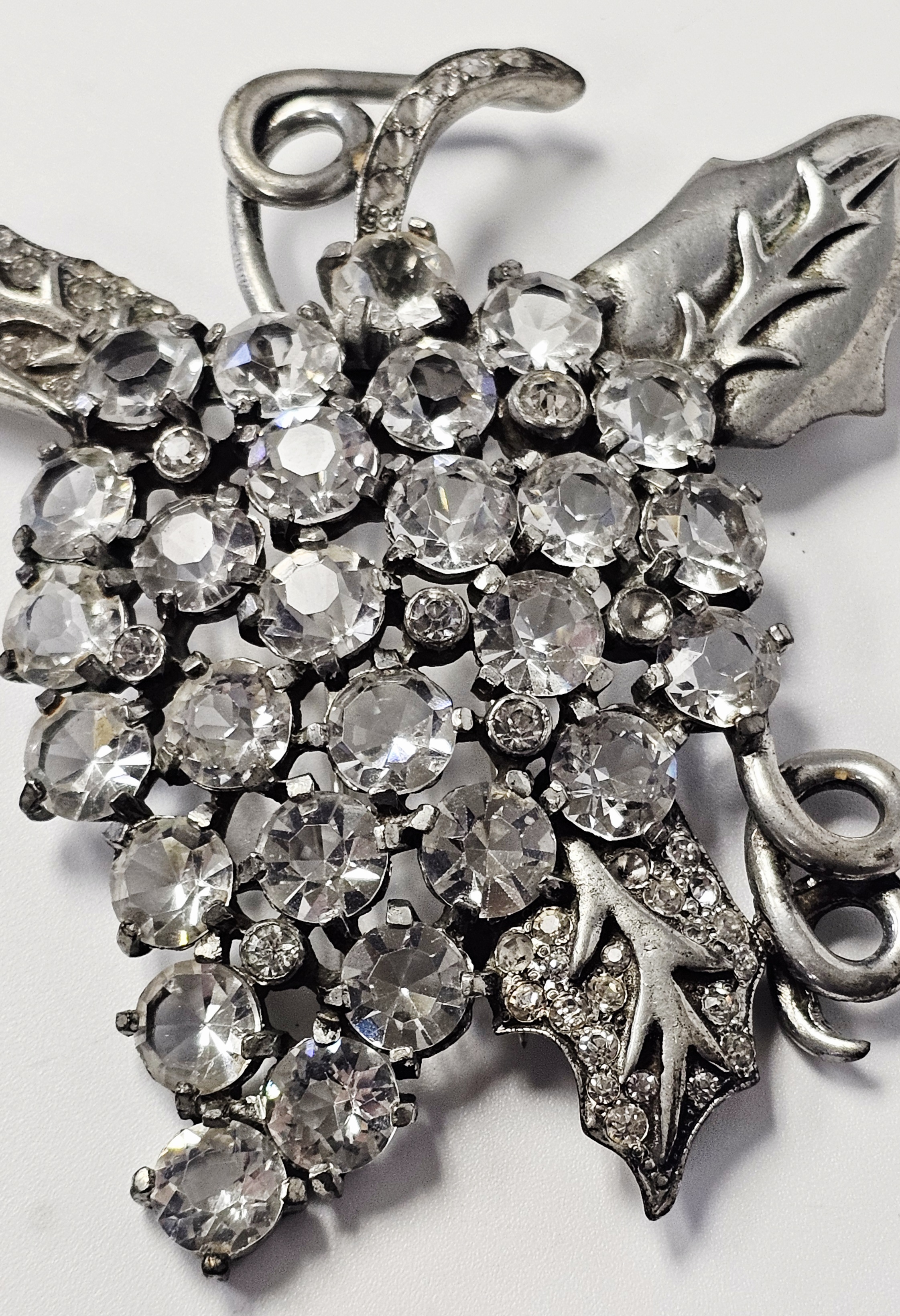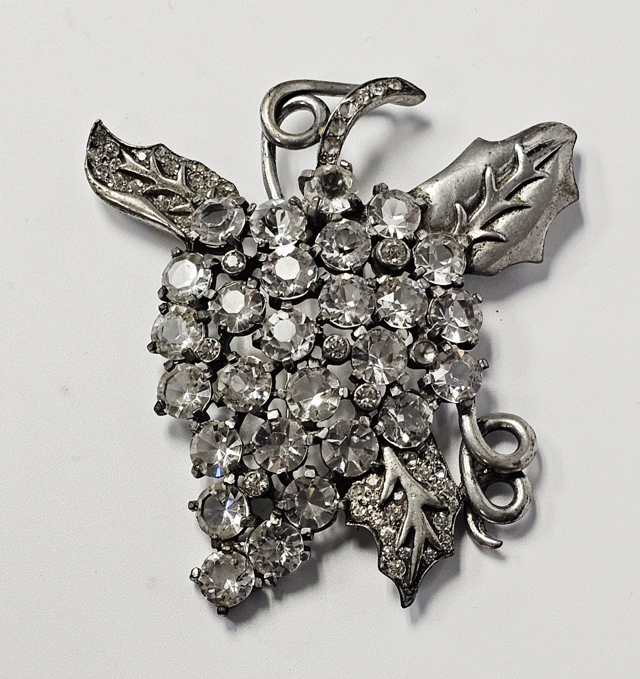 A vintage costume jewelry brooch by Eisenberg Original featuring a naturalistic grape motif. The design depicts a central cluster of grapes surrounded by three leaves and curled vine tendrils. The piece is constructed from silver-tone base metal and is set with colorless faceted rhinestones of various sizes. The grapes are represented by larger prong-set round stones, while the leaves and stems are accented with smaller pavé-set rhinestones. The reverse of one leaf is incised with the mark EISENBERG ORIGINAL, a copyright symbol, and a circular emblem. The brooch is fitted with a horizontal pin mechanism and a rotating safety clasp. Dimensions: 3 inches x 2.5 inches. The brooch is in good vintage condition with visible tarnish and patina to the silver-tone metal finish, particularly on the reverse. One small round rhinestone is missing from the lower-central portion of the grape cluster. Several rhinestones exhibit minor yellowing or darkening consistent with age-related foil degradation.