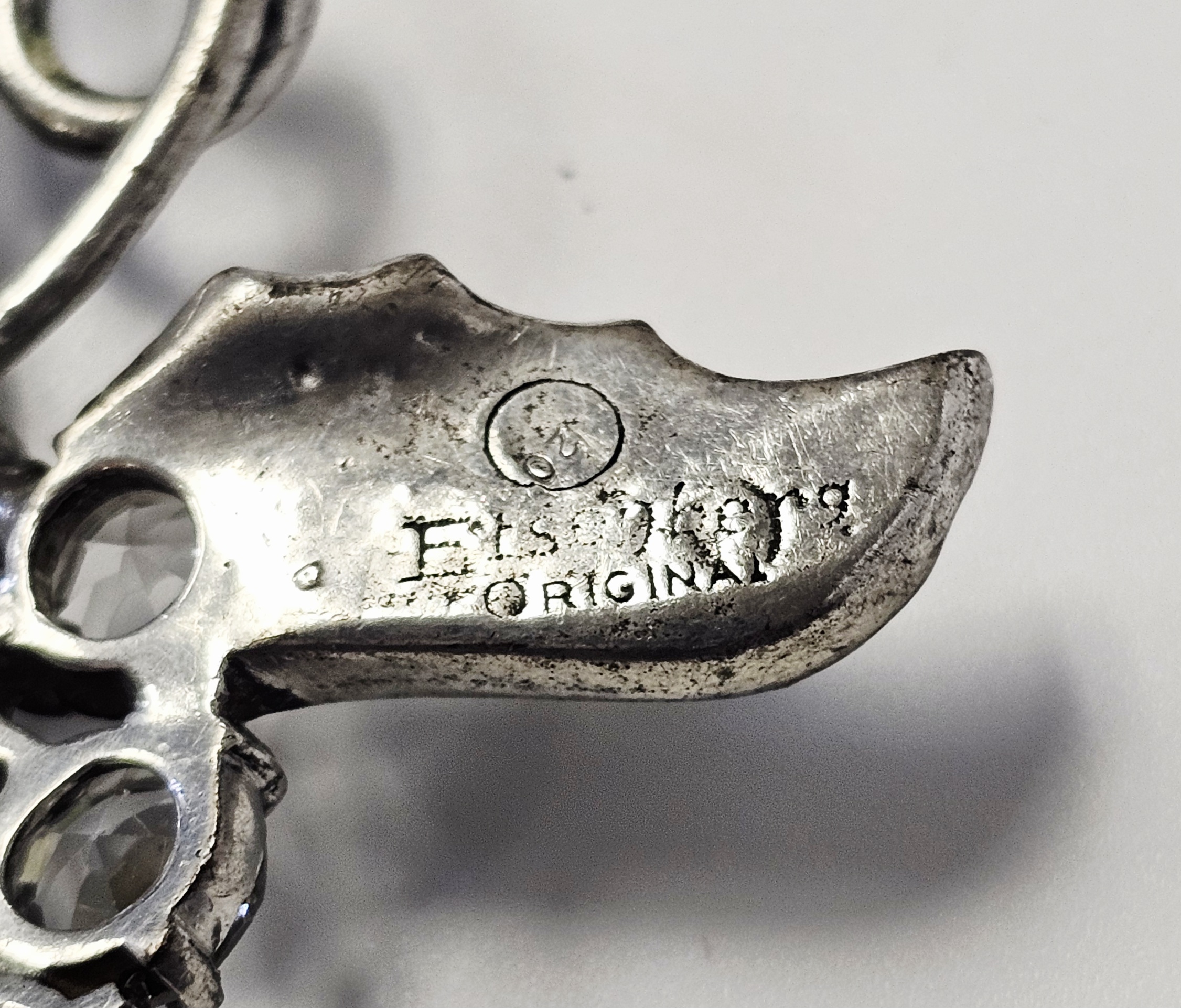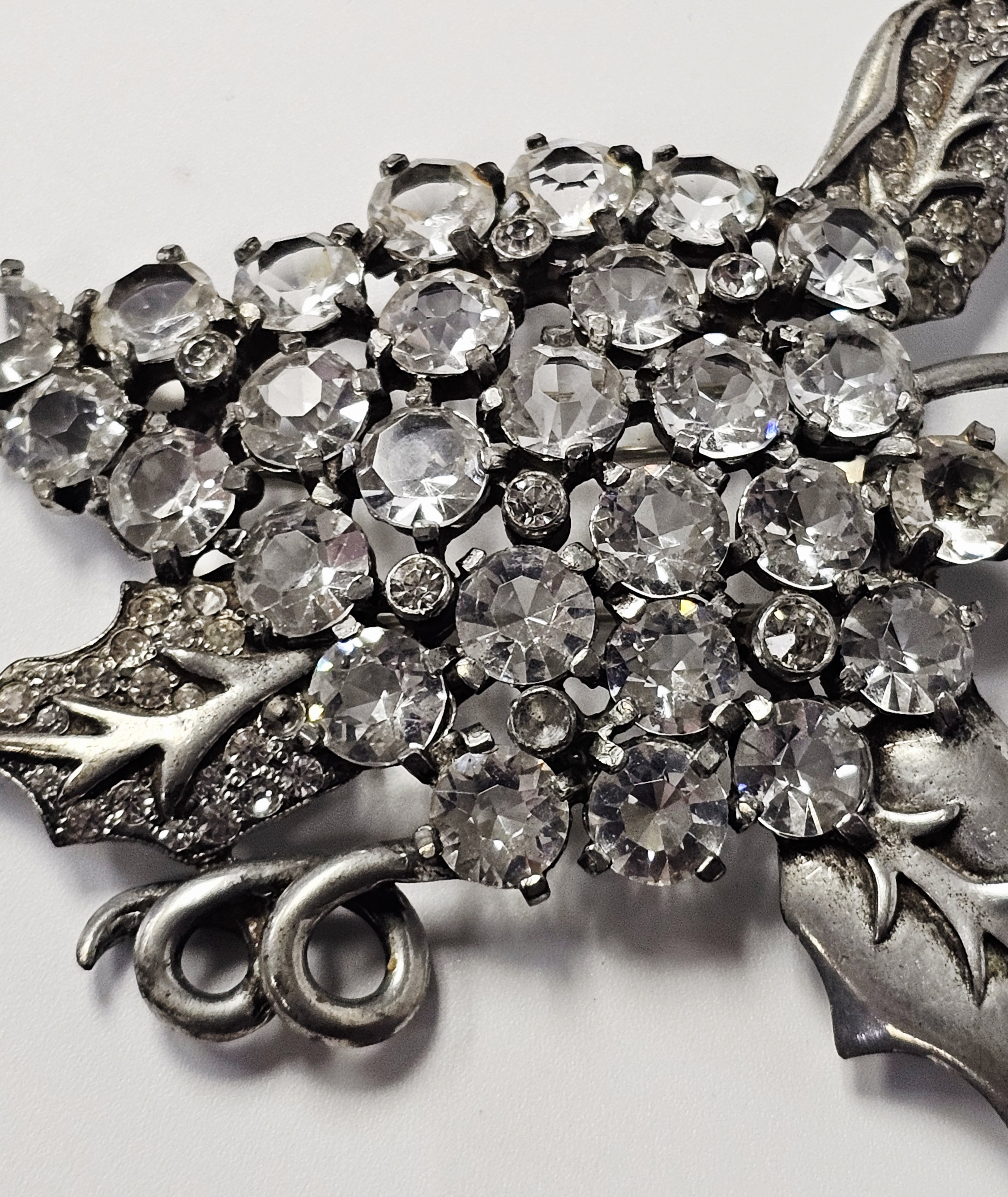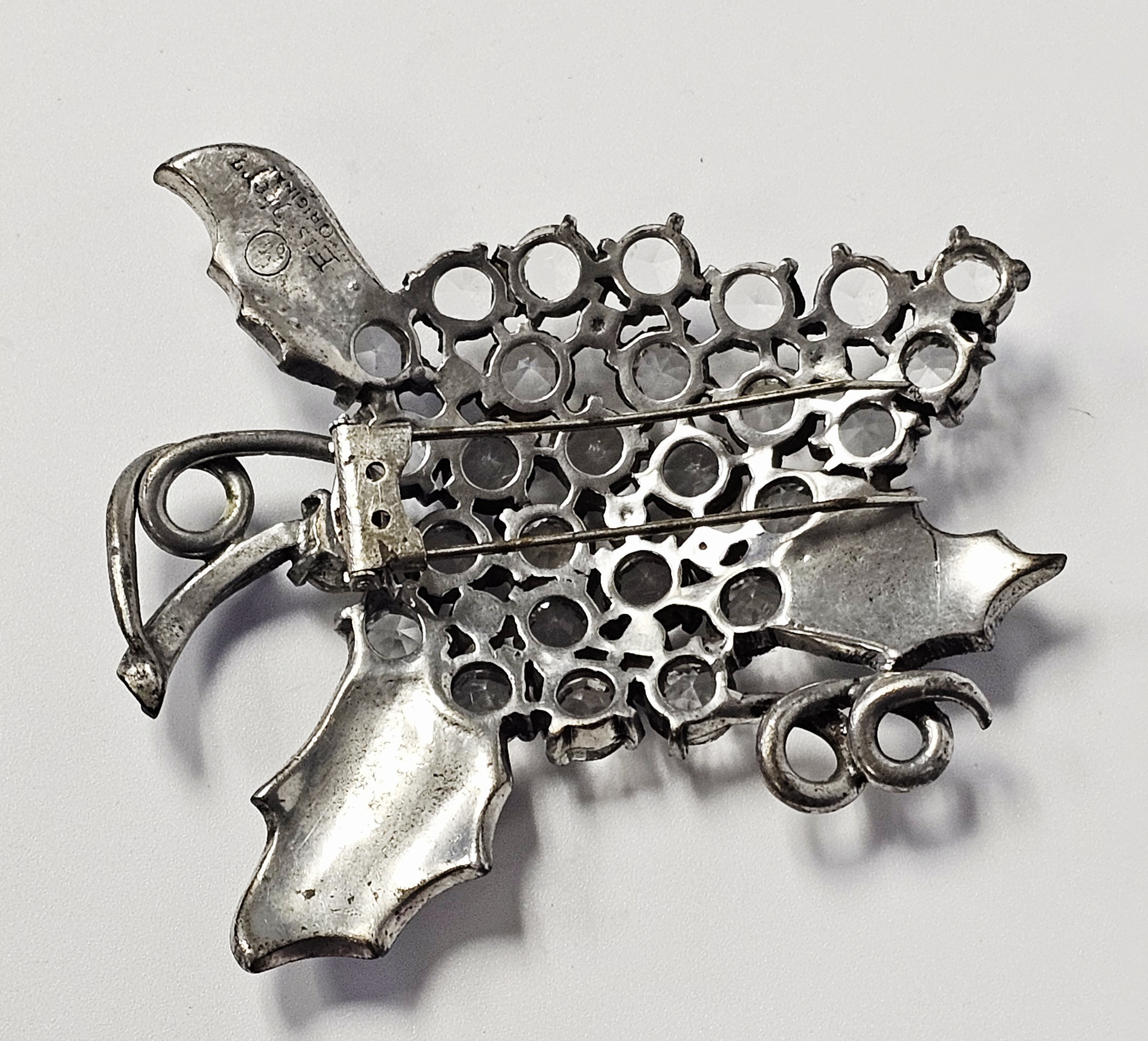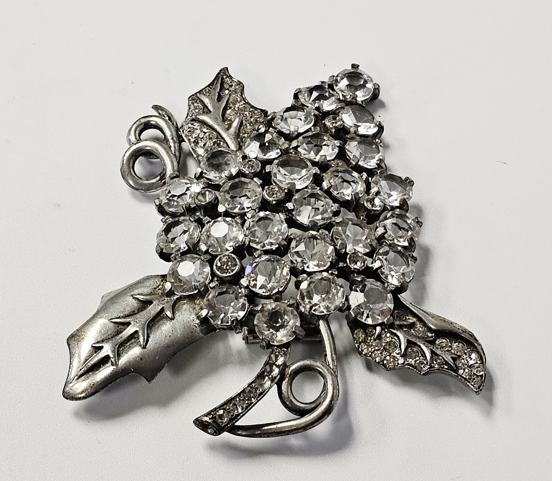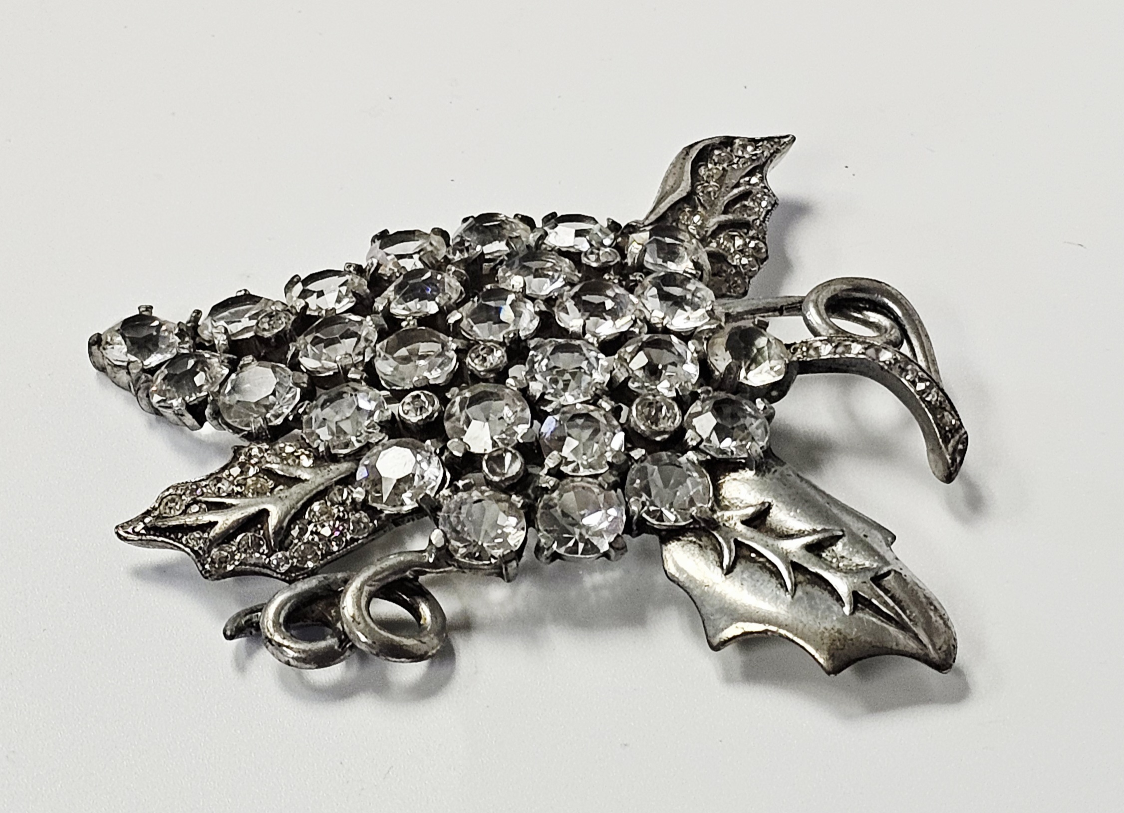 A vintage costume jewelry brooch by Eisenberg Original featuring a naturalistic grape motif. The design depicts a central cluster of grapes surrounded by three leaves and curled vine tendrils. The piece is constructed from silver-tone base metal and is set with colorless faceted rhinestones of various sizes. The grapes are represented by larger prong-set round stones, while the leaves and stems are accented with smaller pavé-set rhinestones. The reverse of one leaf is incised with the mark EISENBERG ORIGINAL, a copyright symbol, and a circular emblem. The brooch is fitted with a horizontal pin mechanism and a rotating safety clasp. Dimensions: 3 inches x 2.5 inches. The brooch is in good vintage condition with visible tarnish and patina to the silver-tone metal finish, particularly on the reverse. One small round rhinestone is missing from the lower-central portion of the grape cluster. Several rhinestones exhibit minor yellowing or darkening consistent with age-related foil degradation.
