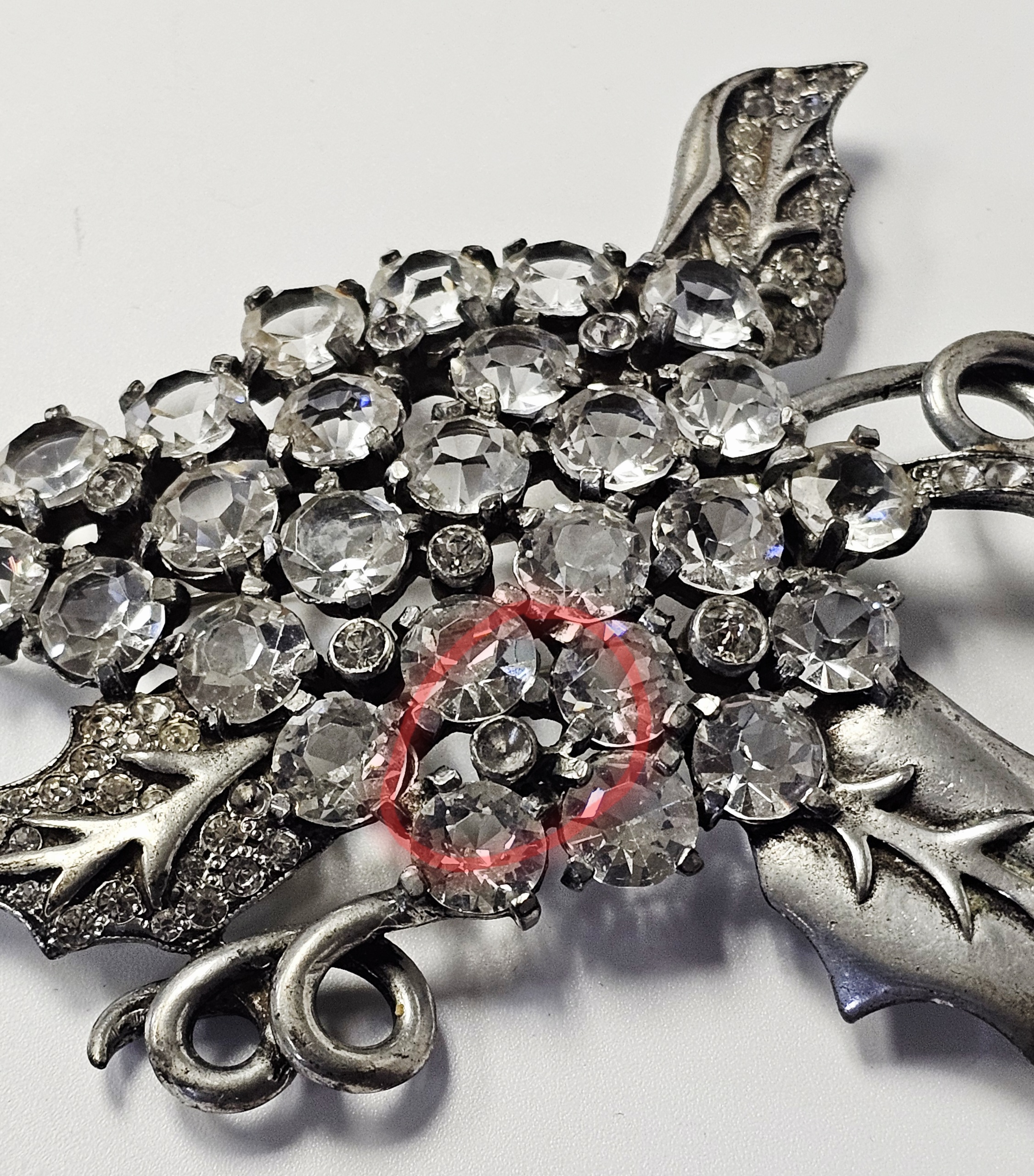 The brooch is in good vintage condition with visible tarnish and patina to the silver-tone metal finish, particularly on the reverse. One small round rhinestone is missing from the lower-central portion of the grape cluster. Several rhinestones exhibit minor yellowing or darkening consistent with age-related foil degradation.