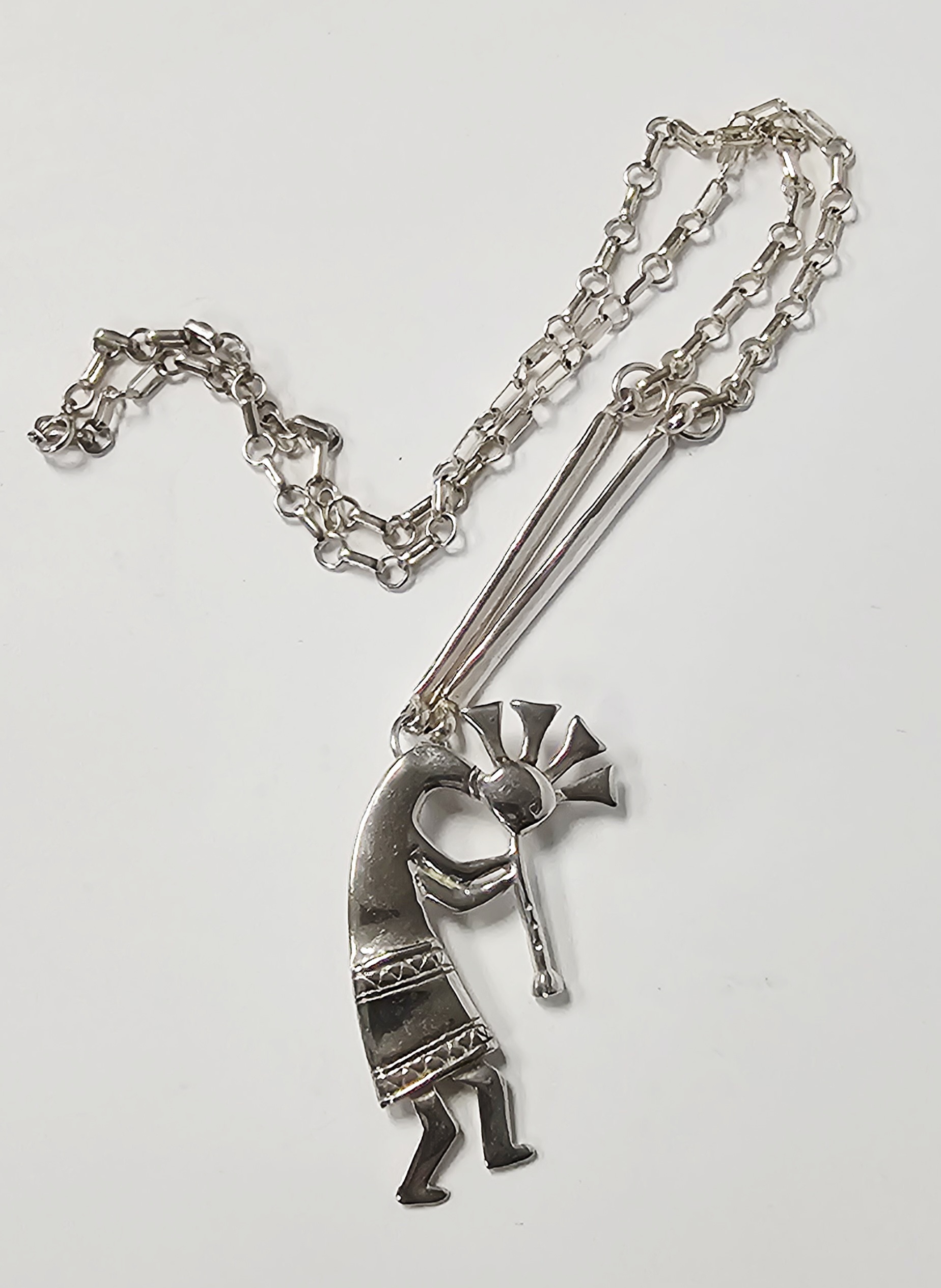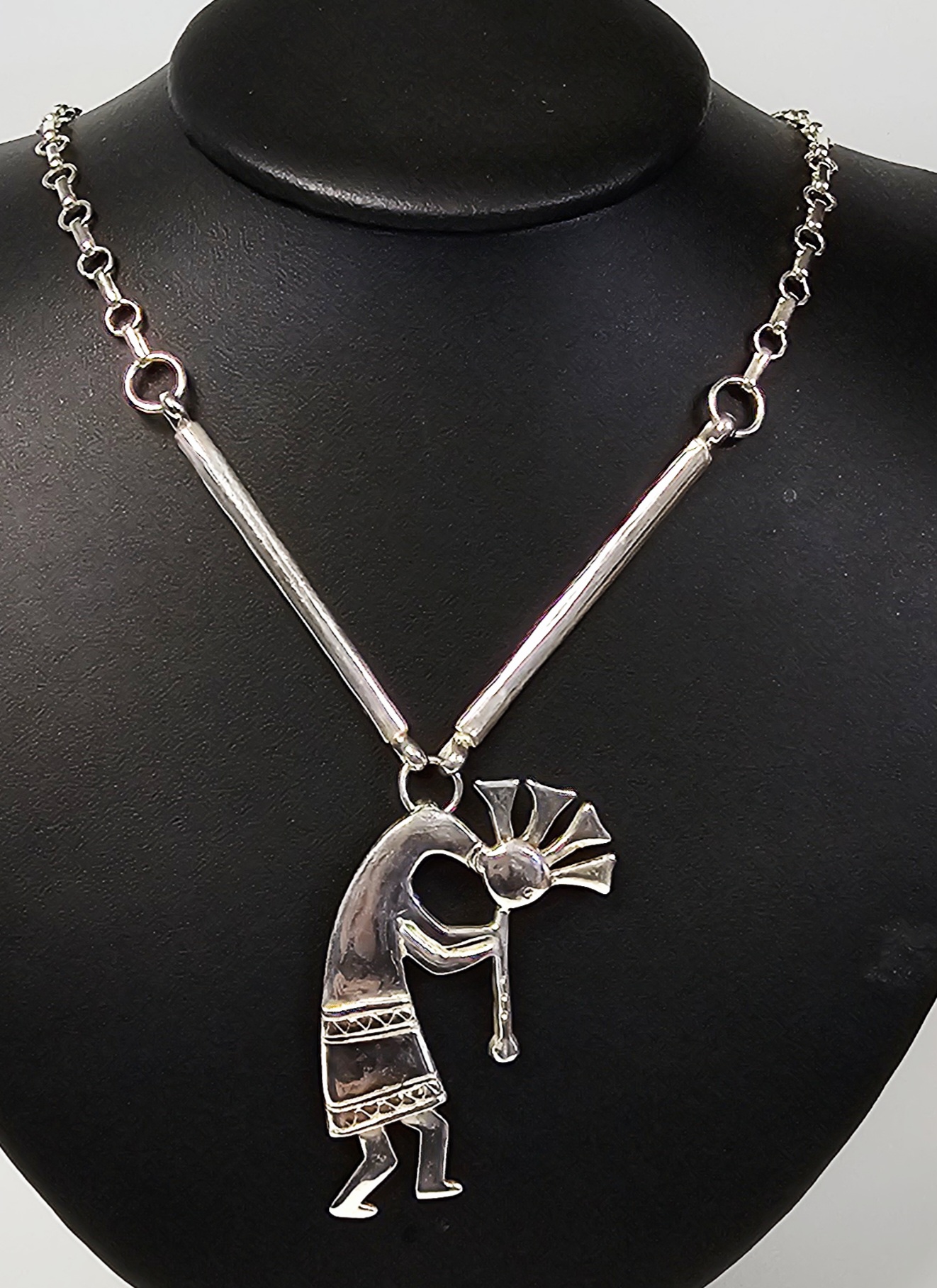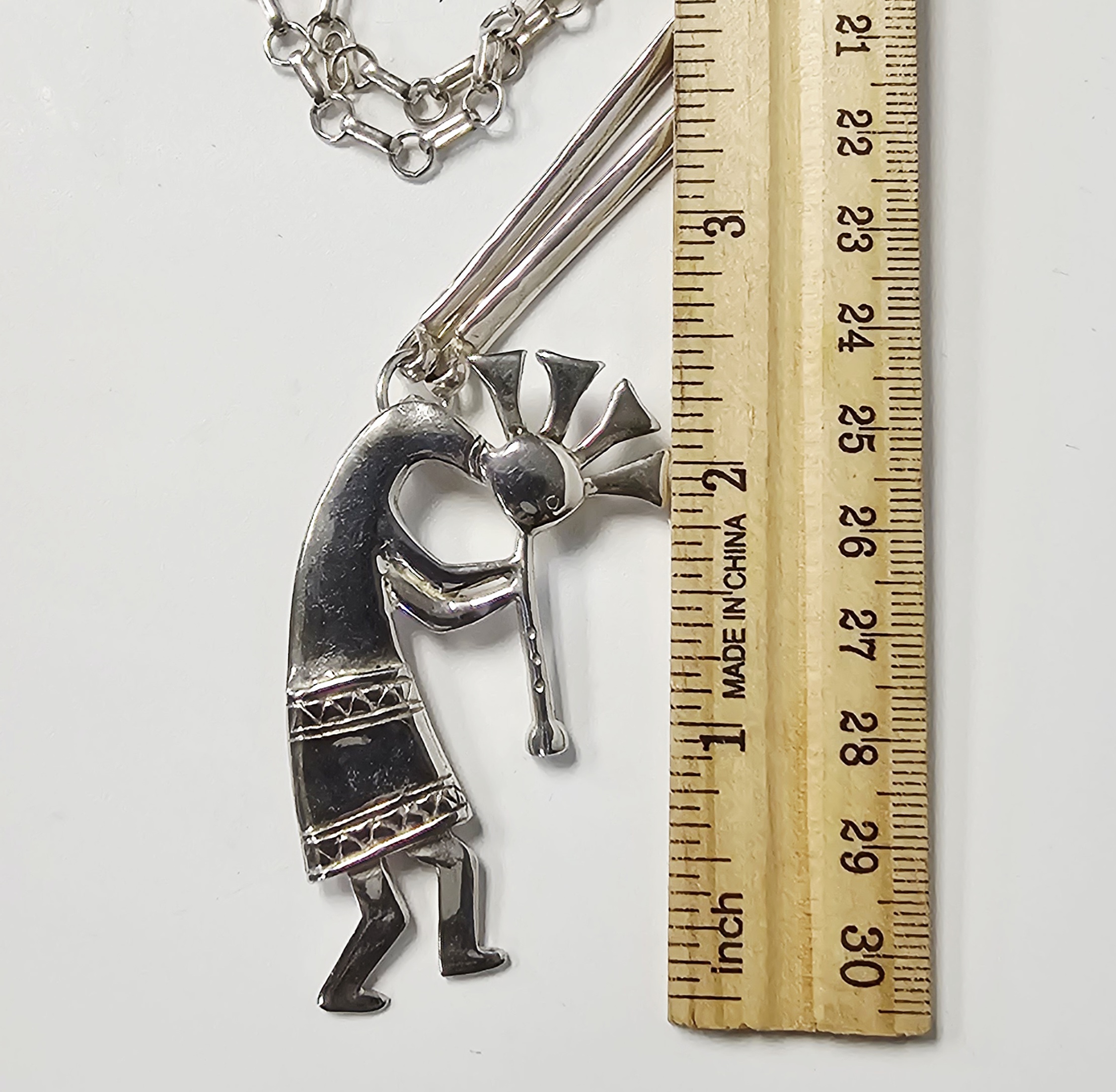 This sterling silver necklace features a pendant depicting a Kokopelli figure. The pendant is designed with a polished front surface and incised geometric patterns on the lower portion of the figure. The reverse of the pendant has a textured finish and an applied plaque. The plaque is stamped with the maker mark 3SC followed by a copyright symbol and the word STERLING. The pendant is suspended from a sterling silver chain composed of alternating link segments and elongated tubular bars. The necklace is secured with a spring ring clasp stamped with 925. Length: 28 inches Weight: 34.5 grams Pendant Length: Approximately 3 inches. The item is in good condition with minor surface scratches and localized tarnish consistent with age and use. The spring ring clasp is functional.