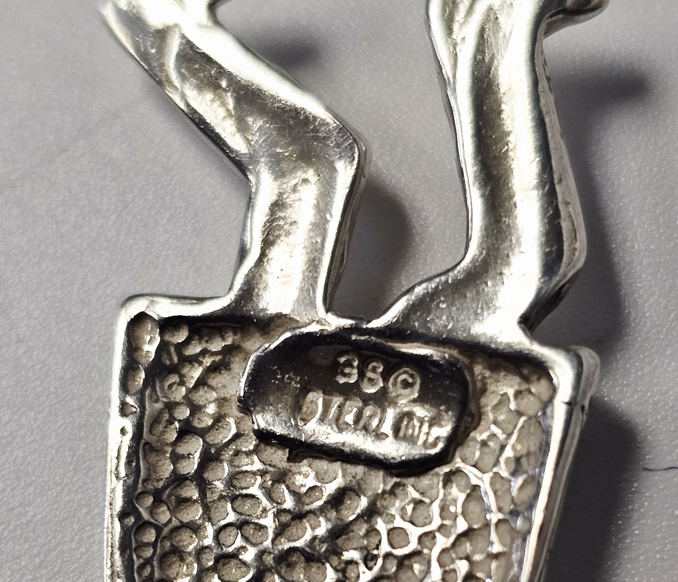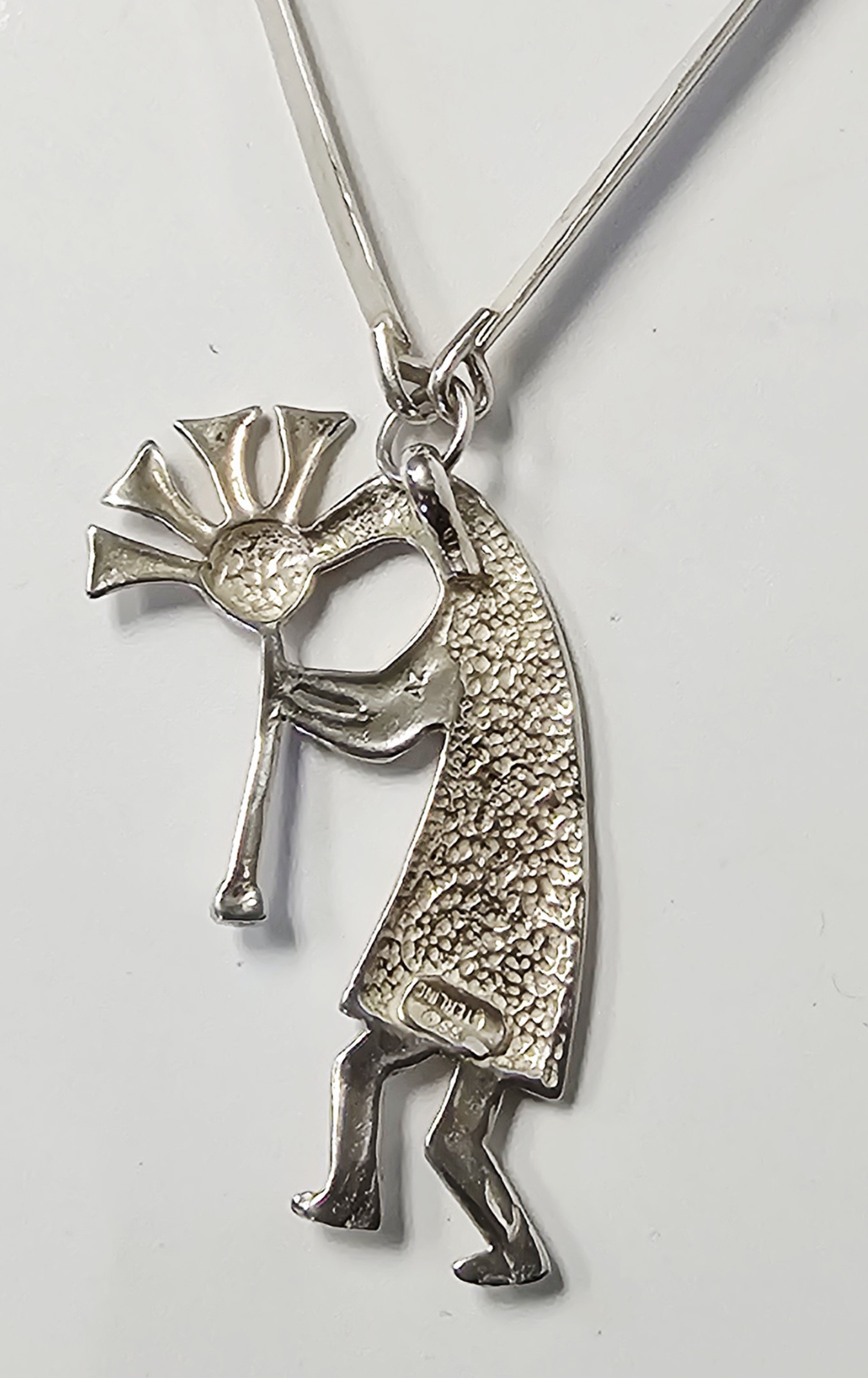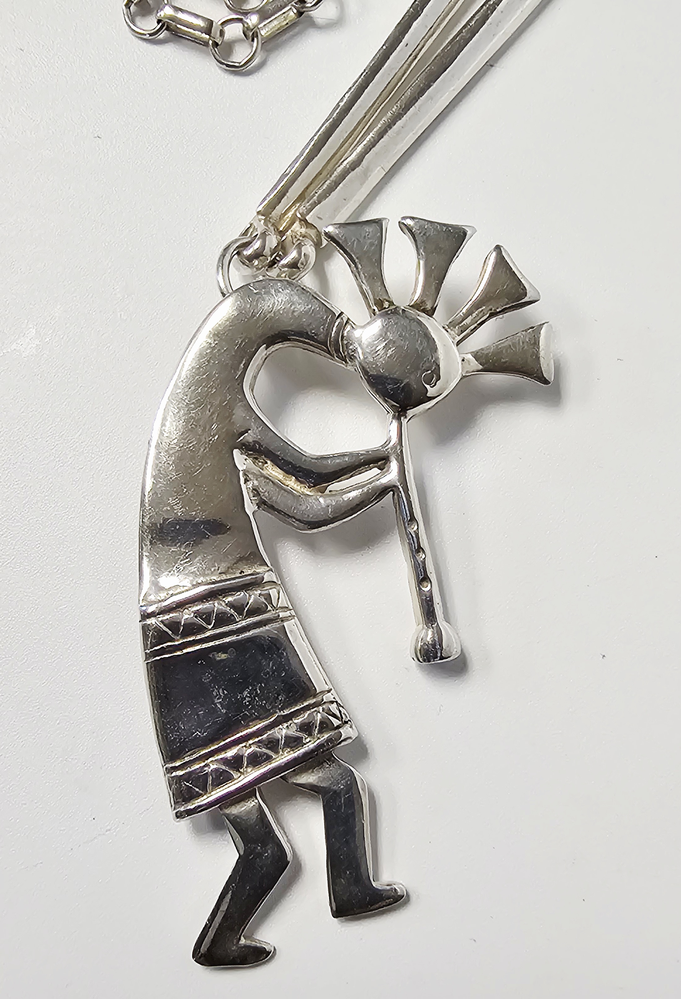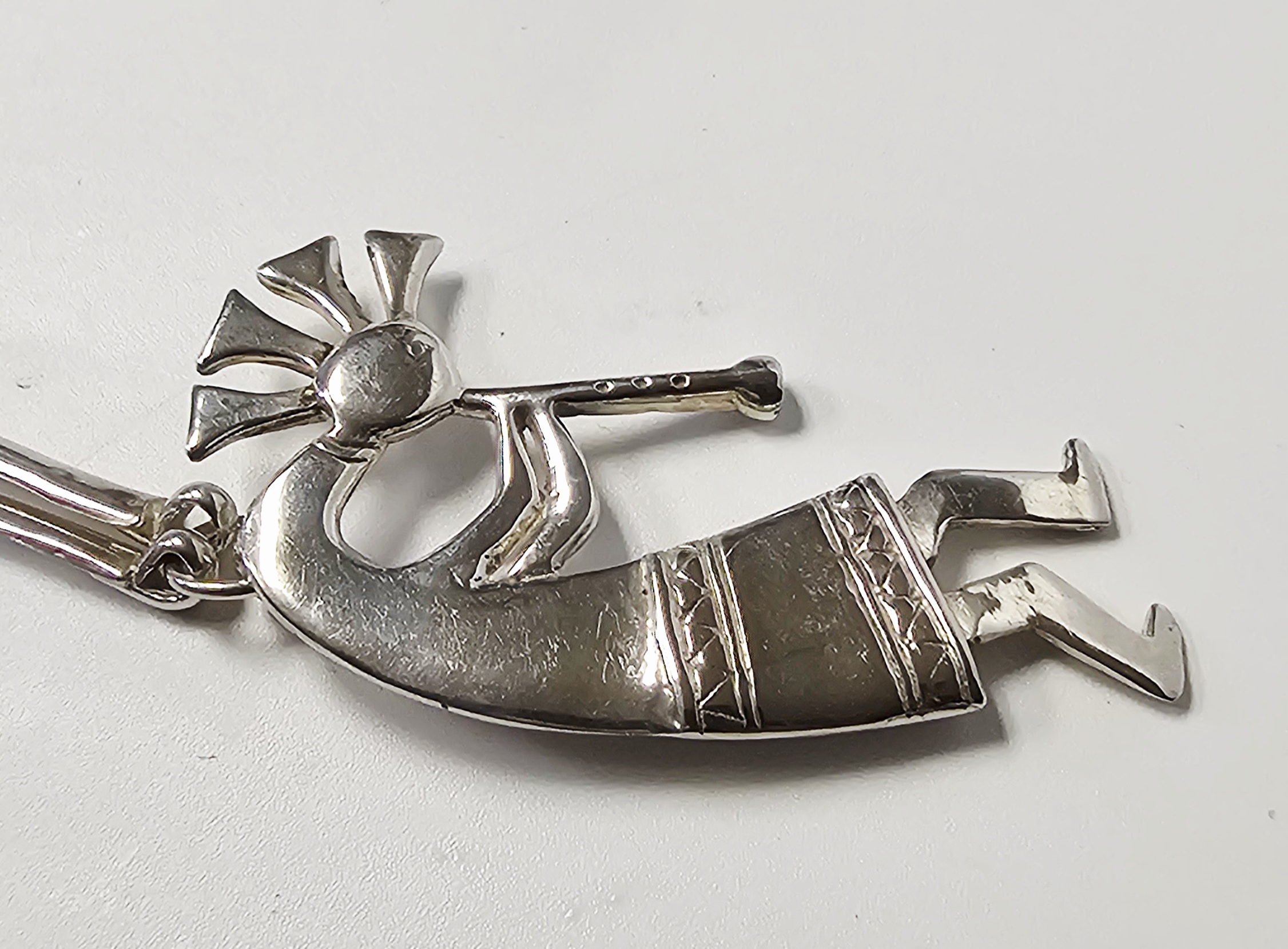 This sterling silver necklace features a pendant depicting a Kokopelli figure. The pendant is designed with a polished front surface and incised geometric patterns on the lower portion of the figure. The reverse of the pendant has a textured finish and an applied plaque. The plaque is stamped with the maker mark 3SC followed by a copyright symbol and the word STERLING. The pendant is suspended from a sterling silver chain composed of alternating link segments and elongated tubular bars. The necklace is secured with a spring ring clasp stamped with 925. Length: 28 inches Weight: 34.5 grams Pendant Length: Approximately 3 inches. The item is in good condition with minor surface scratches and localized tarnish consistent with age and use. The spring ring clasp is functional.