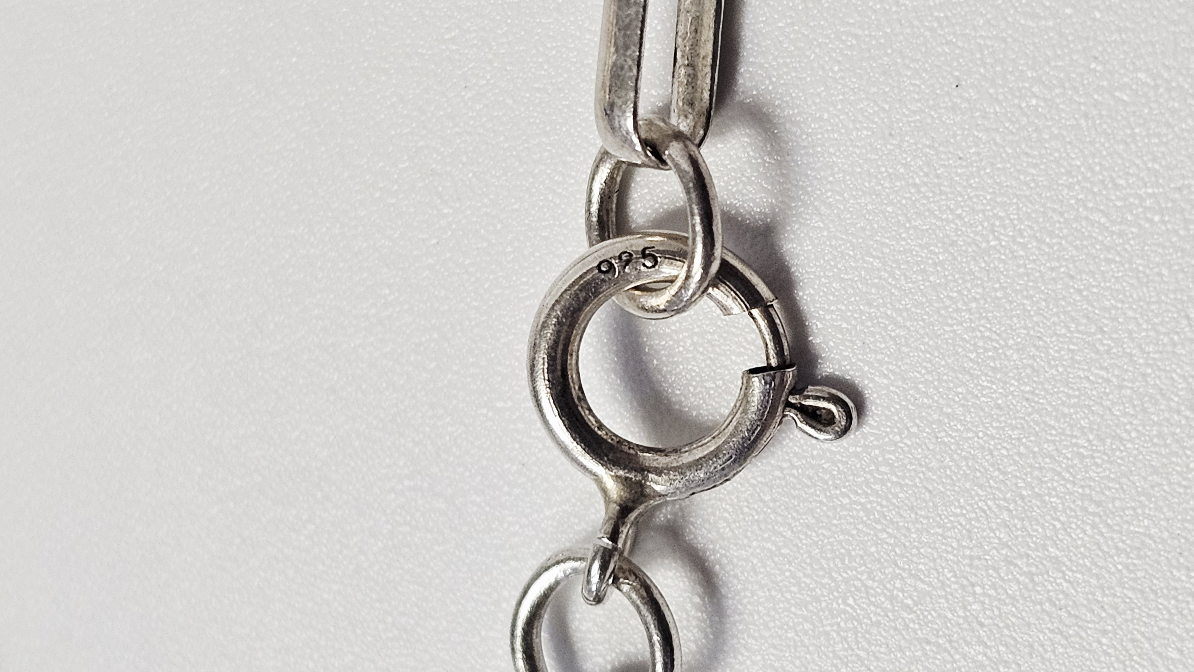 The item is in good condition with minor surface scratches and localized tarnish consistent with age and use. The spring ring clasp is functional.
