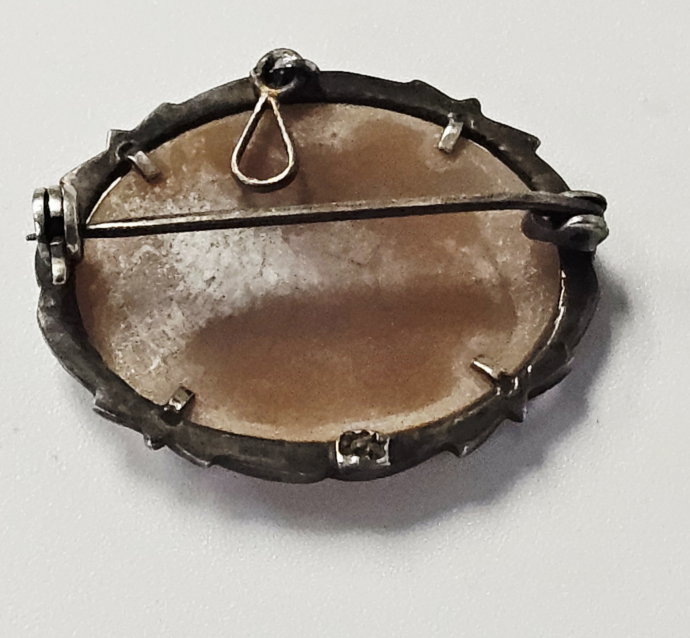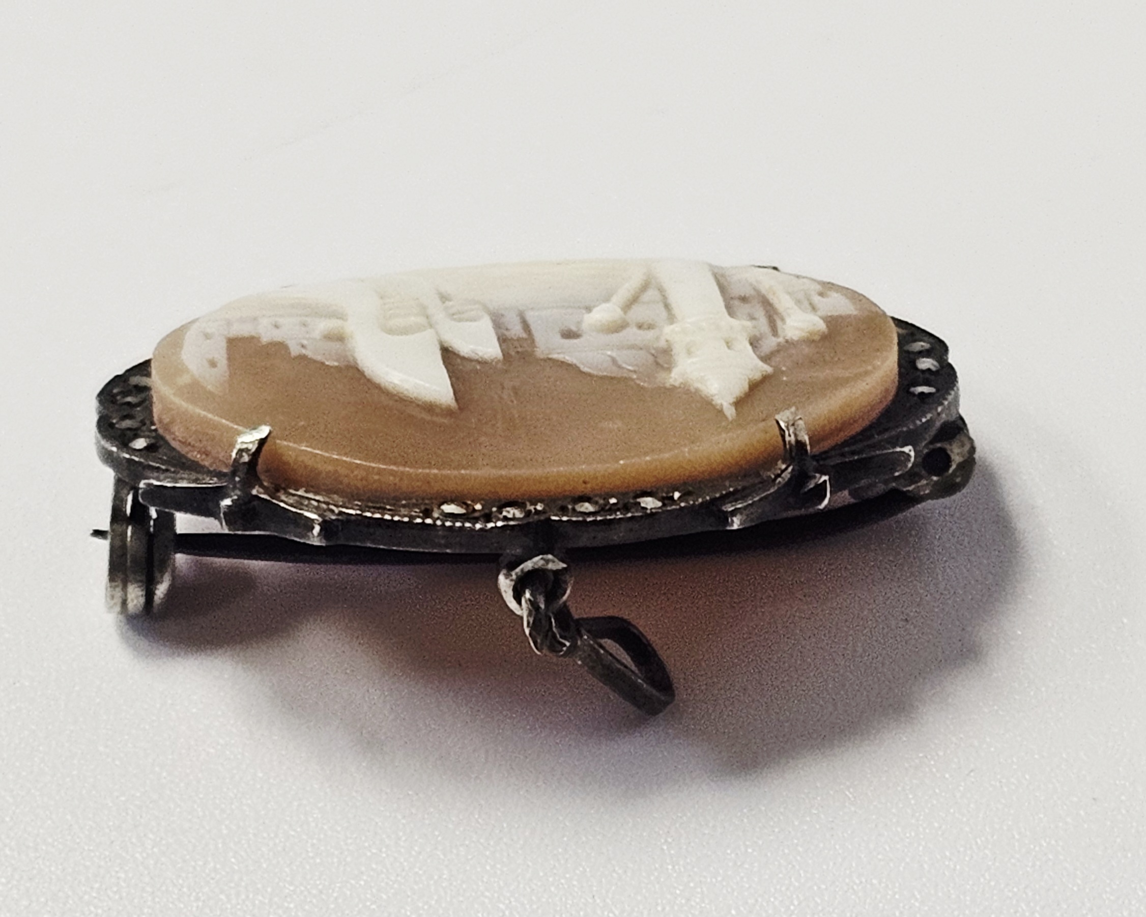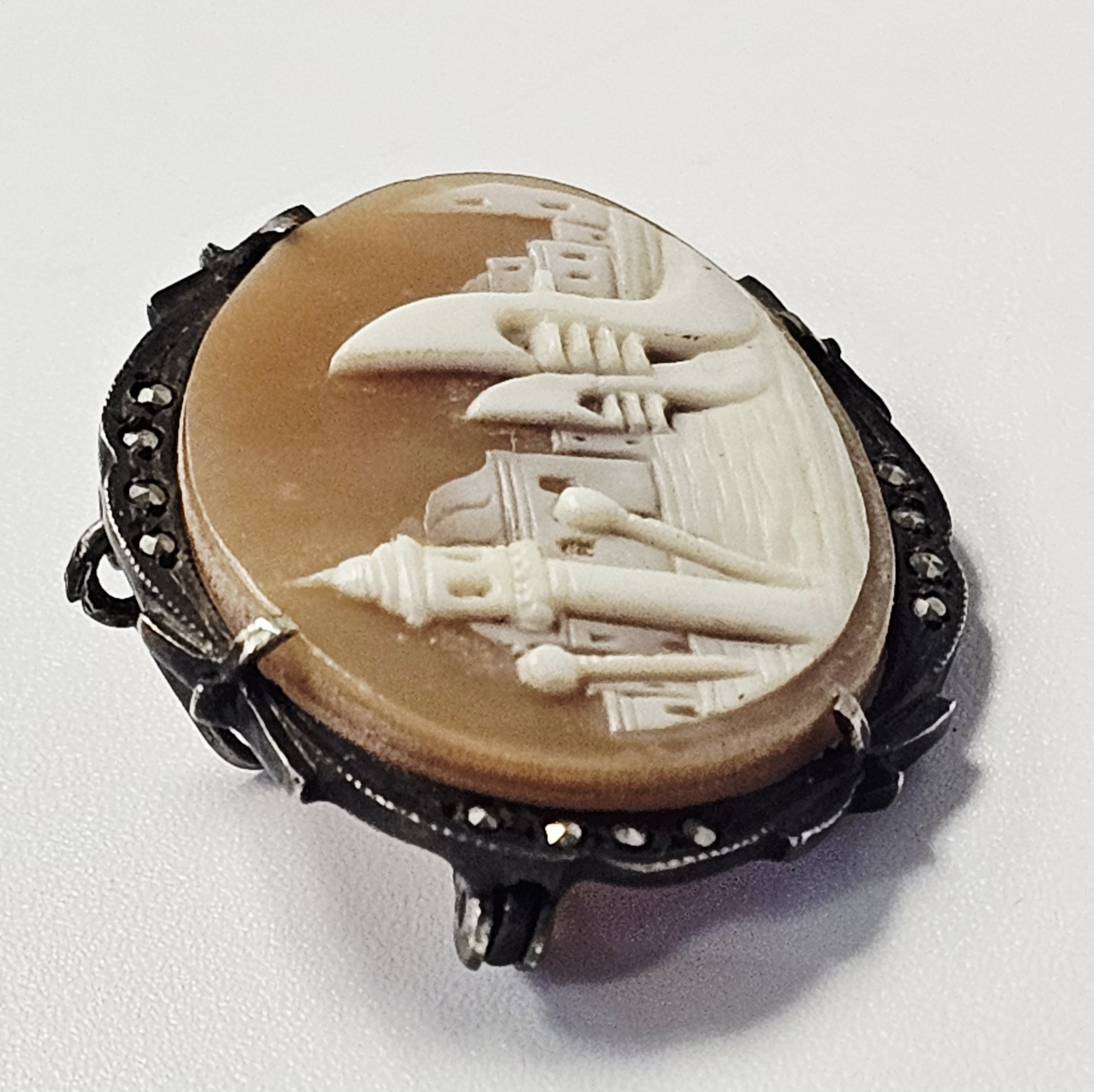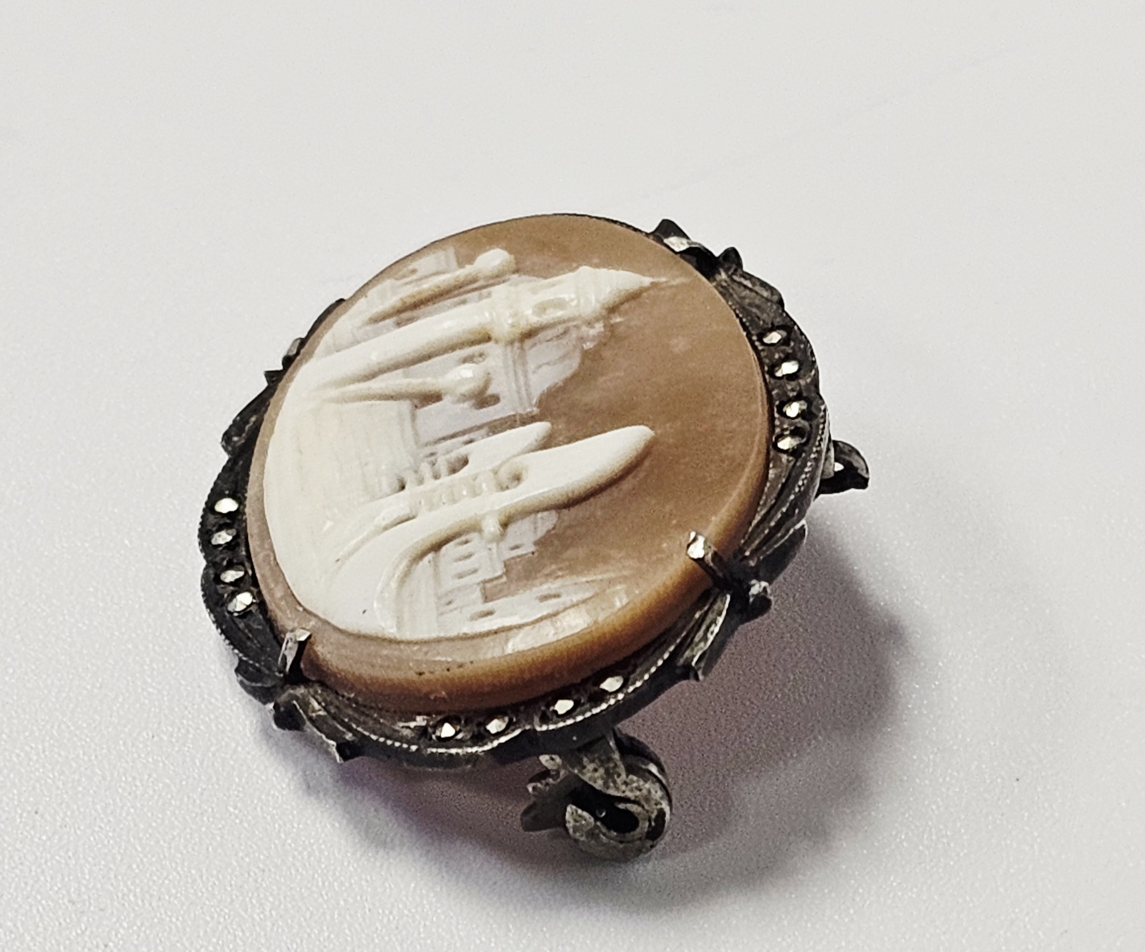 The item is in good vintage condition. The shell carving is well-preserved without visible cracks or chips. All marcasites appear to be present. The metal components exhibit surface tarnish and patina consistent with age.
