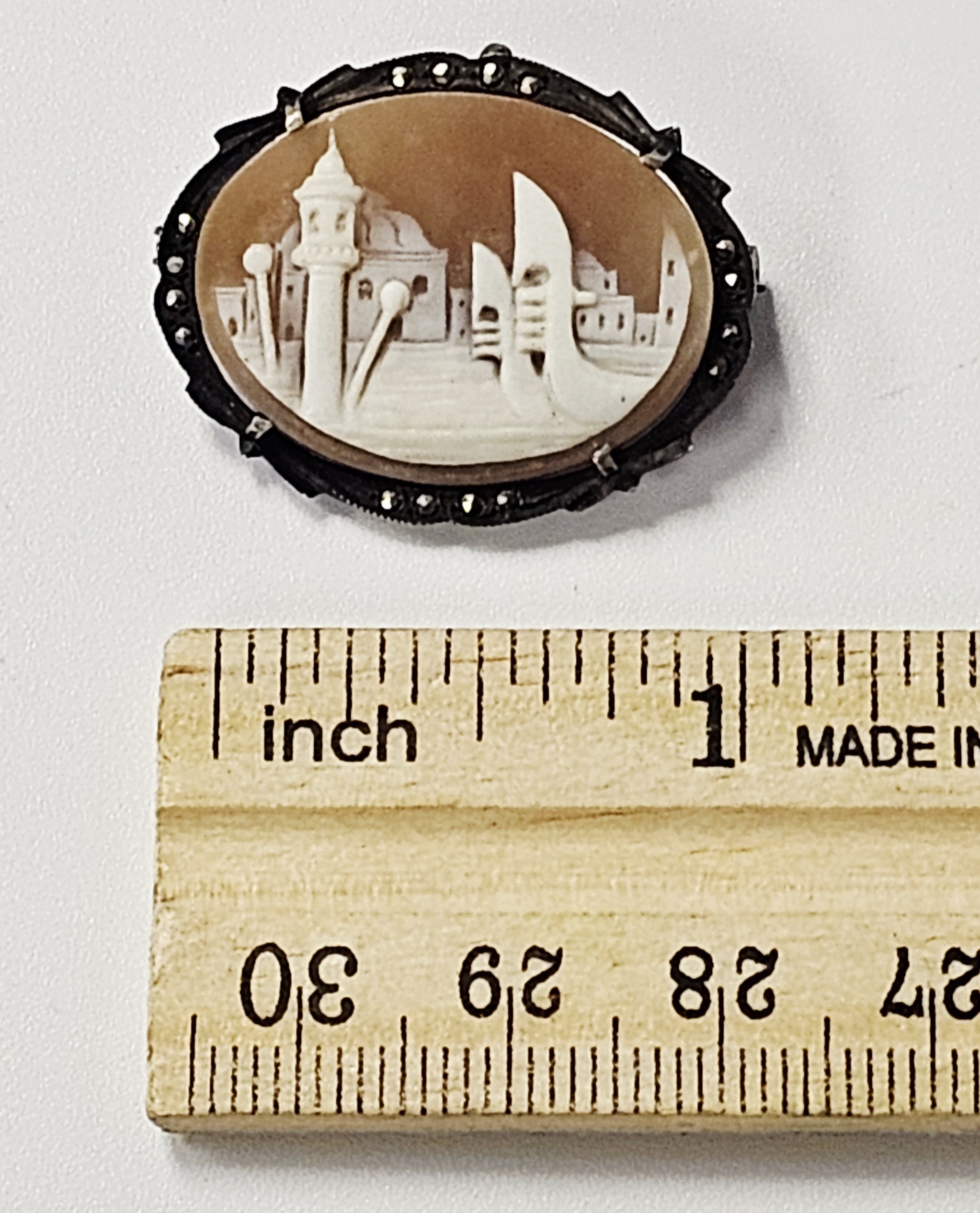 An oval carved shell cameo featuring a relief depiction of a Venetian architectural scene. The foreground shows a gondola on water, while the background includes buildings and a campanile tower. The shell exhibits a light brownish-tan ground with a cream-white carved image. The cameo is secured by four prongs within a silver frame. The frame features a scalloped border accented with multiple pavé-set marcasites. The reverse is fitted with a horizontal pin stem and a safety clasp. A hinged, fold-down bail is attached to the top of the frame, allowing the piece to be worn as a pendant. An indistinct rectangular incised mark is present on the lower portion of the metal frame on the reverse. Width: 1.125 inches Weight: 4.7 grams. The item is in good vintage condition. The shell carving is well-preserved without visible cracks or chips. All marcasites appear to be present. The metal components exhibit surface tarnish and patina consistent with age.