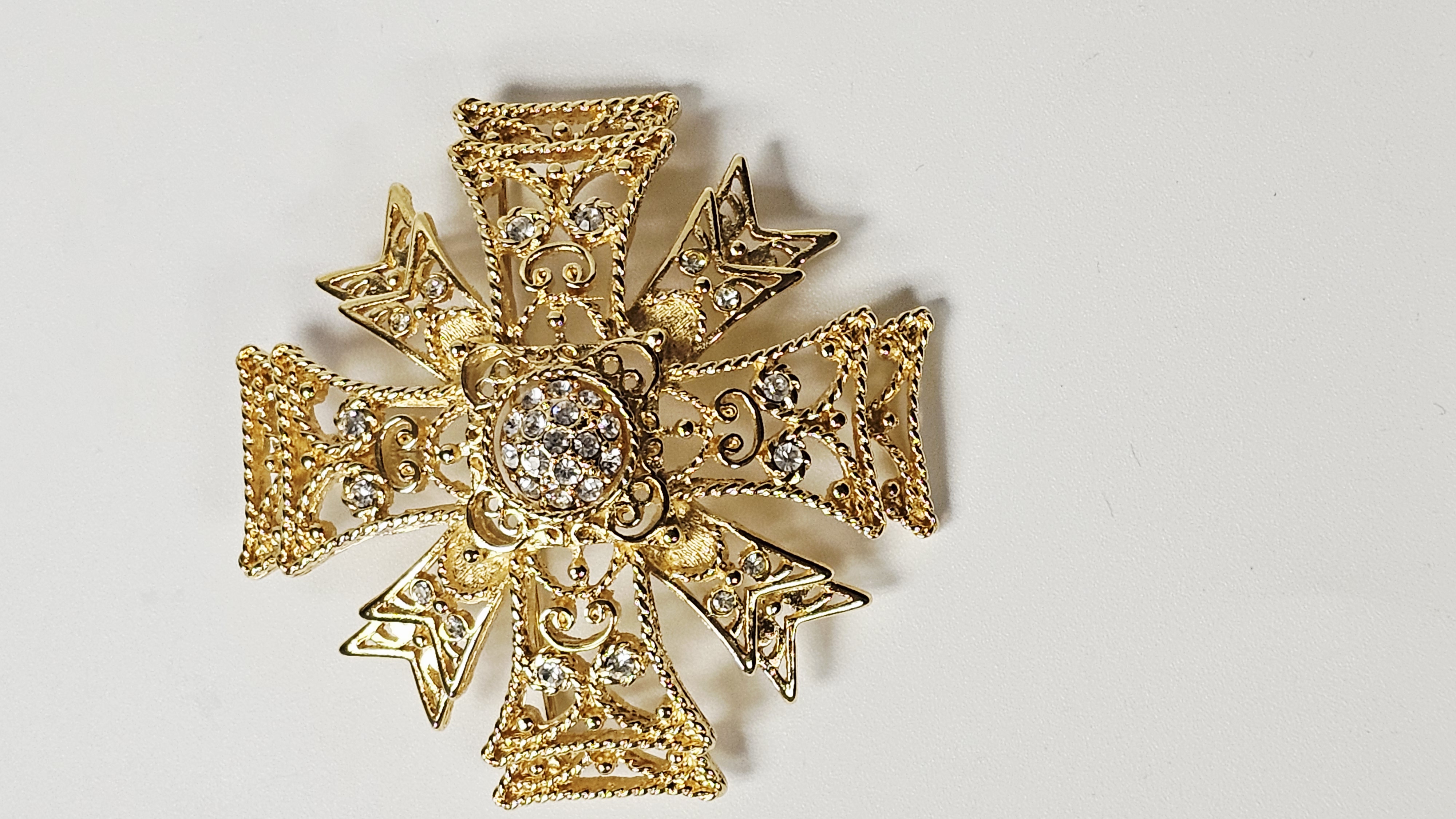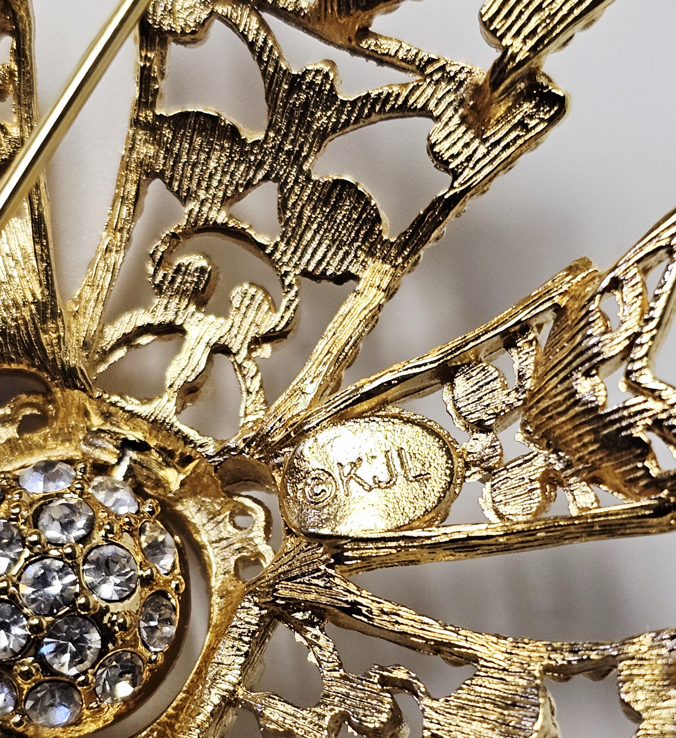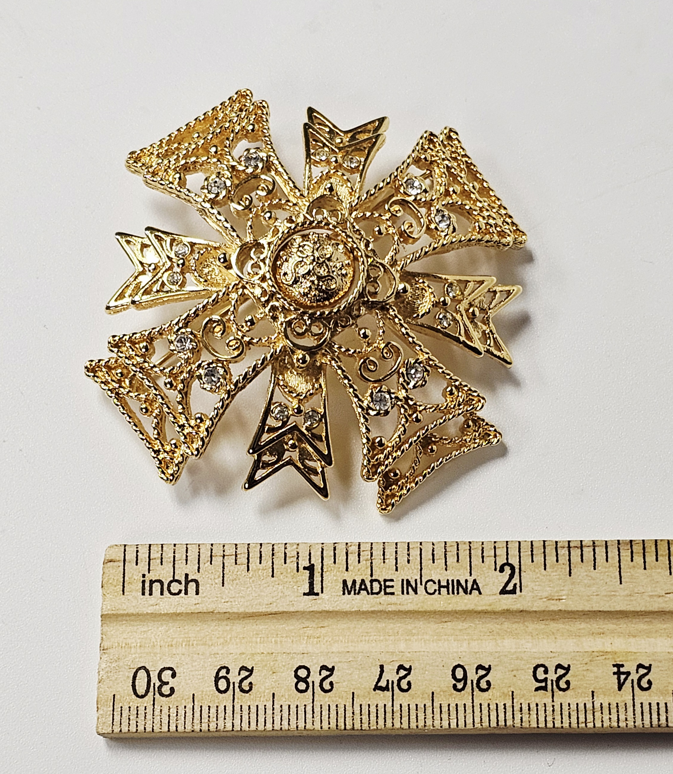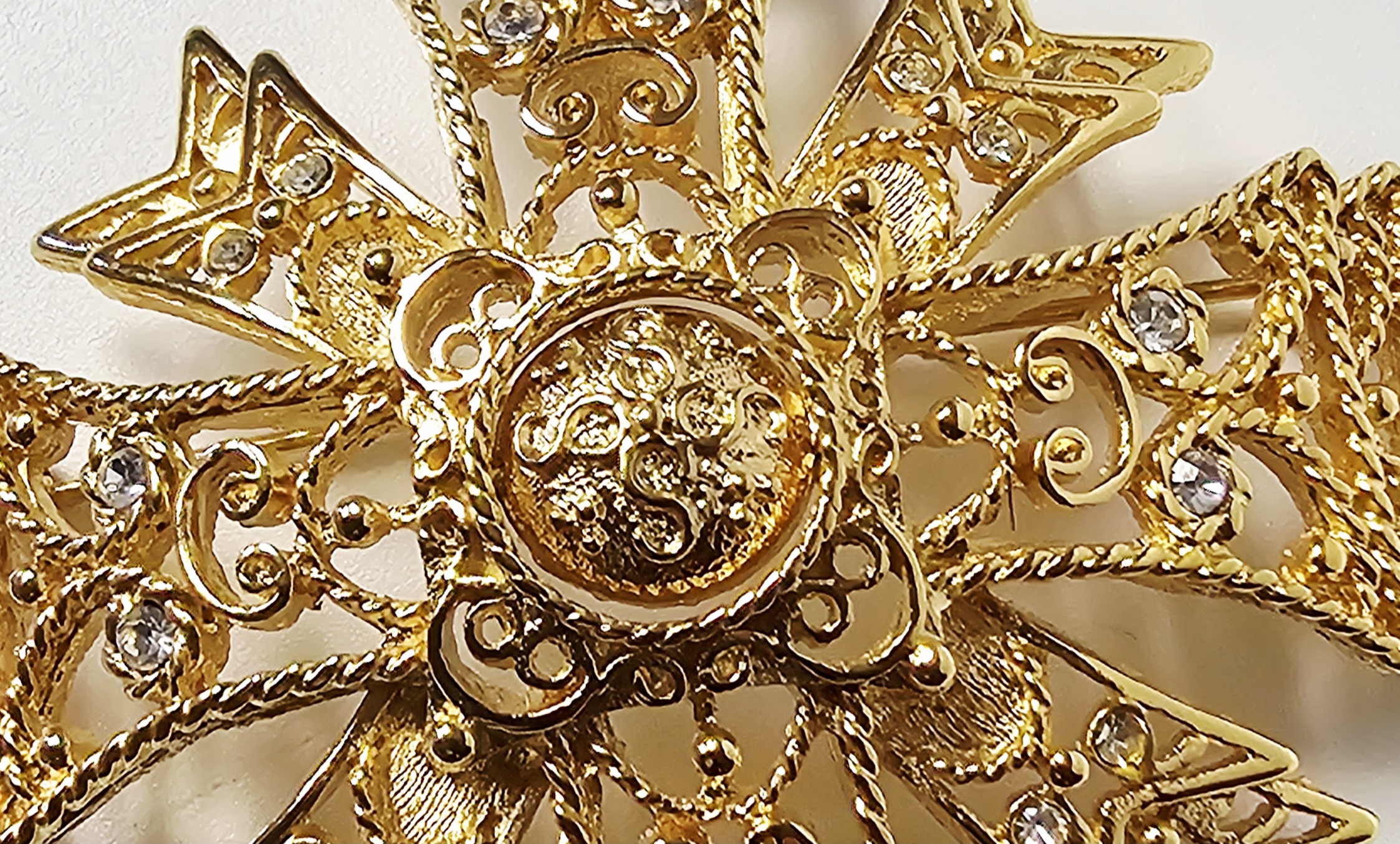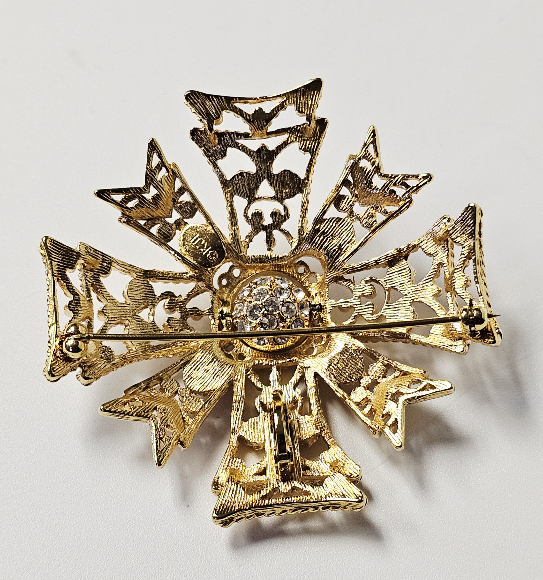 A Kenneth Jay Lane (KJL) ornate costume jewelry brooch designed in the form of a stylized Maltese cross or cross pattee. The piece is constructed from gold-toned base metal with an openwork filigree design featuring rope-textured borders and scrolling motifs. The brooch is accented with numerous colorless round-cut rhinestones set into the four primary arms and the four intermediary V-shaped sections. The center features a raised, domed circular boss pavé-set with a cluster of similar colorless stones. The reverse of the brooch displays a textured bark-like finish and includes an oval plaque stamped with the mark ©KJL. The pin mechanism consists of a horizontal pin stem with a safety rolling-over C-clasp. 2.25 inches by 2.25 inches.